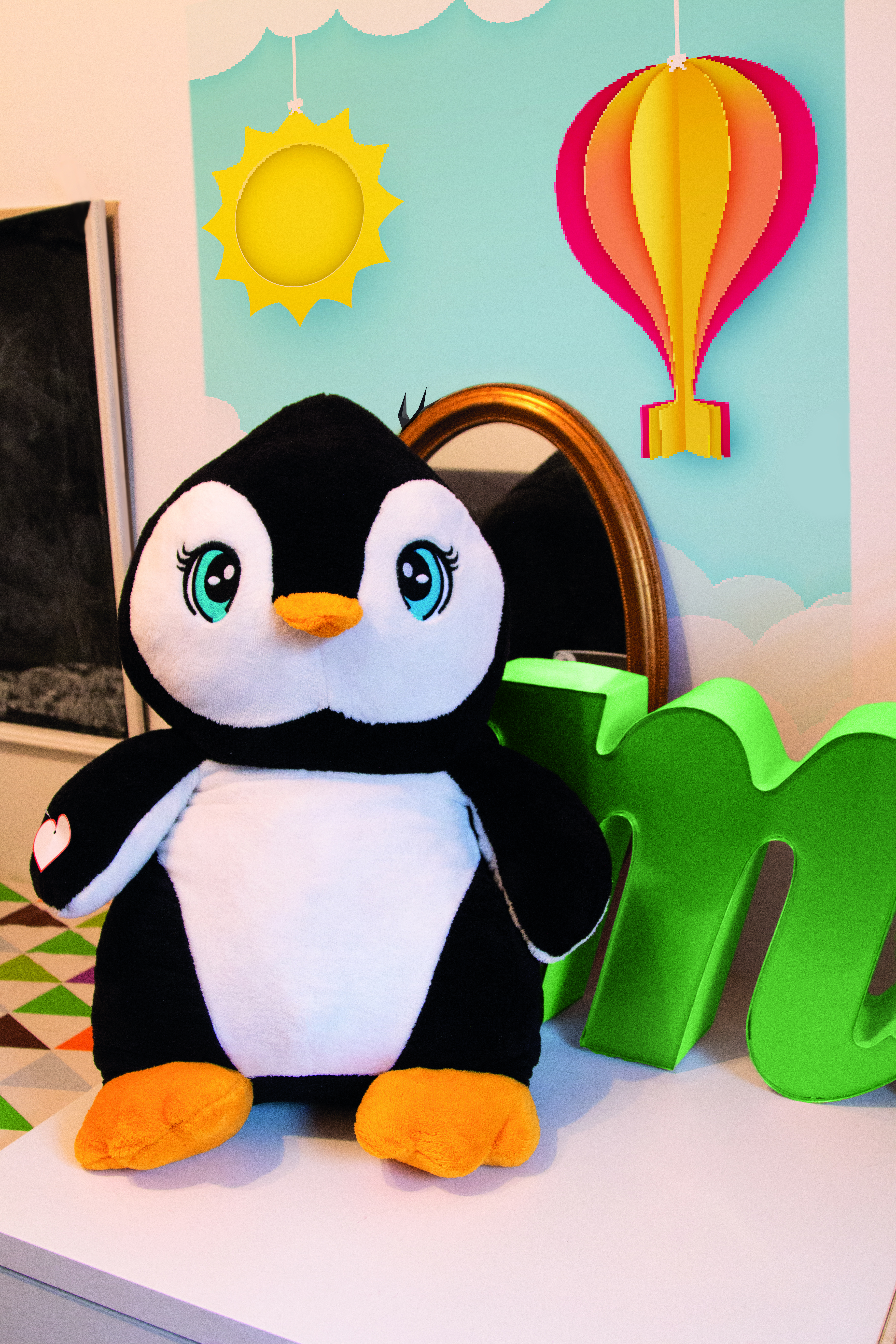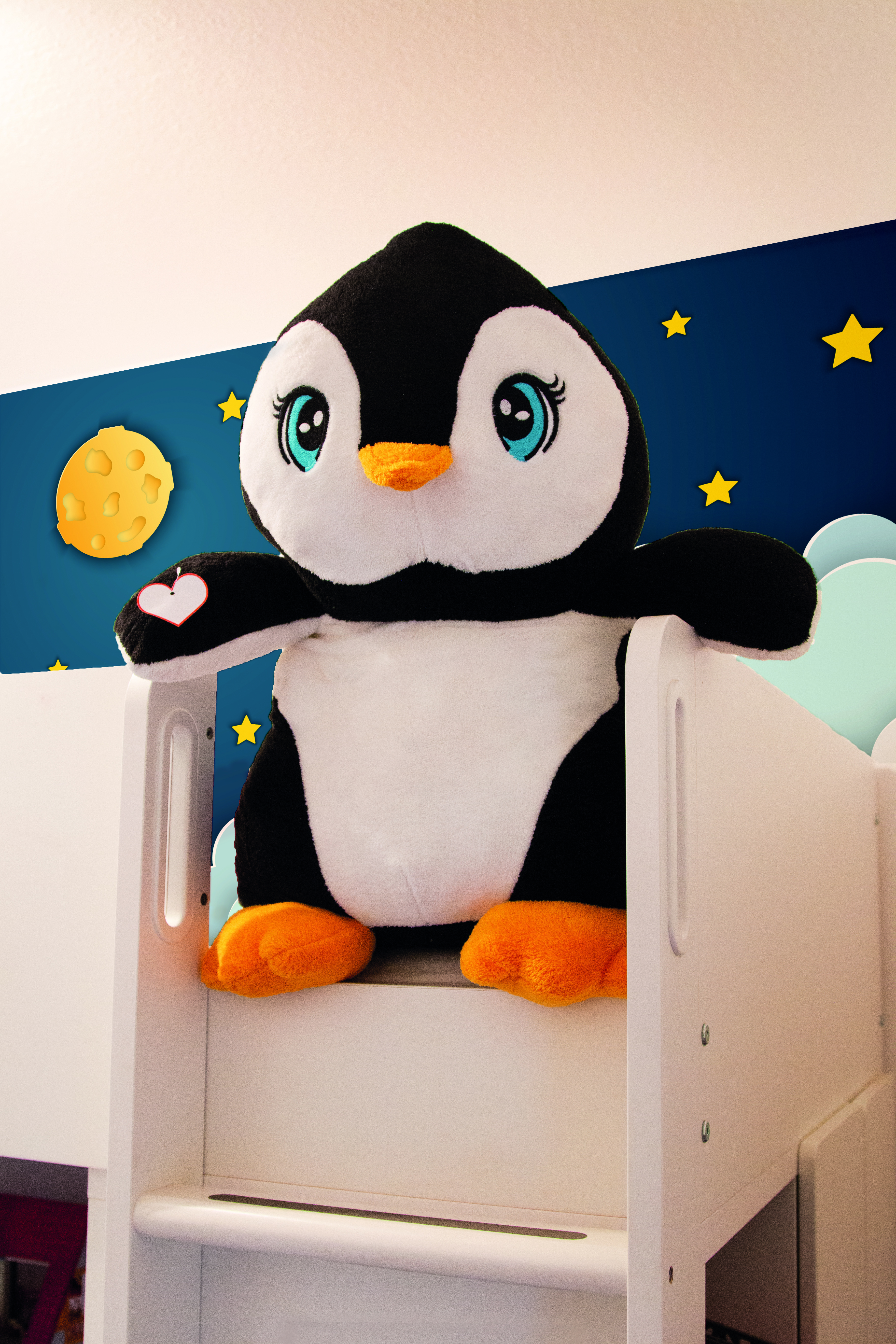 Duży pluszowy pingwin SKIPPER z miękkim futerkiem i serduszkiem do nadruku. Wyprodukowany w Europie.
