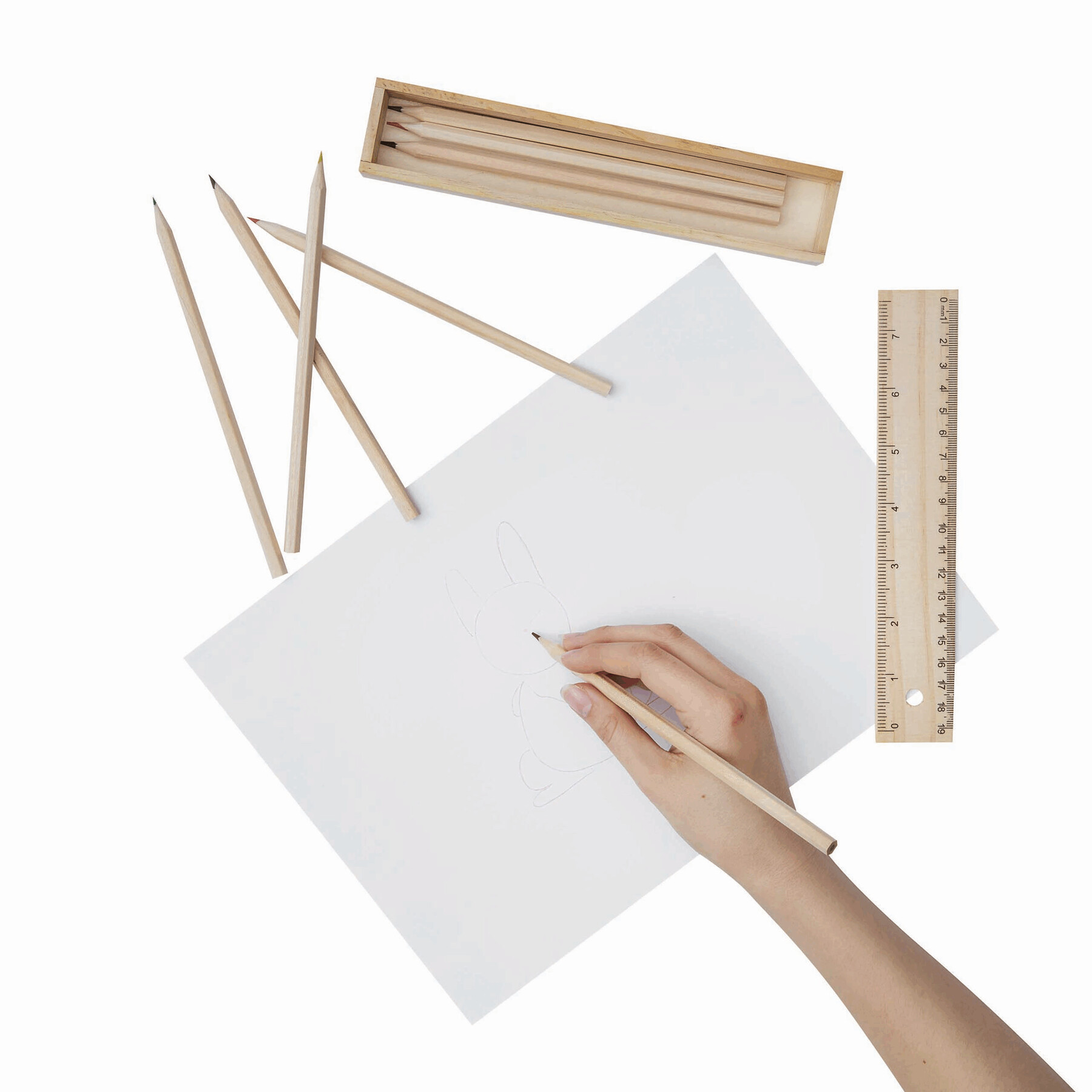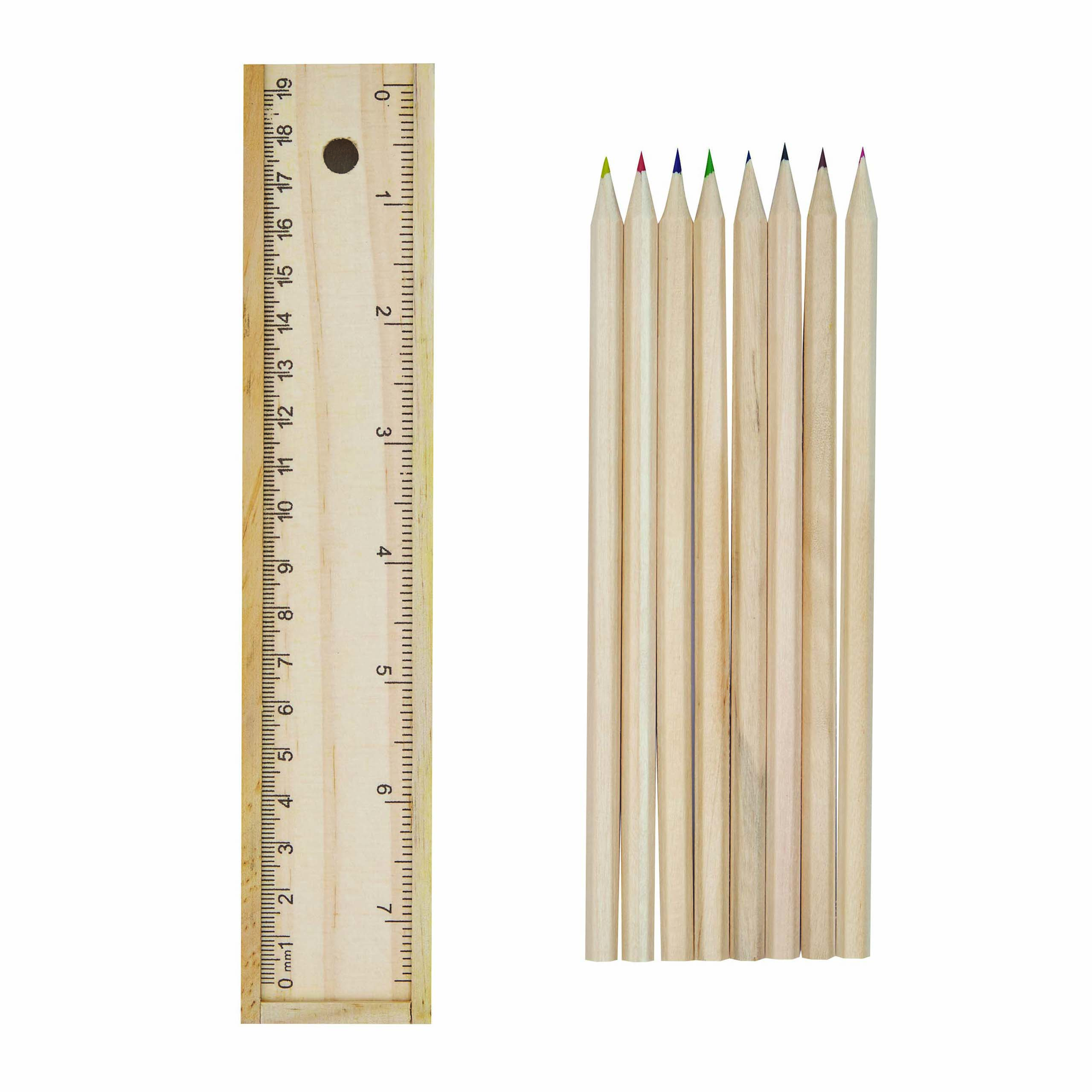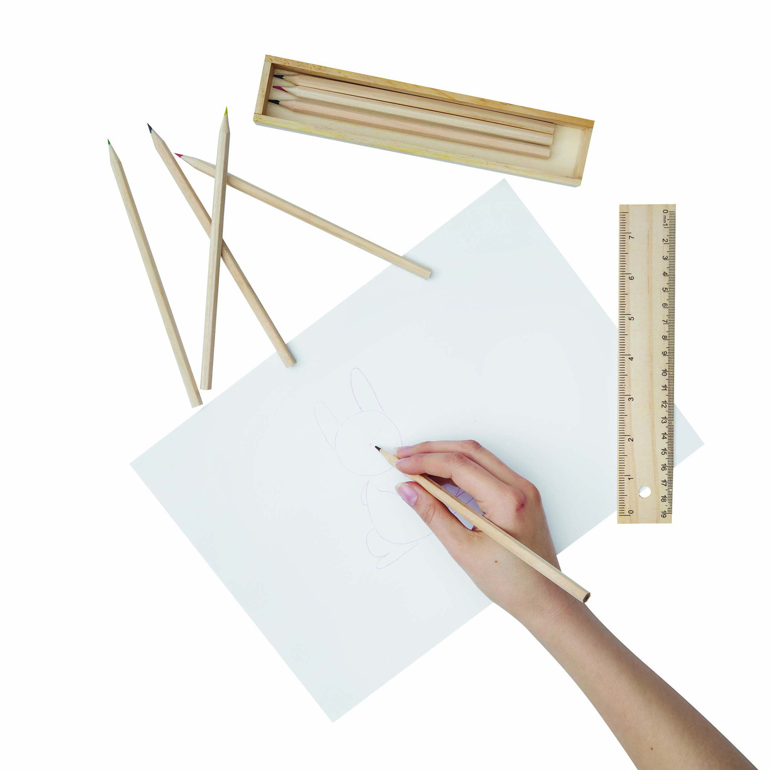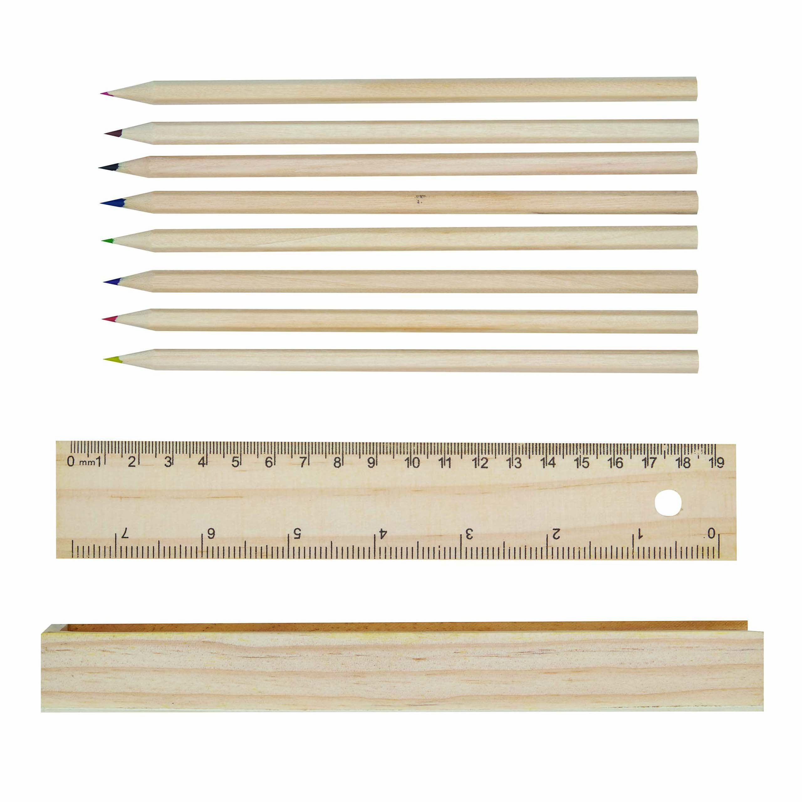 Komplet 8 kredek STRAIGHT zapakowanych w drewniane pudełko z linijką, naostrzone.