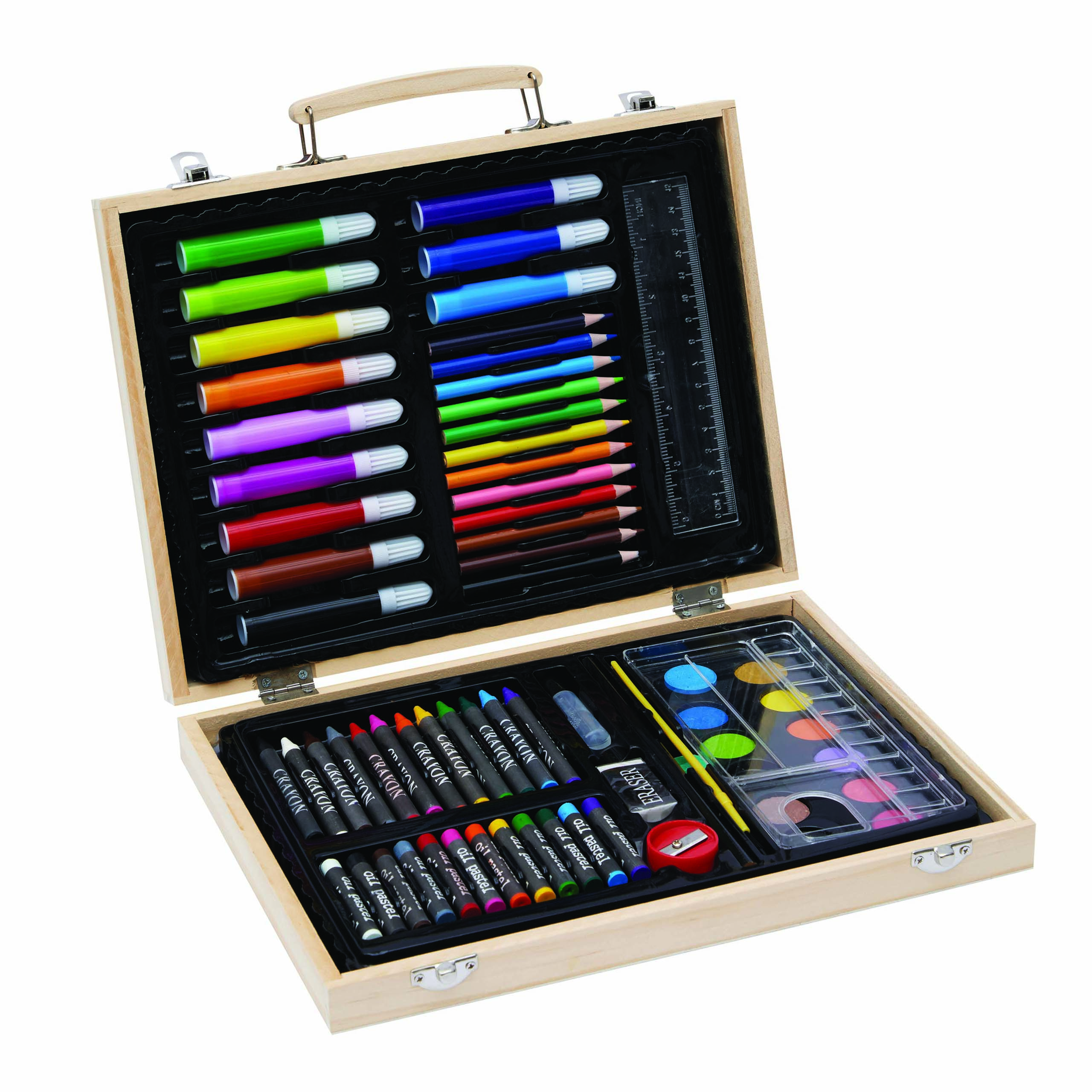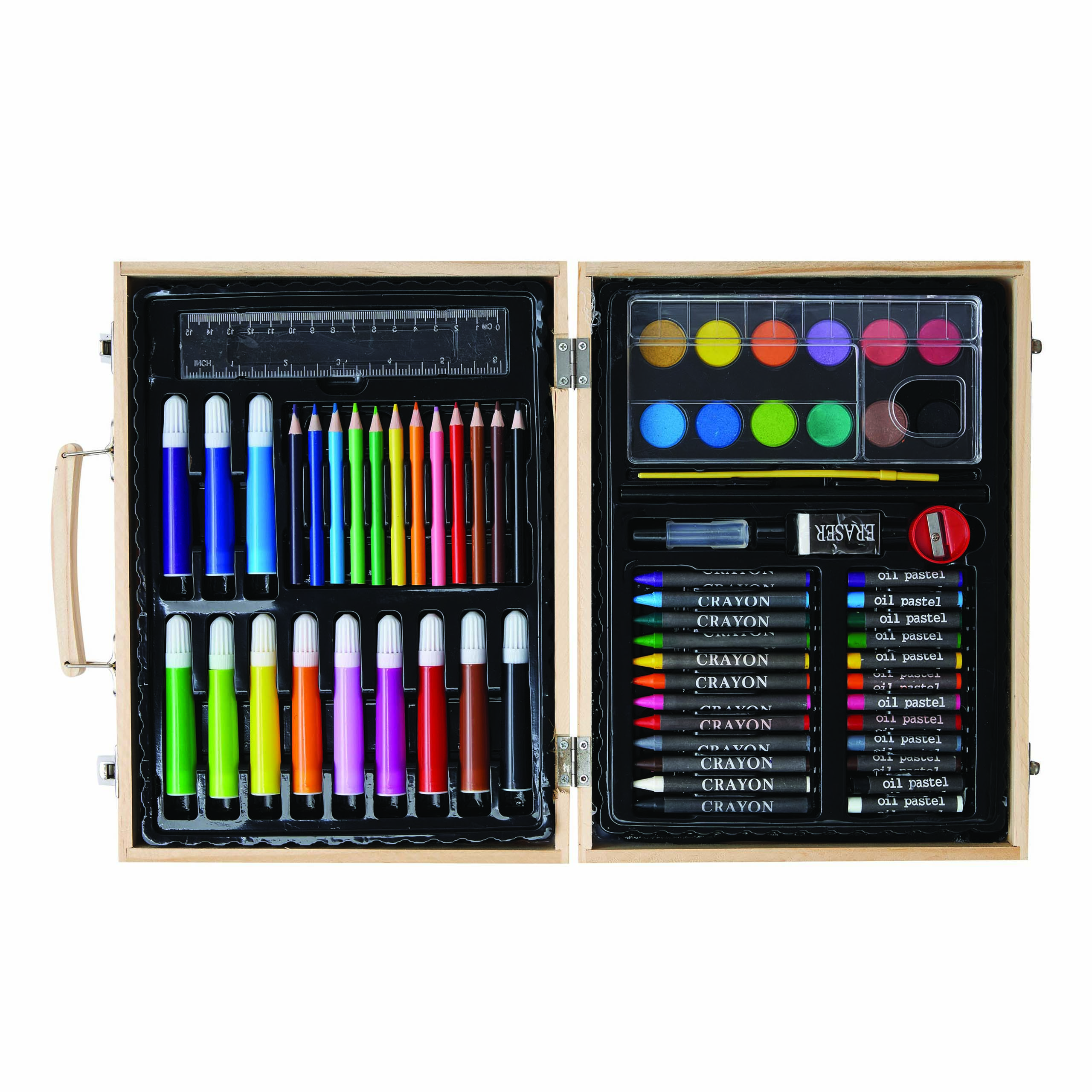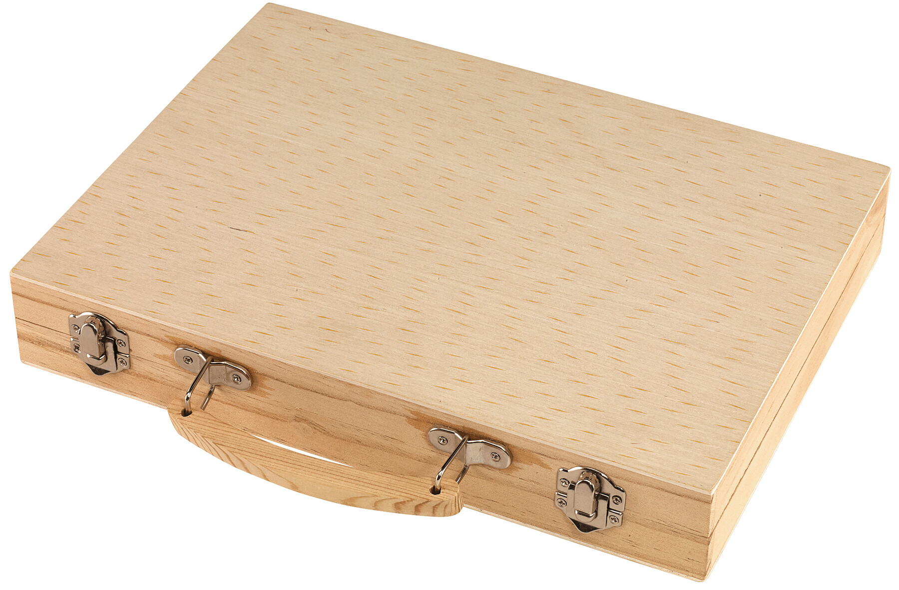 Zestaw do kolorowania GAUDY. 12 kolorowych kredek, 12 flamastrów, 12 kredek świecowych, 12 olejnych kredek pastelowych, 12 farb akwarelowych, 1 pędzel, 1 ołówek, 1 strugaczka, 1 gumka do mazania, 1 linijka (15 cm), w drewnianym zamykanym pudełku z uchwytem.