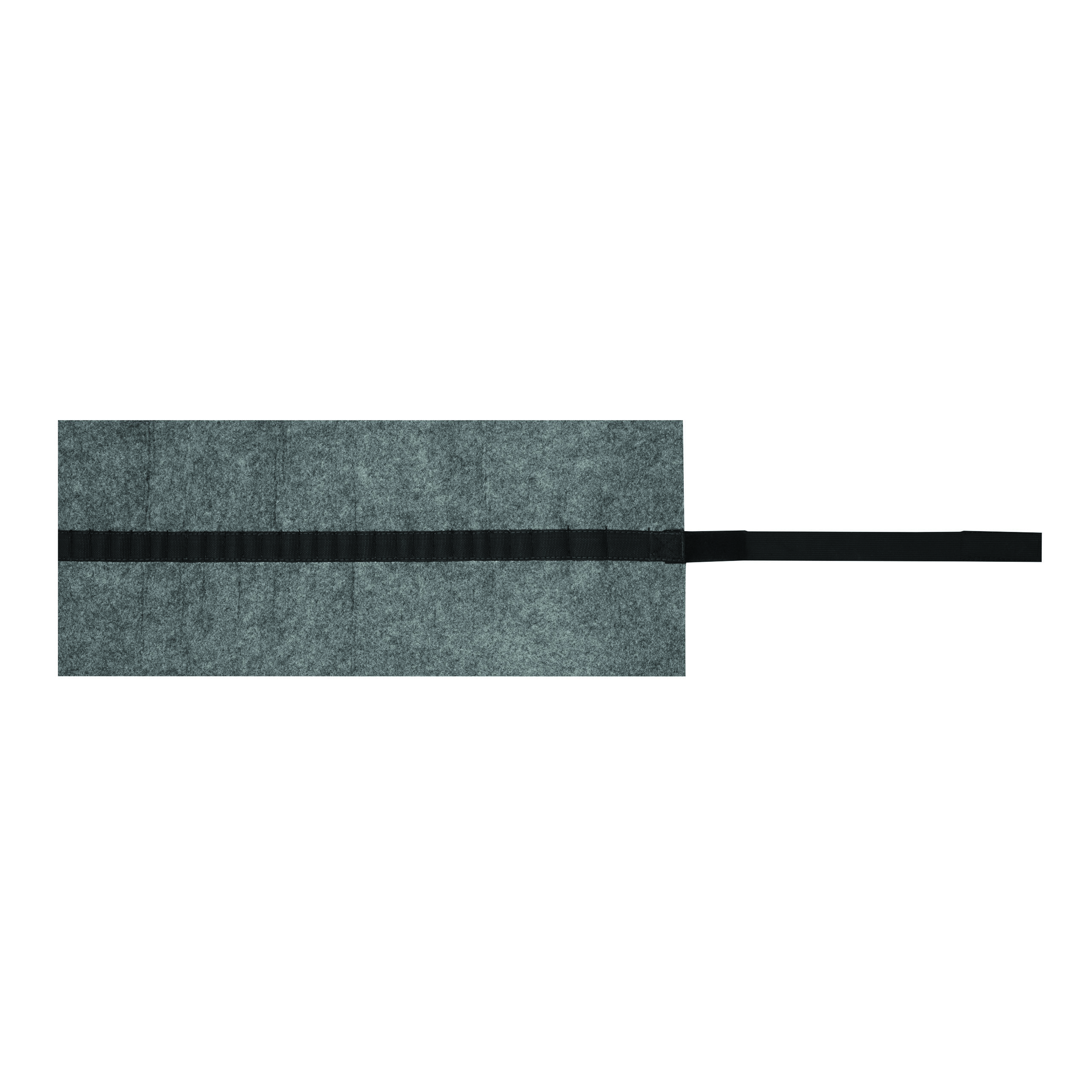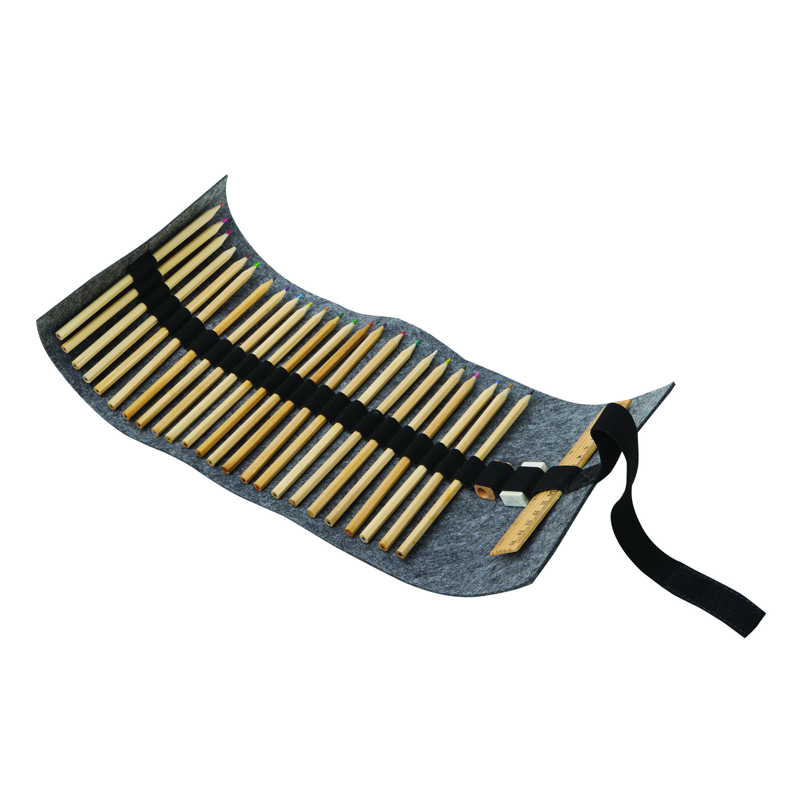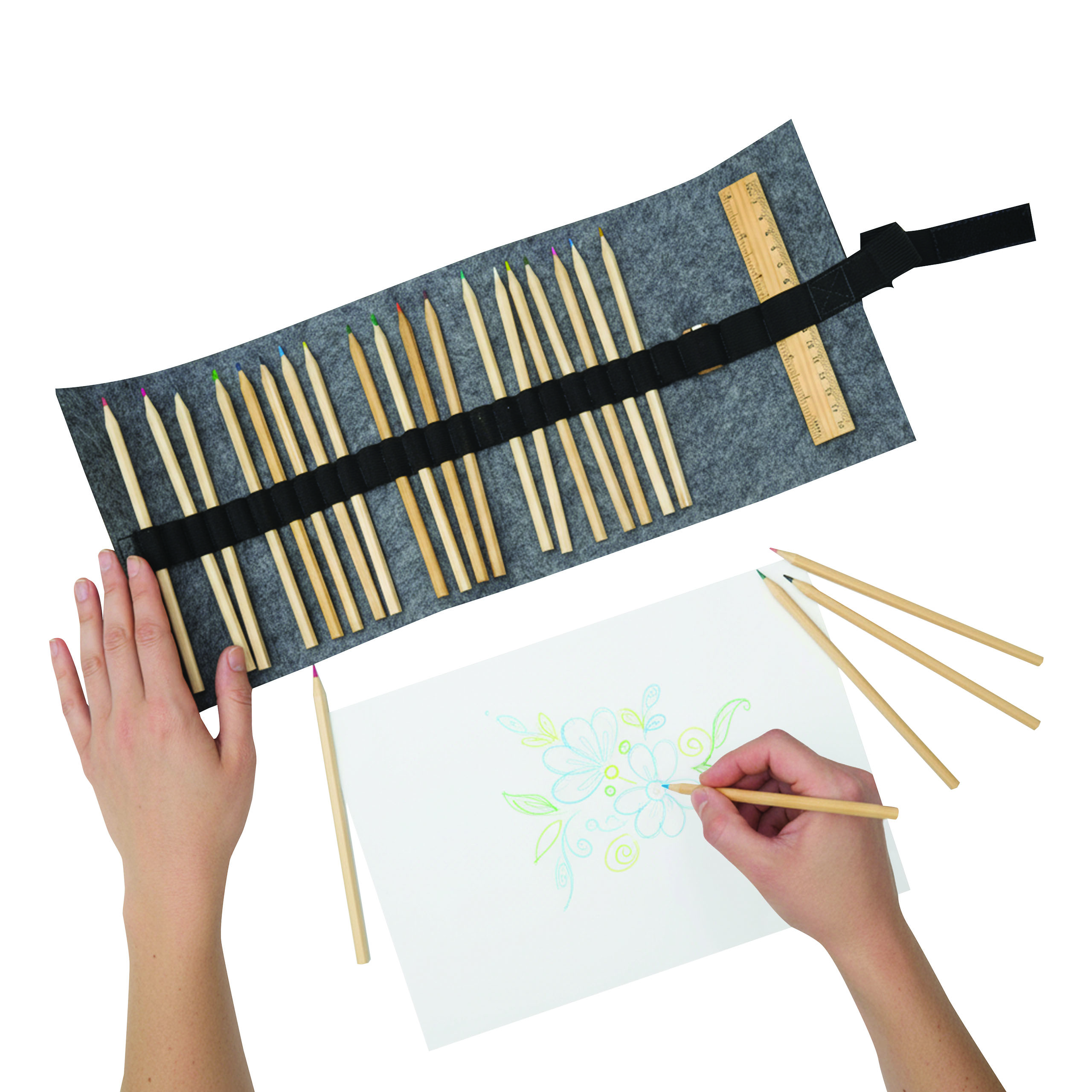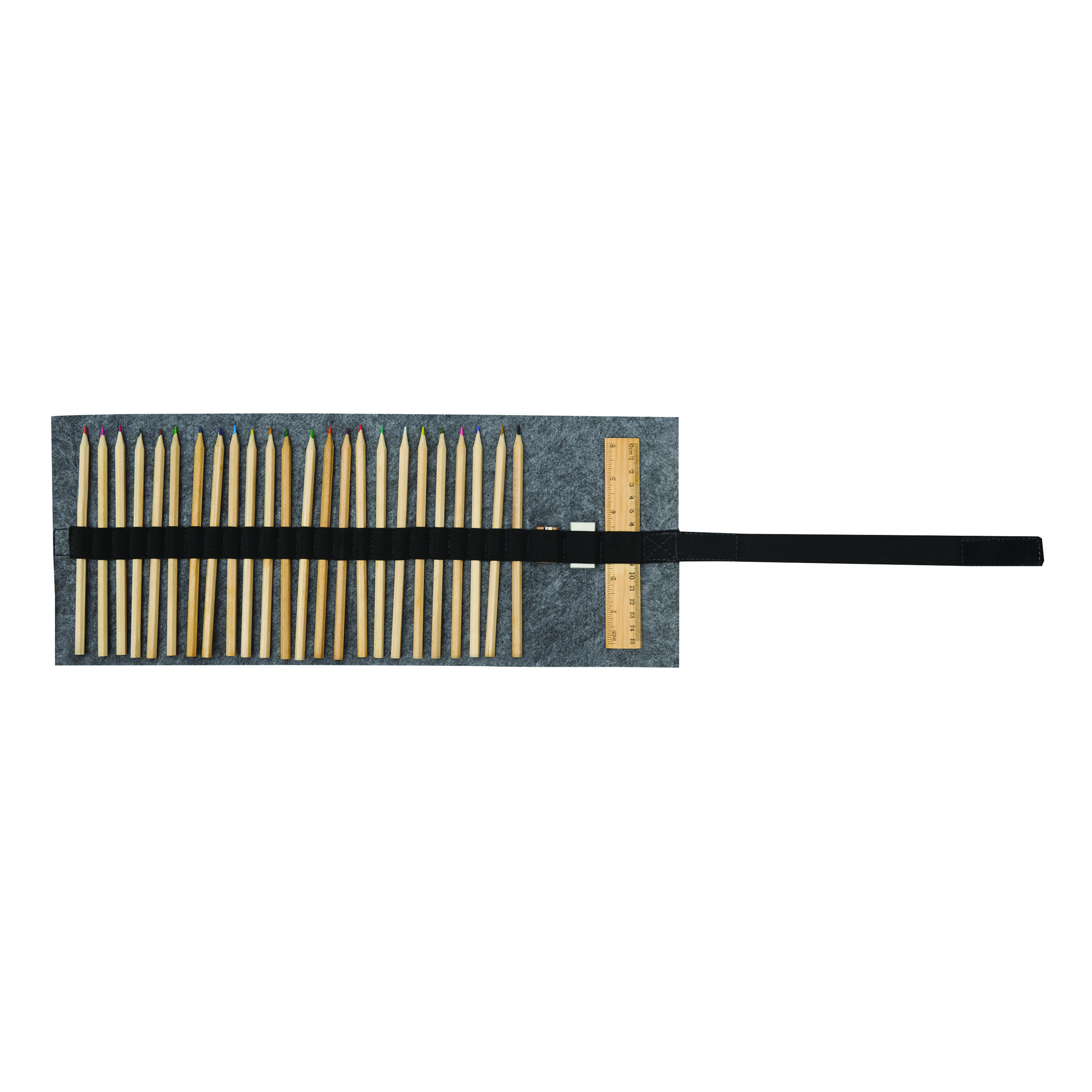 Piórnik DRAWLINE. Zestaw zawiera 24 kolorowe kredki z naturalnego drewna (naostrzone), 1 temperówkę, 1 linijkę oraz 1 gumkę. Ma praktyczne zwijane etui z miękkiego filcu. Zapinany jest na rzep.