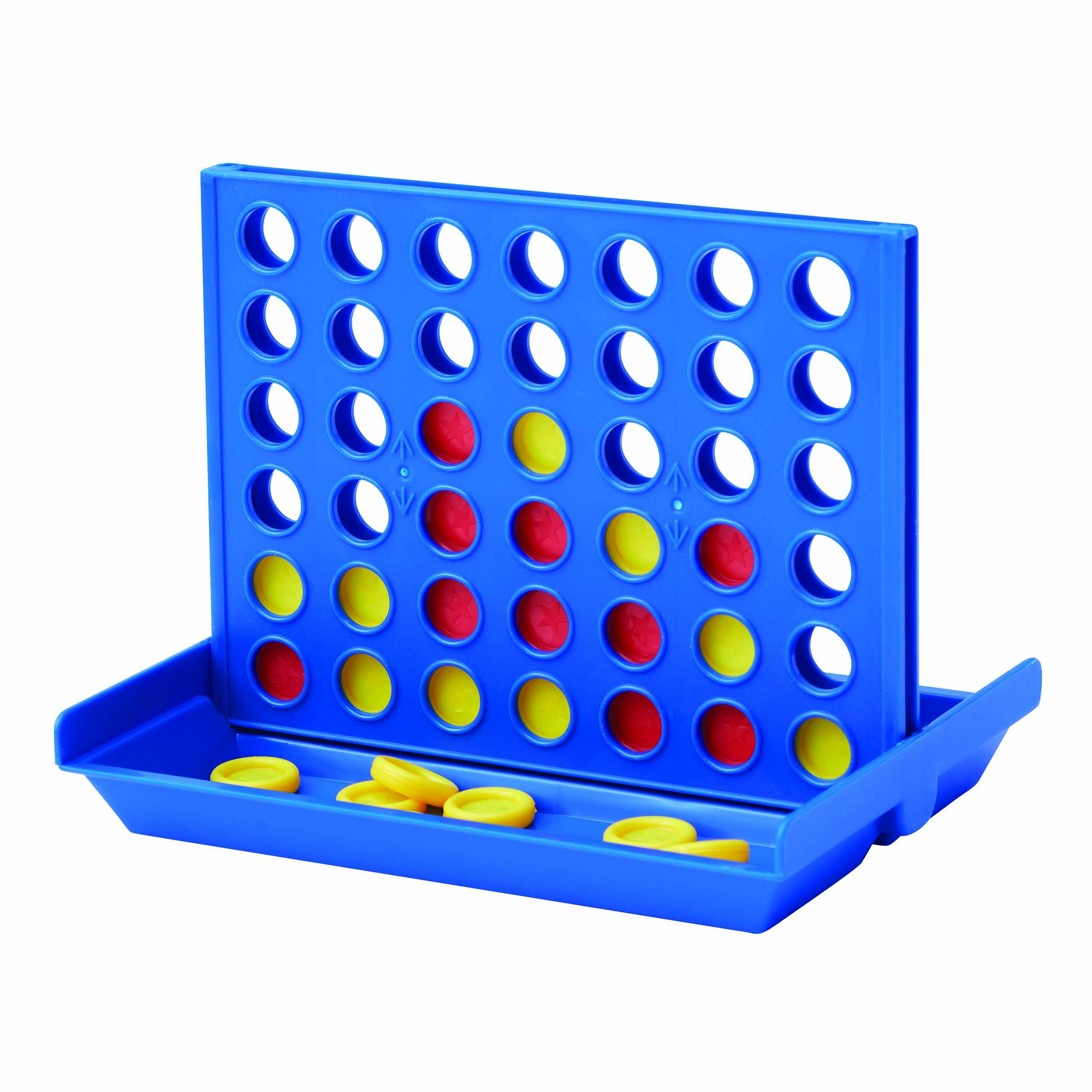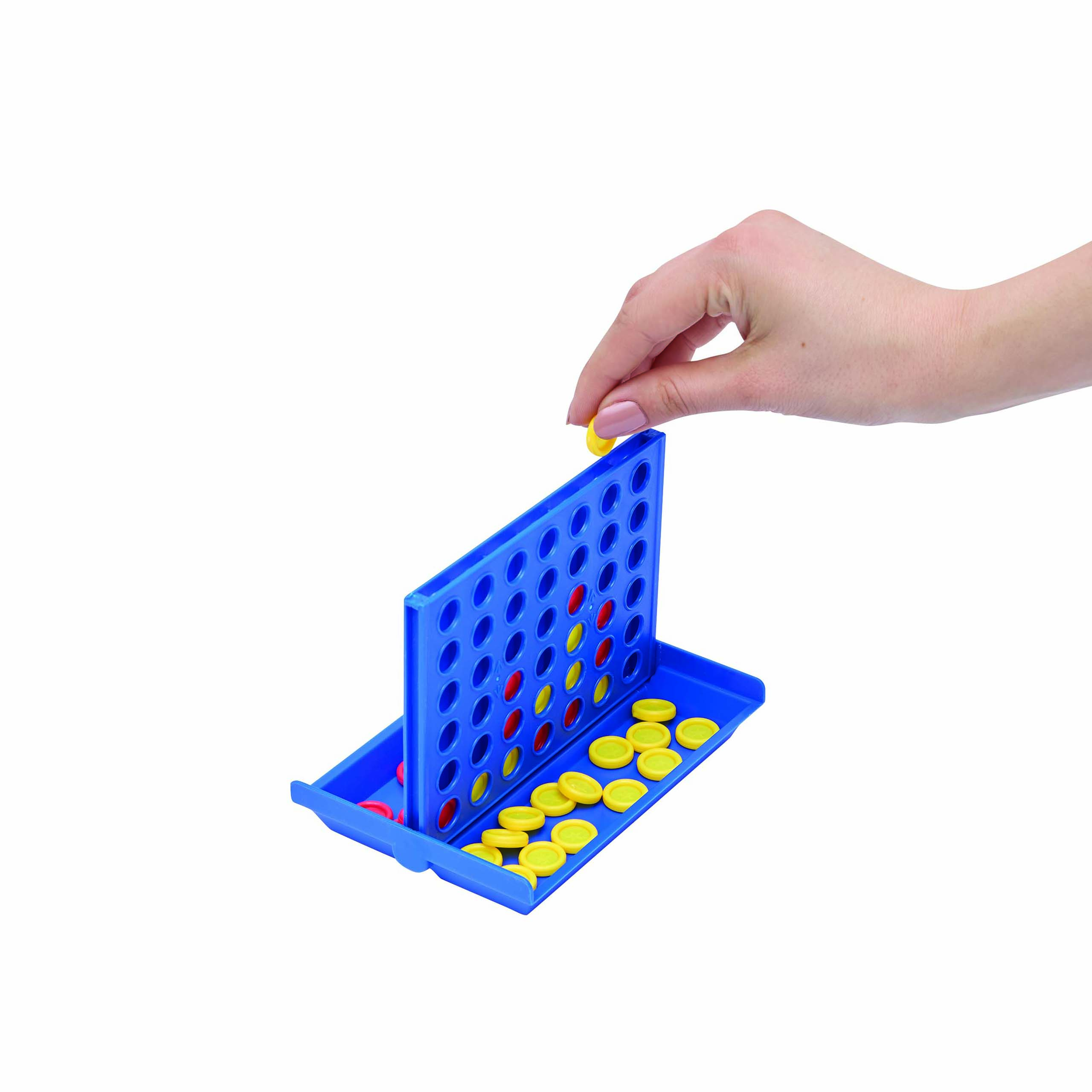 Gra podróżna 4 IN A LINE z czerwonymi i żółtymi tokenami w pudełku.