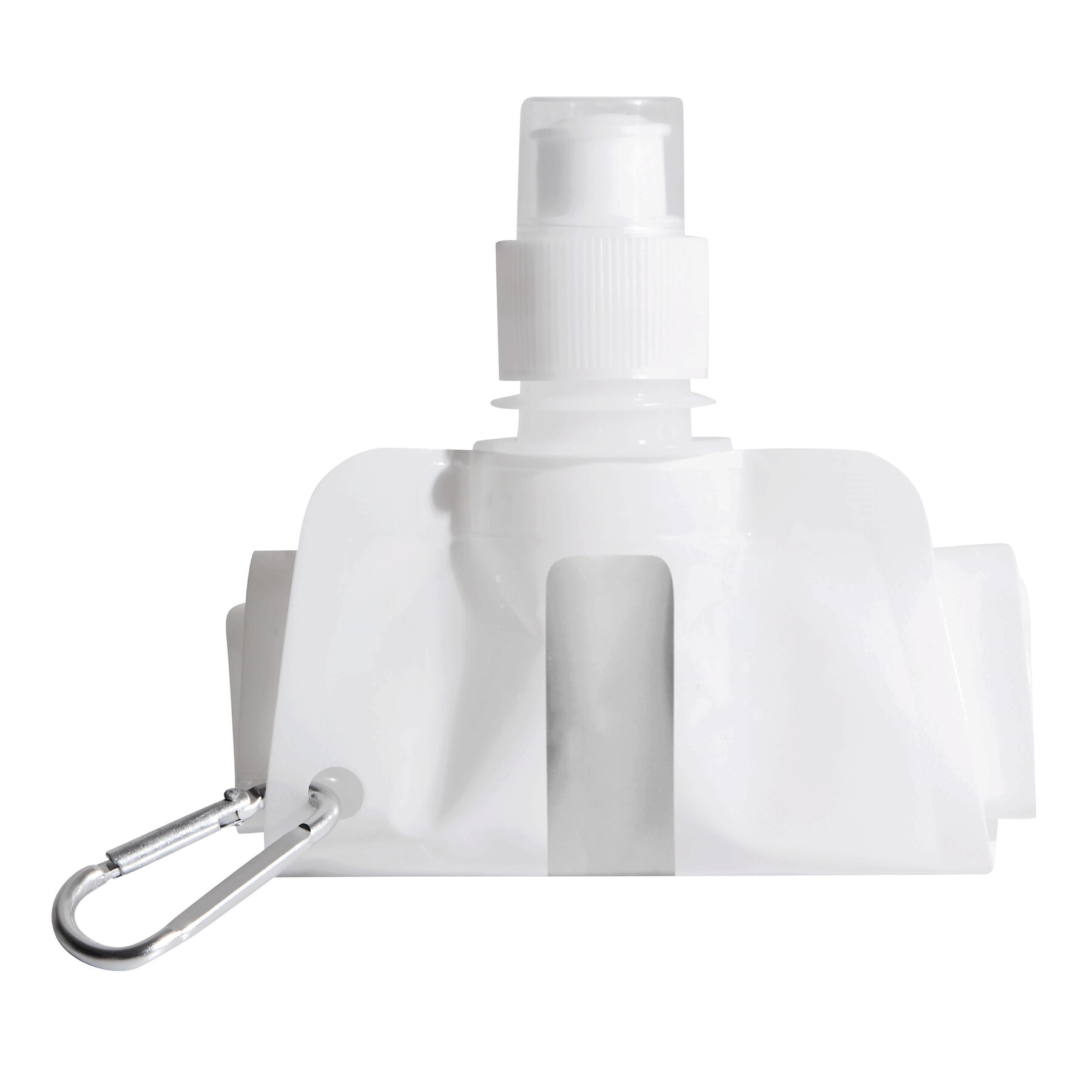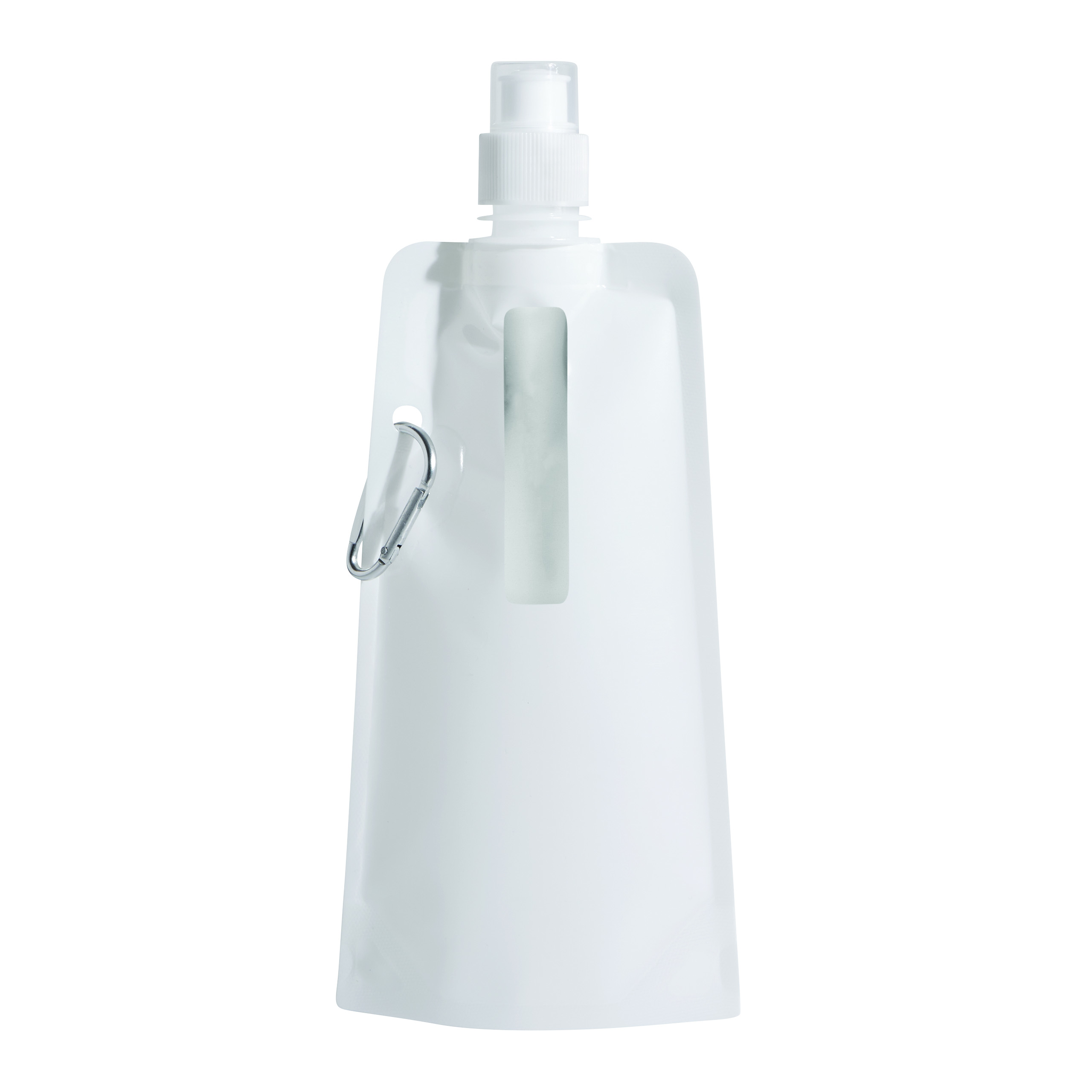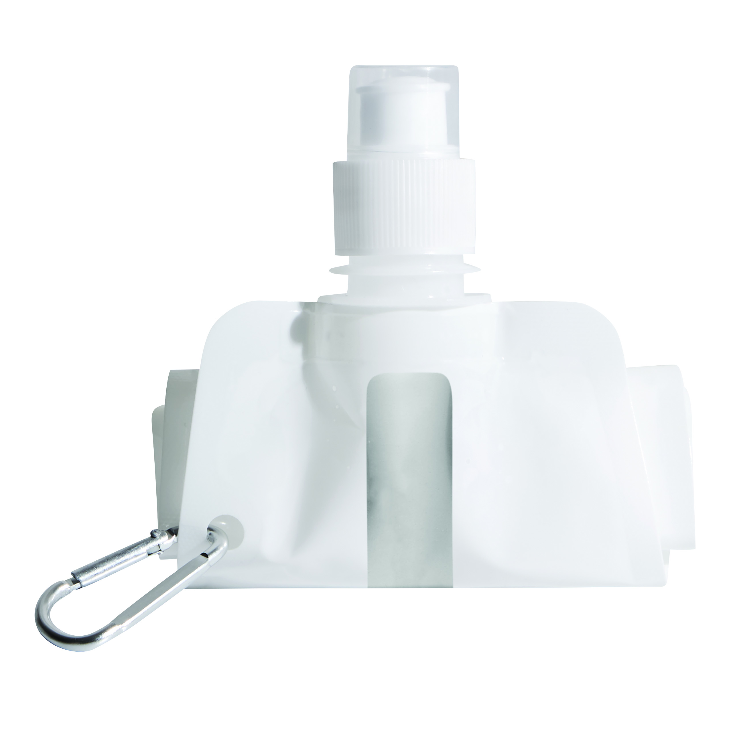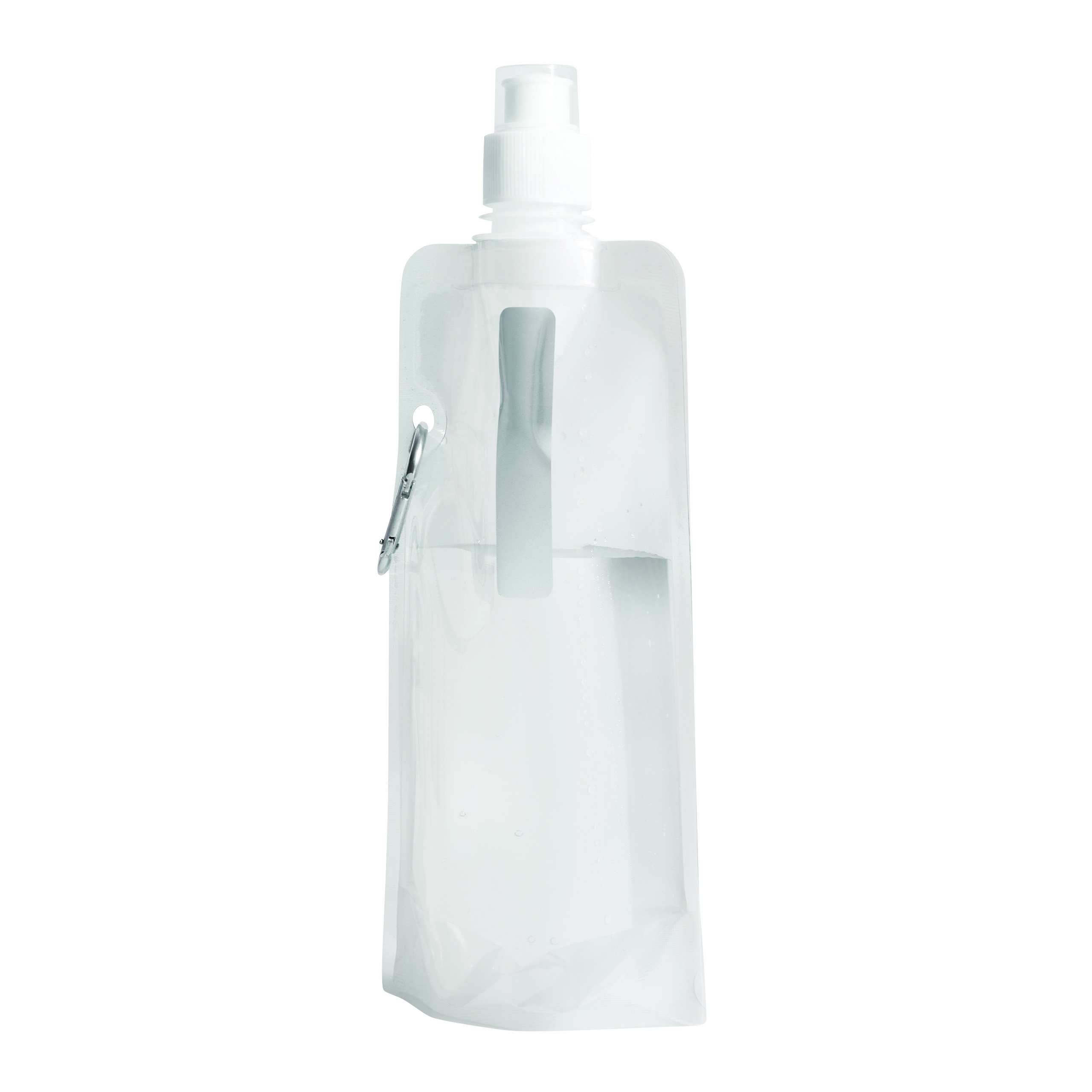 Składana butelka na wodę AQUAFOLD. Po opróżnieniu można ją zwinąć. Jest przezroczysta i posiada zamknięcie typu push-pull oraz karabińczykiem (karabińczyk NIE nadaje się do wspinaczki). Ma pojemność ok. 400 ml.