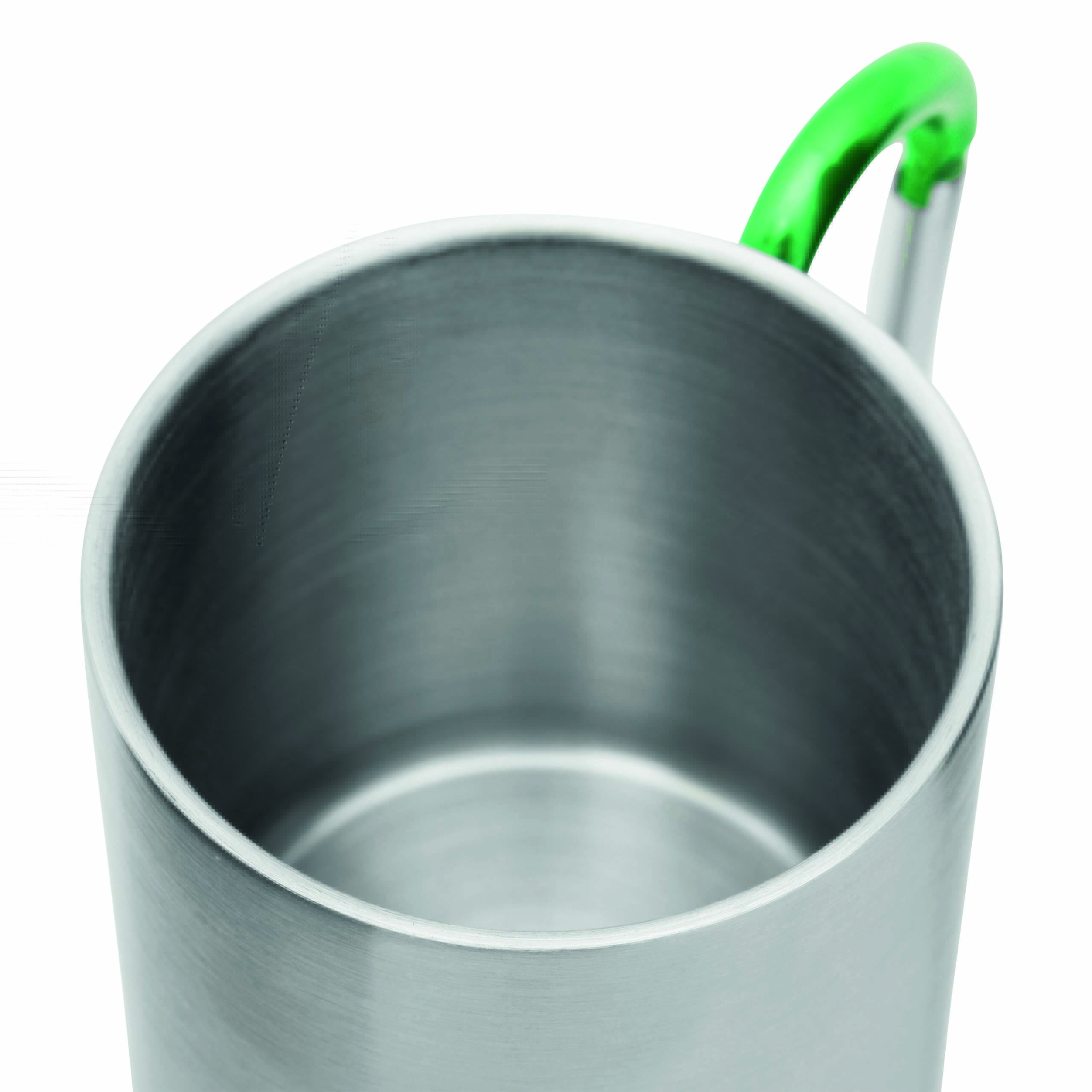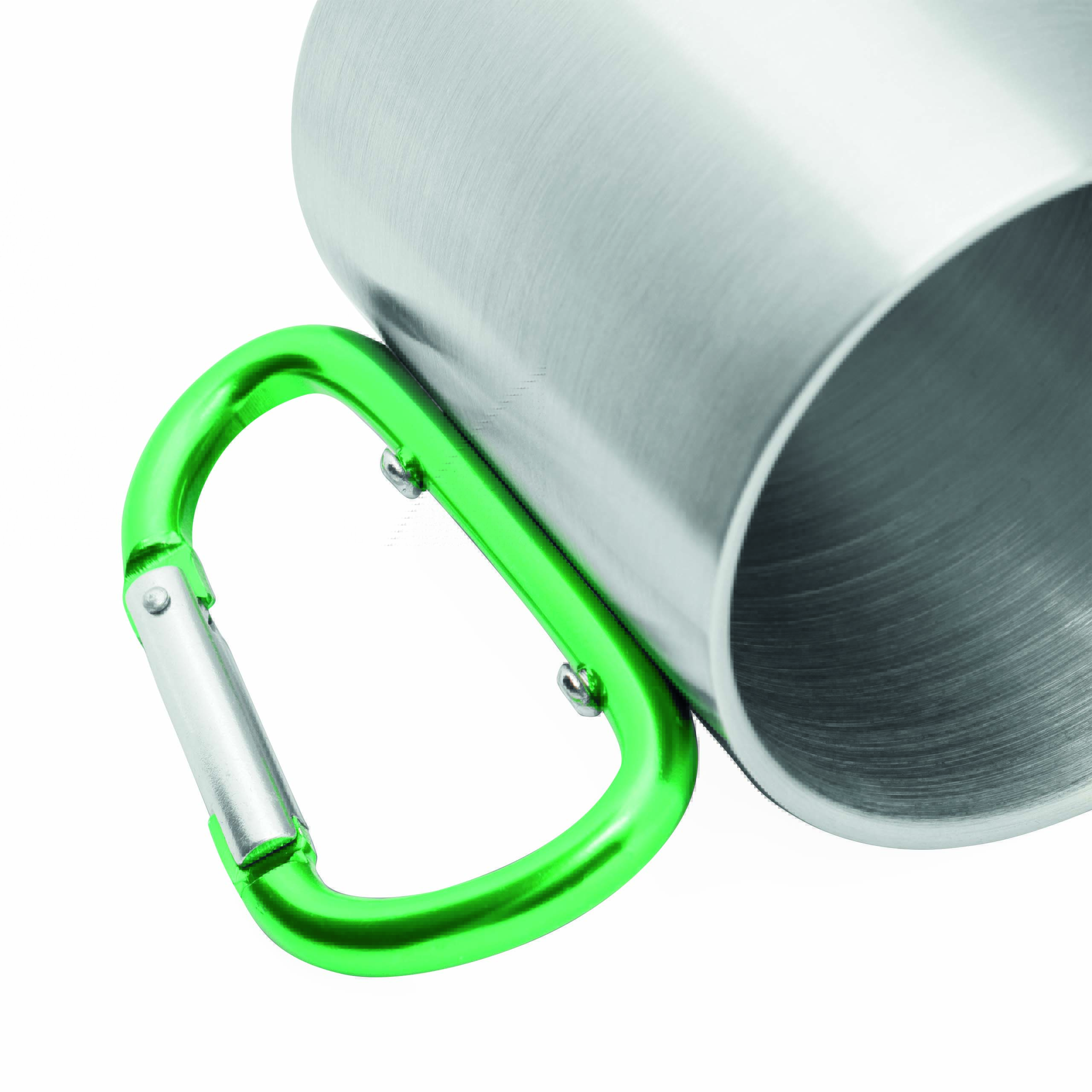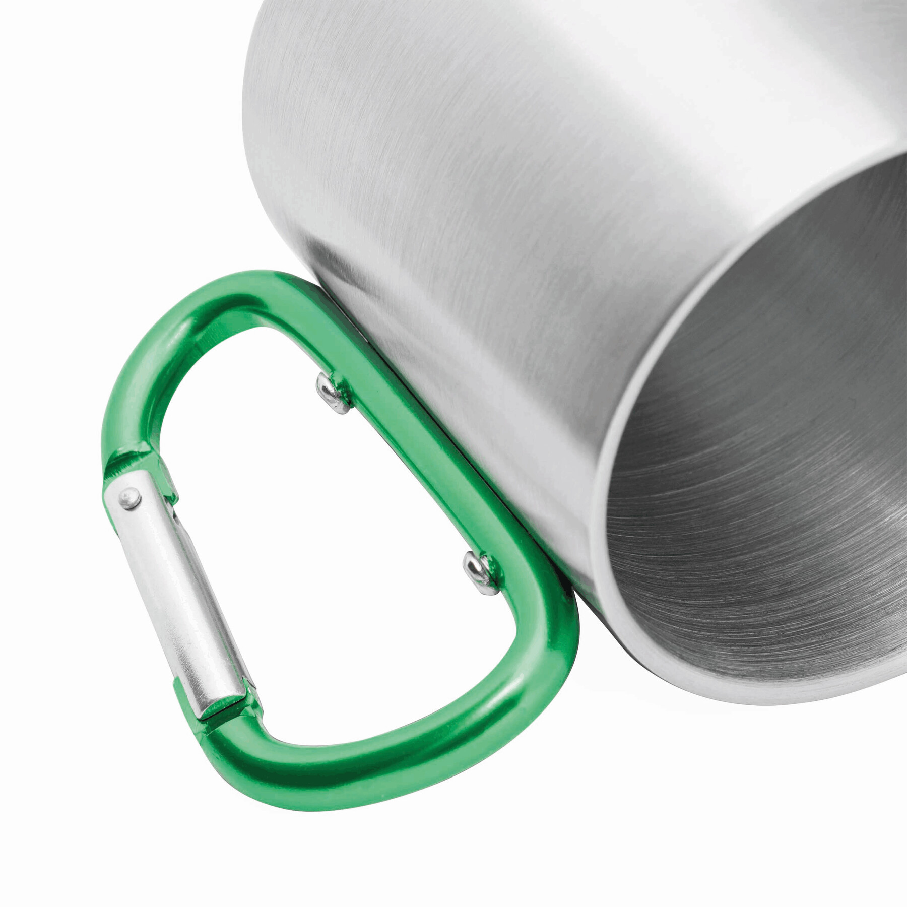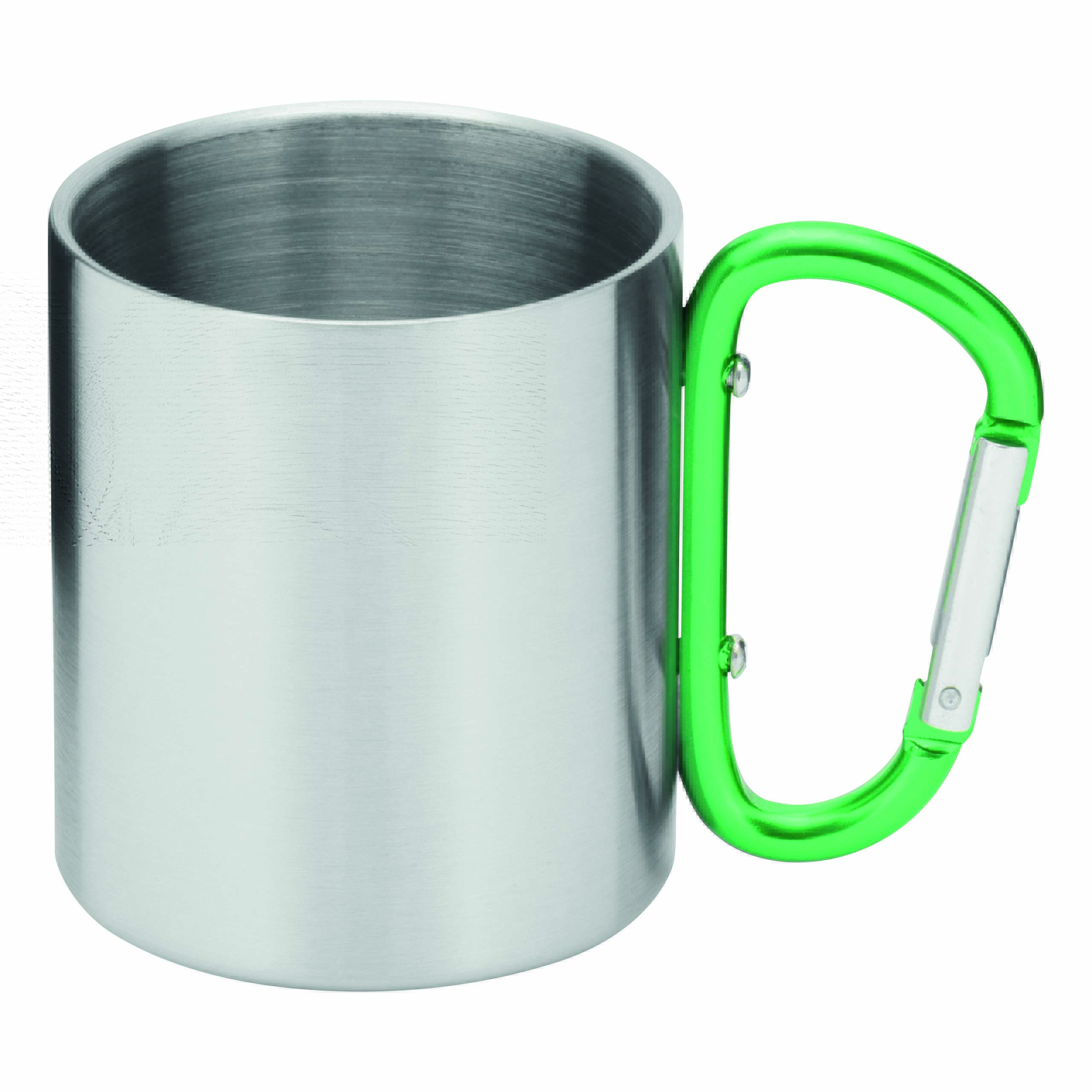 Kubek HIKING DAY ze stali nierdzewnej wewnątrz i na zewnątrz, pojemność ok. 200 ml, z kolorowym karabińczykiem.