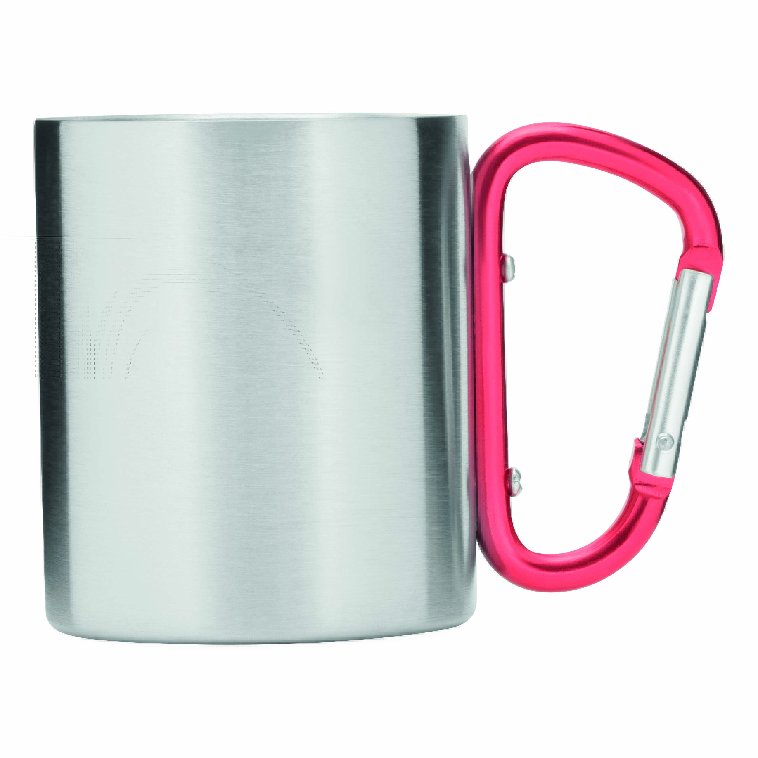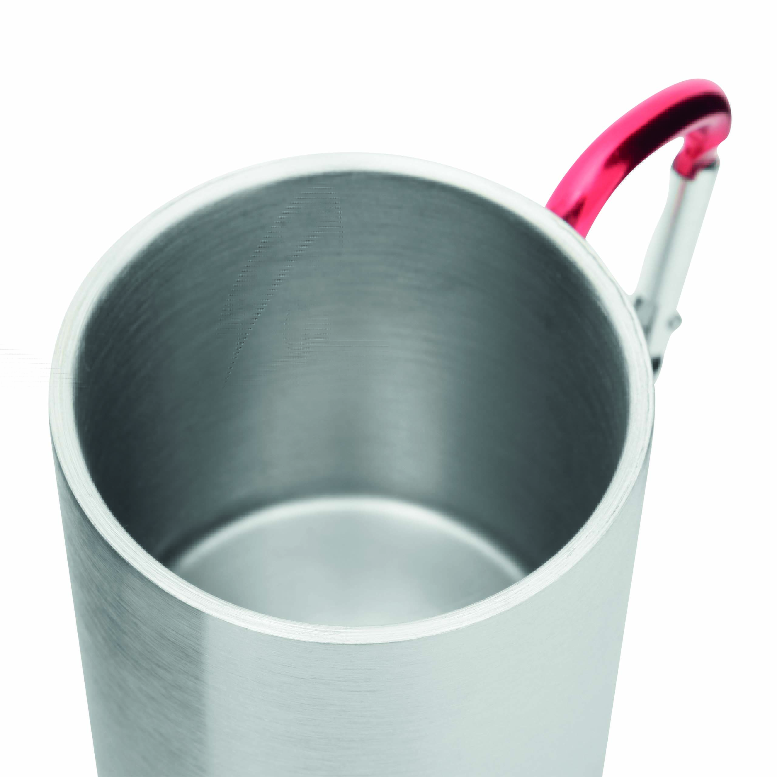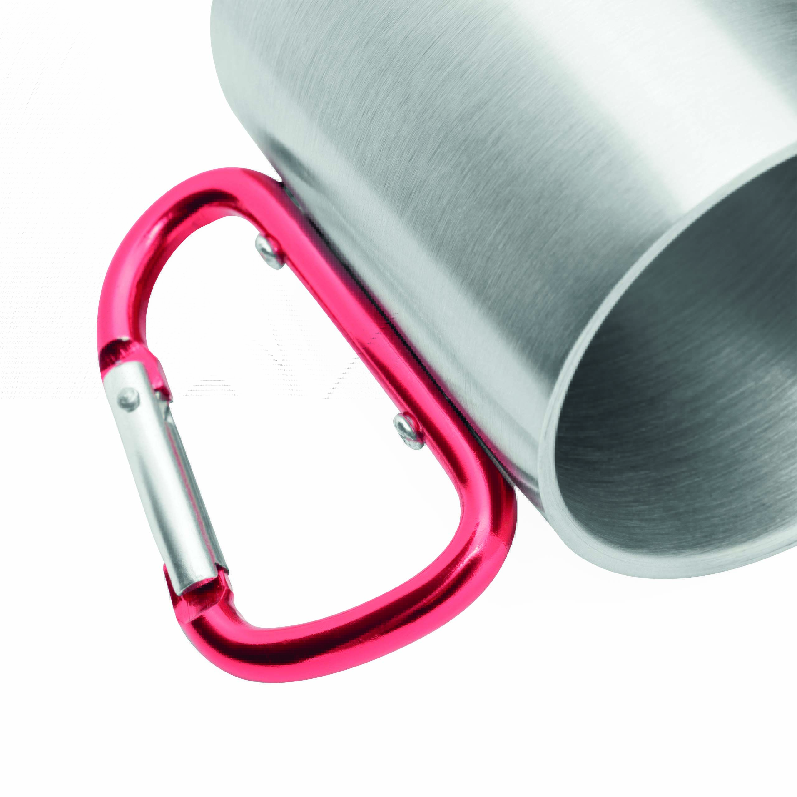 Kubek HIKING DAY ze stali nierdzewnej wewnątrz i na zewnątrz, pojemność ok. 200 ml, z kolorowym karabińczykiem.