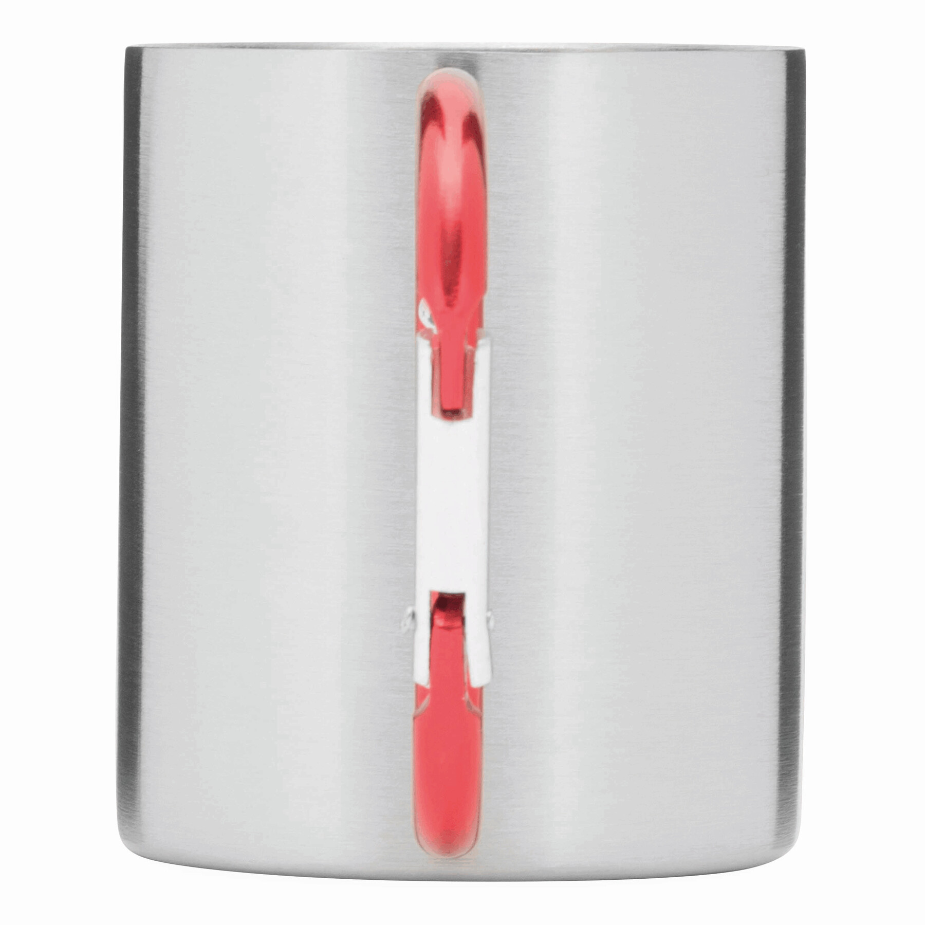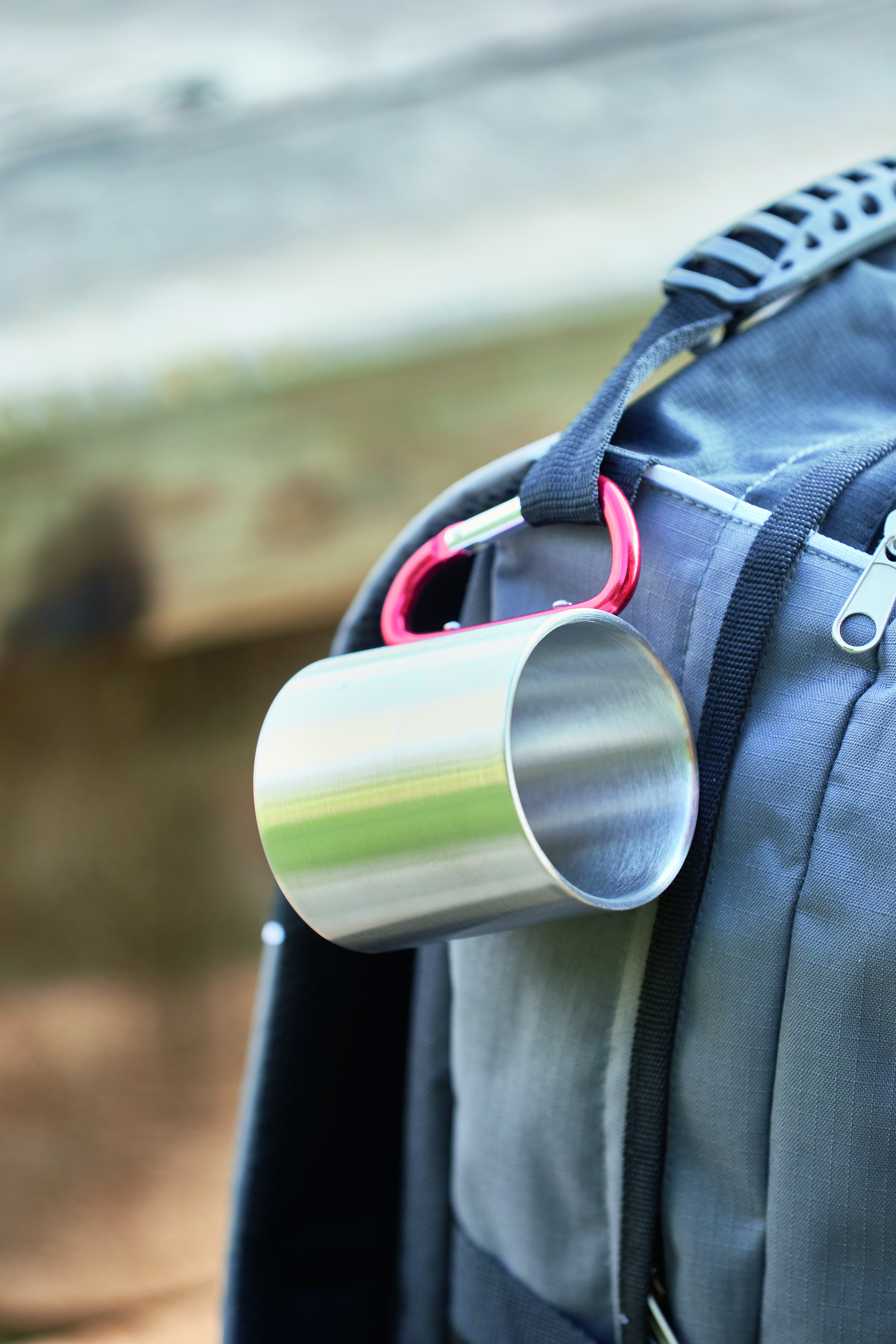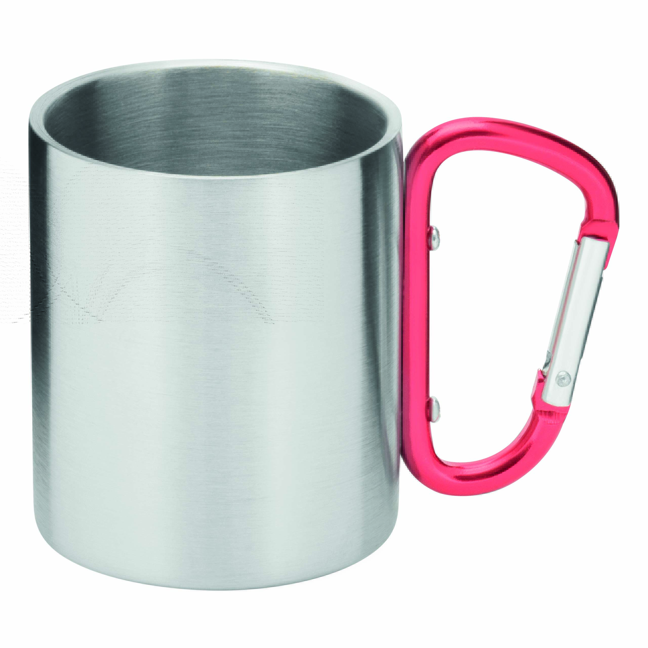 Kubek HIKING DAY ze stali nierdzewnej wewnątrz i na zewnątrz, pojemność ok. 200 ml, z kolorowym karabińczykiem.