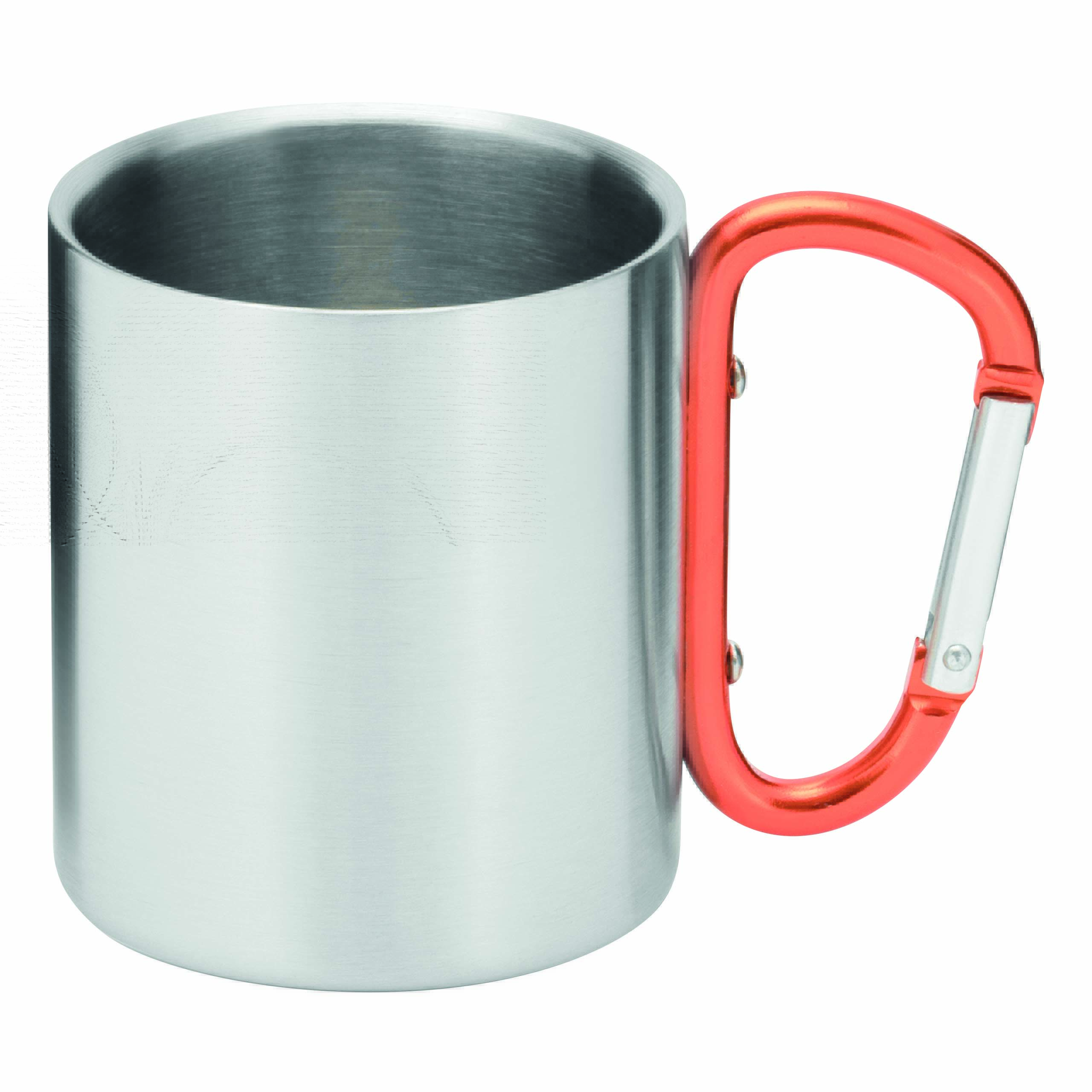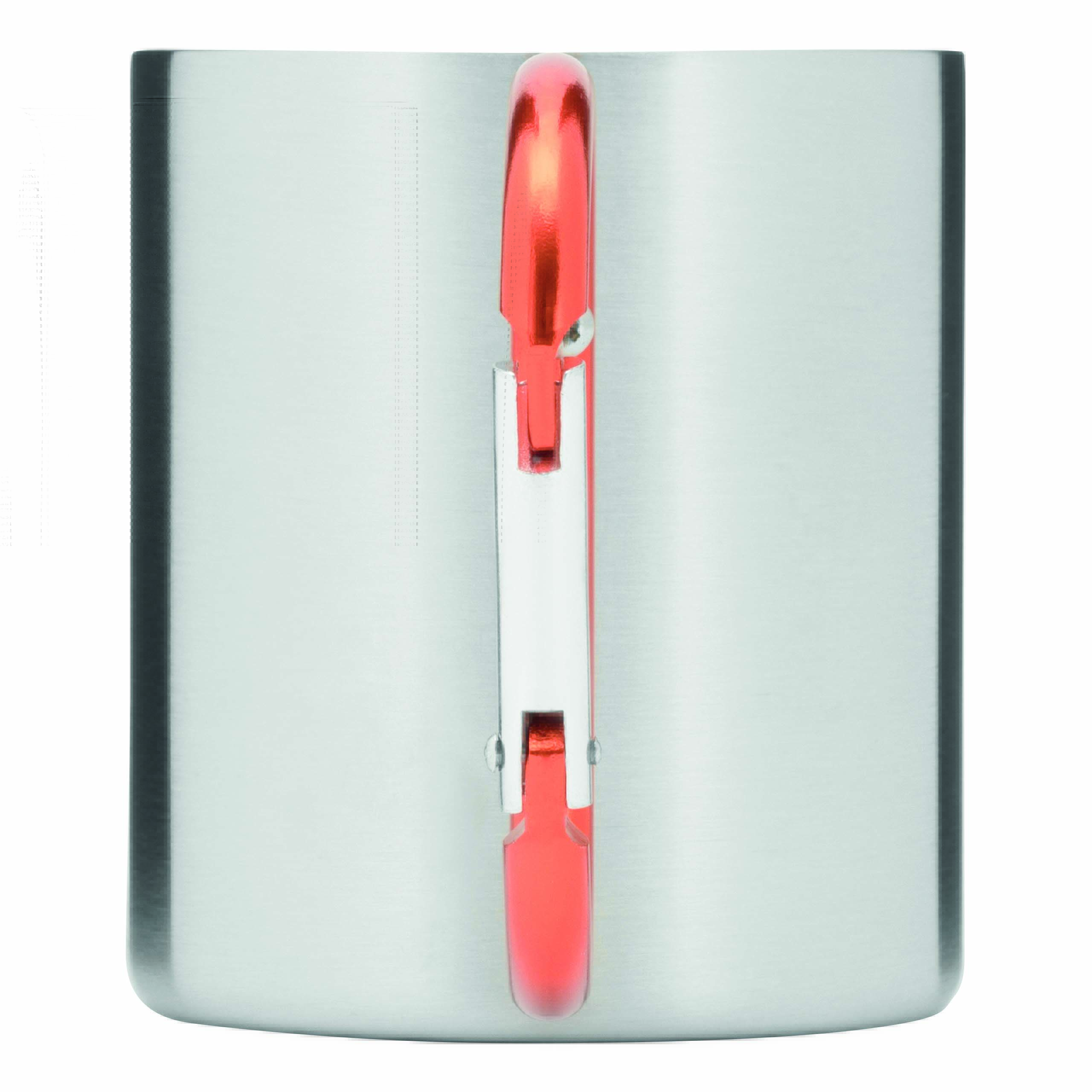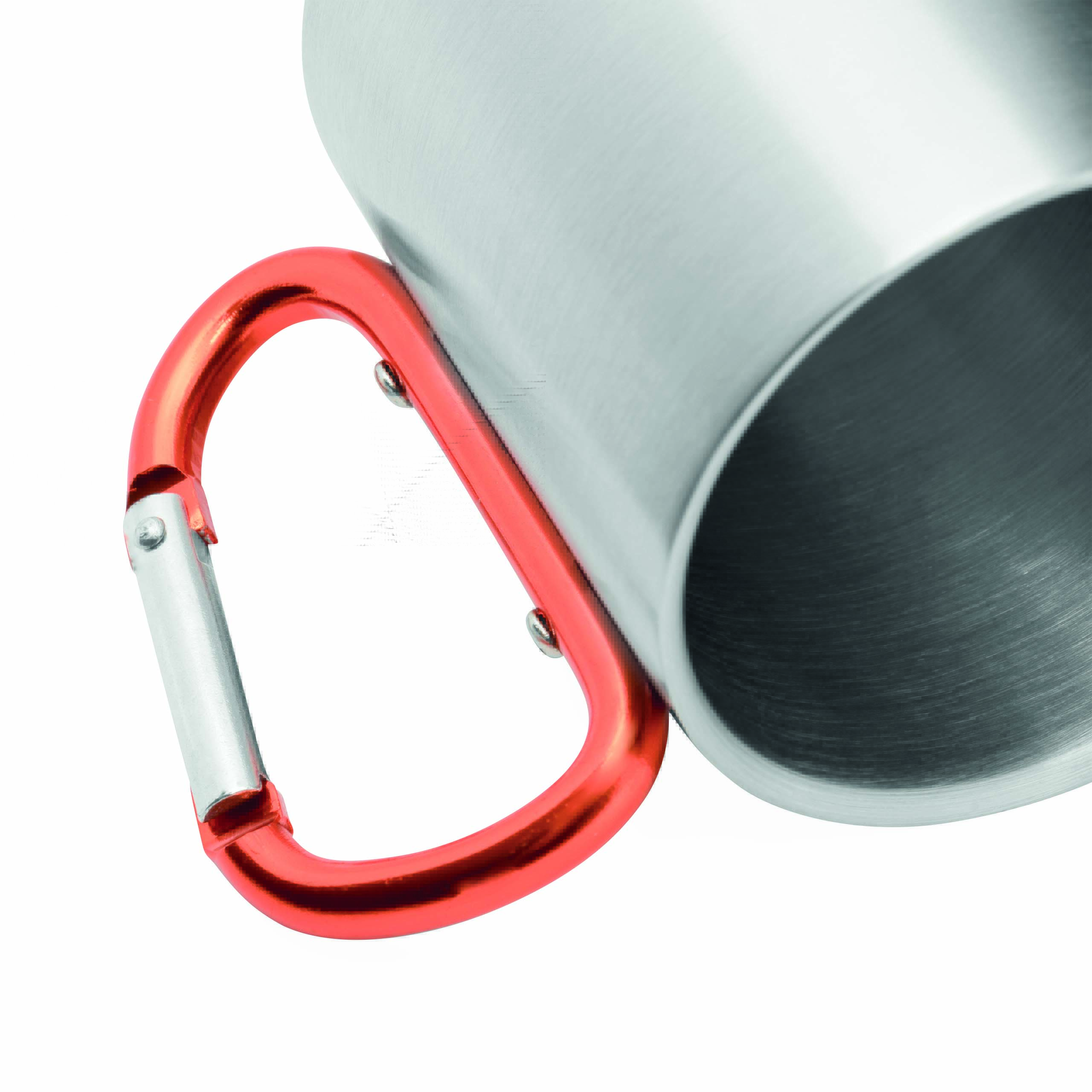 Kubek HIKING DAY ze stali nierdzewnej wewnątrz i na zewnątrz, pojemność ok. 200 ml, z kolorowym karabińczykiem.