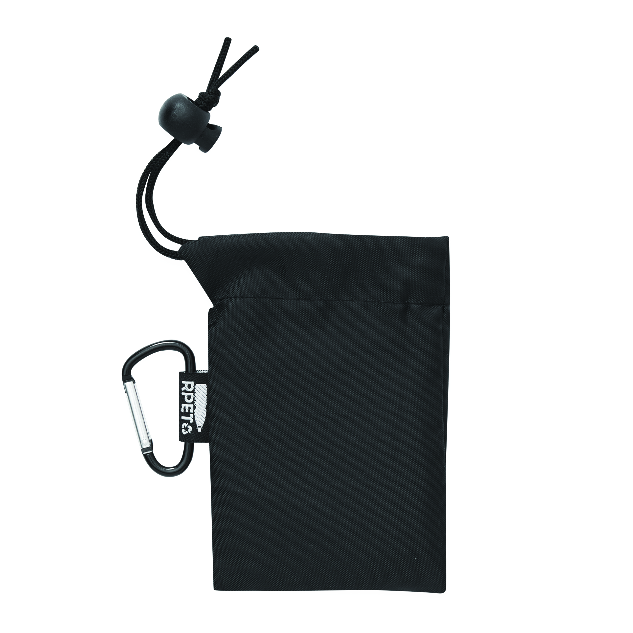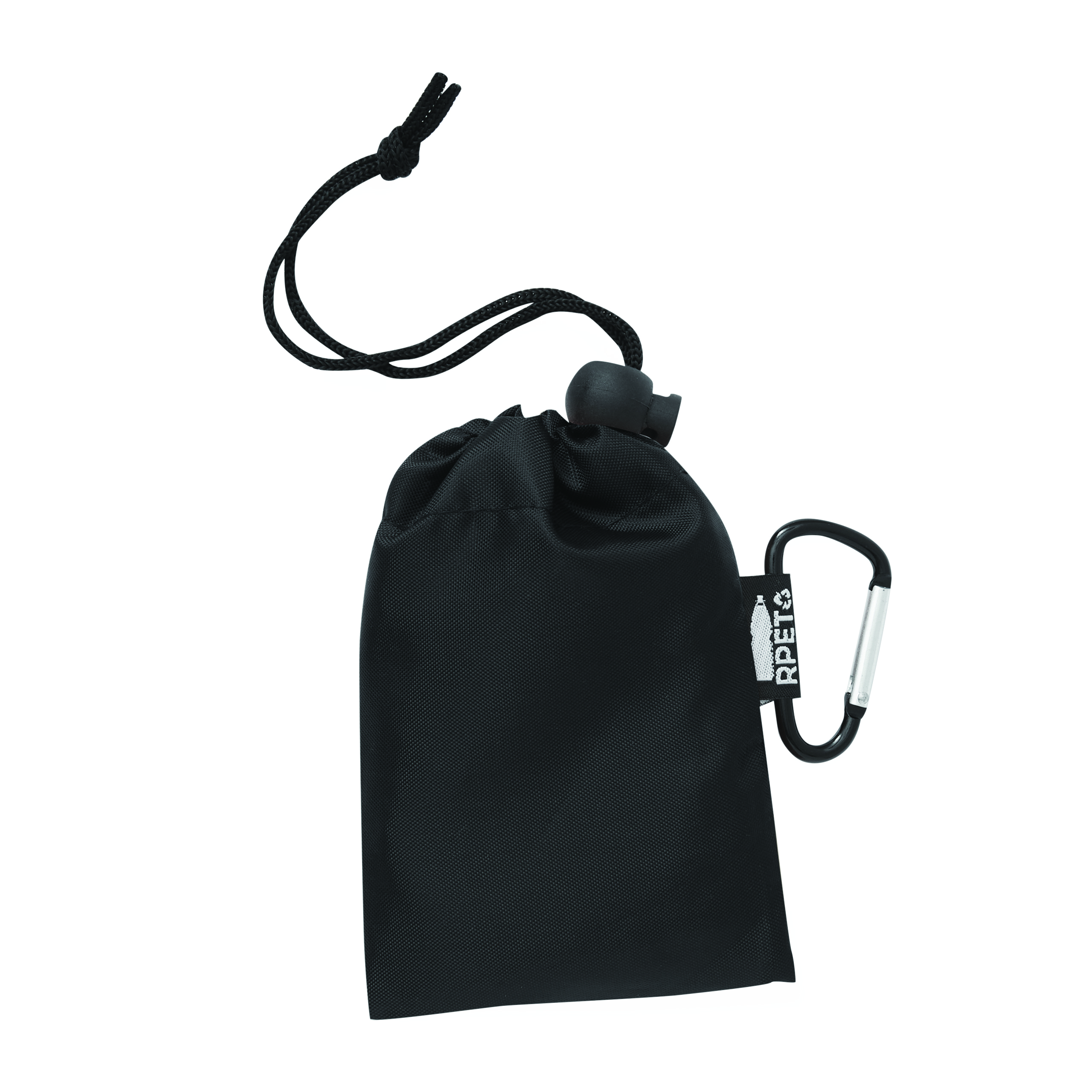 Poncho przeciwdeszczowe ECO SAFE: z kapturem, rozmiar uniwersalny, zapakowane w torbę RPET ze sznurkiem i karabińczykiem.
