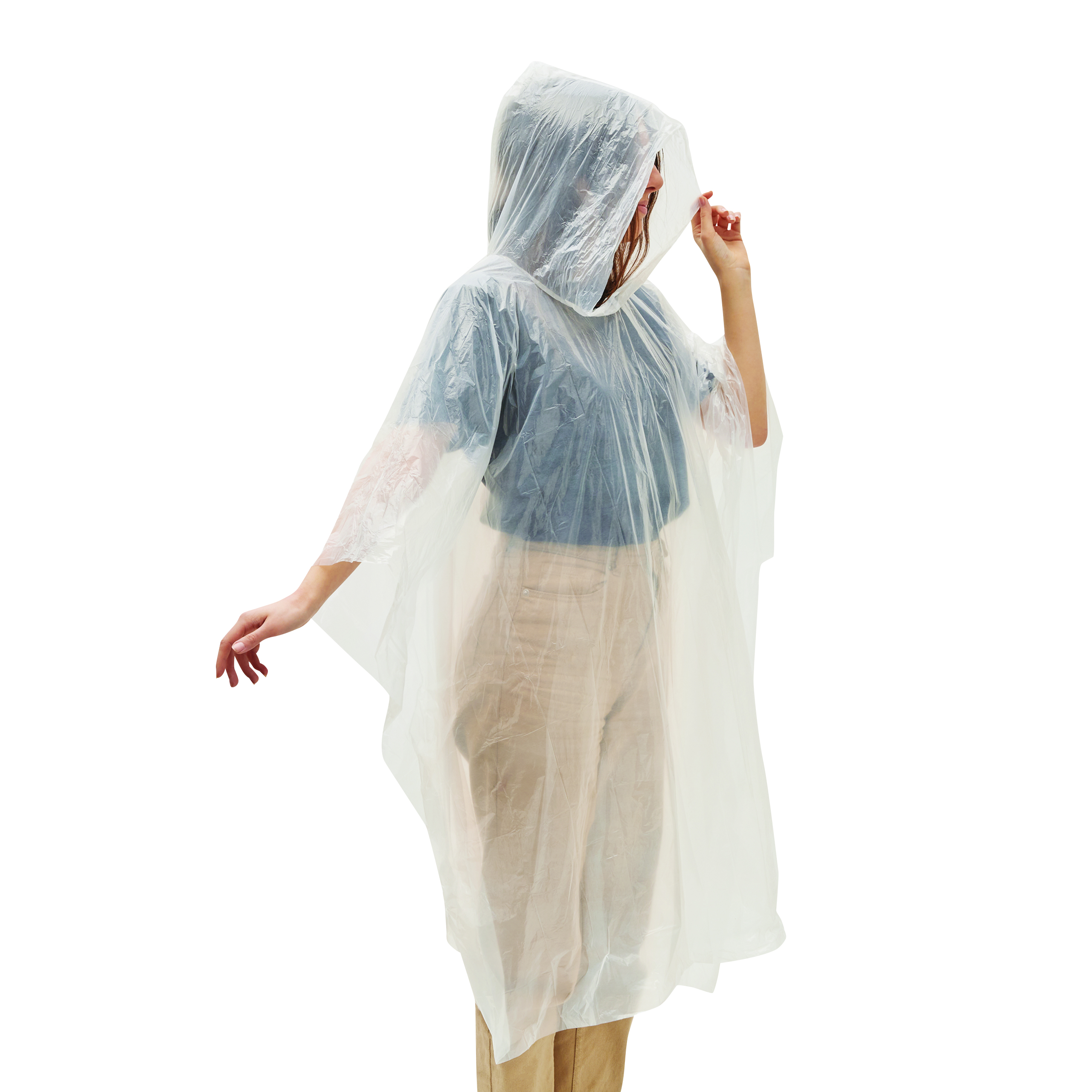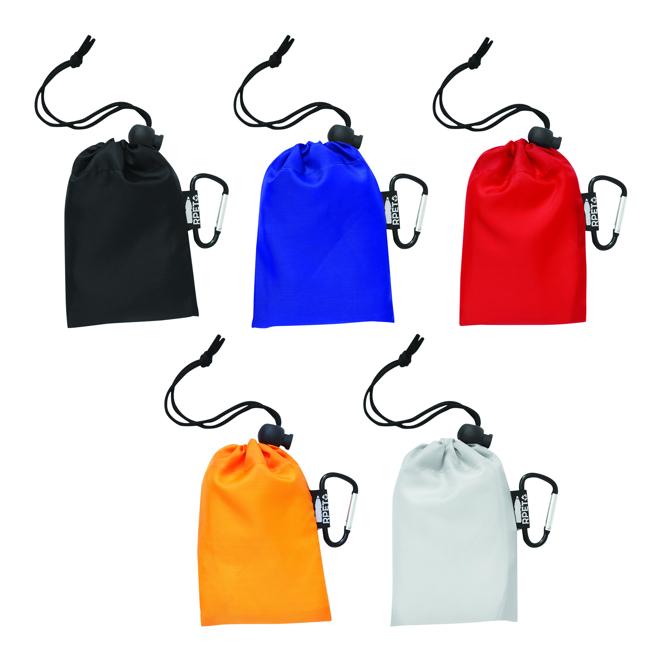 Poncho przeciwdeszczowe ECO SAFE: z kapturem, rozmiar uniwersalny, zapakowane w torbę RPET ze sznurkiem i karabińczykiem.