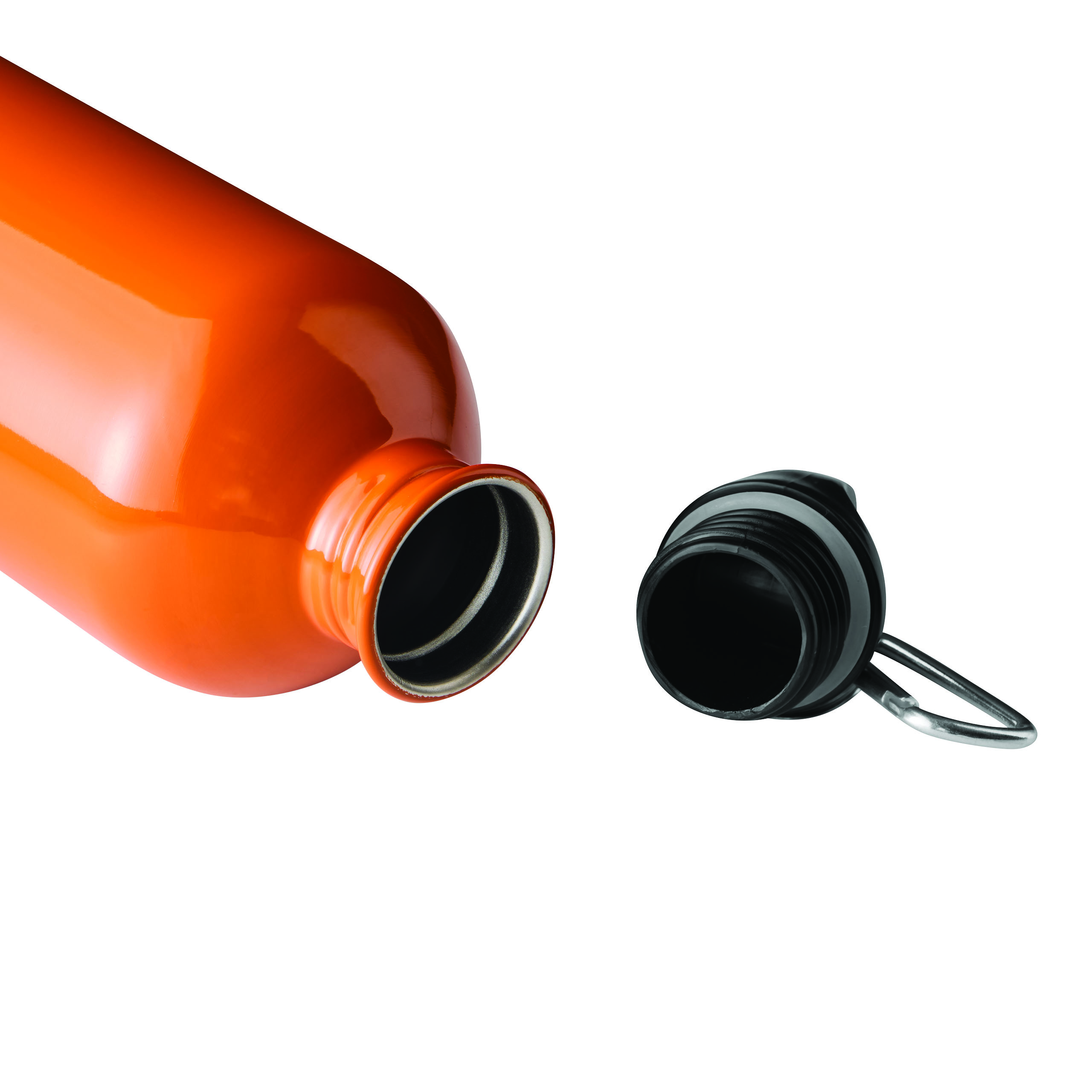 Butelka STEELTRANSIT z pojedynczą izolacją. Wykonana jest z recyklingowanej stali nierdzewnej. Posiada bezpieczną czarną zakrętkę z tworzywa sztucznego, silikonowy pierścień uszczelniający, uchwyt do przenoszenia, kółko na klucze i karabińczyk (karabińczyk NIE nadaje się do wspinaczki). Ma pojemność ok. 750 ml.