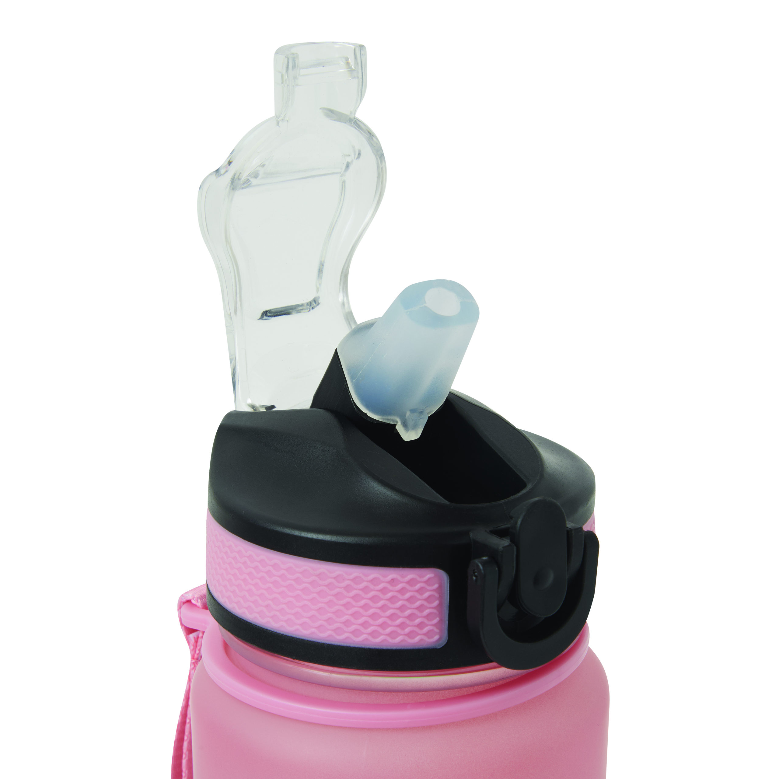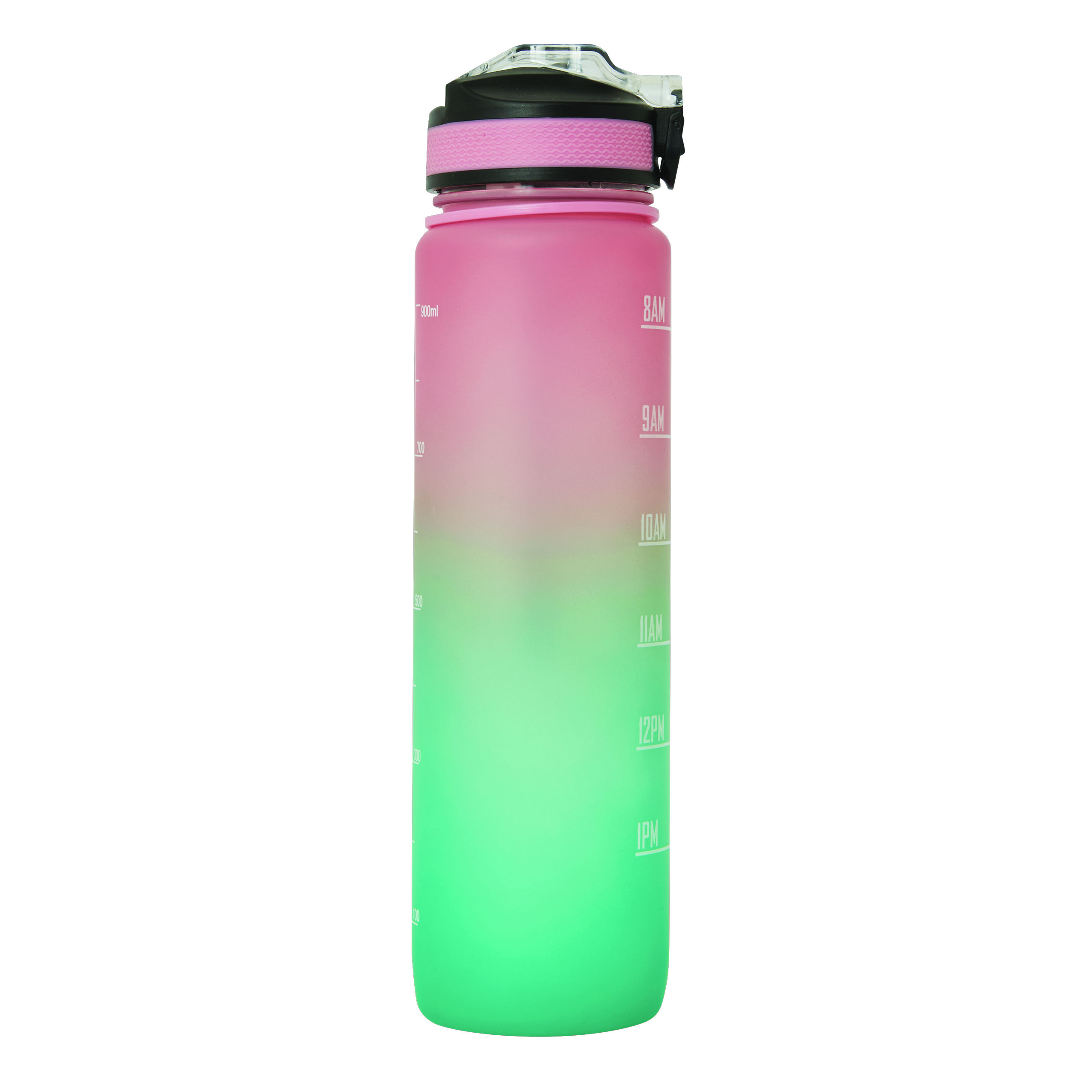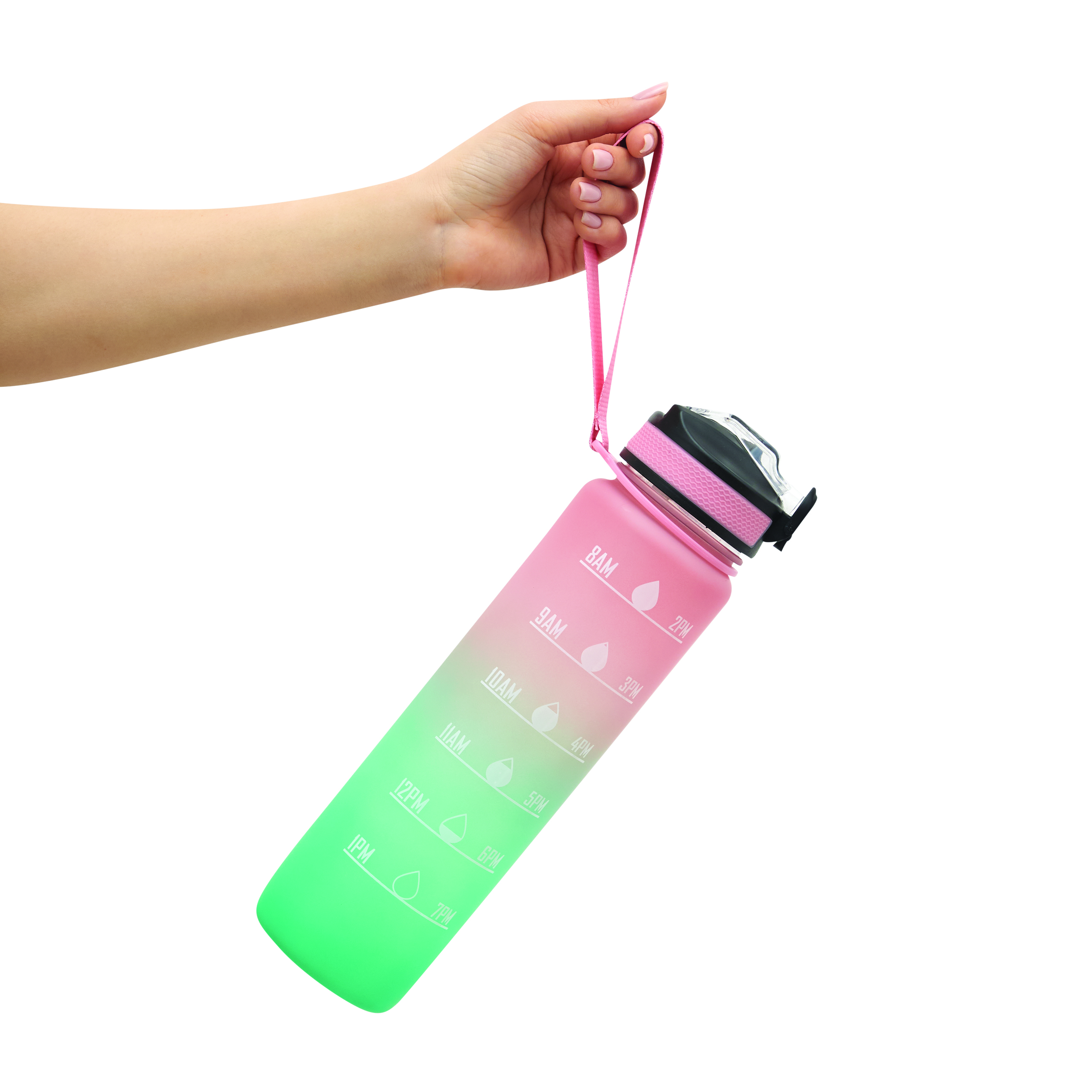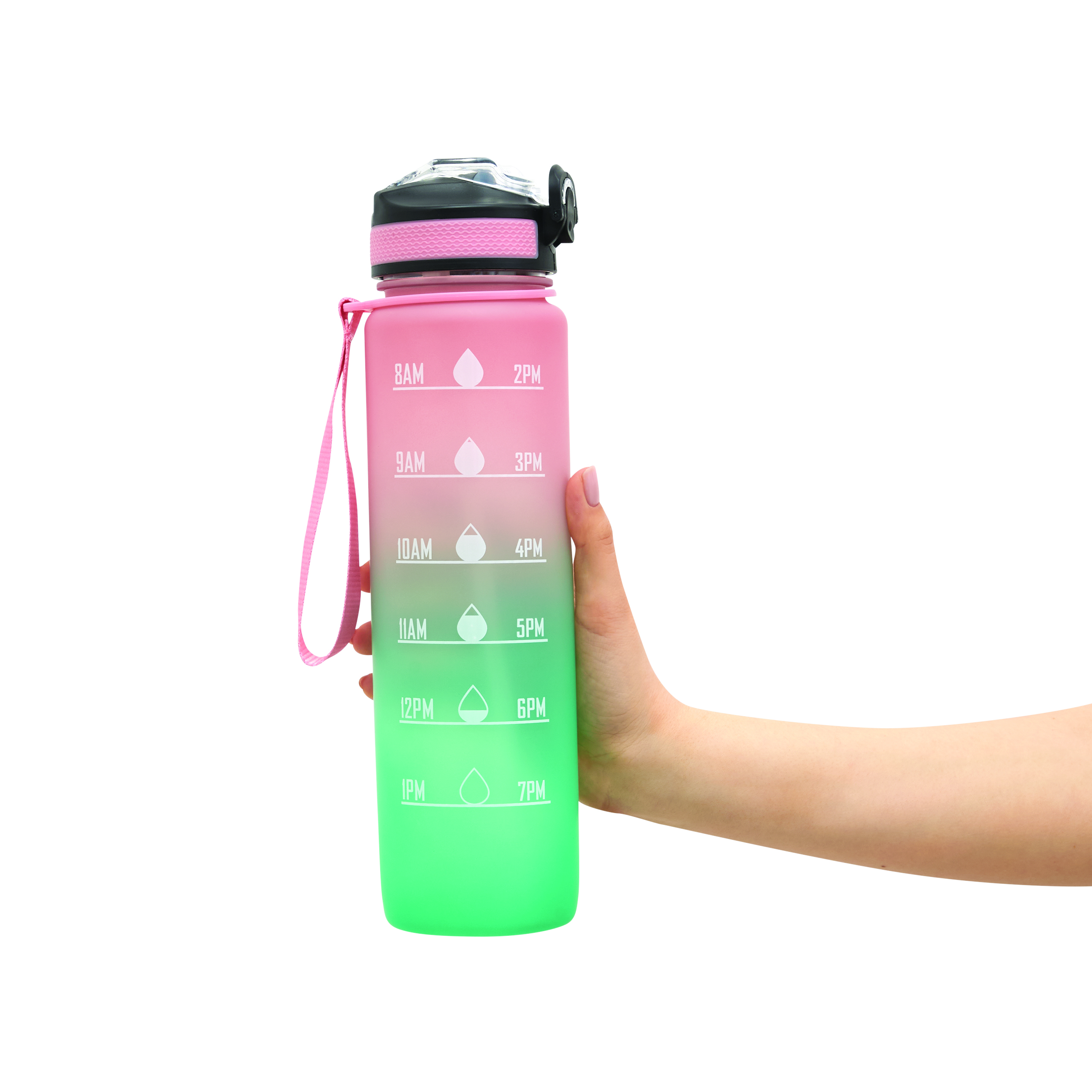 Sportowa butelka na wodę HYDRO LEVEL. Matowa, kolorowa butelka wykonana jest z wytrzymałego PETG. Ma dopasowaną kolorystycznie plastikową zakrętkę z silikonowym pierścieniem uszczelniającym, z blokadą bezpieczeństwa, zintegrowaną, wyjmowaną słomką i z miękkim silikonowym ustnikiem. Naciśnięcie przycisku podnosi ustnik i pokrywkę, co umożliwia obsługę jedną ręką. Posiada motywującą skalą czasu i objętości wody (pora dnia/ml) i pasek na rękę. O pojemności ok. 1000 ml. Zapakowana jest w pudełko.