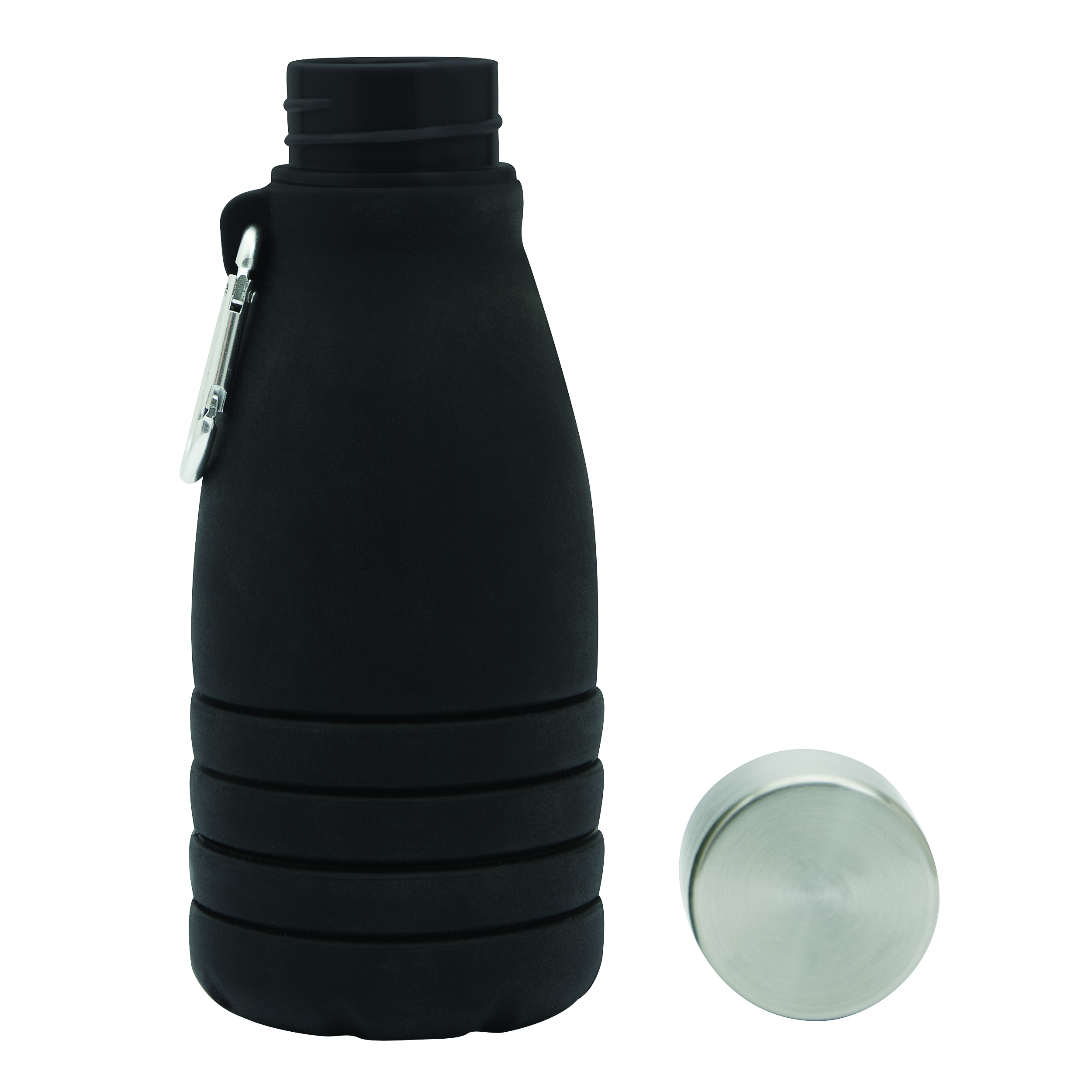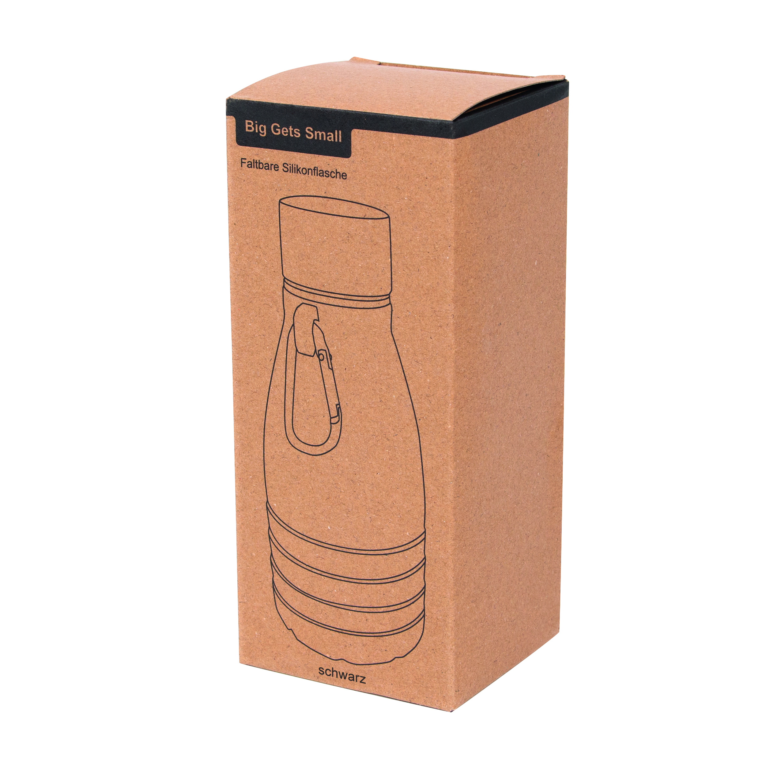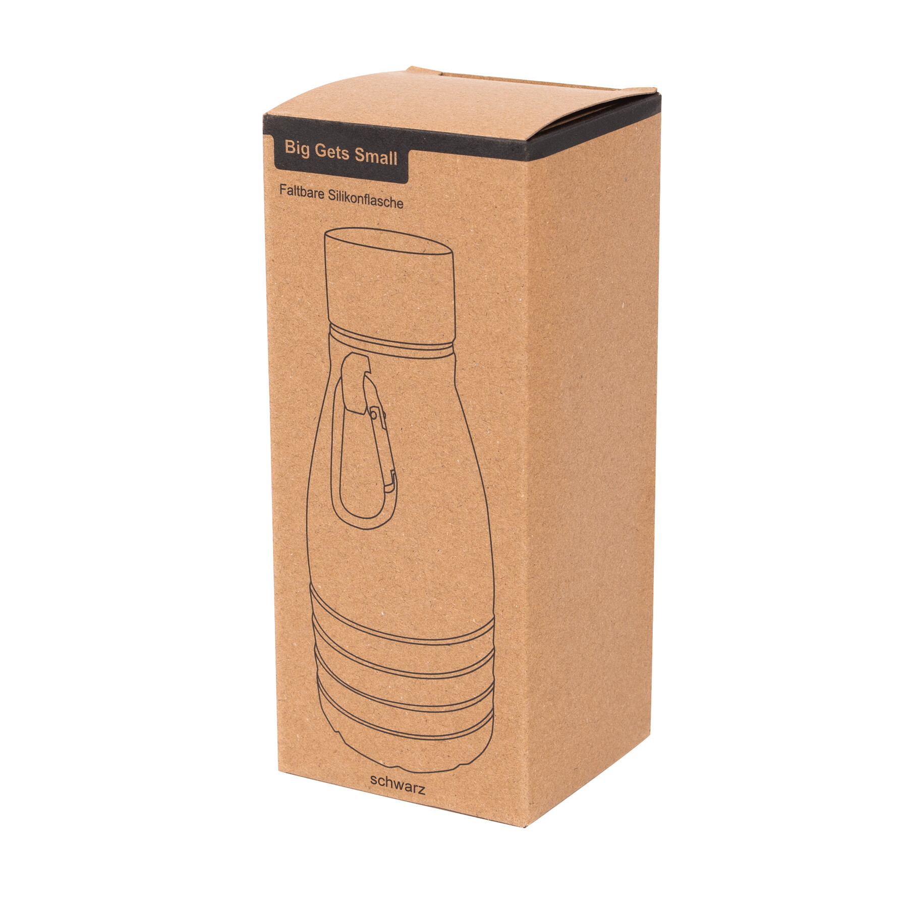 Składana butelka do picia BIG GETS SMALL. Posiada pokrywkę ze stali nierdzewnej z bezpieczną zakrętką i silikonowym pierścieniem uszczelniającym oraz aluminiowy karabińczyk (NIE nadaje się on do zabezpieczenia podczas wspinaczki). Butelkę można rozsuwać i składać o około 8 cm. Pojemność kubka to ok. 550 ml.