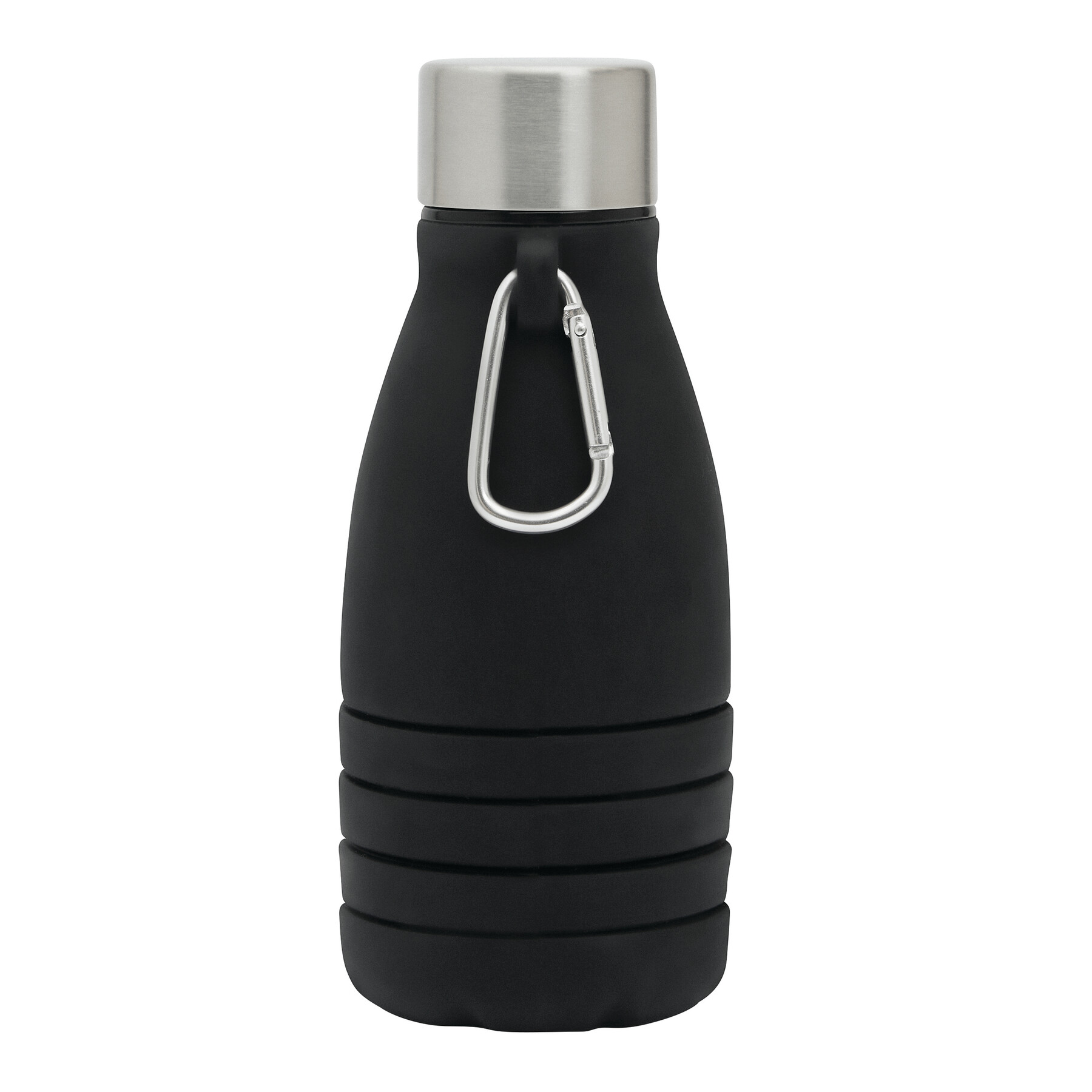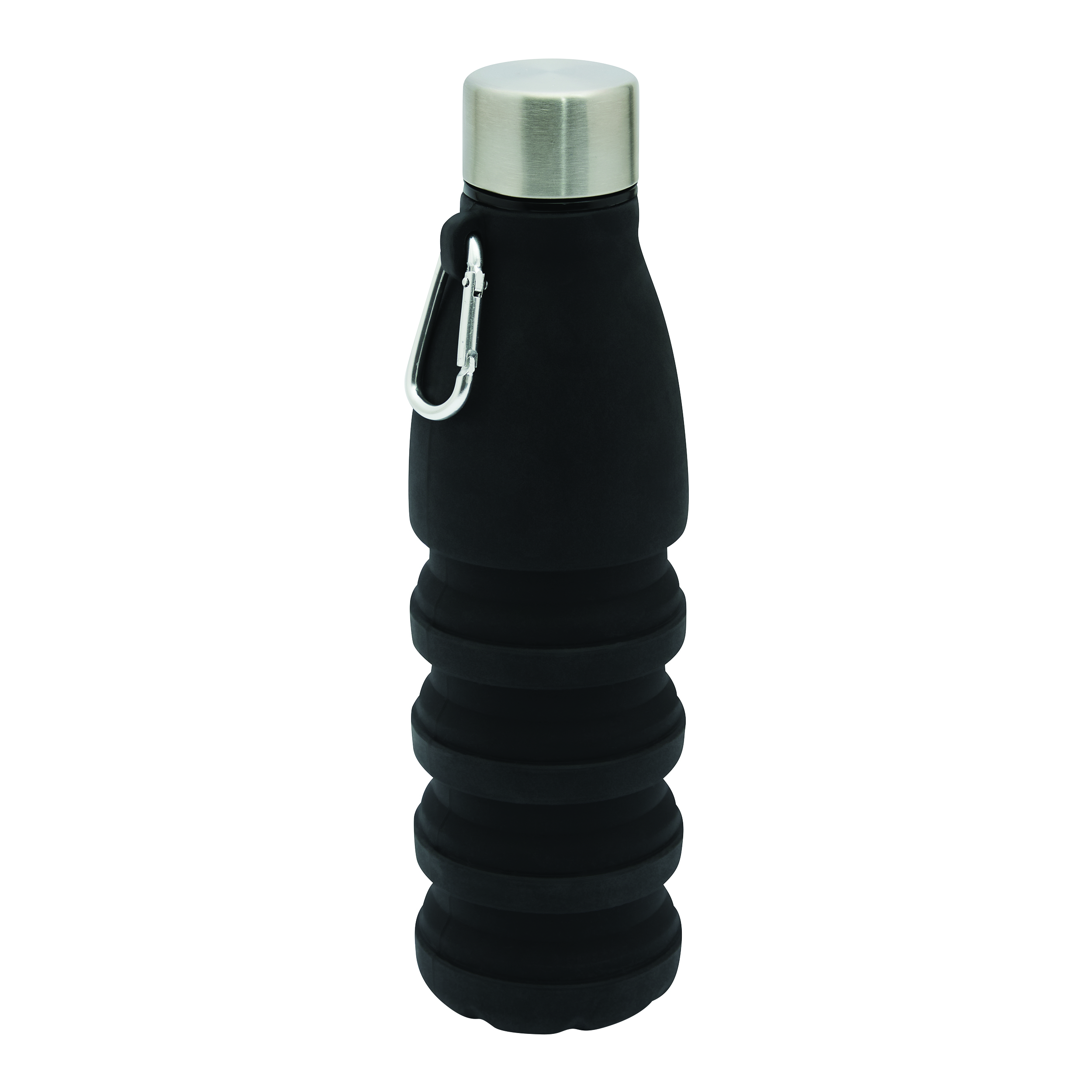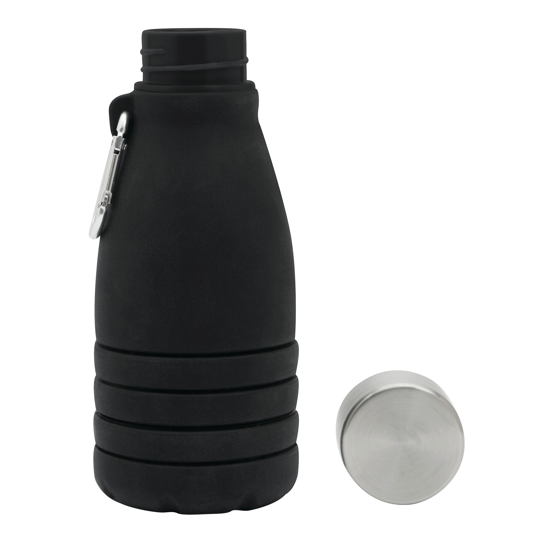 Składana butelka do picia BIG GETS SMALL. Posiada pokrywkę ze stali nierdzewnej z bezpieczną zakrętką i silikonowym pierścieniem uszczelniającym oraz aluminiowy karabińczyk (NIE nadaje się on do zabezpieczenia podczas wspinaczki). Butelkę można rozsuwać i składać o około 8 cm. Pojemność kubka to ok. 550 ml.