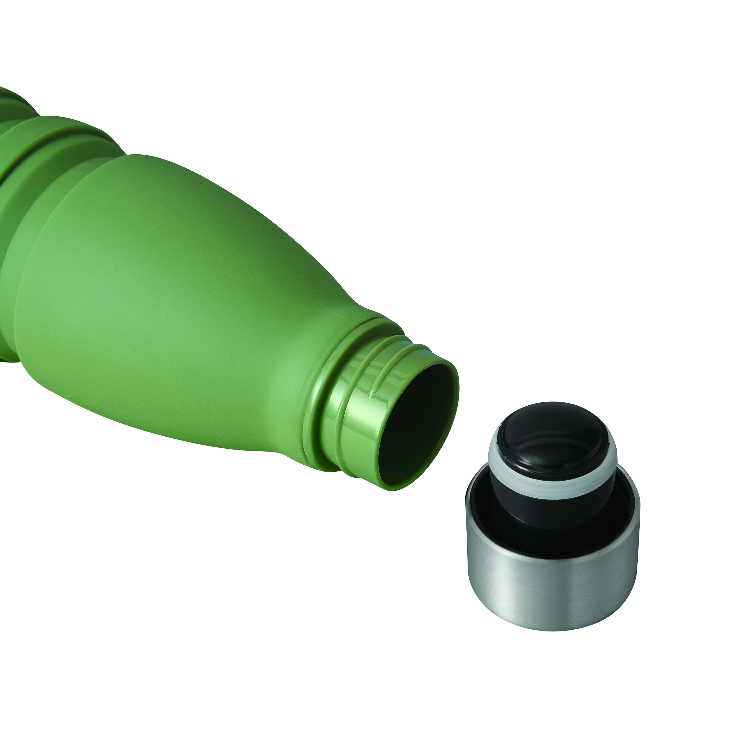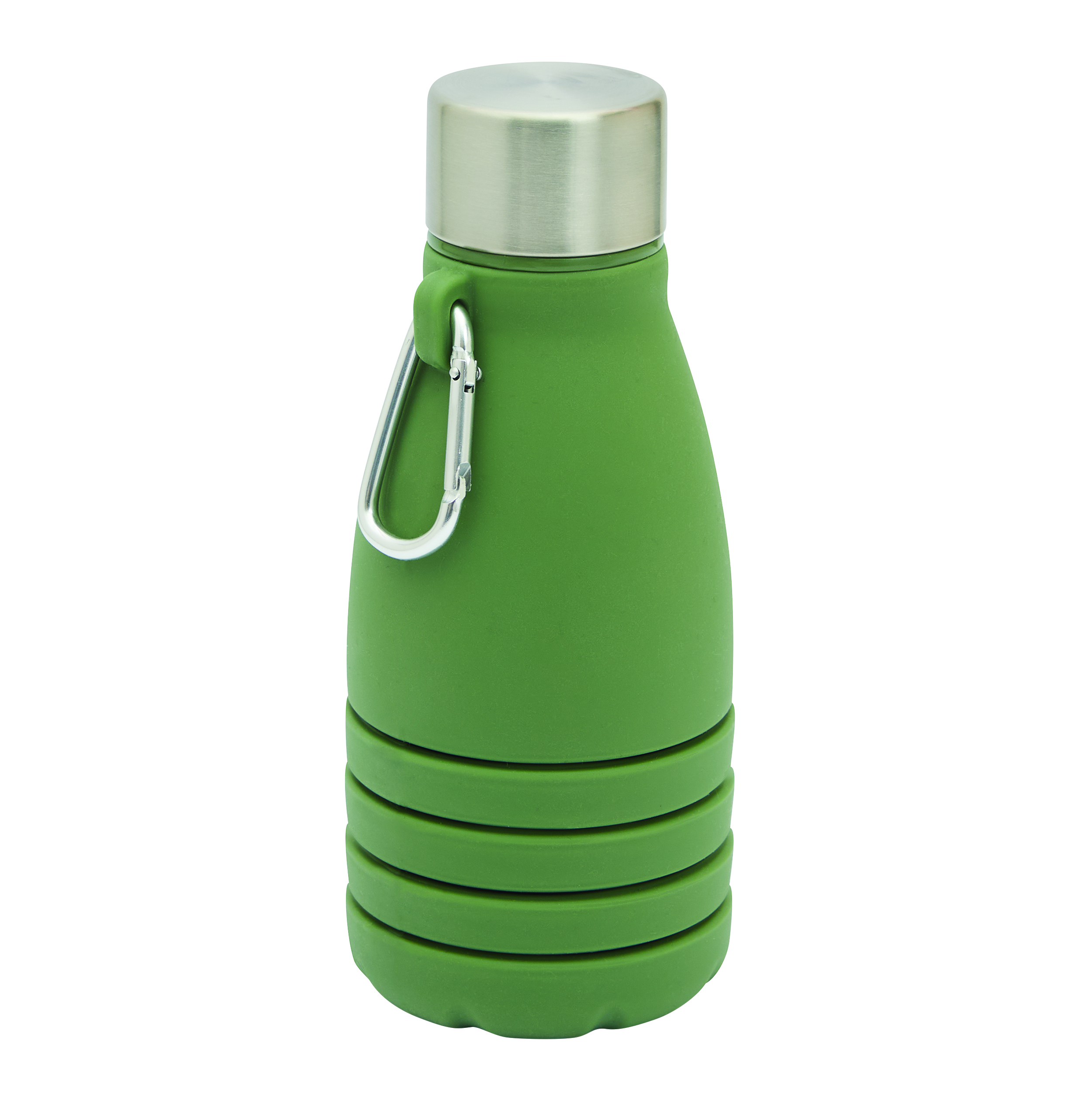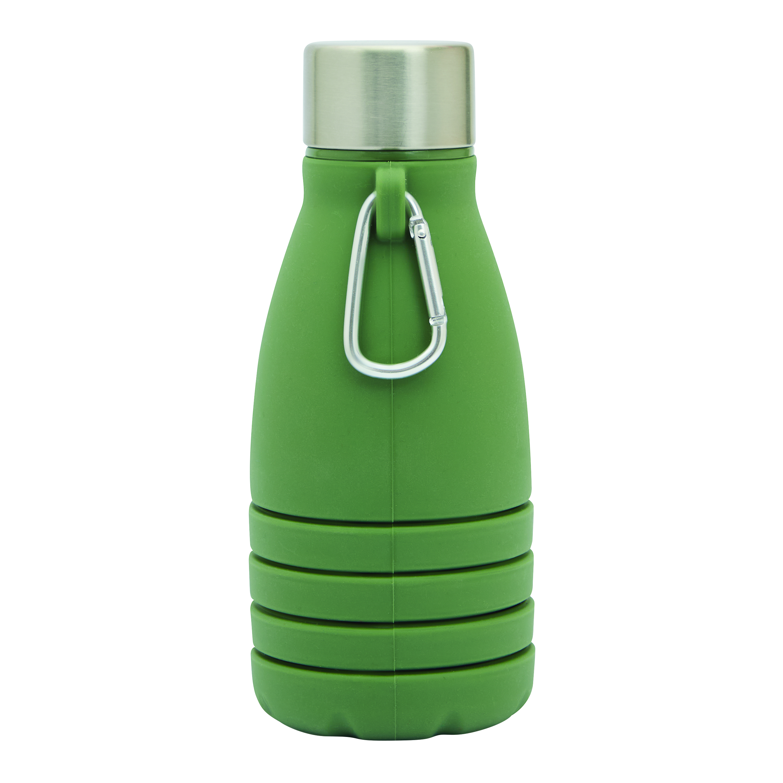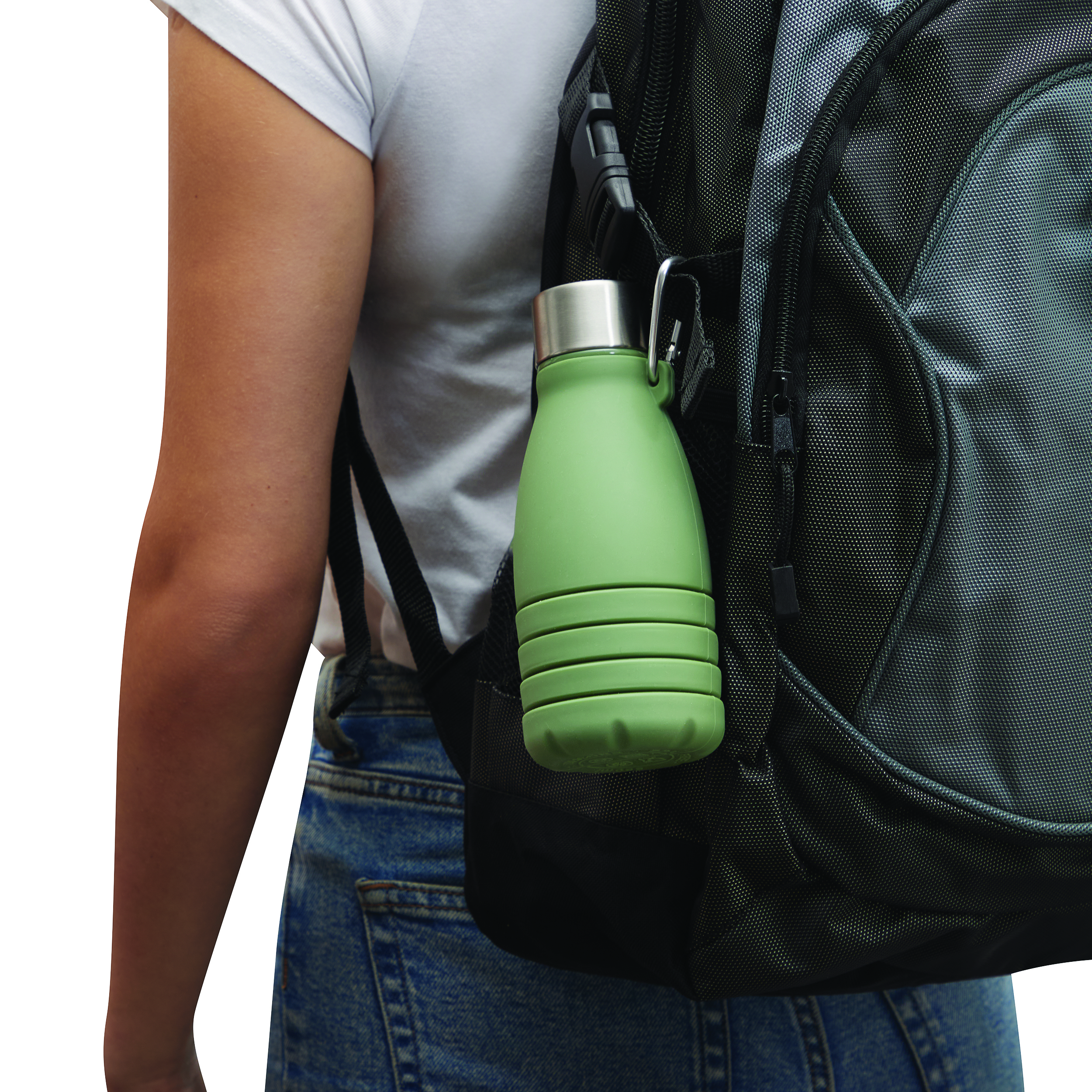 Składana butelka do picia BIG GETS SMALL. Posiada pokrywkę ze stali nierdzewnej z bezpieczną zakrętką i silikonowym pierścieniem uszczelniającym oraz aluminiowy karabińczyk (NIE nadaje się on do zabezpieczenia podczas wspinaczki). Butelkę można rozsuwać i składać o około 8 cm. Pojemność kubka to ok. 550 ml.