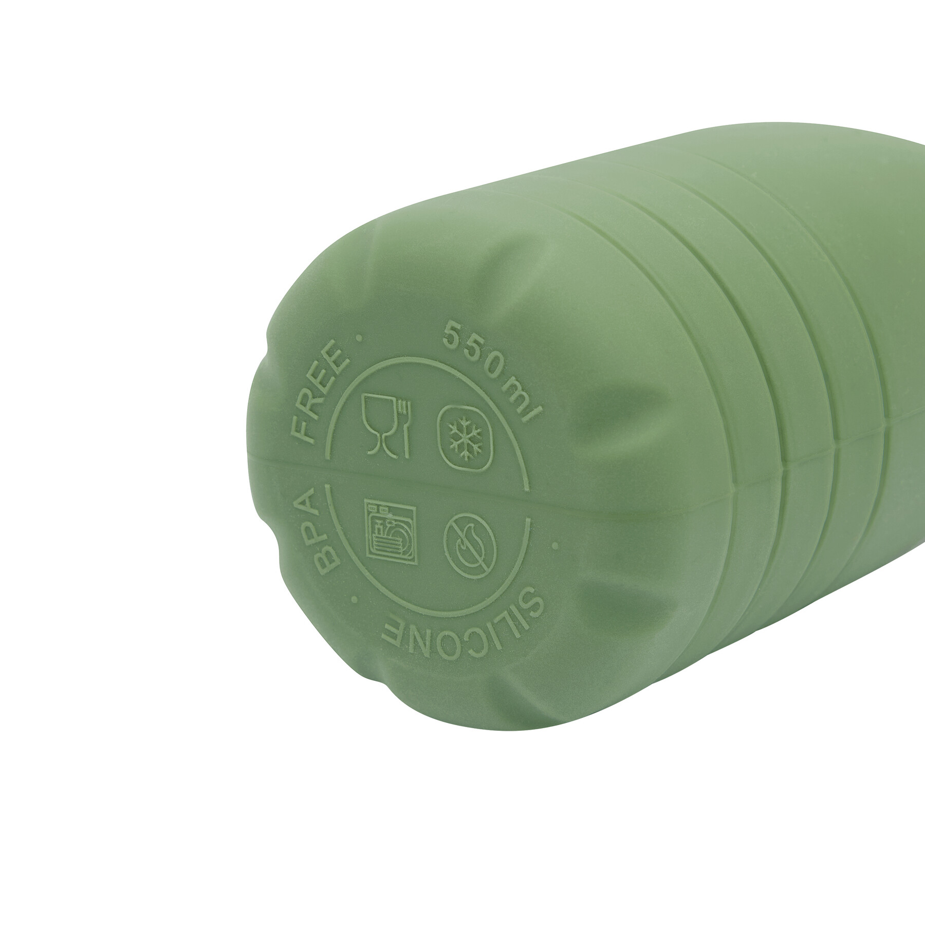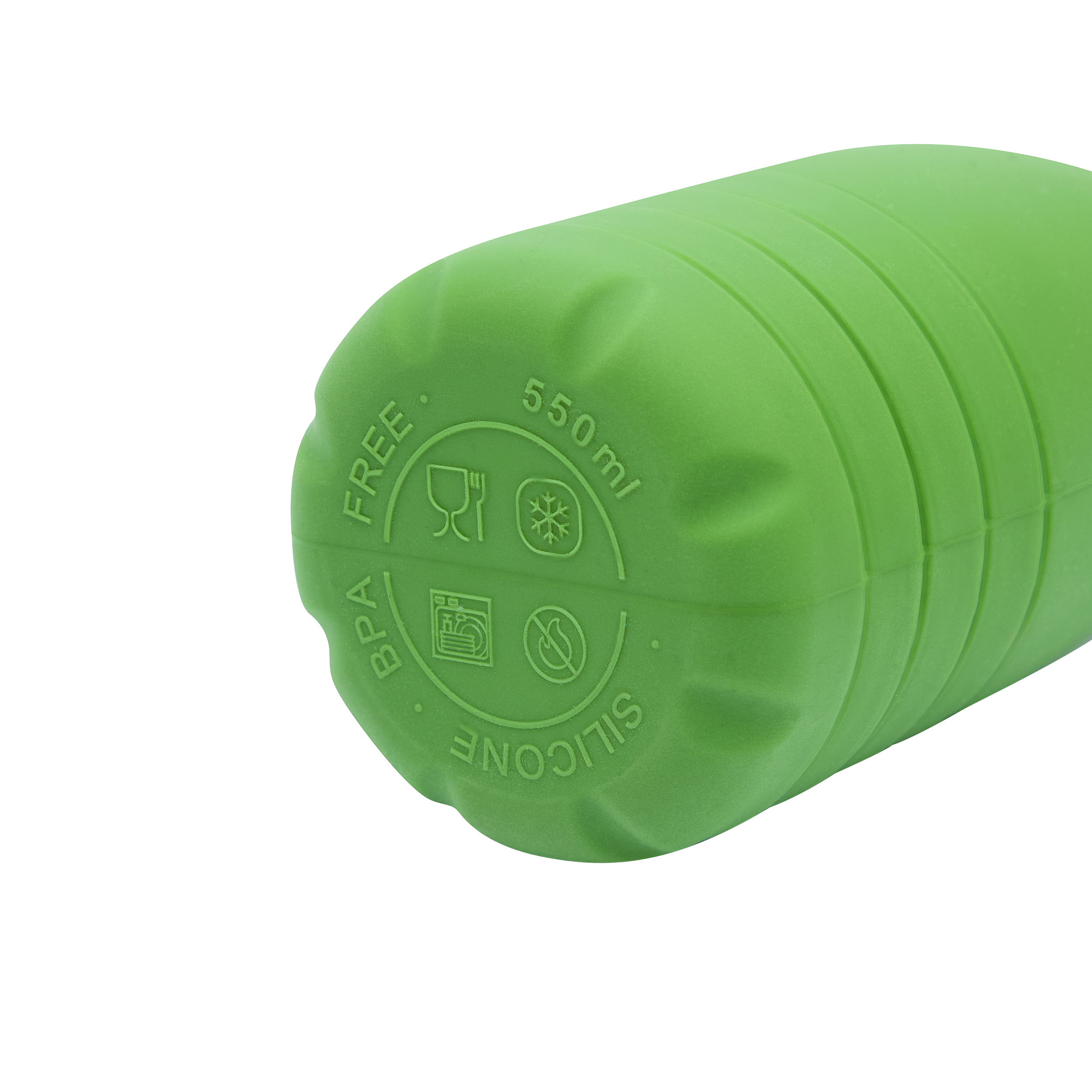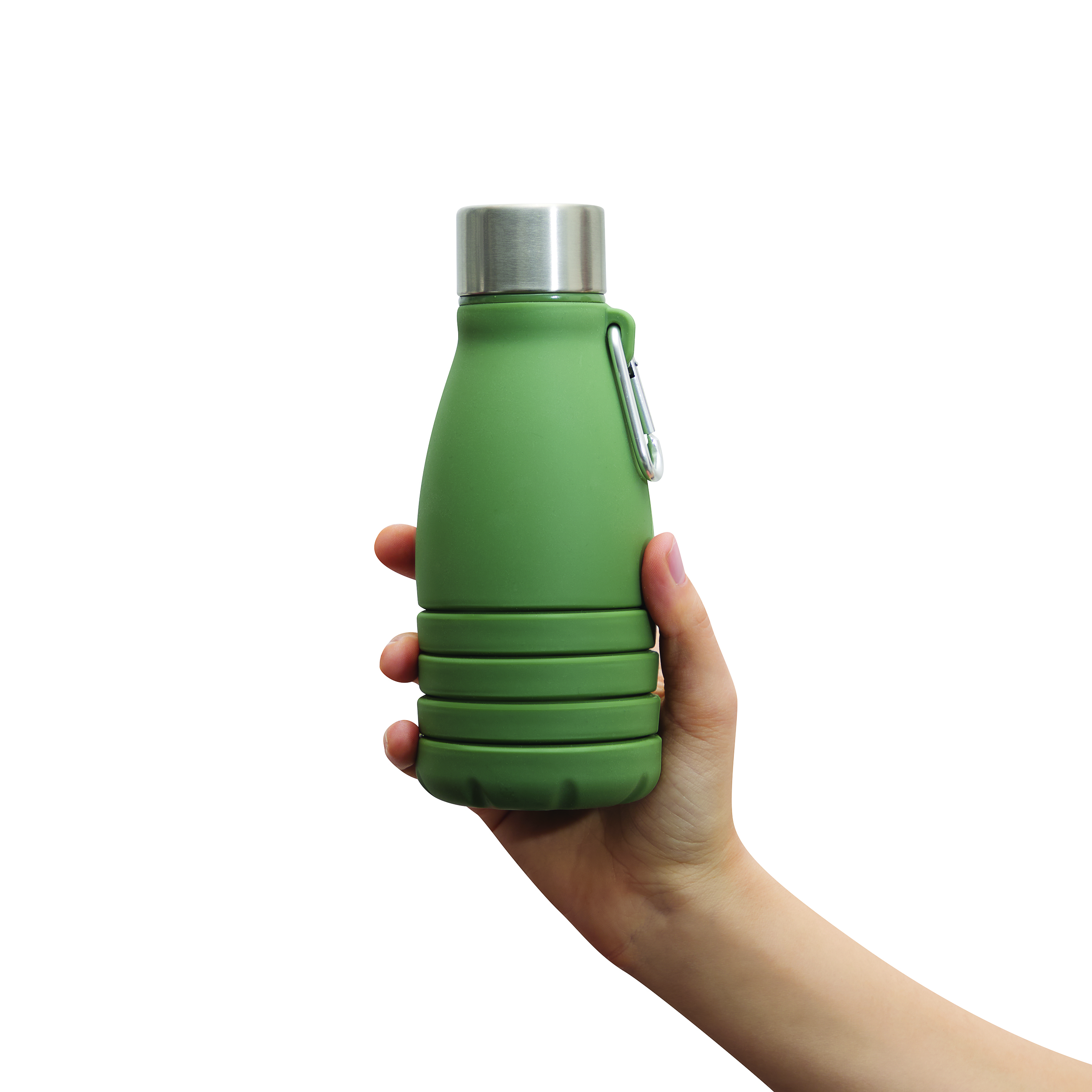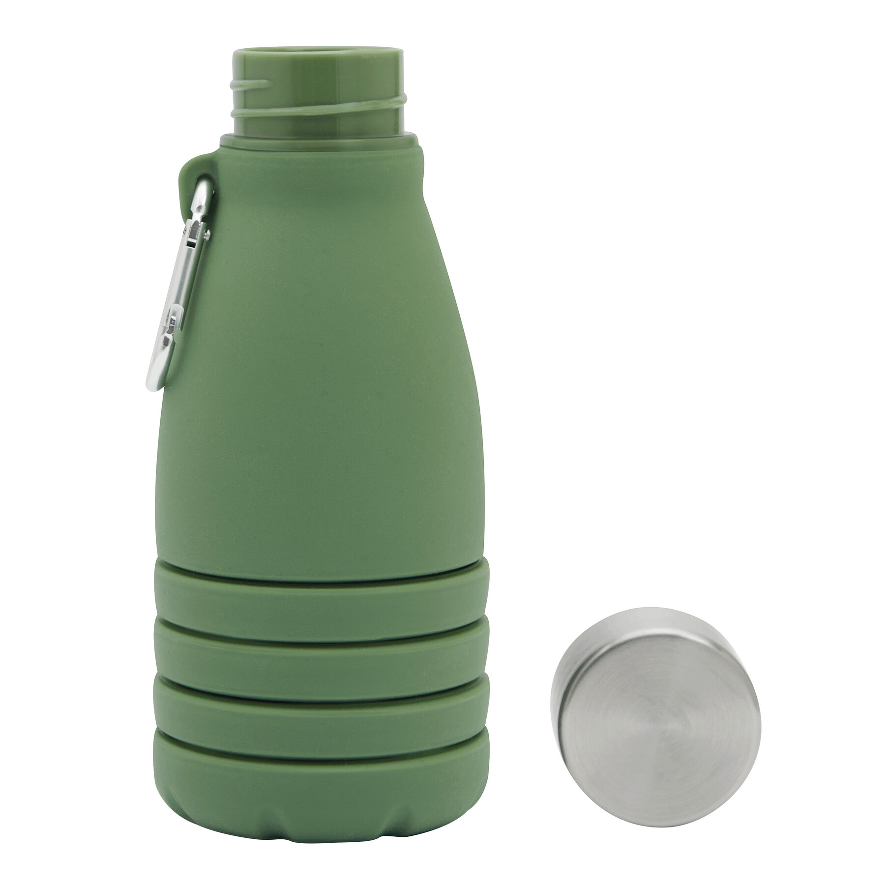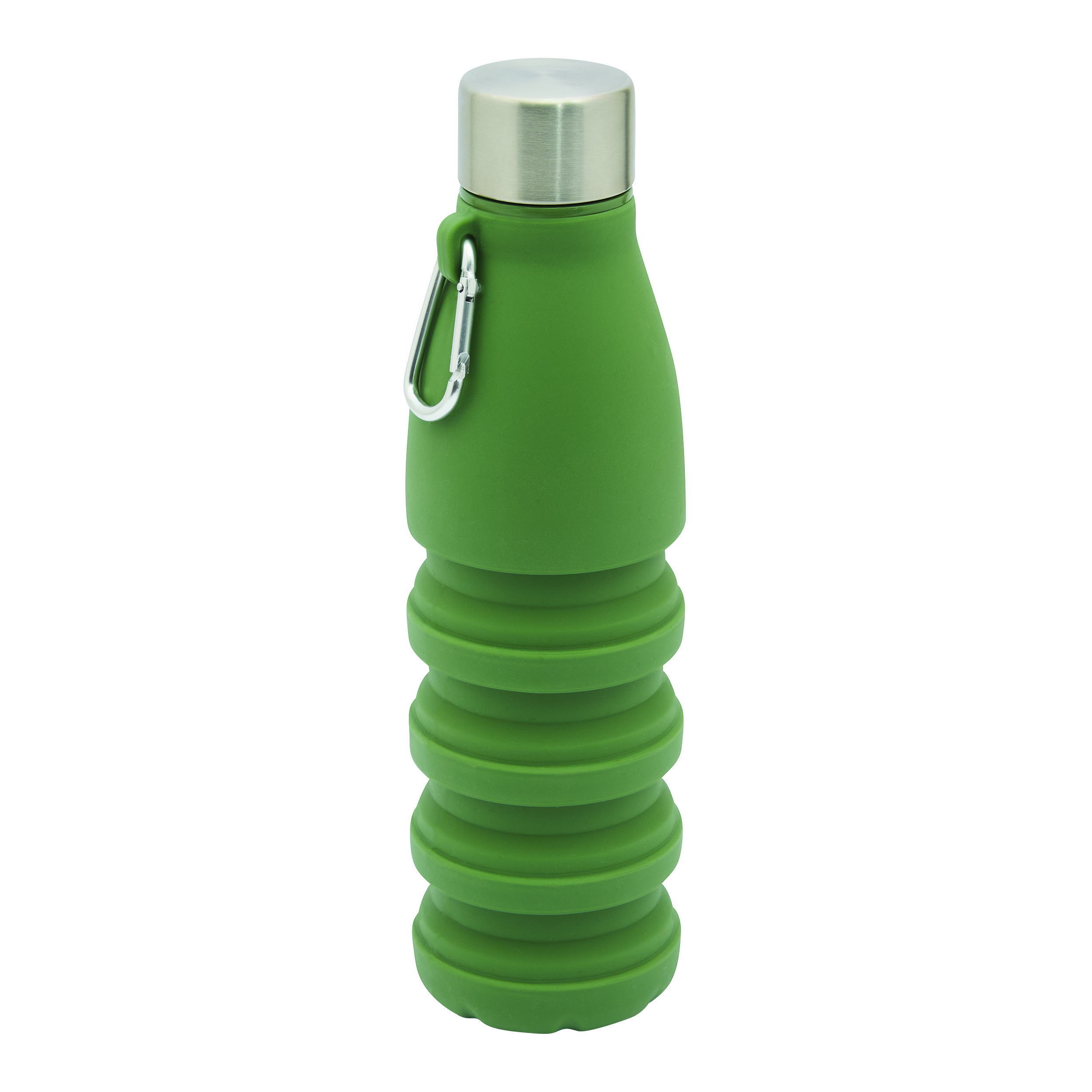 Składana butelka do picia BIG GETS SMALL. Posiada pokrywkę ze stali nierdzewnej z bezpieczną zakrętką i silikonowym pierścieniem uszczelniającym oraz aluminiowy karabińczyk (NIE nadaje się on do zabezpieczenia podczas wspinaczki). Butelkę można rozsuwać i składać o około 8 cm. Pojemność kubka to ok. 550 ml.
