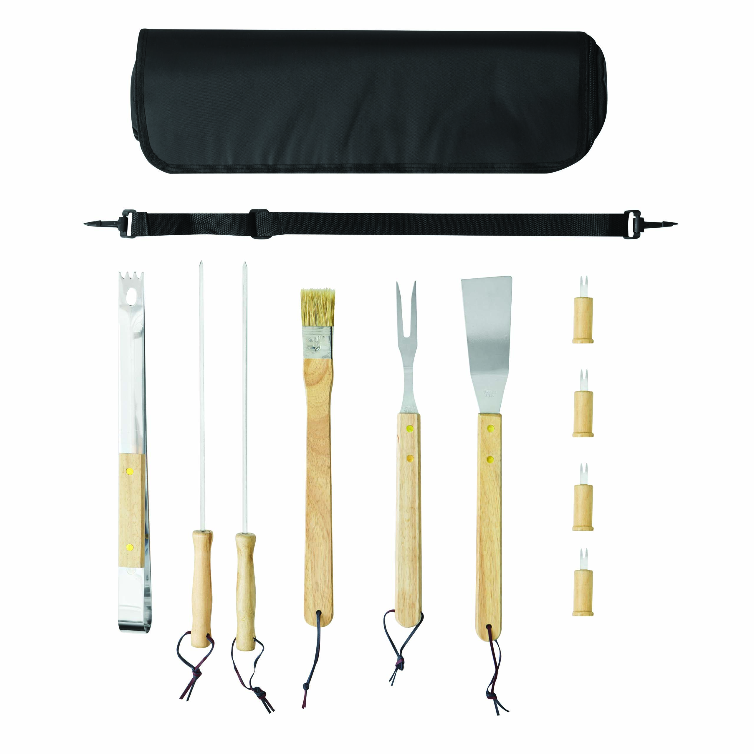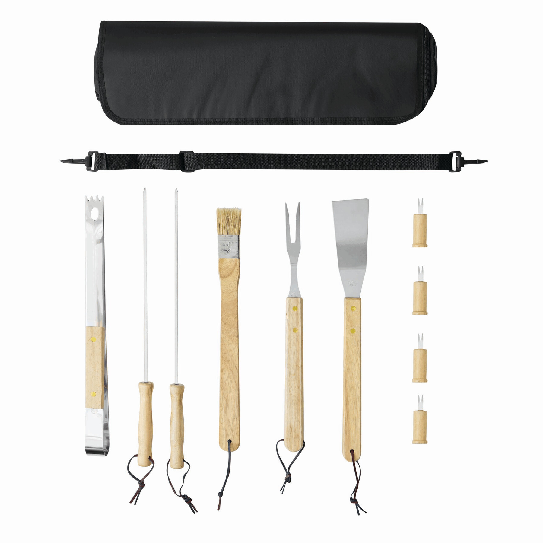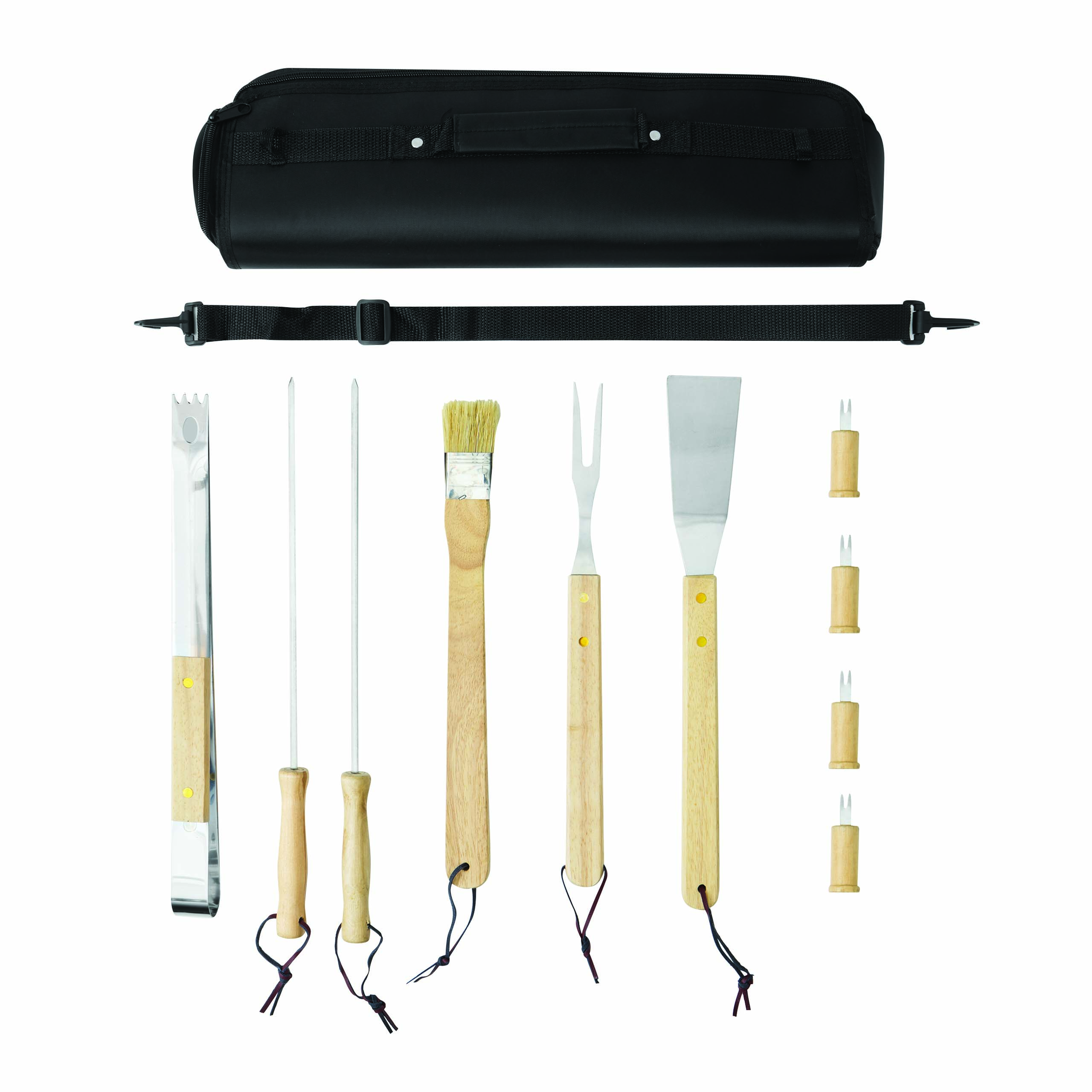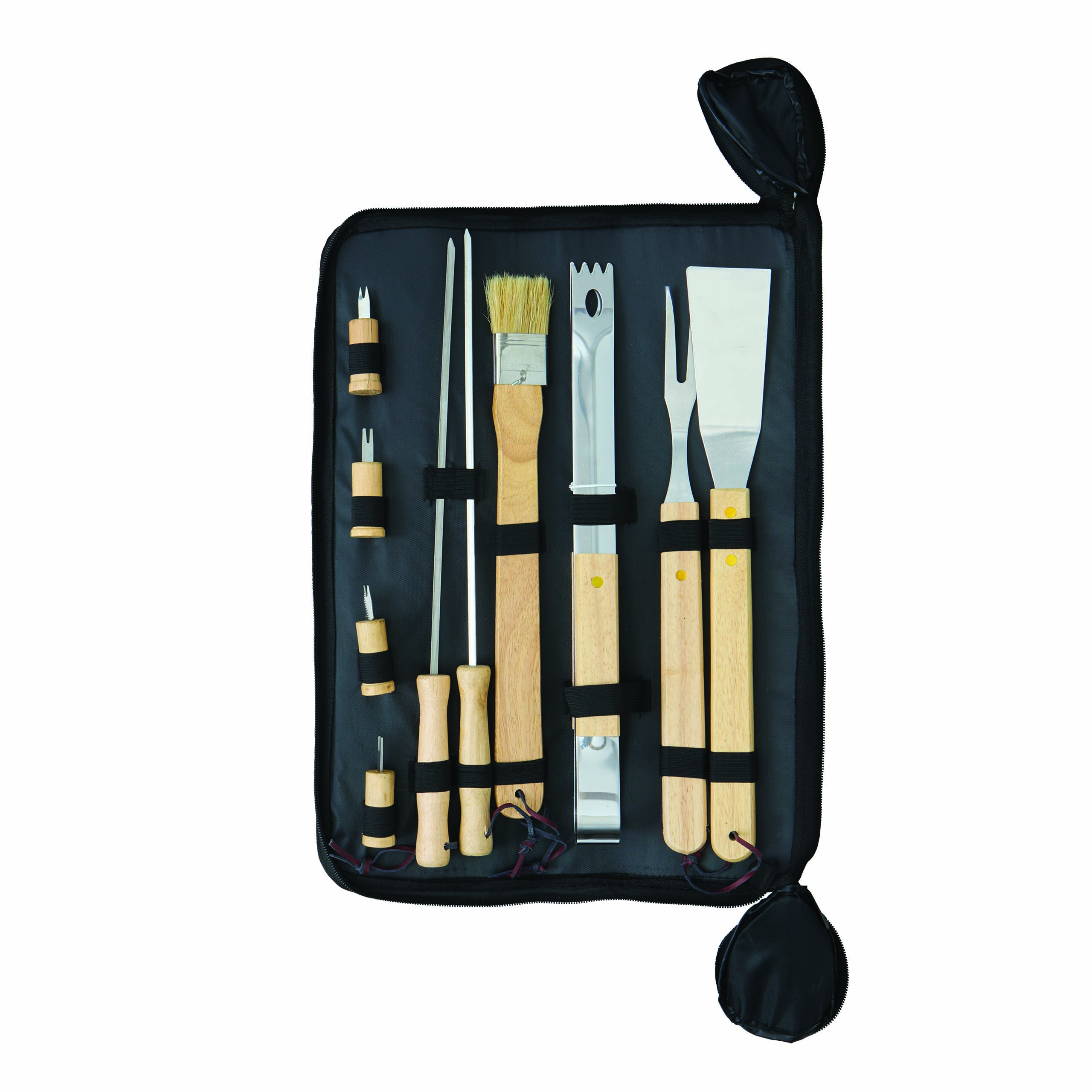Przybory do grillowania FRIED. Wysokiej jakości przybory wykonane ze stali nierdzewnej, z drewnianymi rączkami, pakowane w torbę z zamkiem błyskawicznym.