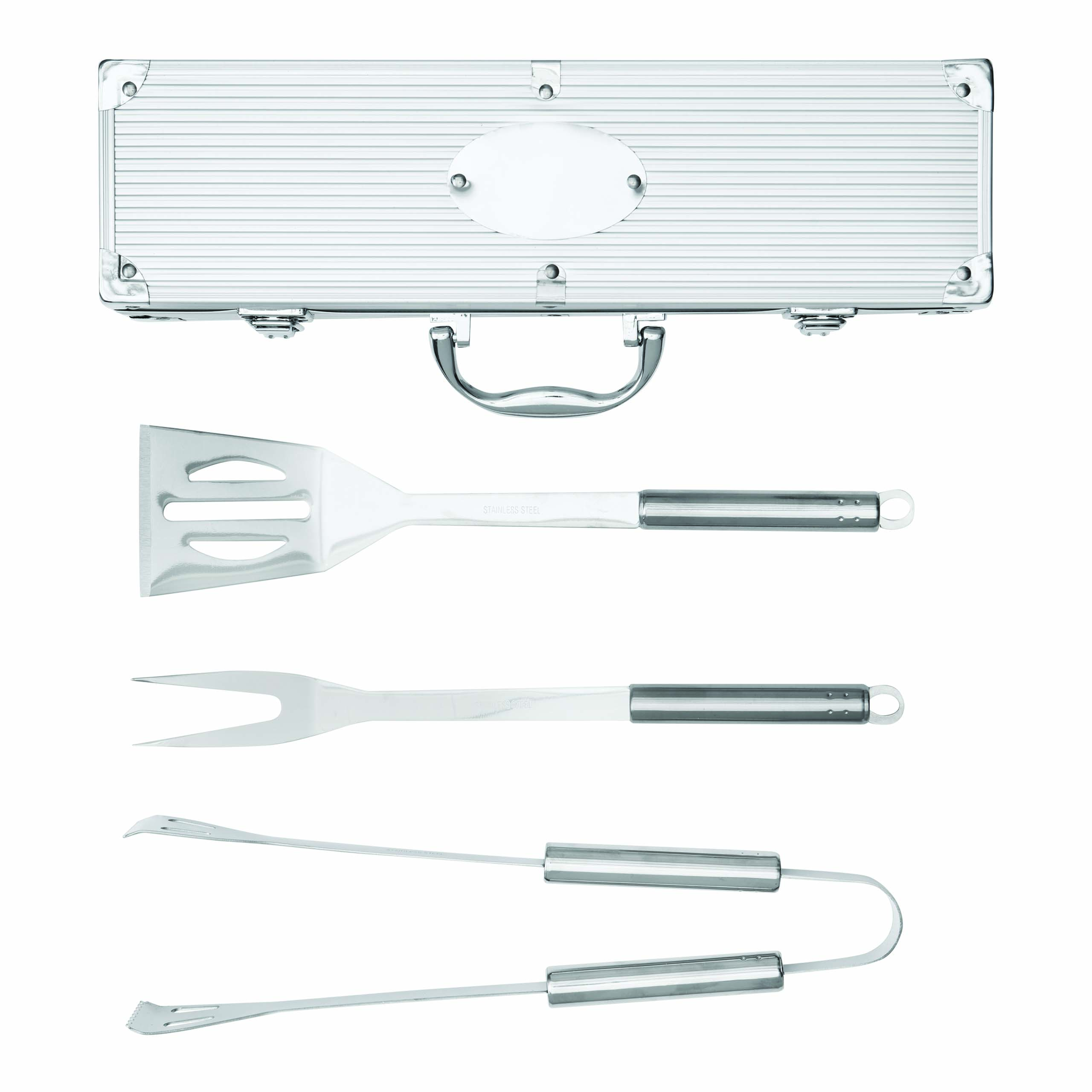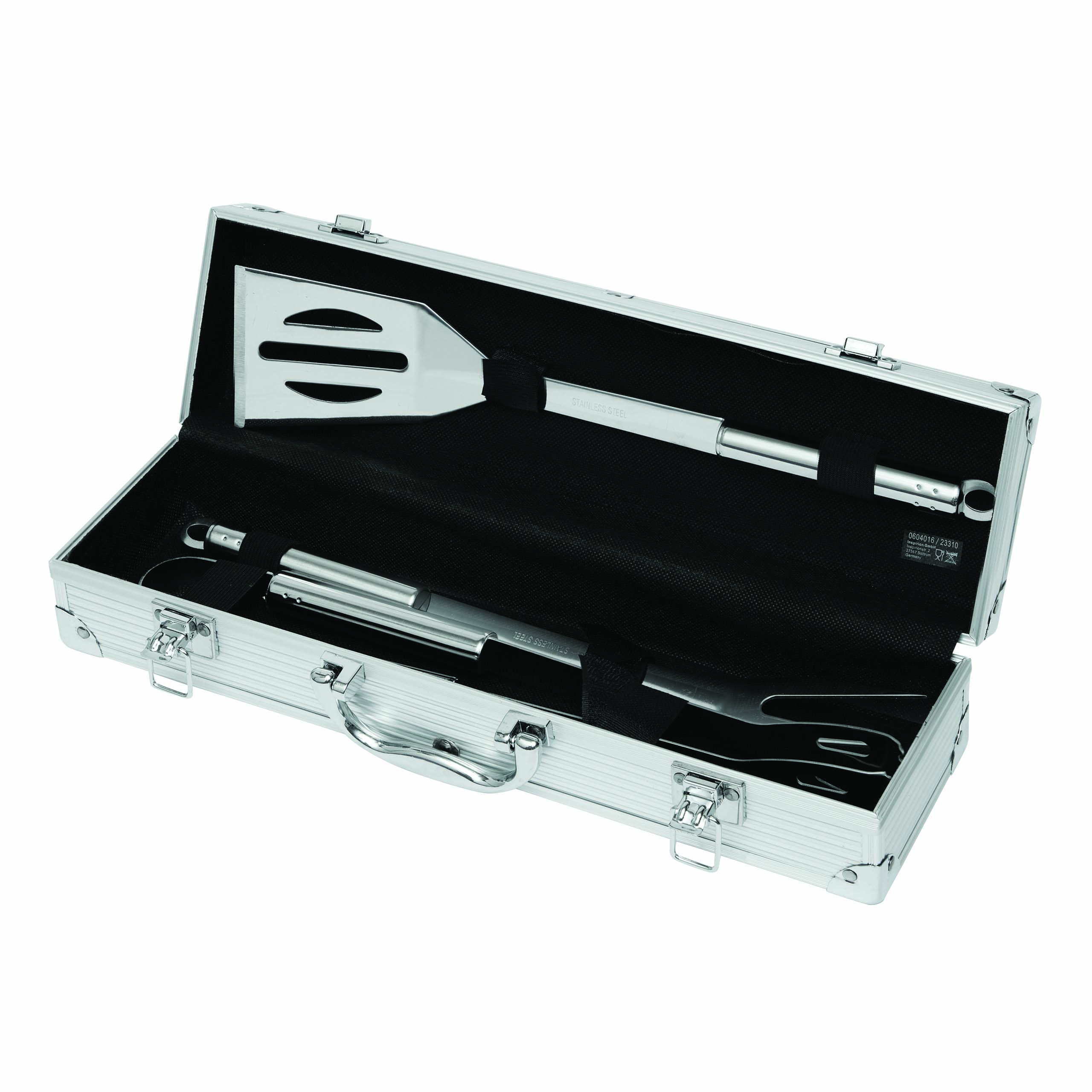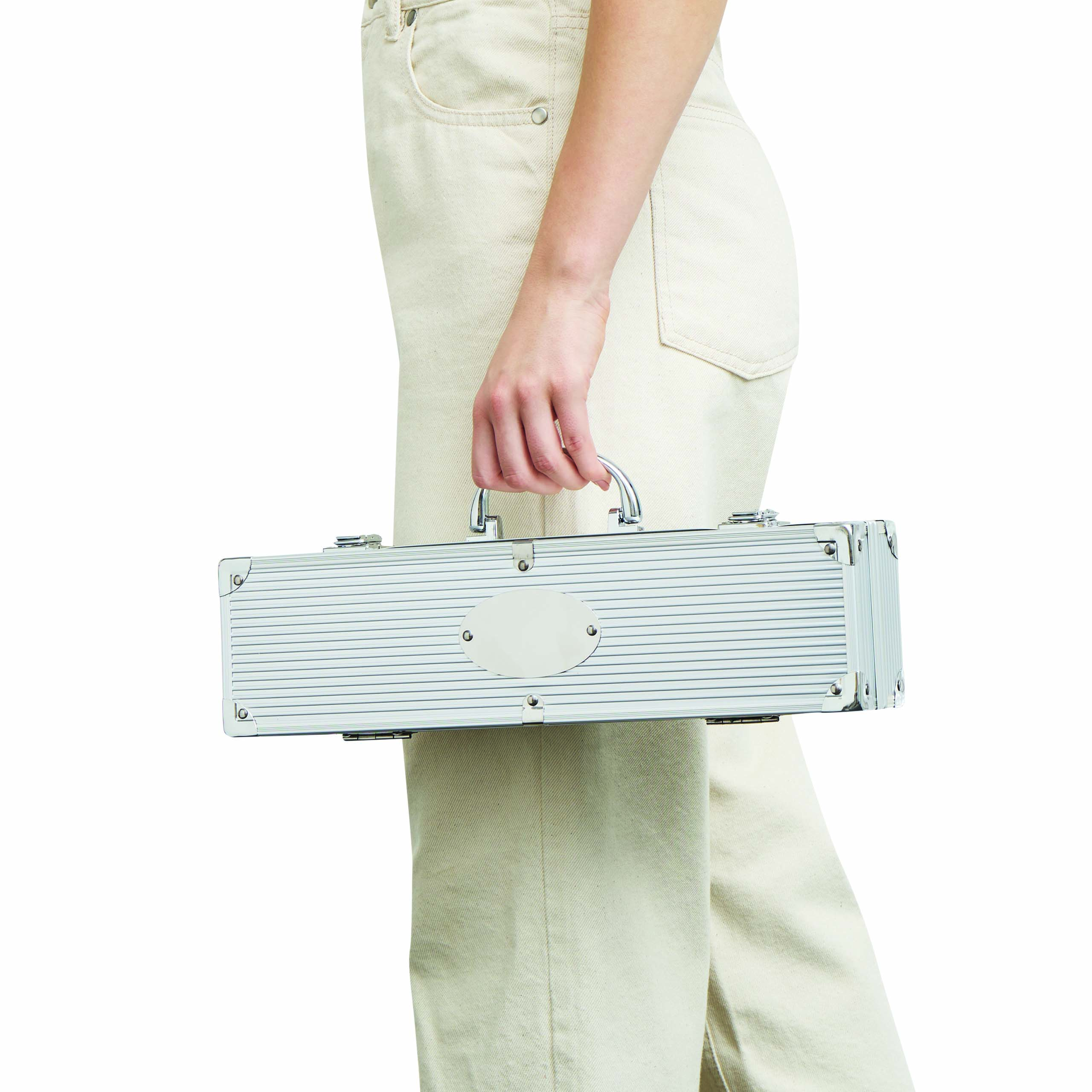 Zestaw nierdzewnych sztućców do grilla ROAST, zapakowany w aluminiową skrzyneczkę z uchwytem i z zamknięciem na zawiasy.