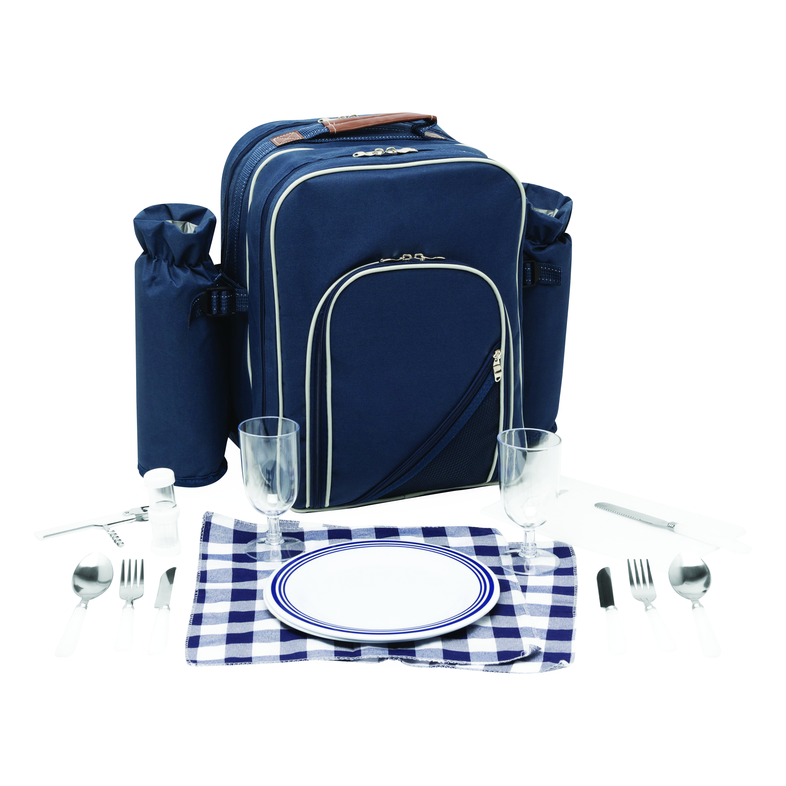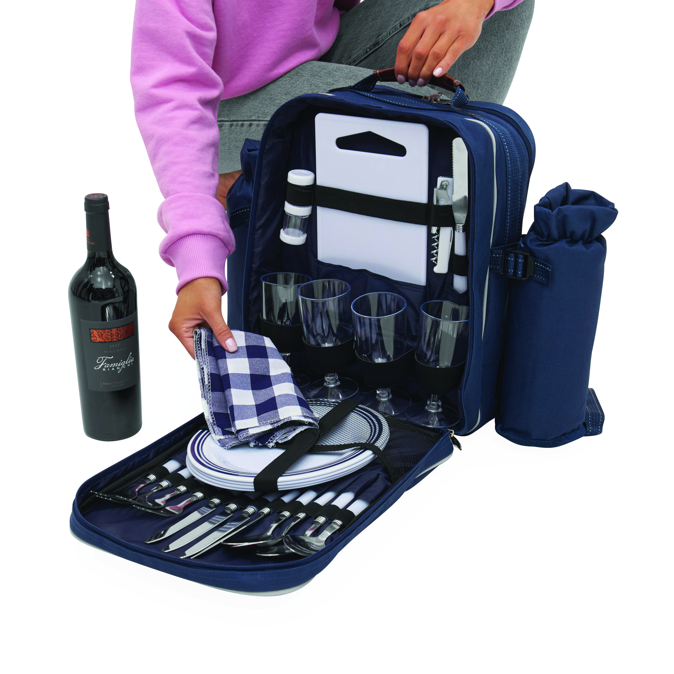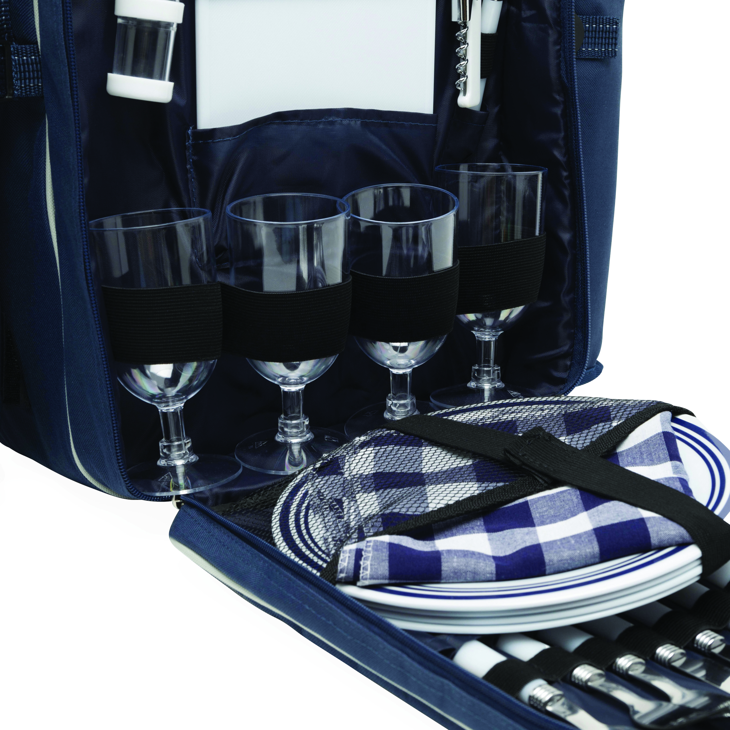 Plecak piknikowy HYDE PARK dla 4 osób z wbudowaną torbą chłodzącą. Zawiera sztućce, plastikowe naczynia i kieliszki do wina, nóż do sera, otwieracz, serwetki z tkaniny, pojemnik na sól i pieprz oraz deskę do krojenia.