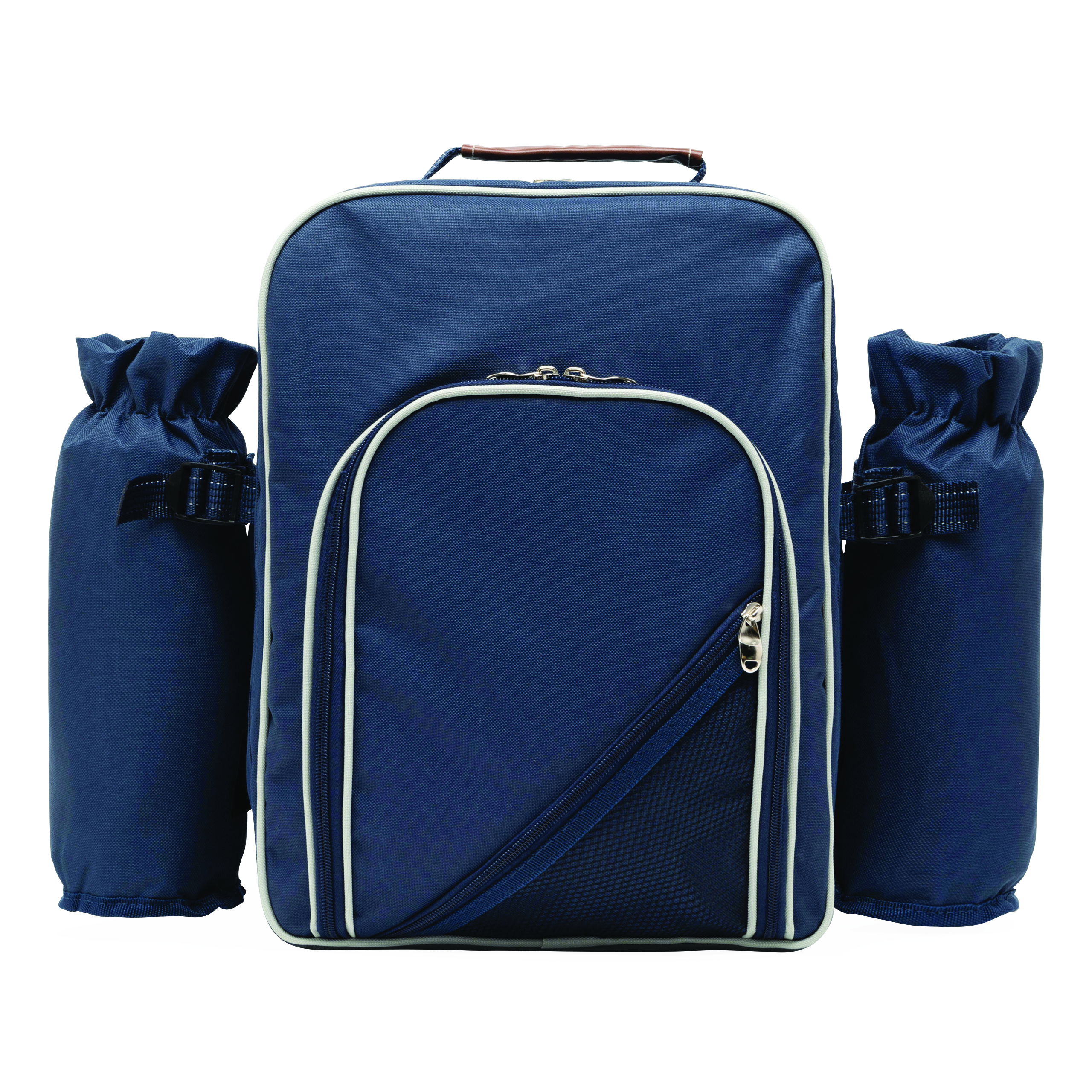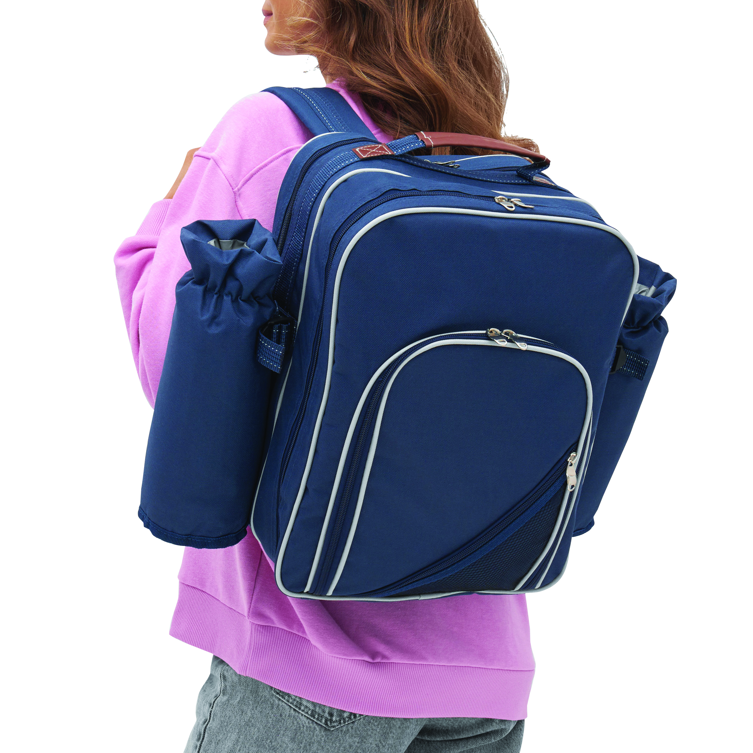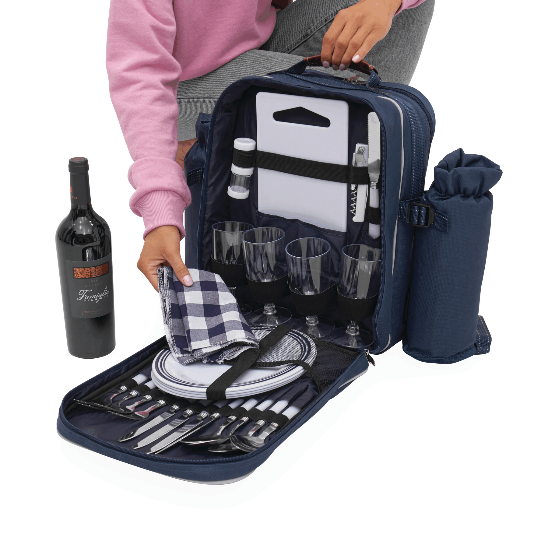 Plecak piknikowy HYDE PARK dla 4 osób z wbudowaną torbą chłodzącą. Zawiera sztućce, plastikowe naczynia i kieliszki do wina, nóż do sera, otwieracz, serwetki z tkaniny, pojemnik na sól i pieprz oraz deskę do krojenia.