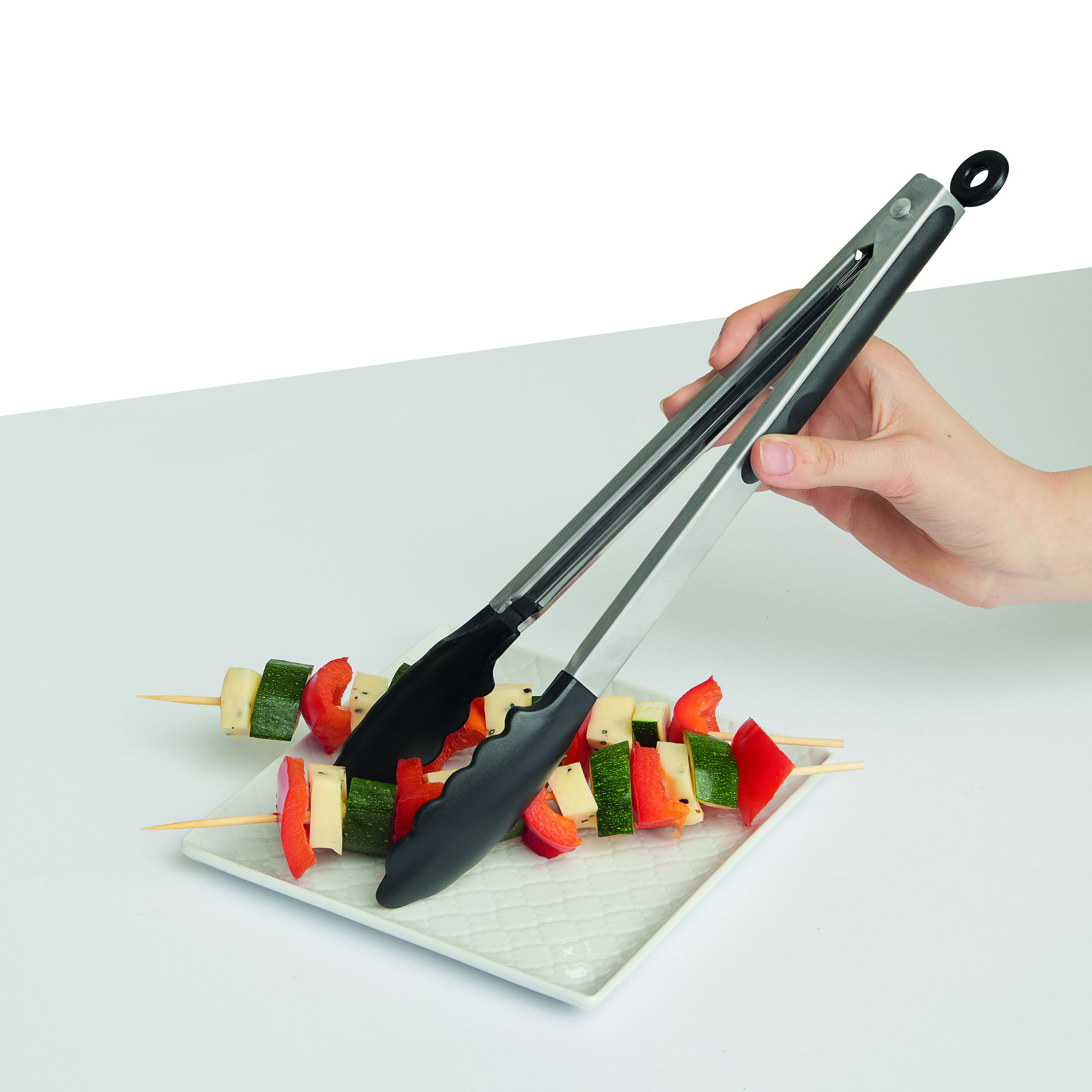 Szczypce ze stali nierdzewnej GRIP z plastikowym uchwytem, gumowym wieszakiem na końcu. Mechanizm blokujący dla oszczędności miejsca podczas przechowywania. Idealne do gotowania, smażenia, grillowania i podawania.