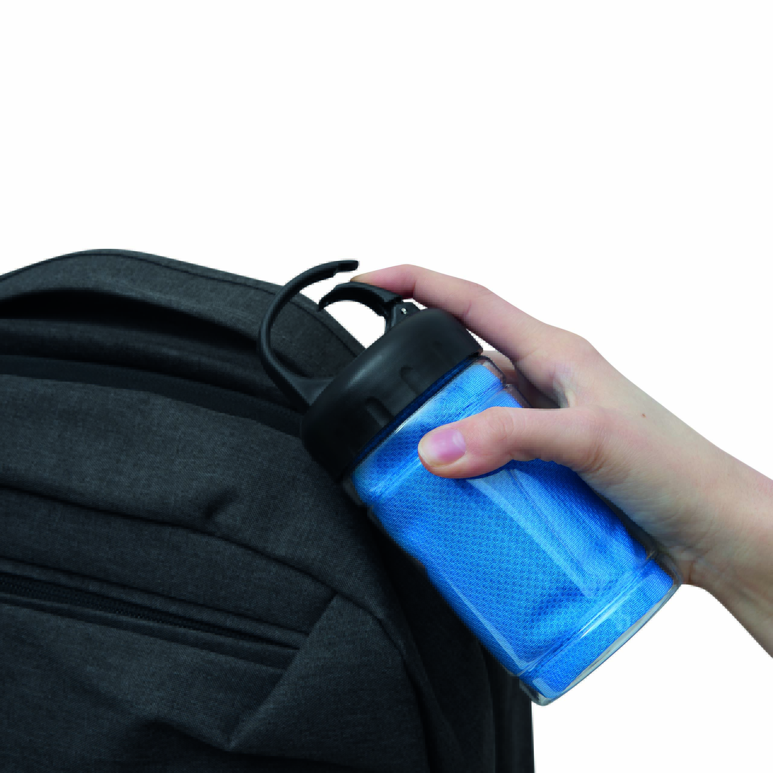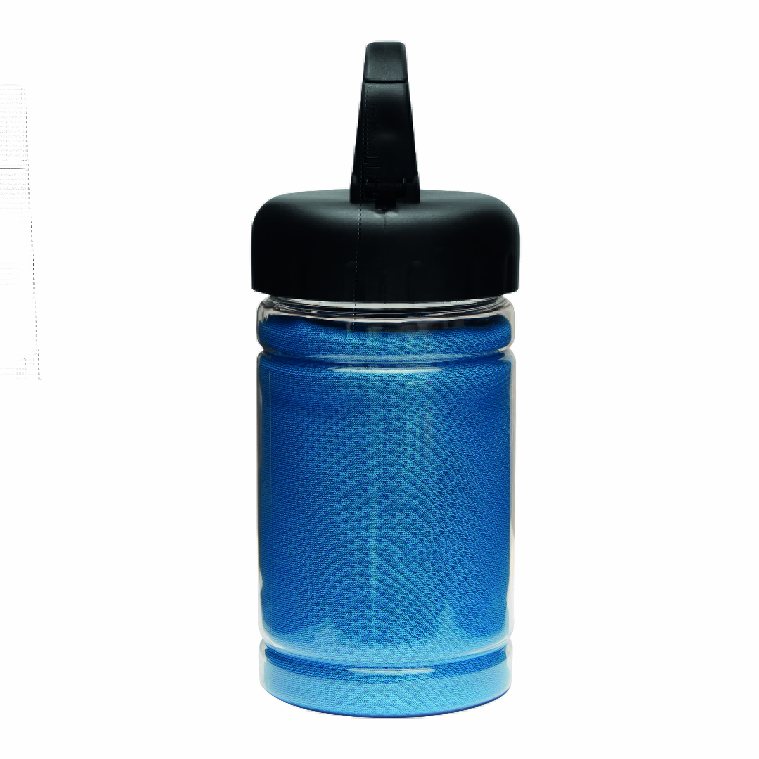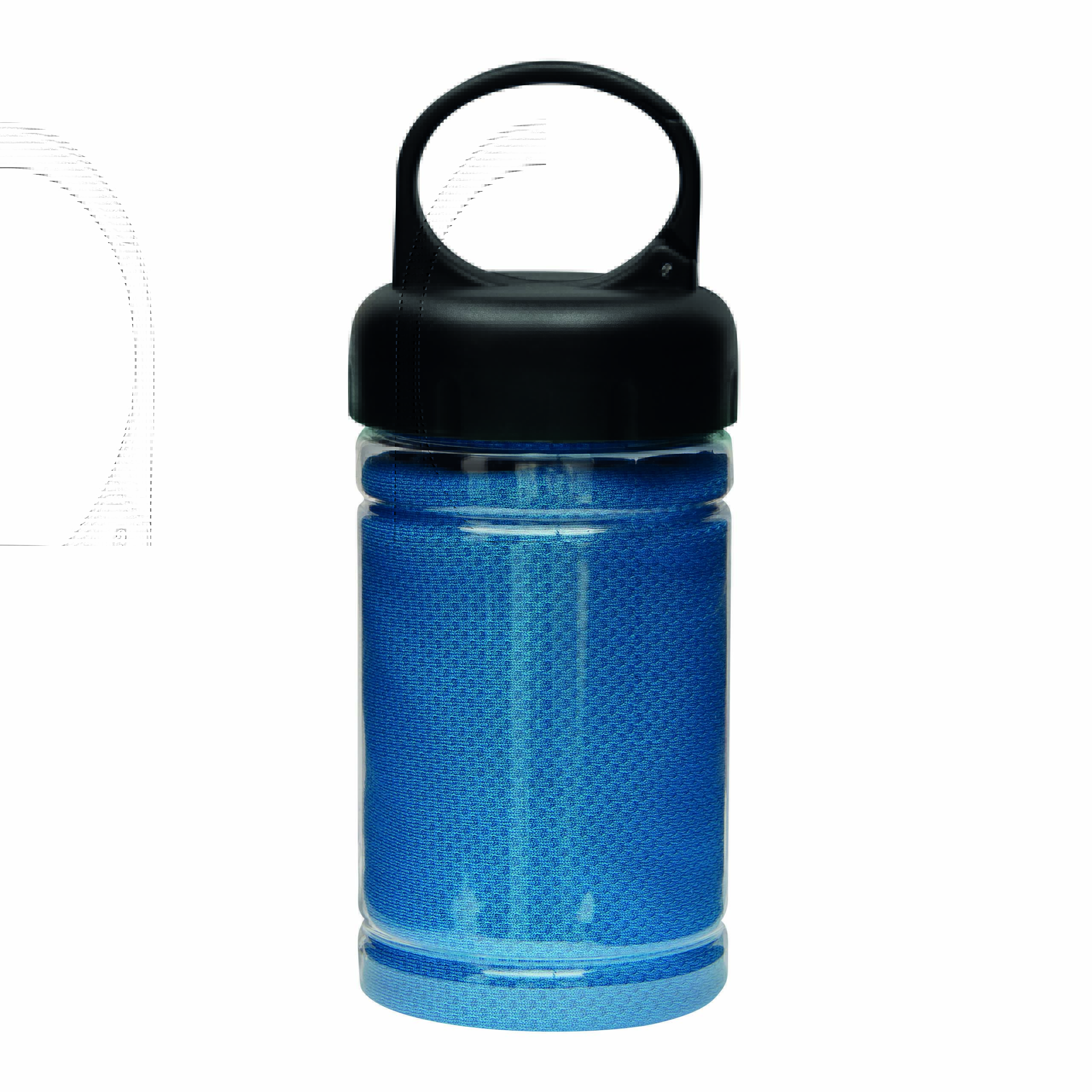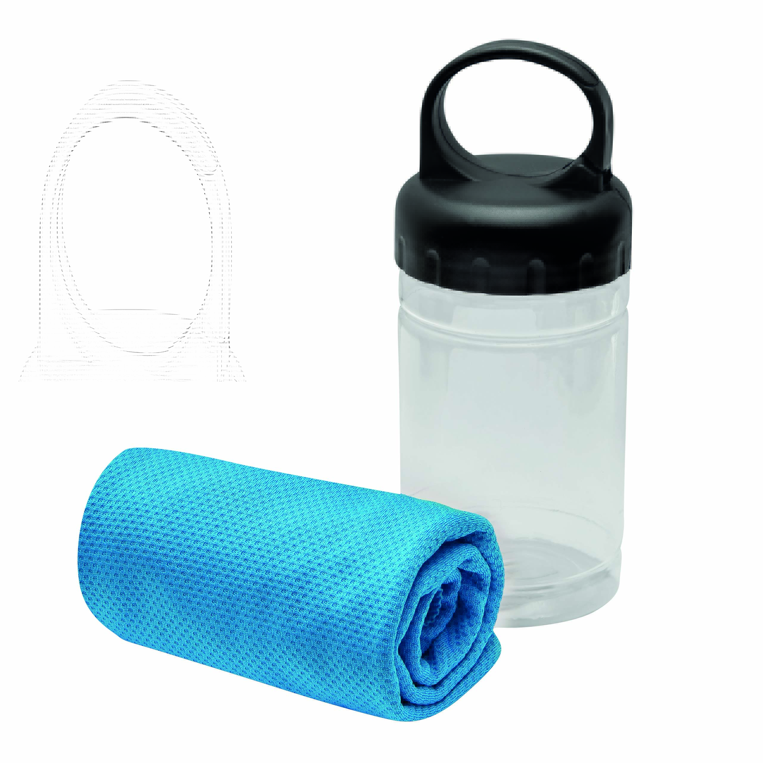 Ręcznik chłodzący CHILLING w przezroczystej puszce. Chroni przed słońcem. Przed użyciem ręcznika należy zmoczyć go wodą. Można napełnić wodą puszkę z ręcznikiem i wstrząsnąć nią. Pokrywka z czarnym karabińczykiem. Idealne rozwiązanie dla osób aktywnych.