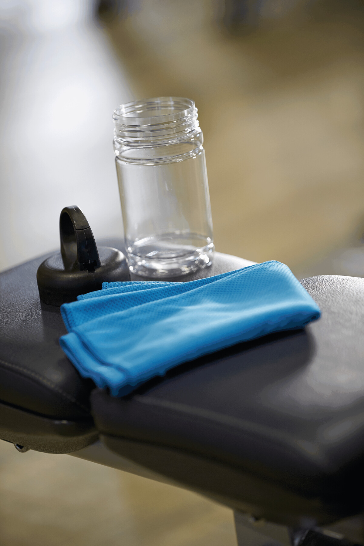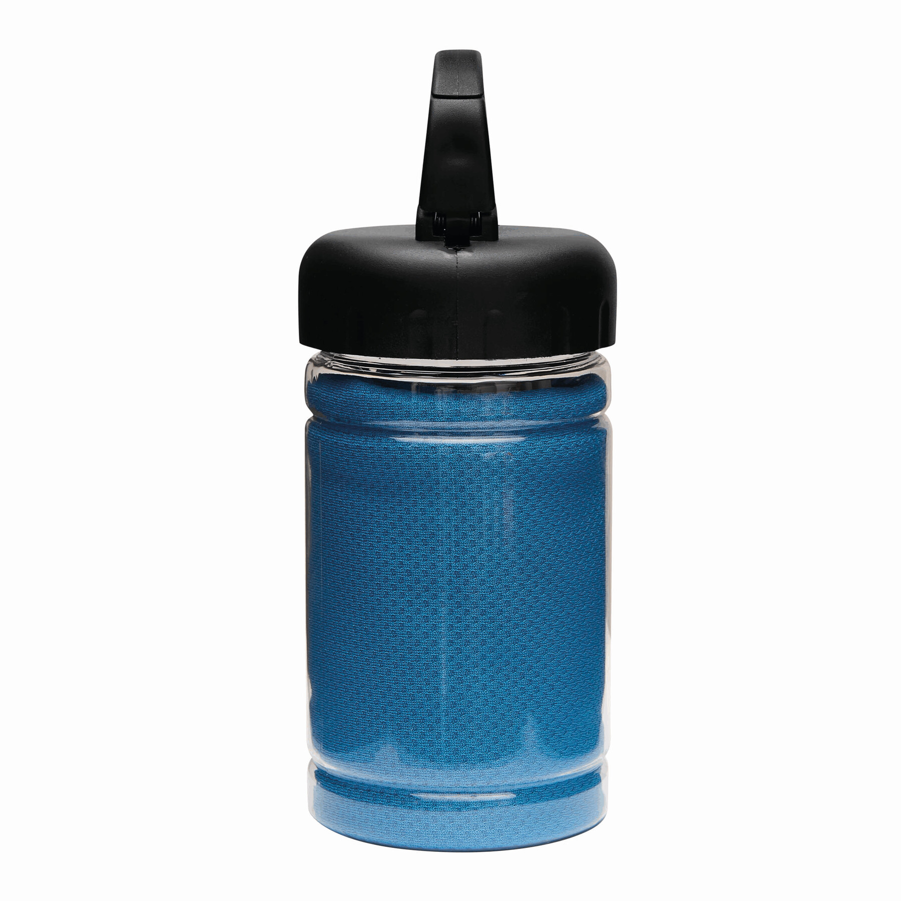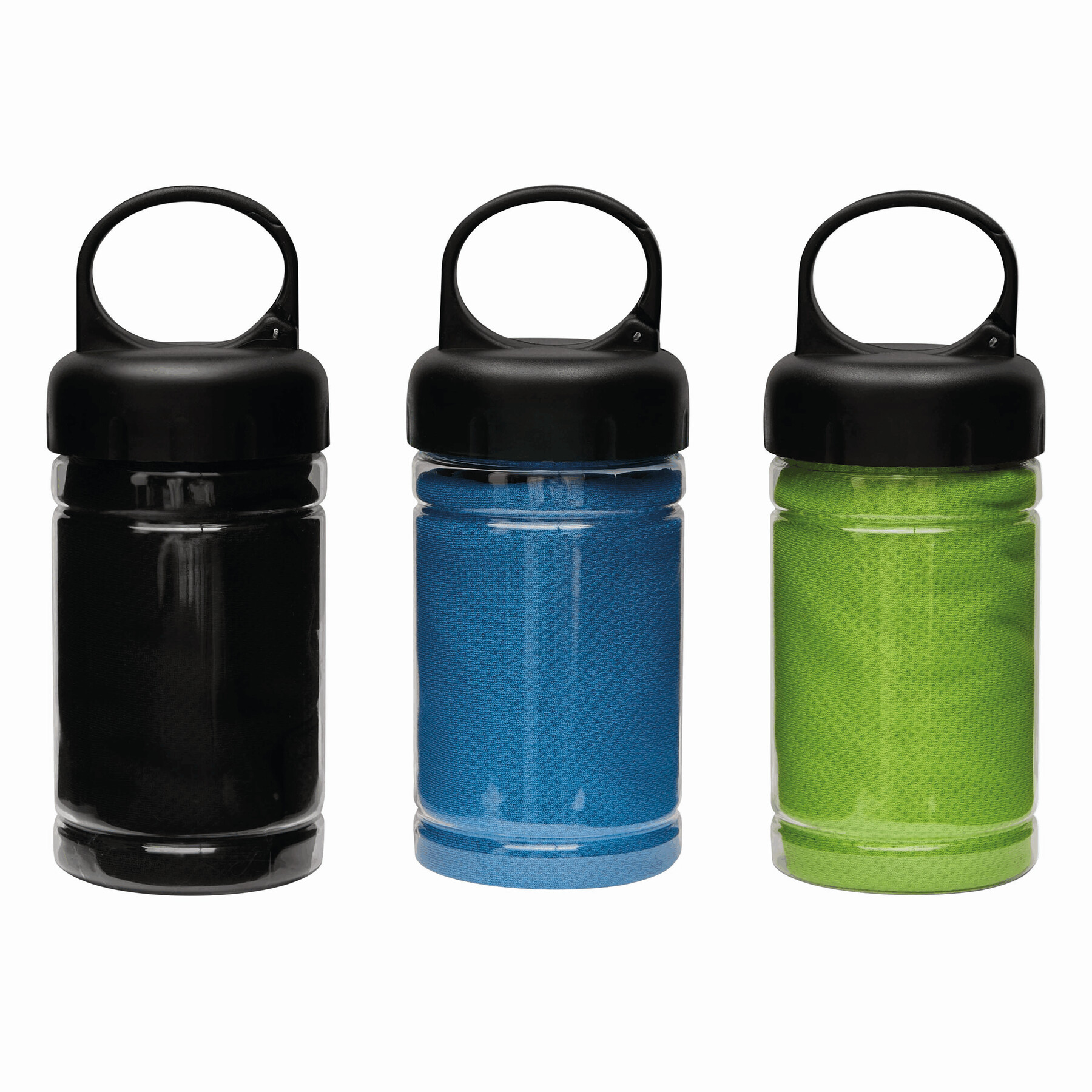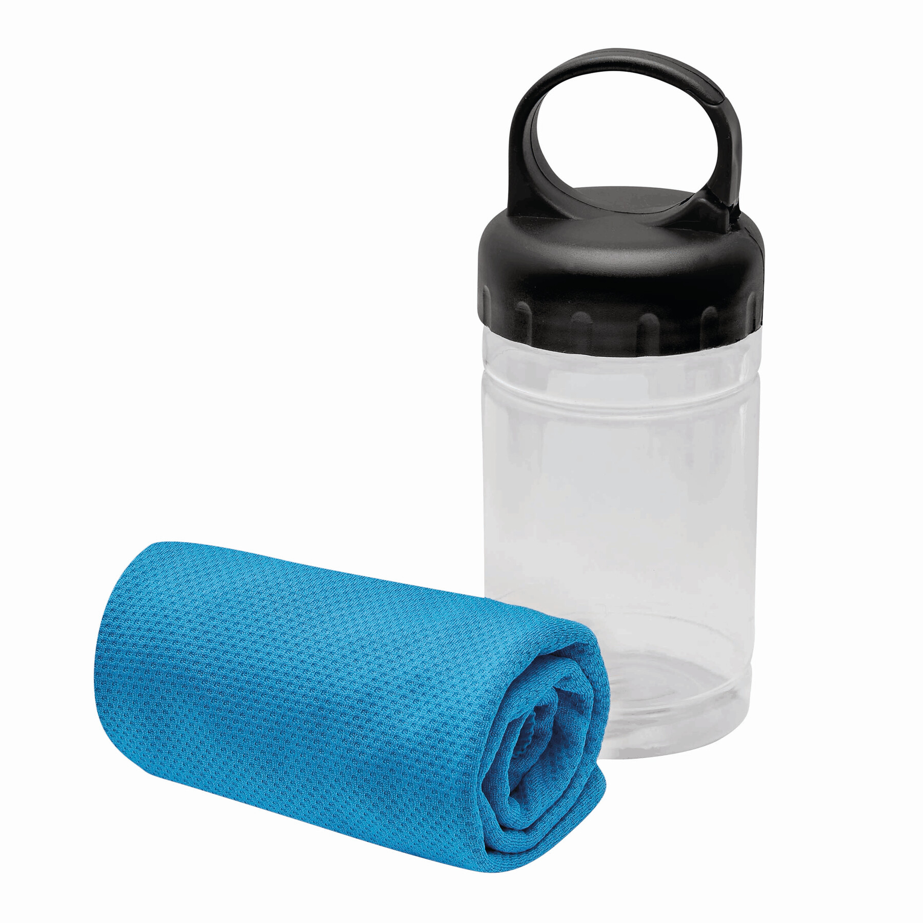 Ręcznik chłodzący CHILLING w przezroczystej puszce. Chroni przed słońcem. Przed użyciem ręcznika należy zmoczyć go wodą. Można napełnić wodą puszkę z ręcznikiem i wstrząsnąć nią. Pokrywka z czarnym karabińczykiem. Idealne rozwiązanie dla osób aktywnych.