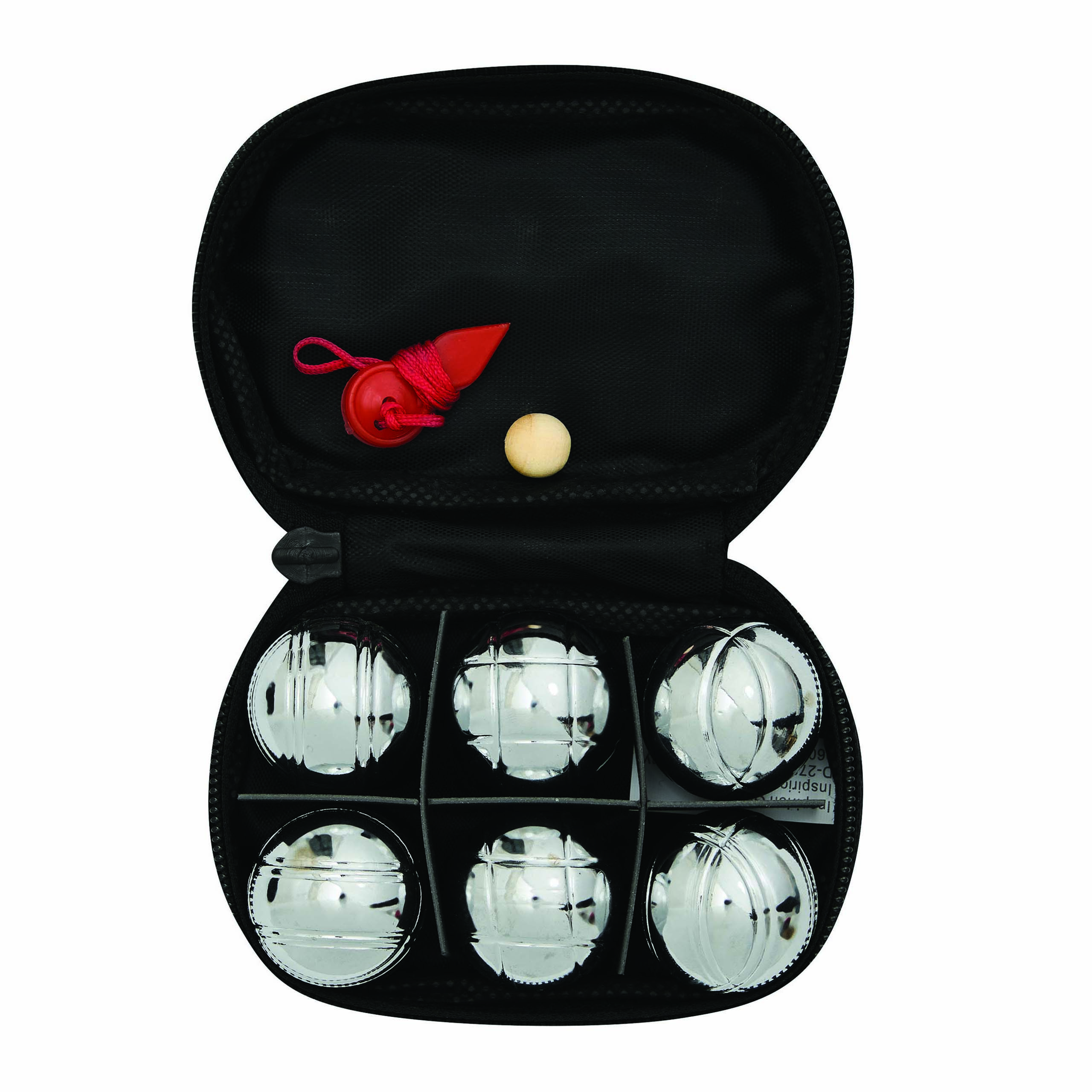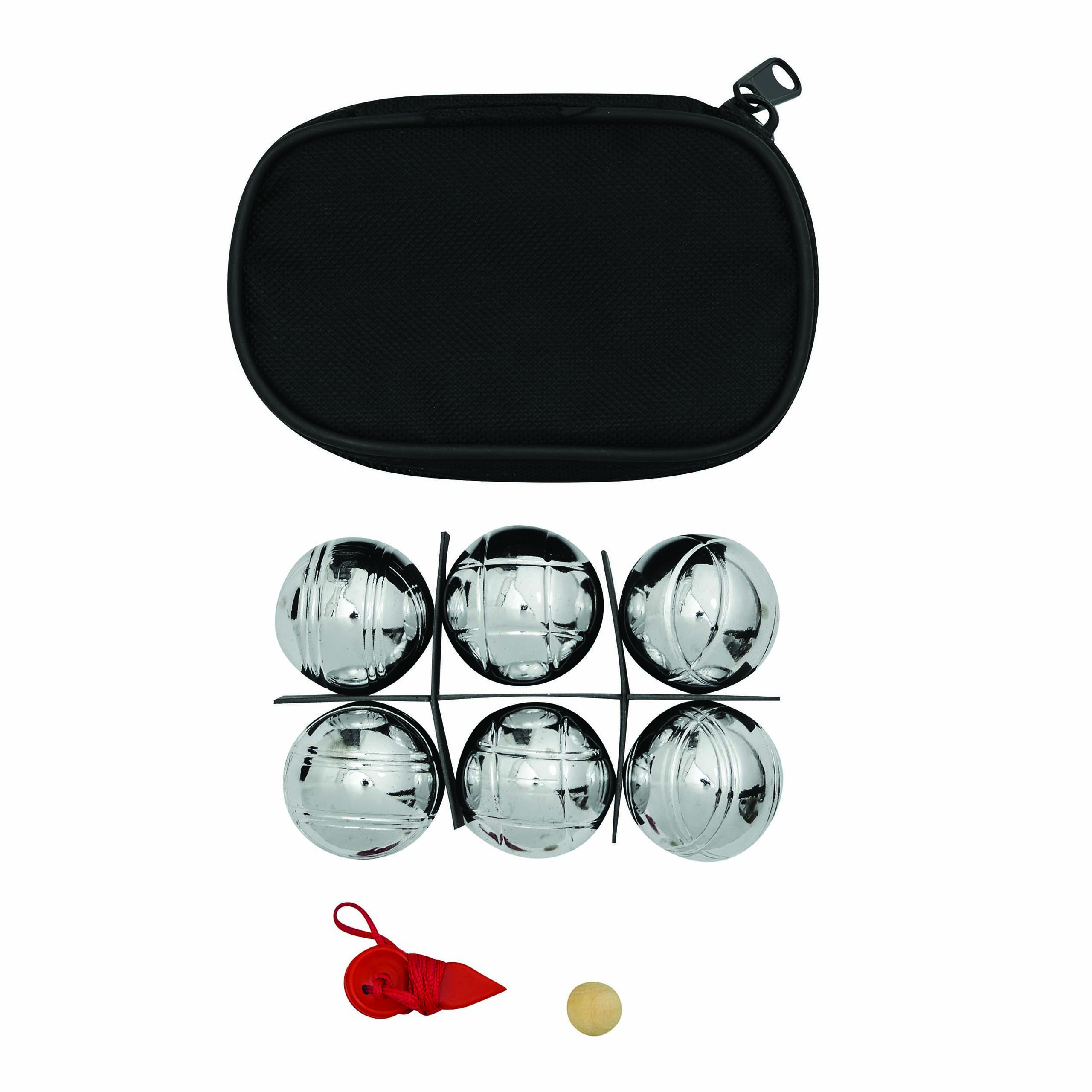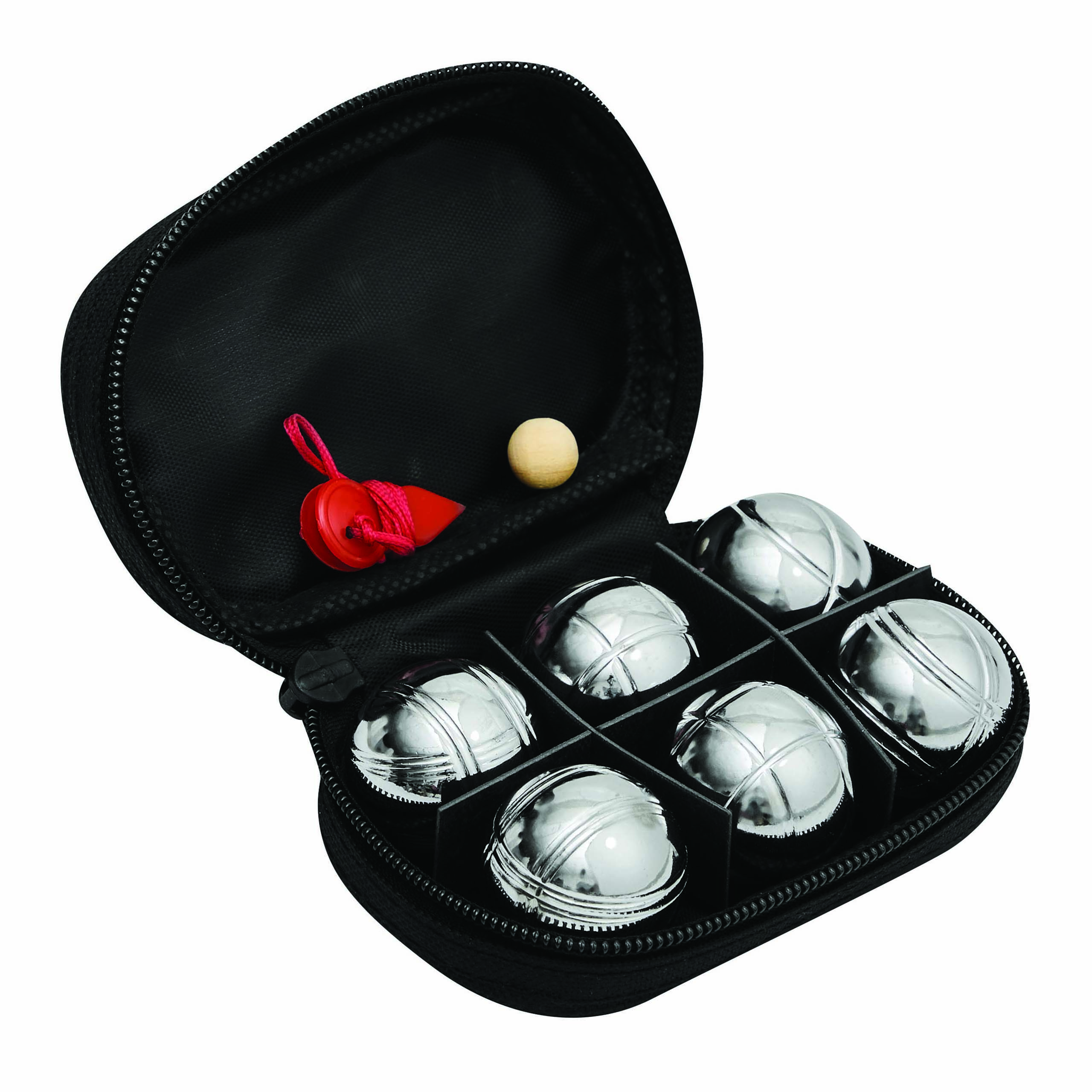 Mini zestaw do gry w Boule DAVID zawiera 6 metalowych kul, drewnianą kulę i czerwony sznurek do mierzenia. Pakowany w czarne nylonowe etui z zamkiem.