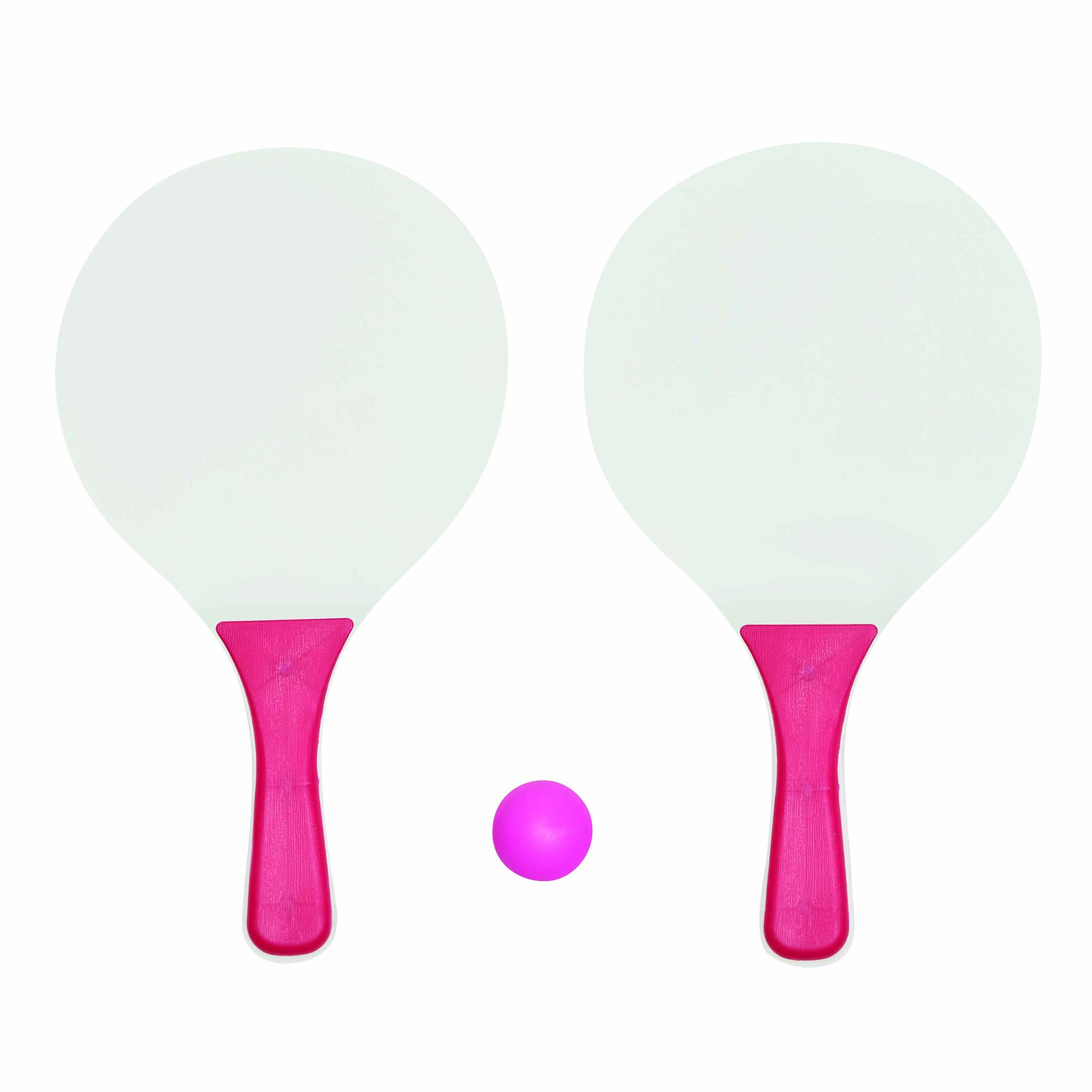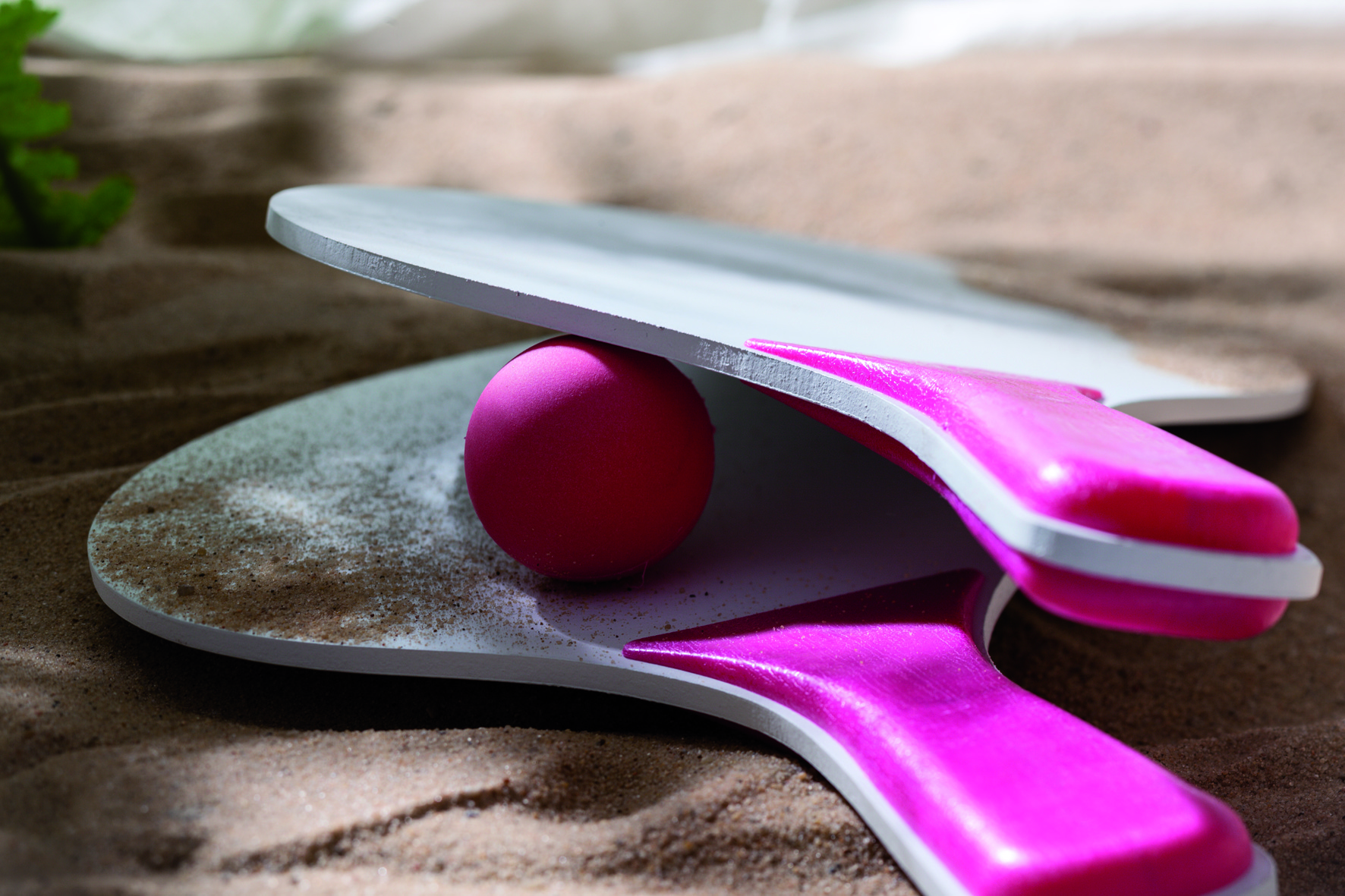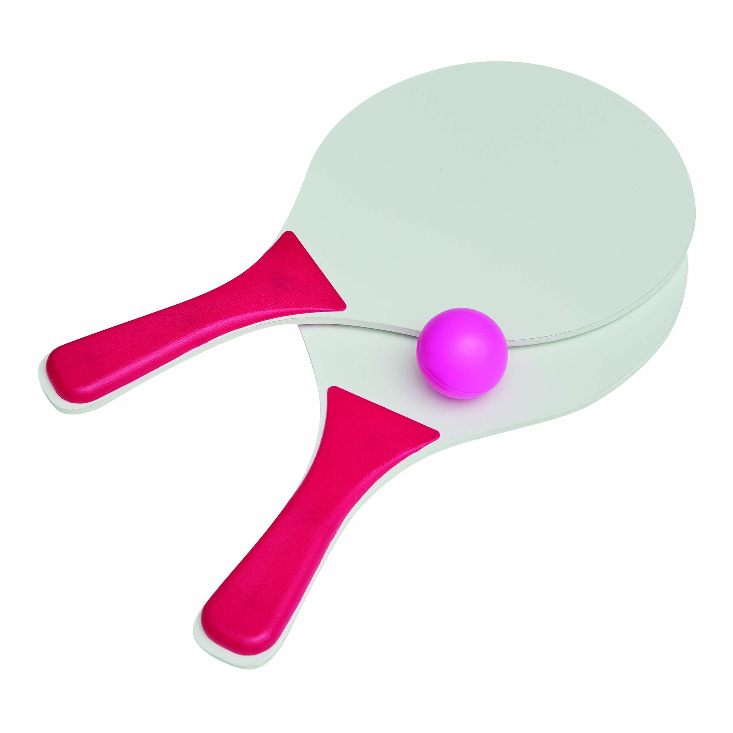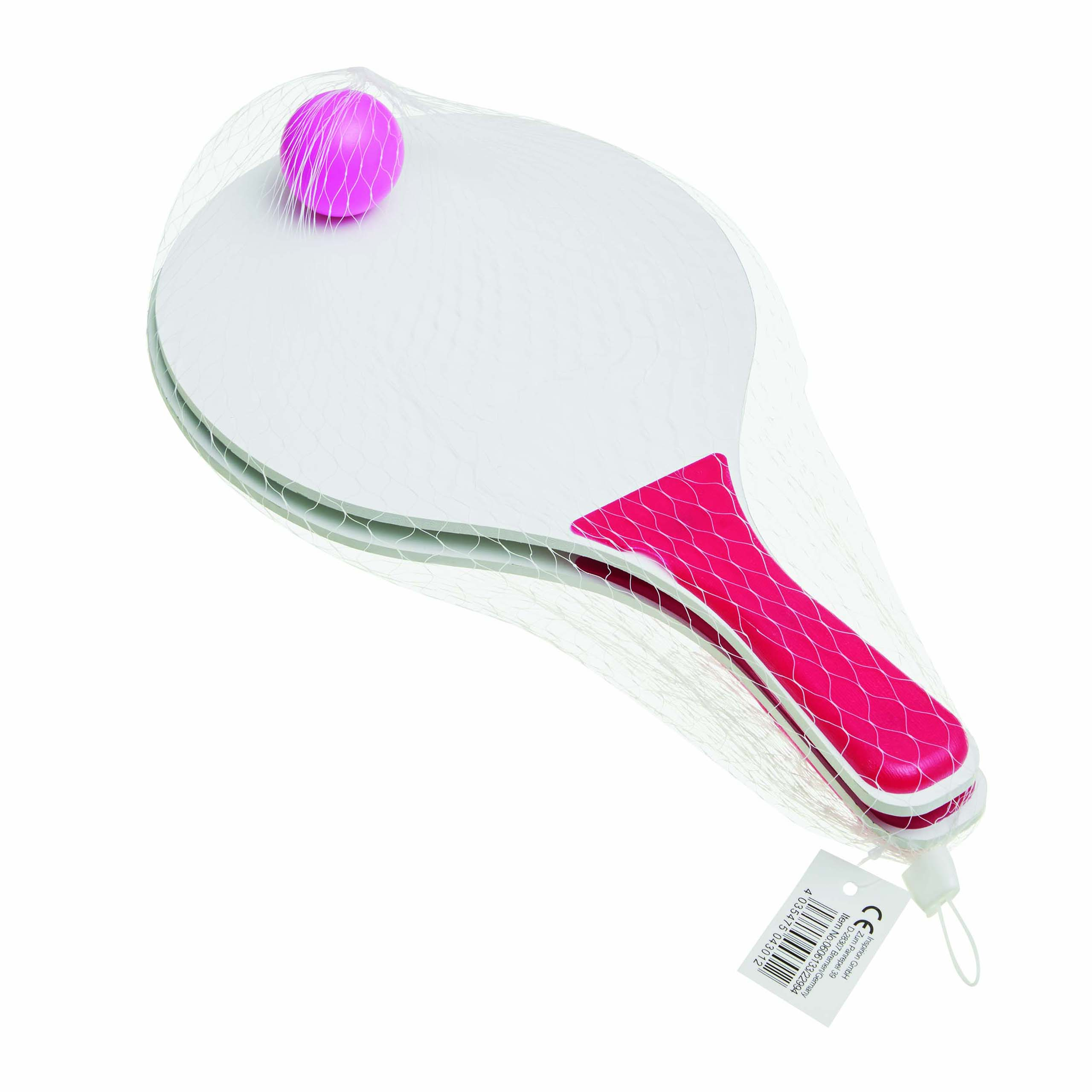 Zestaw plażowy SUMMER FEELING zawiera dwie drewniane paletki z kolorowymi uchwytami, jedną miękką piłkę. Zapakowany w siatkową torbę.