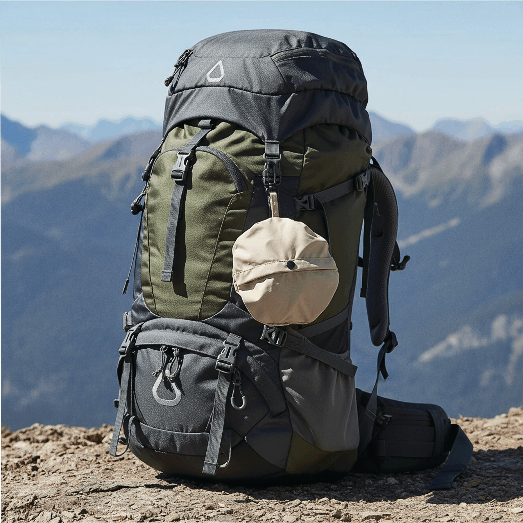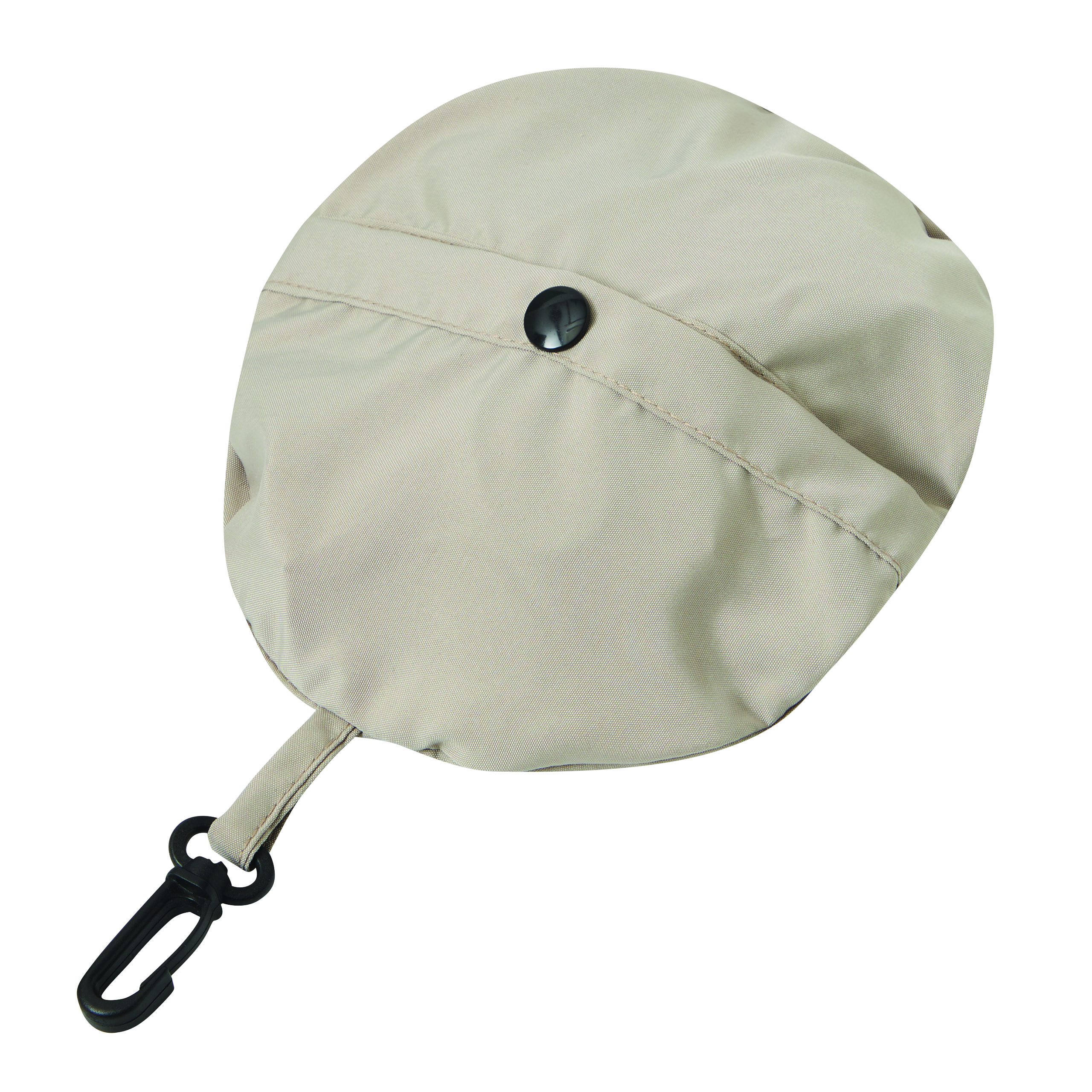 Składana czapka z daszkiem SHADEGO. Jest wodoodporna i posiada sznurek z plastikowym stoperem do regulacji obwodu głowy oraz karabińczyk (karabińczyk NIE nadaje się do wspinaczki). Można ją przekształcić w etui za pomocą zatrzasku.