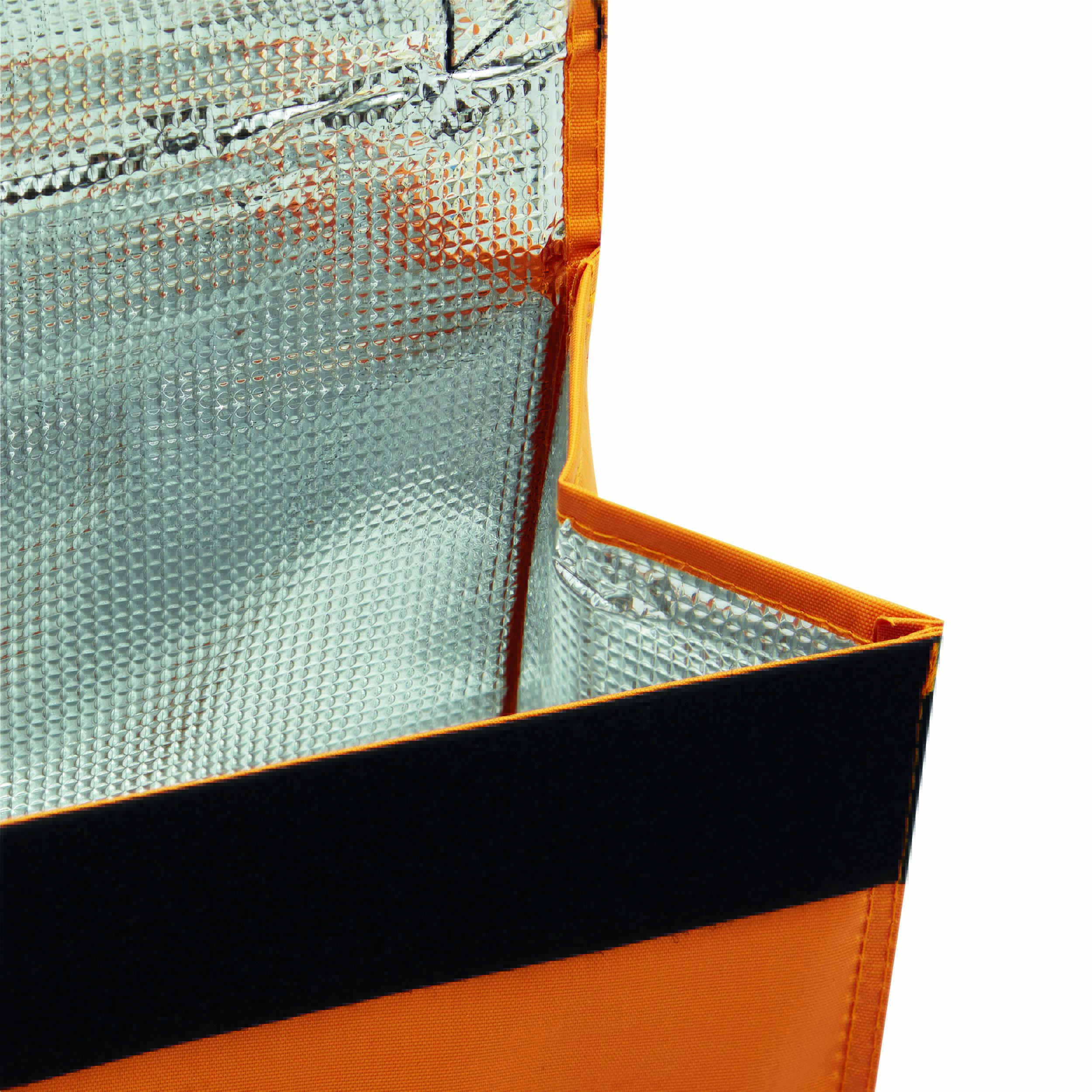 Torba termoizolacyjna KODIAK: z izolowaną kieszenią zapinaną na rzep i wzmocnioną rączką do przenoszenia.