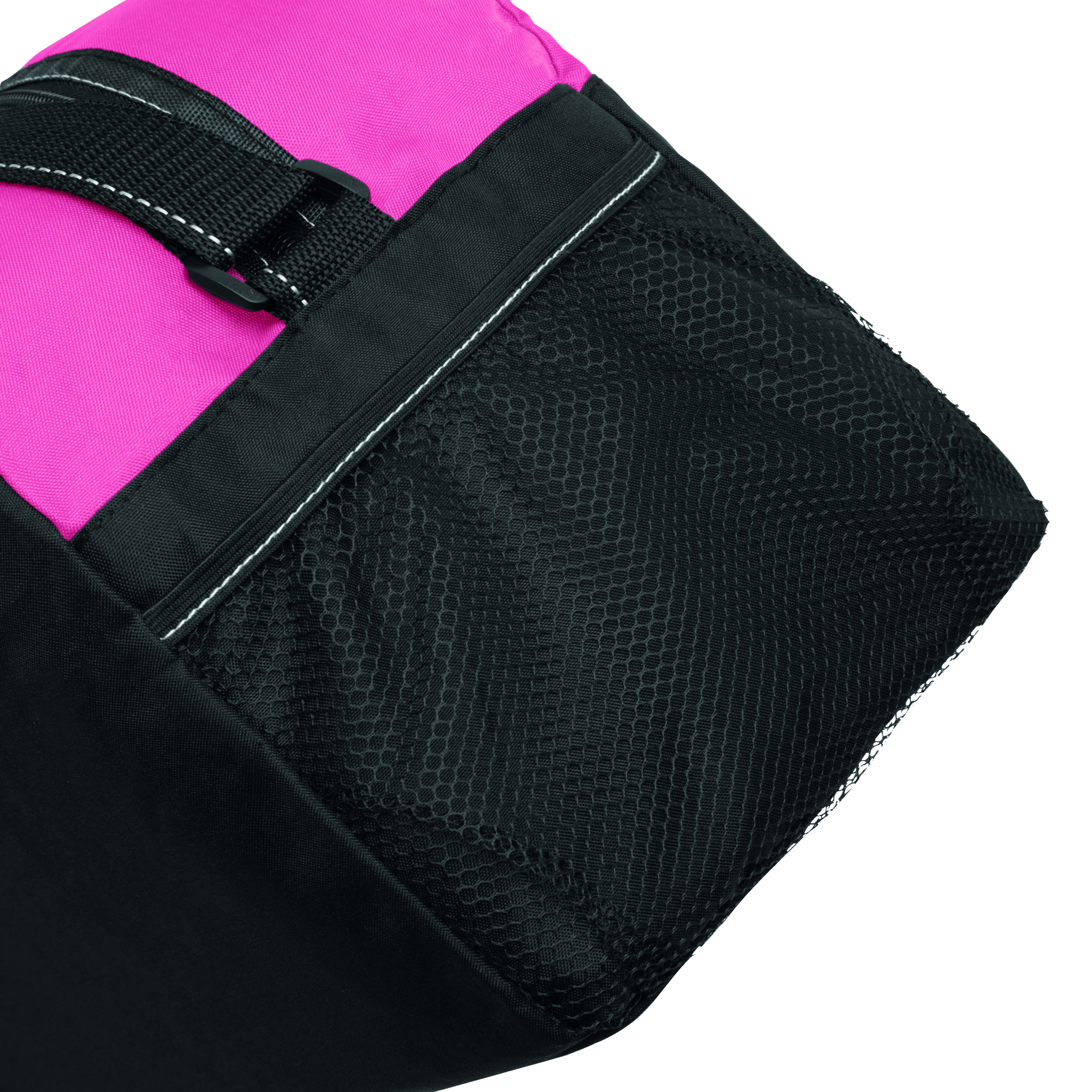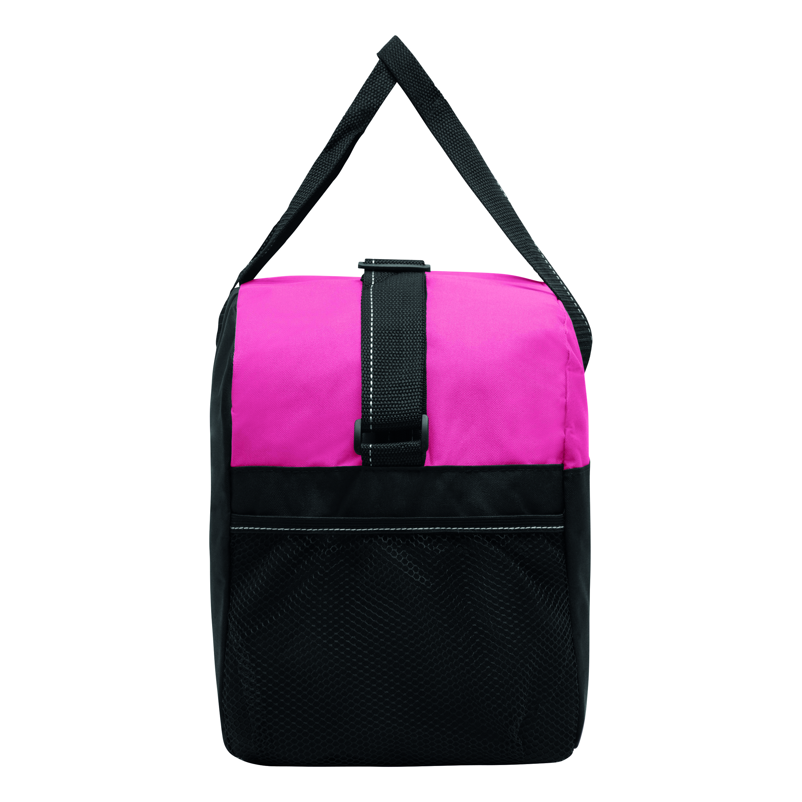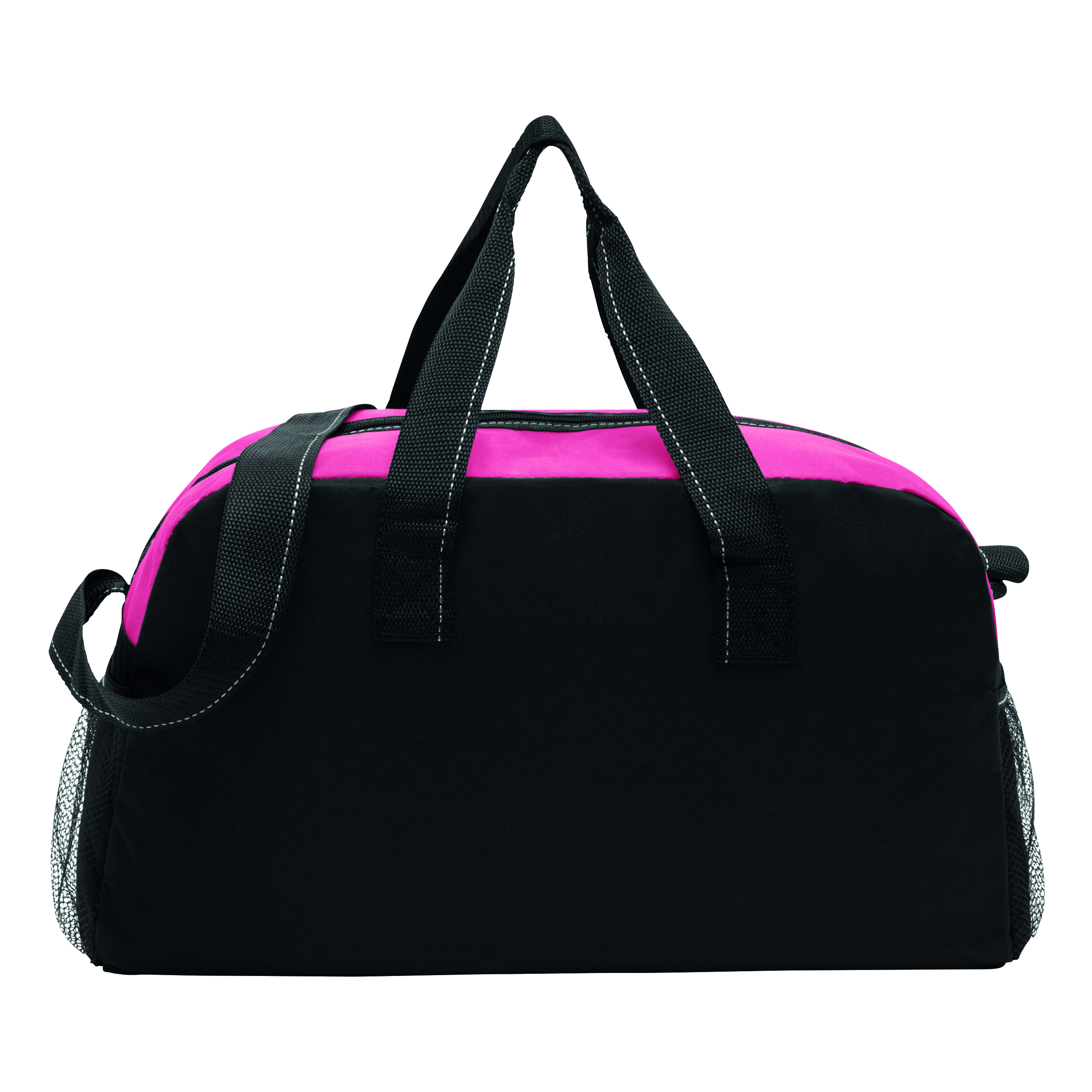 Sportowa torba FITNESS z przestronną komorą główną na zamek błyskawiczny, po bokach 2 siatkowe kieszenie, 2 uchwyty do przenoszenia, regulowany pasek na ramię.