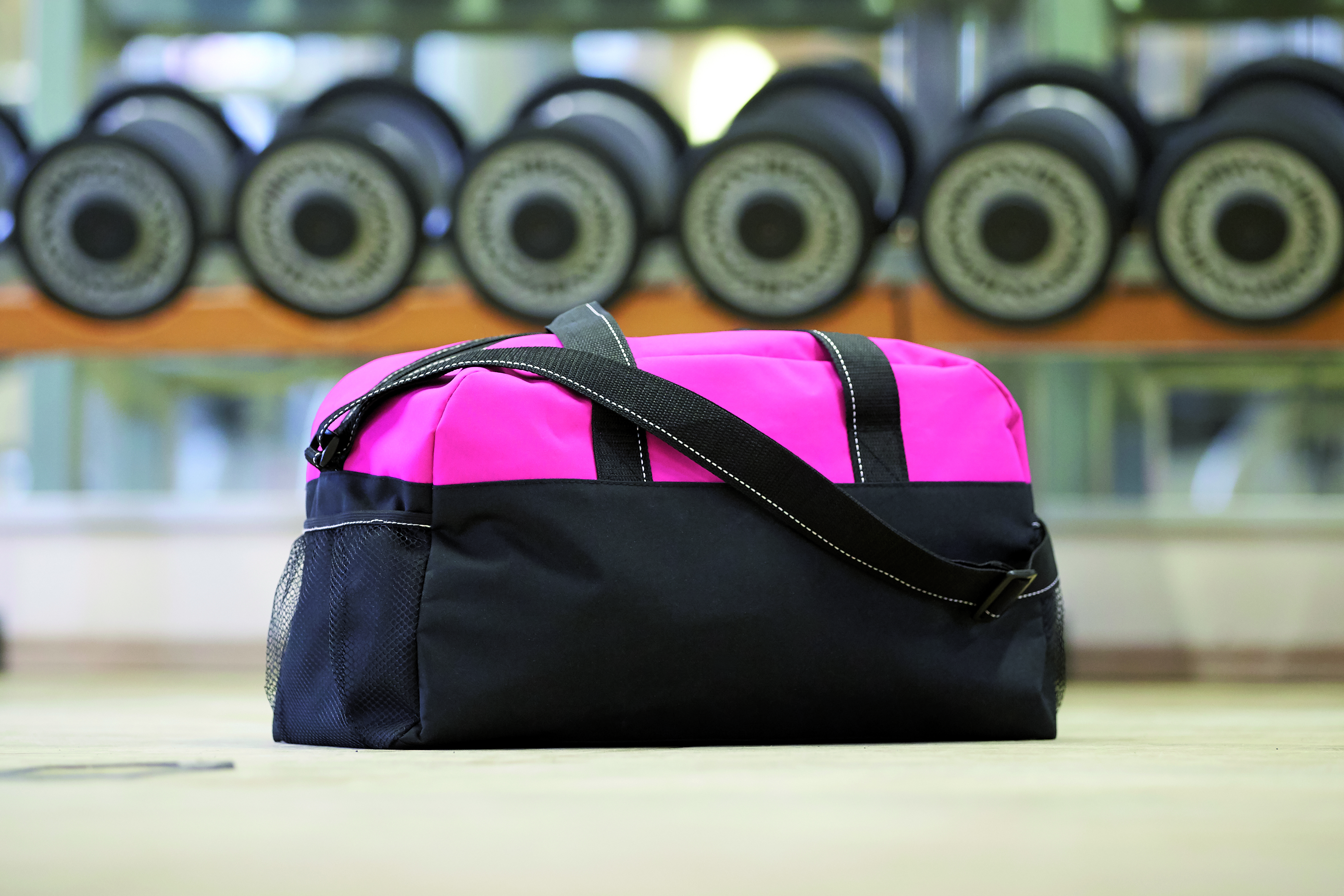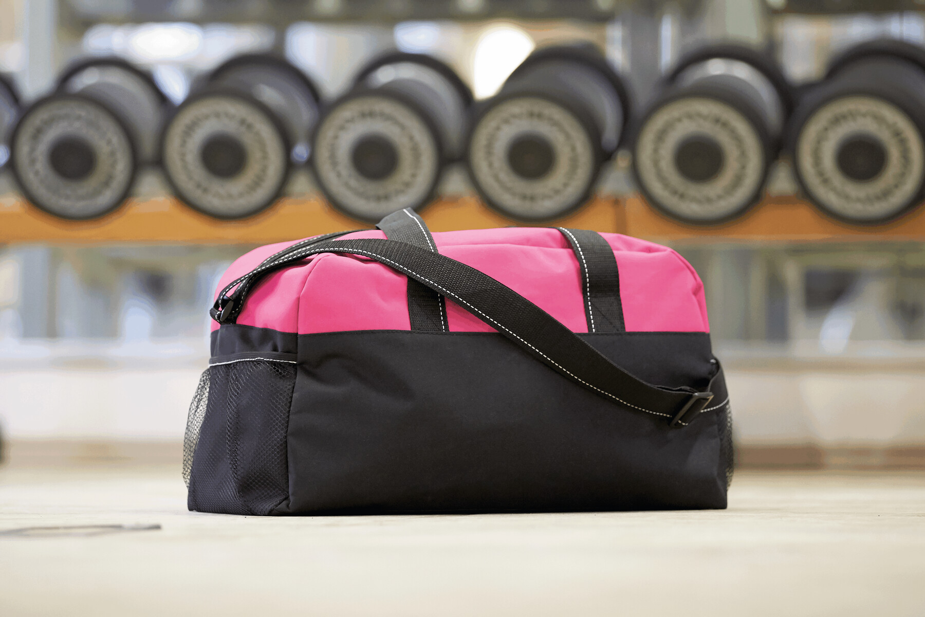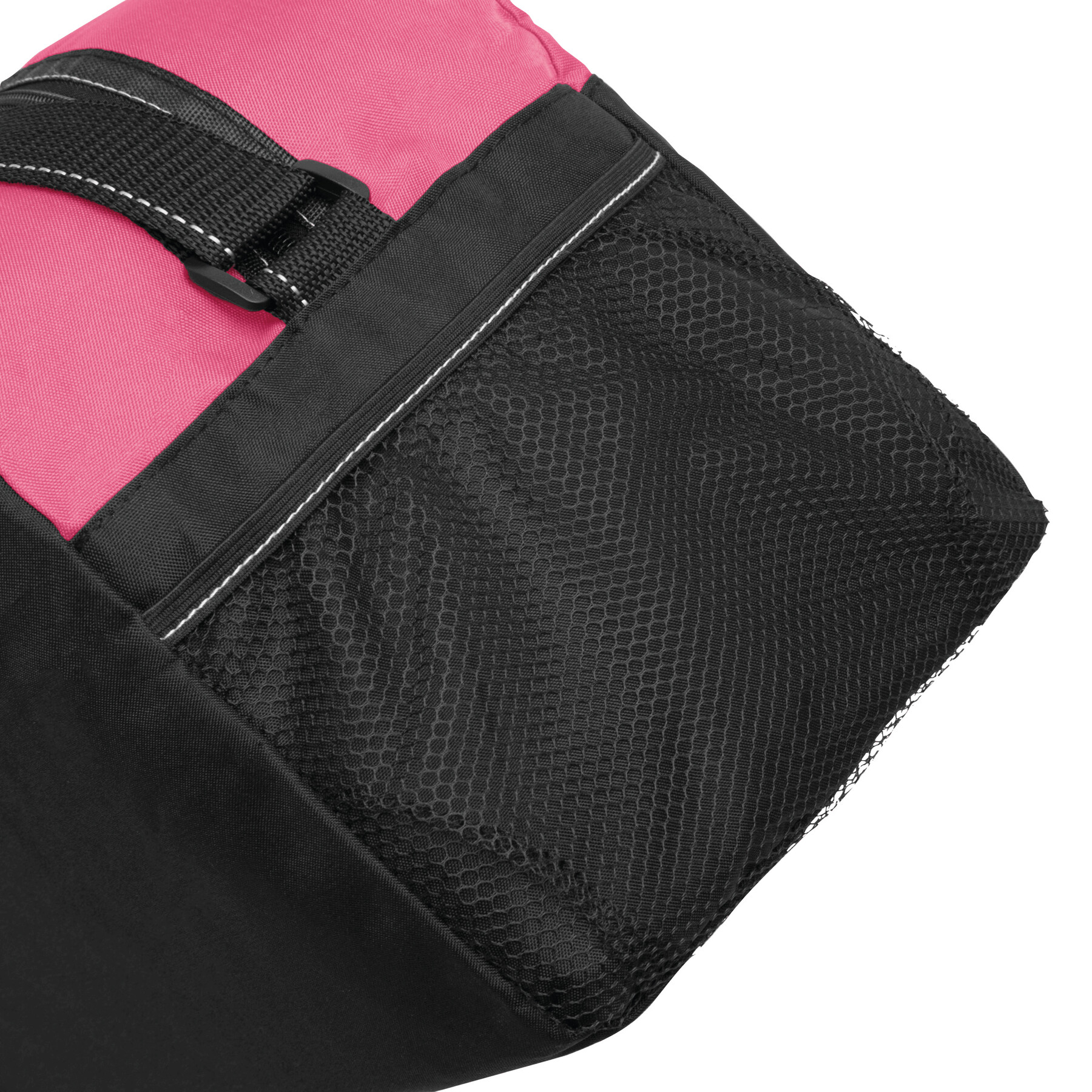 Sportowa torba FITNESS z przestronną komorą główną na zamek błyskawiczny, po bokach 2 siatkowe kieszenie, 2 uchwyty do przenoszenia, regulowany pasek na ramię.