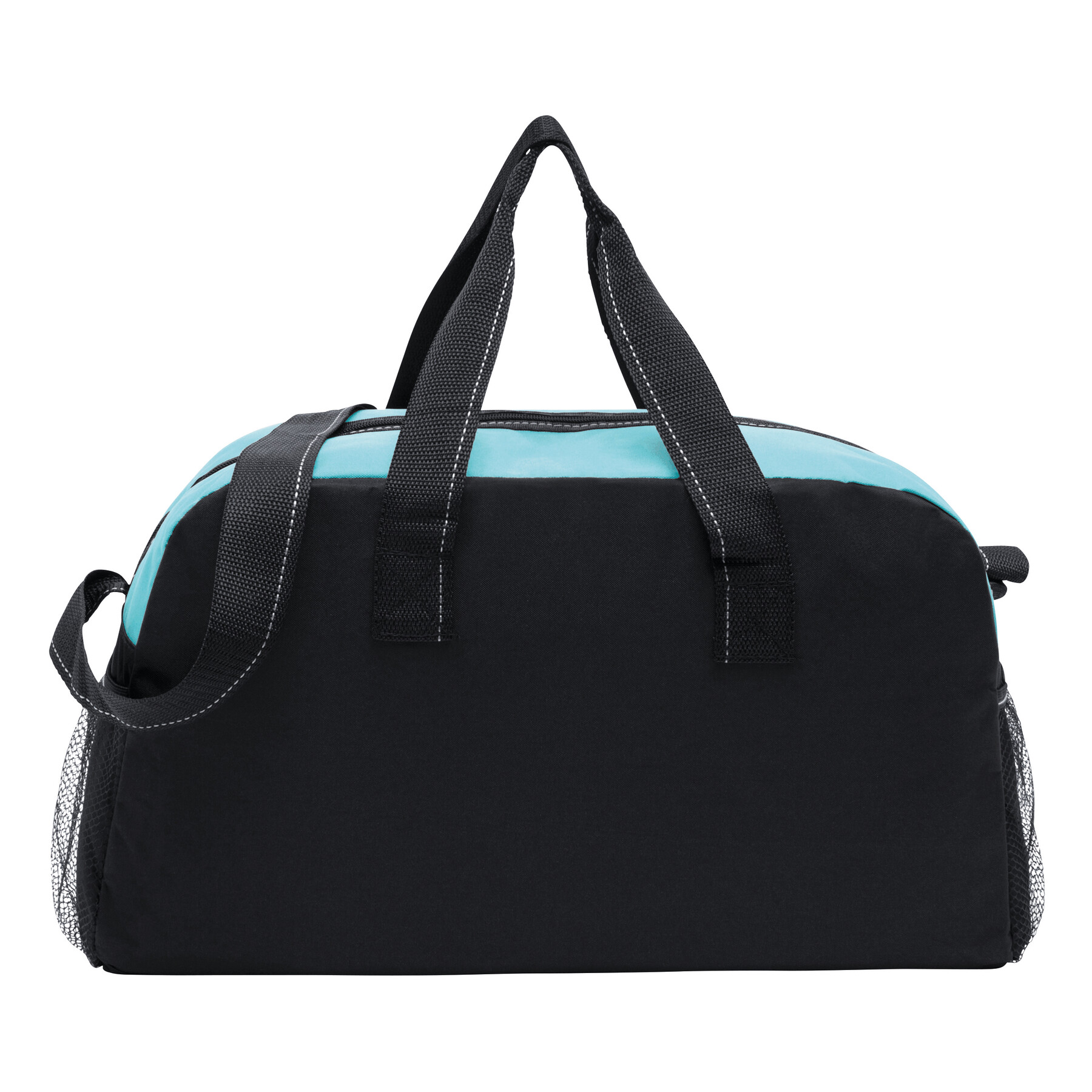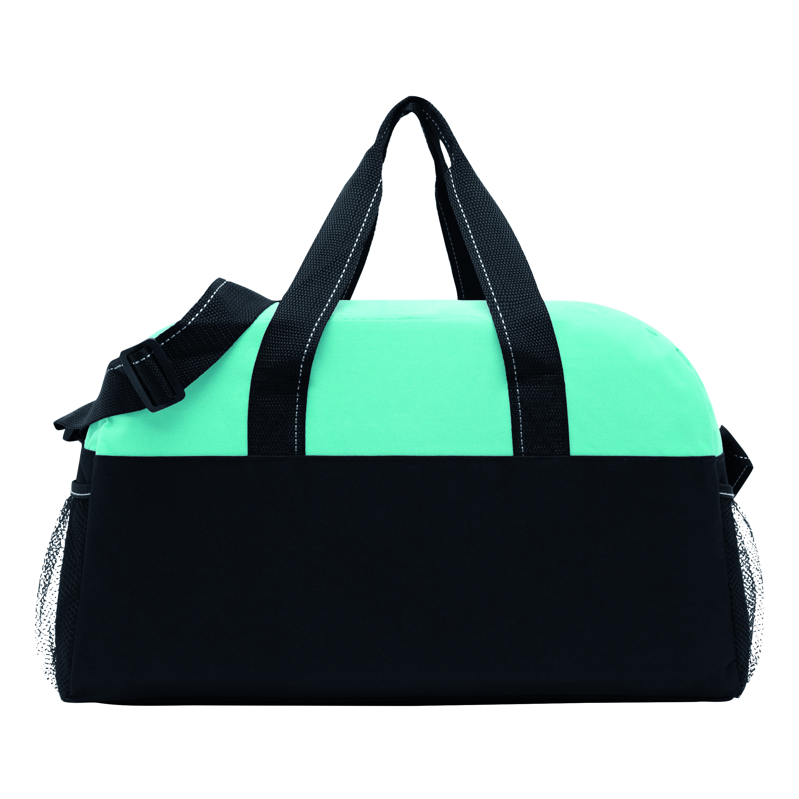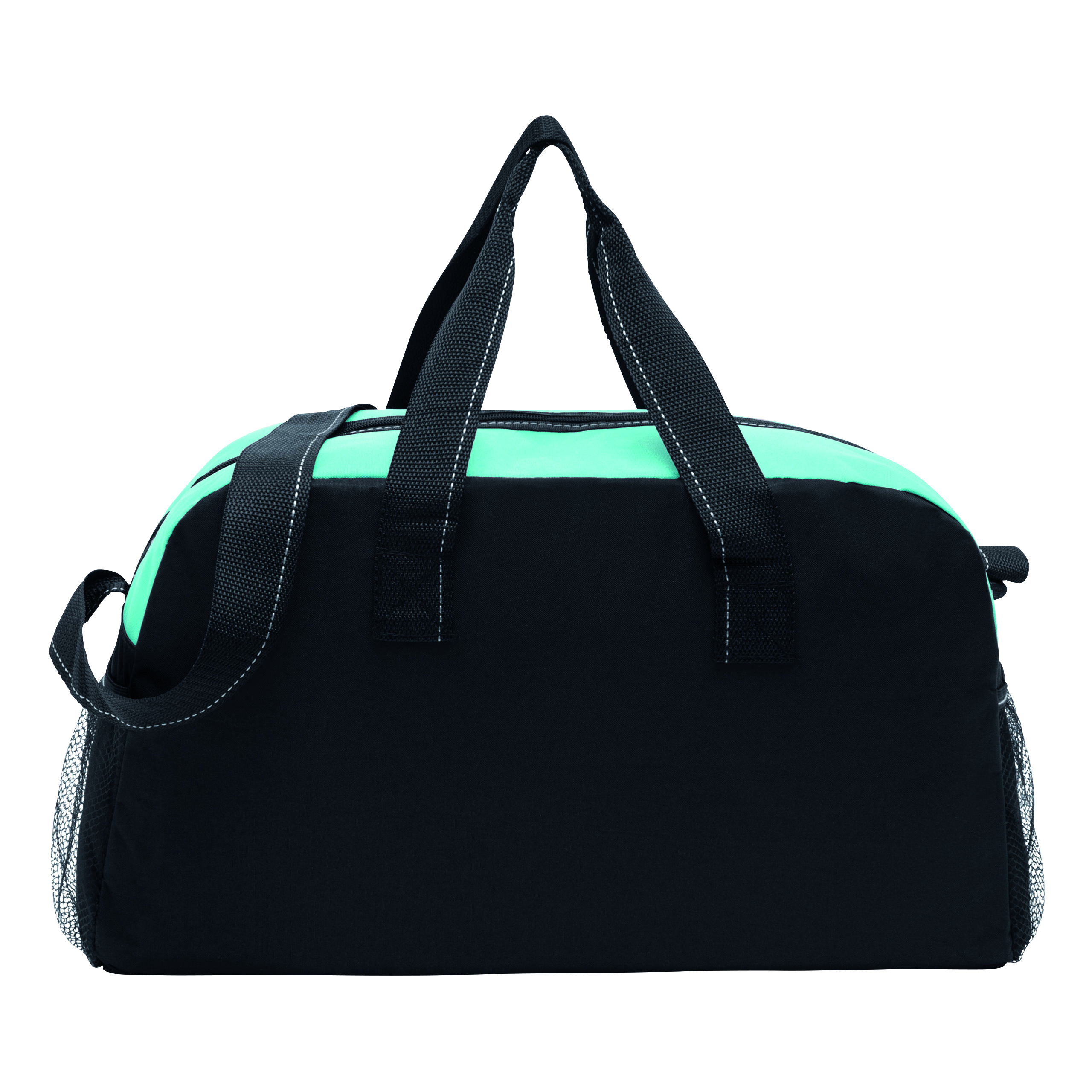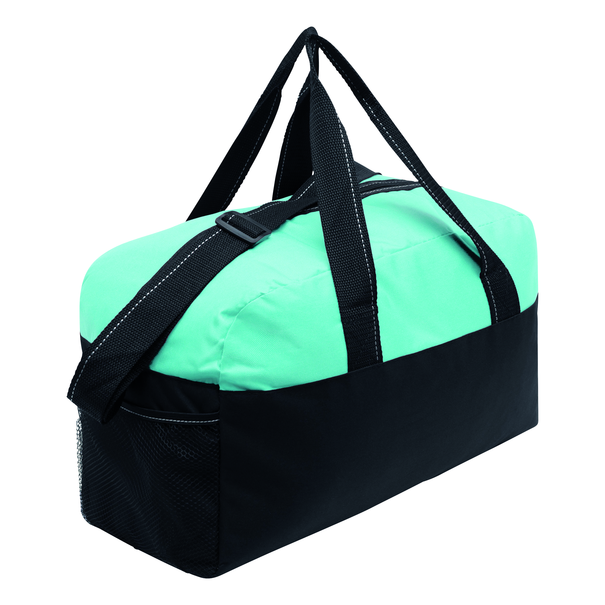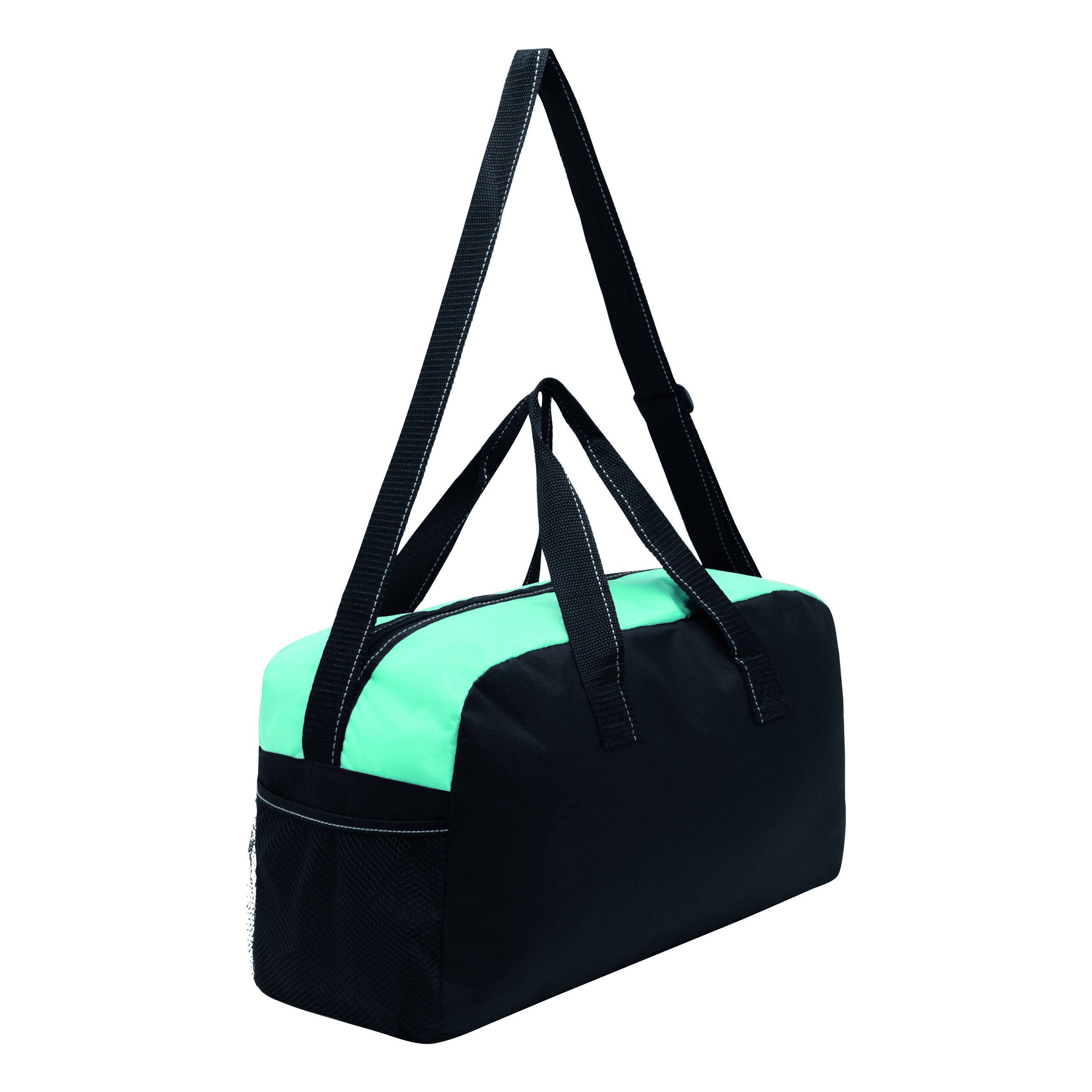 Sportowa torba FITNESS z przestronną komorą główną na zamek błyskawiczny, po bokach 2 siatkowe kieszenie, 2 uchwyty do przenoszenia, regulowany pasek na ramię.