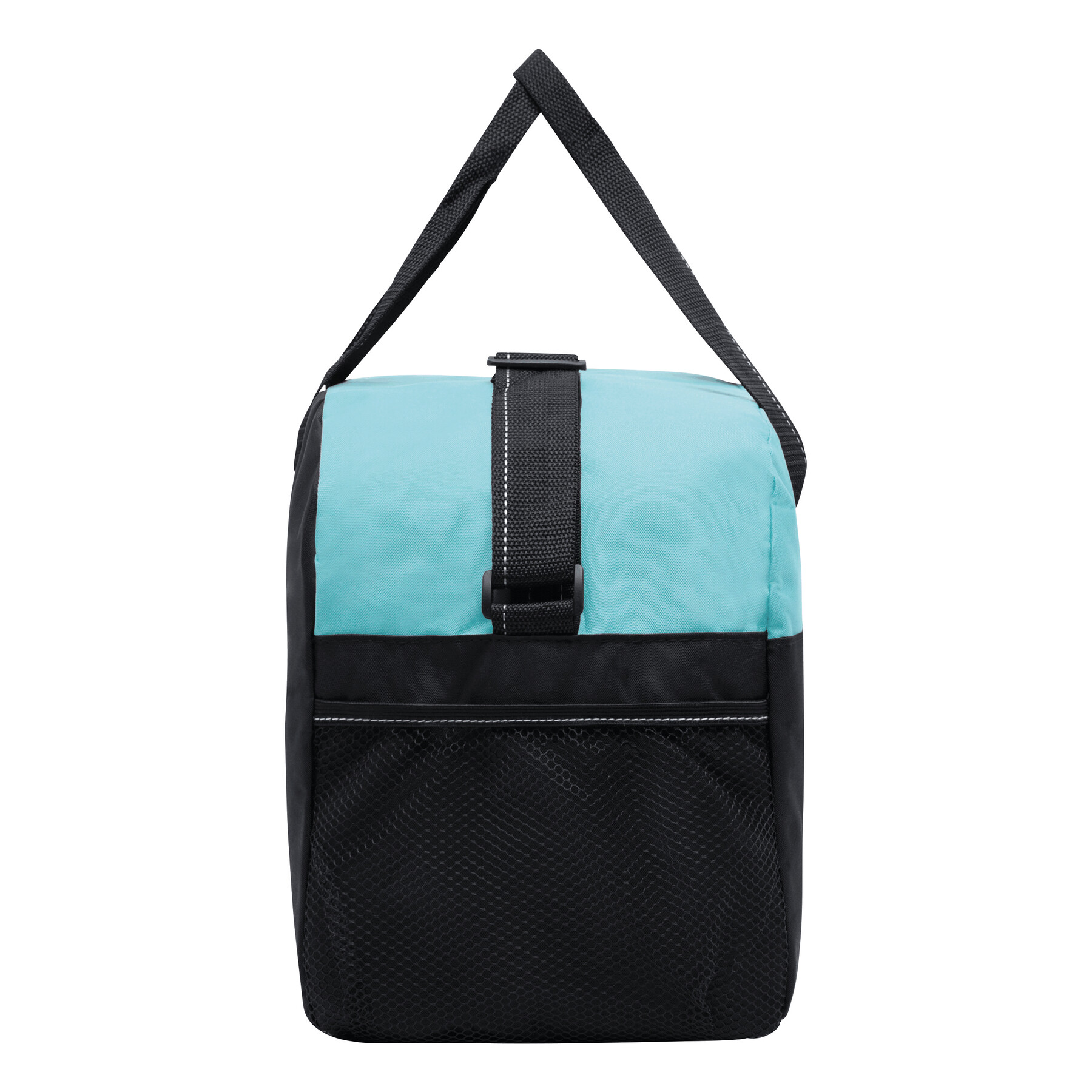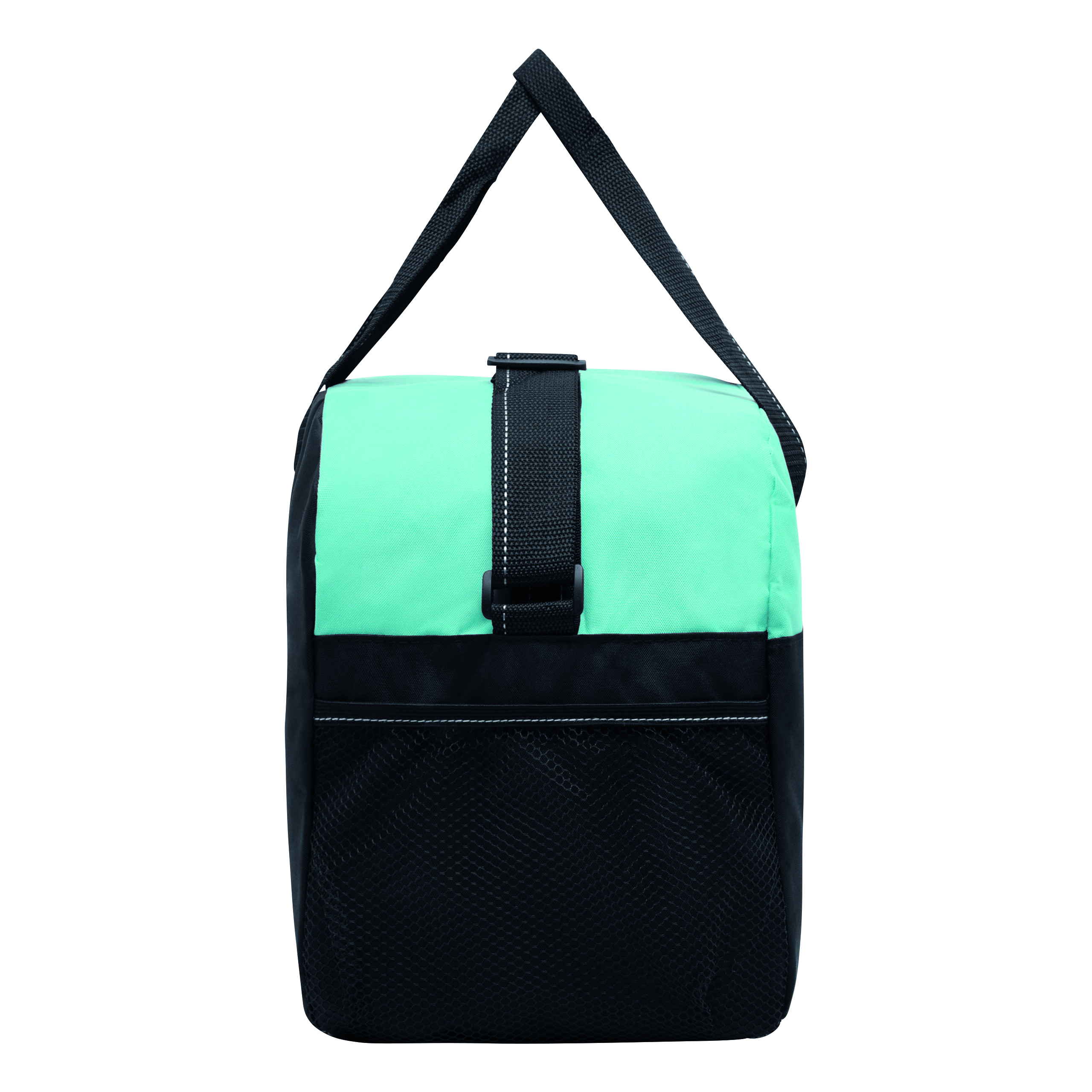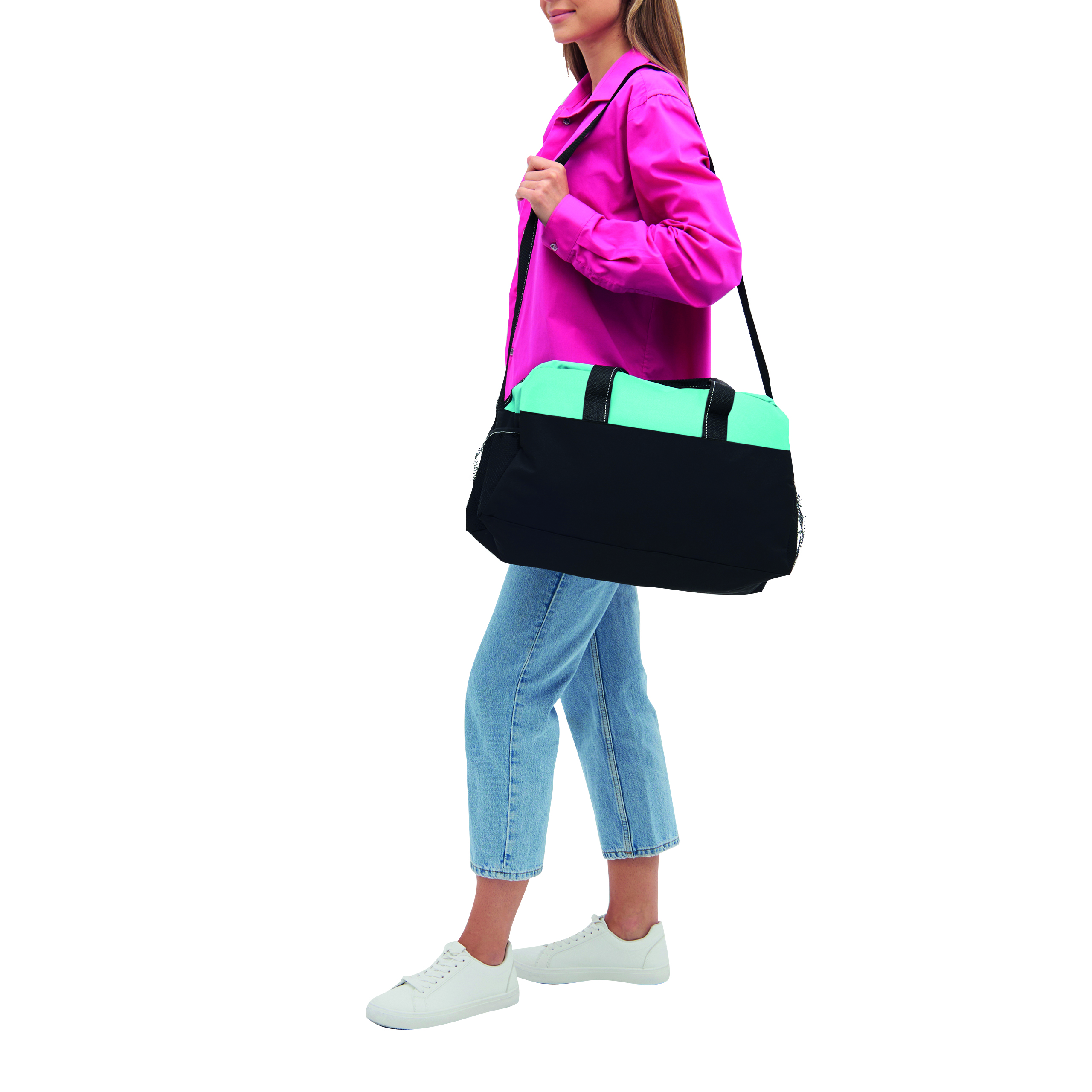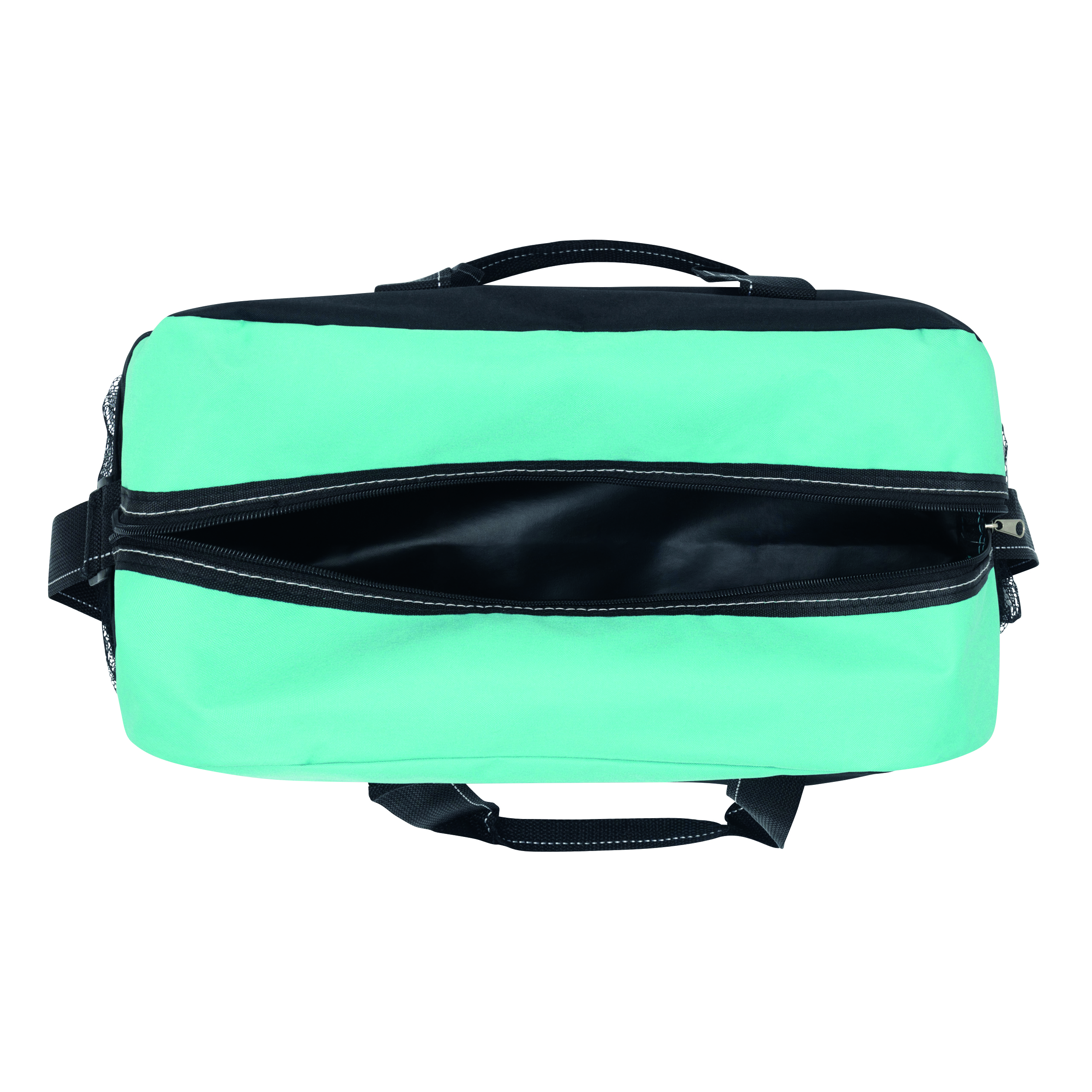 Sportowa torba FITNESS z przestronną komorą główną na zamek błyskawiczny, po bokach 2 siatkowe kieszenie, 2 uchwyty do przenoszenia, regulowany pasek na ramię.
