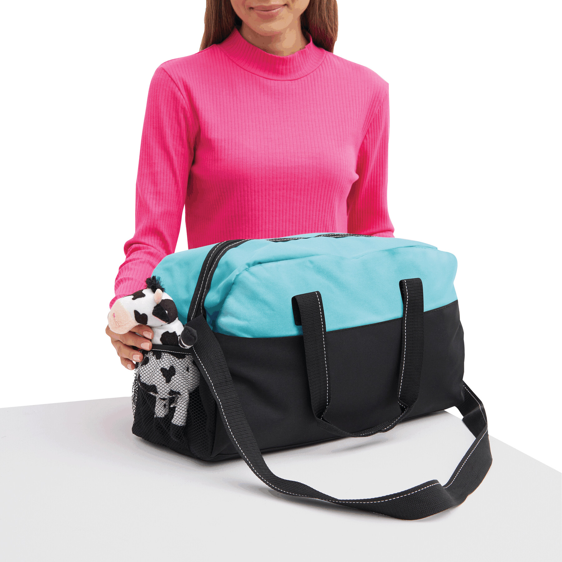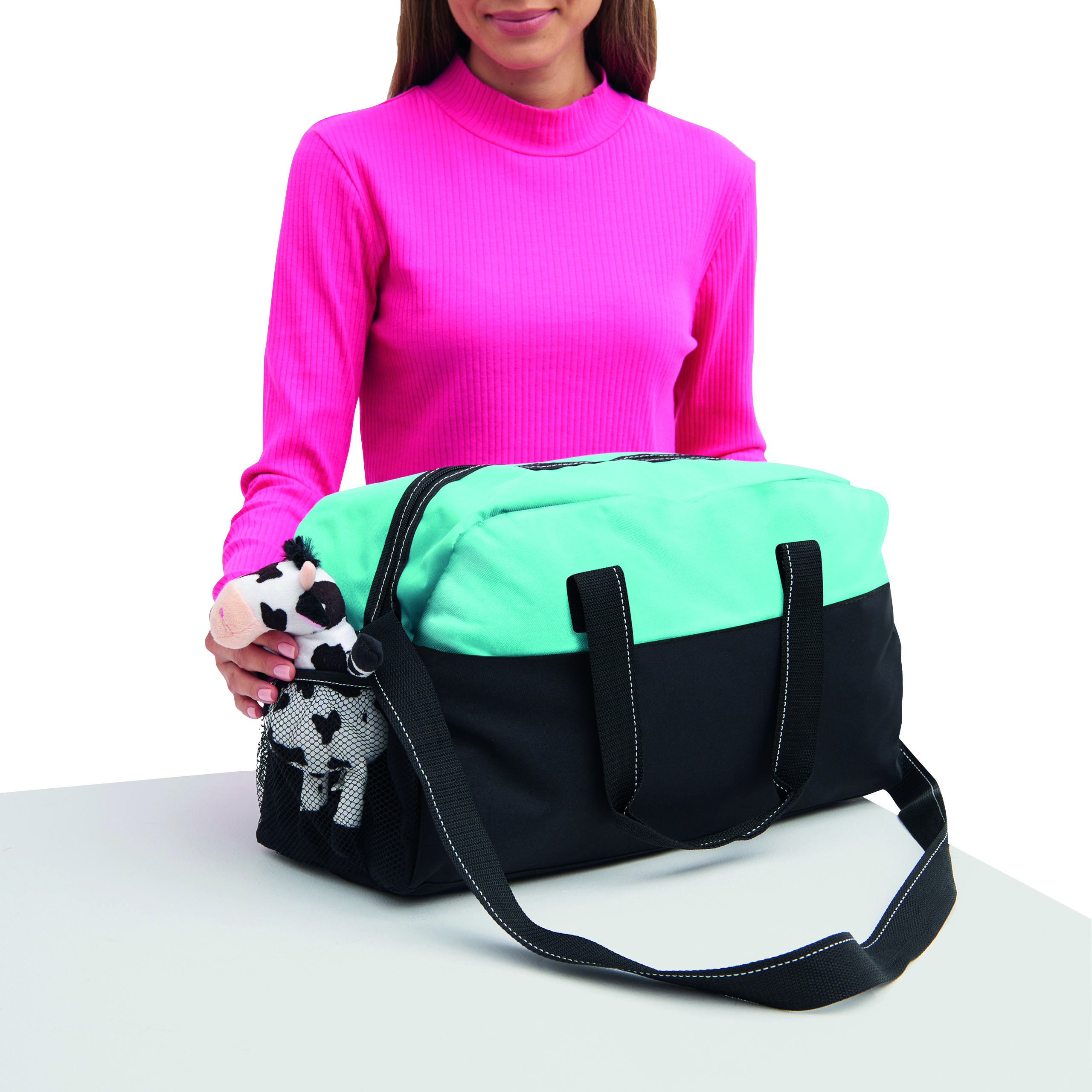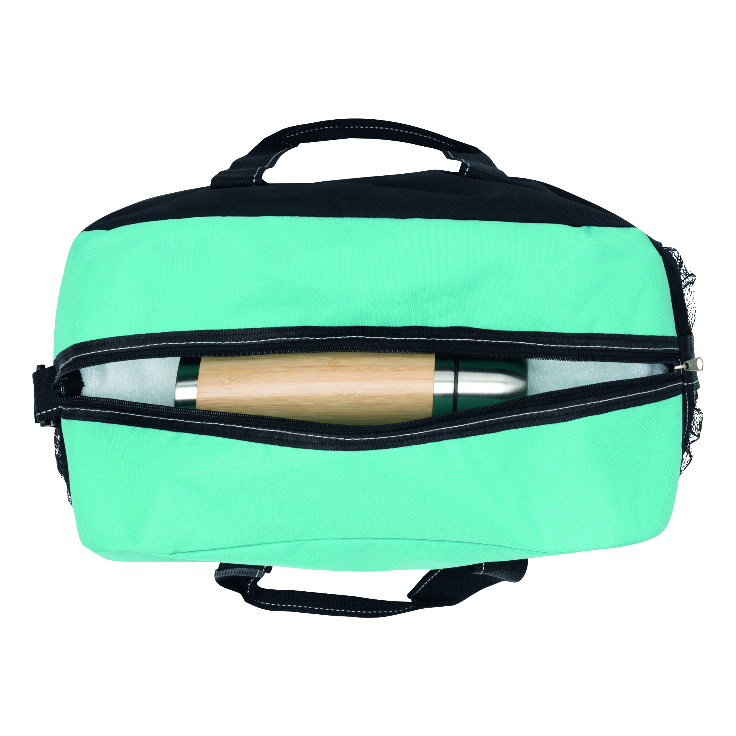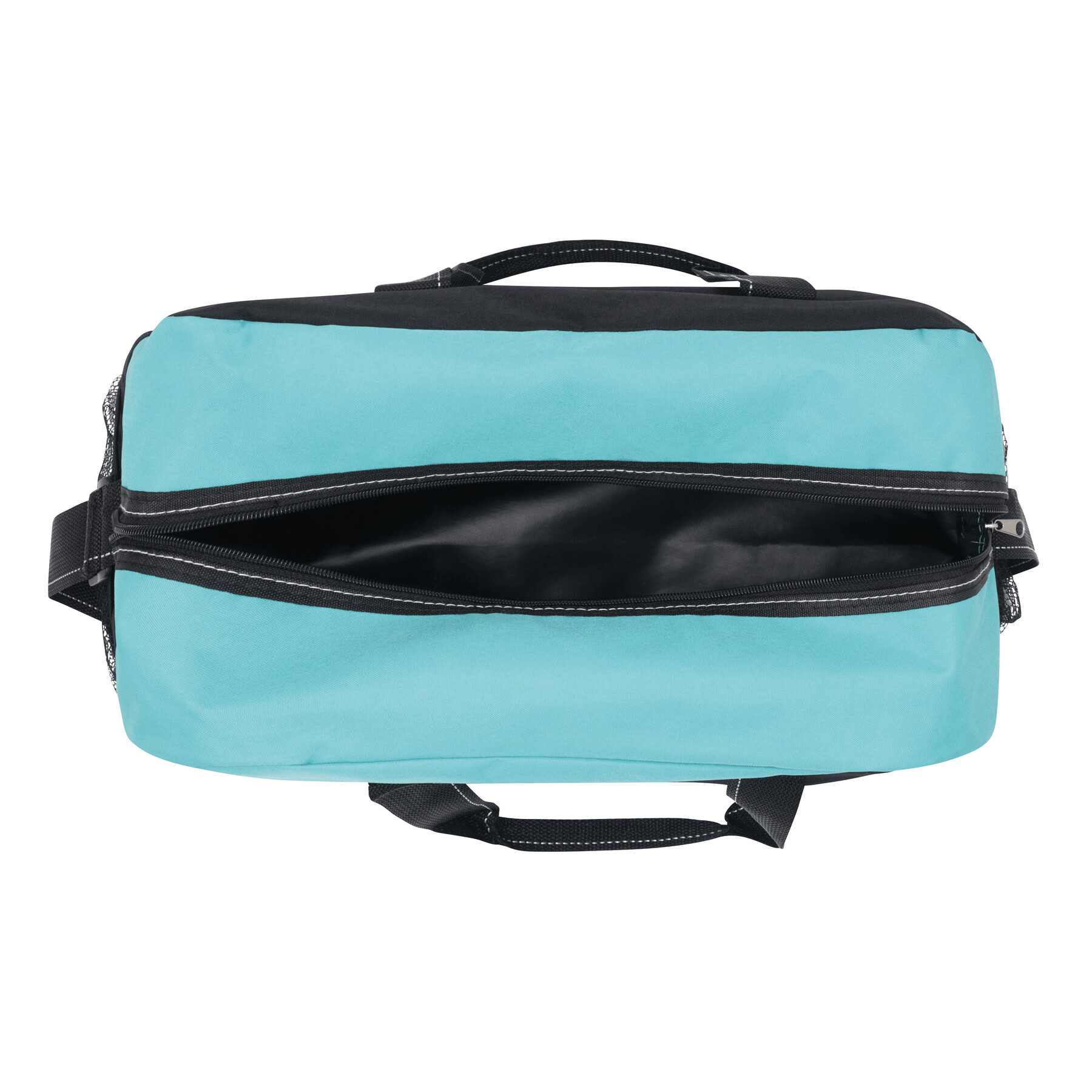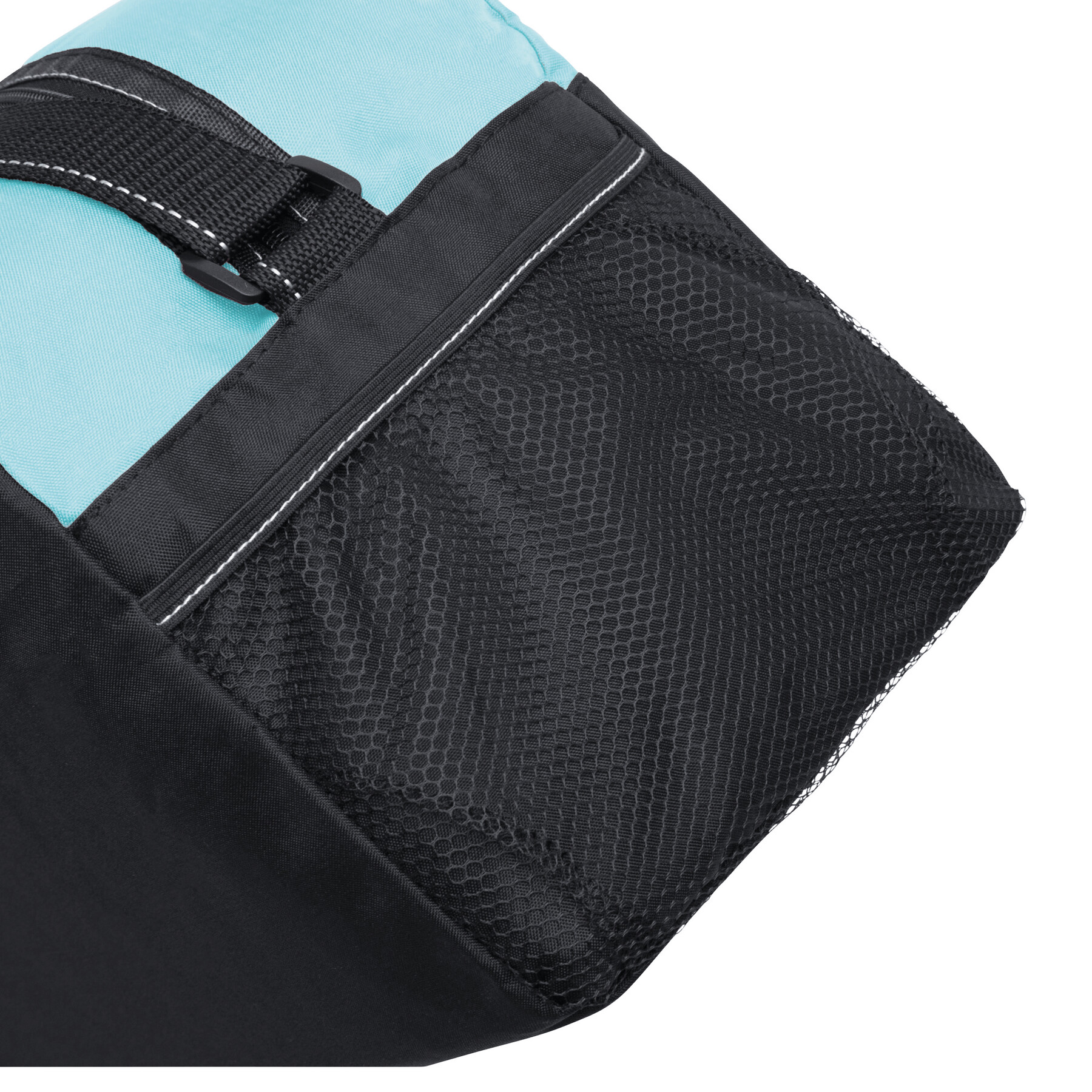 Sportowa torba FITNESS z przestronną komorą główną na zamek błyskawiczny, po bokach 2 siatkowe kieszenie, 2 uchwyty do przenoszenia, regulowany pasek na ramię.