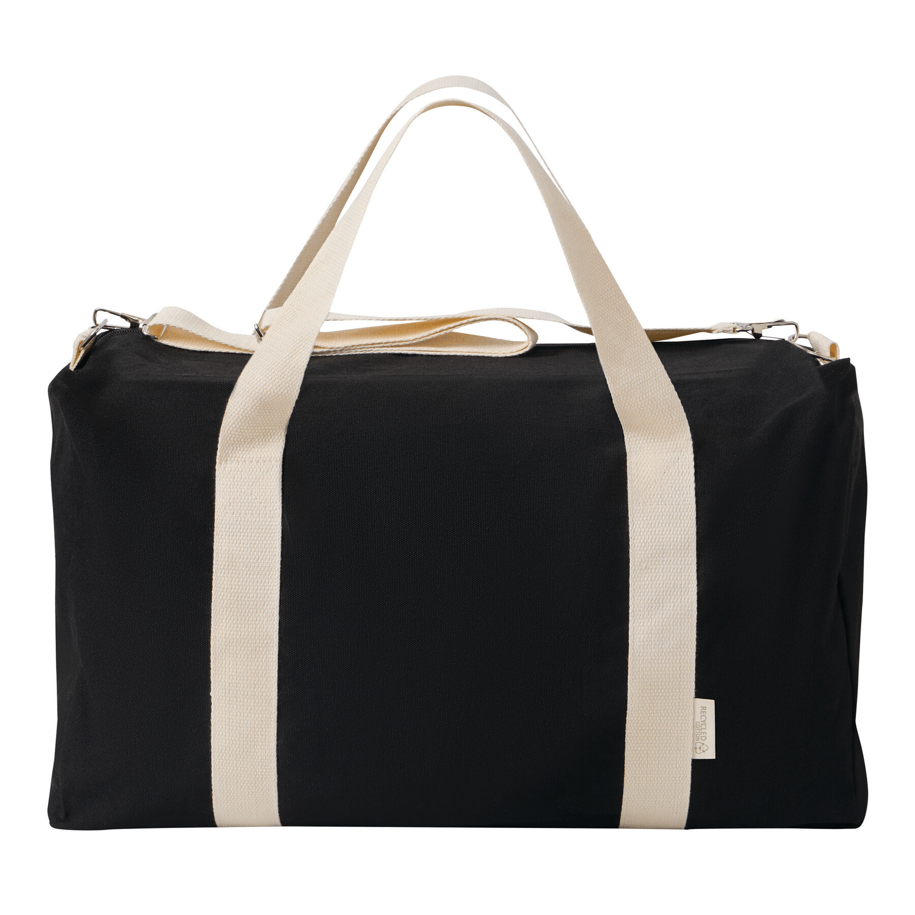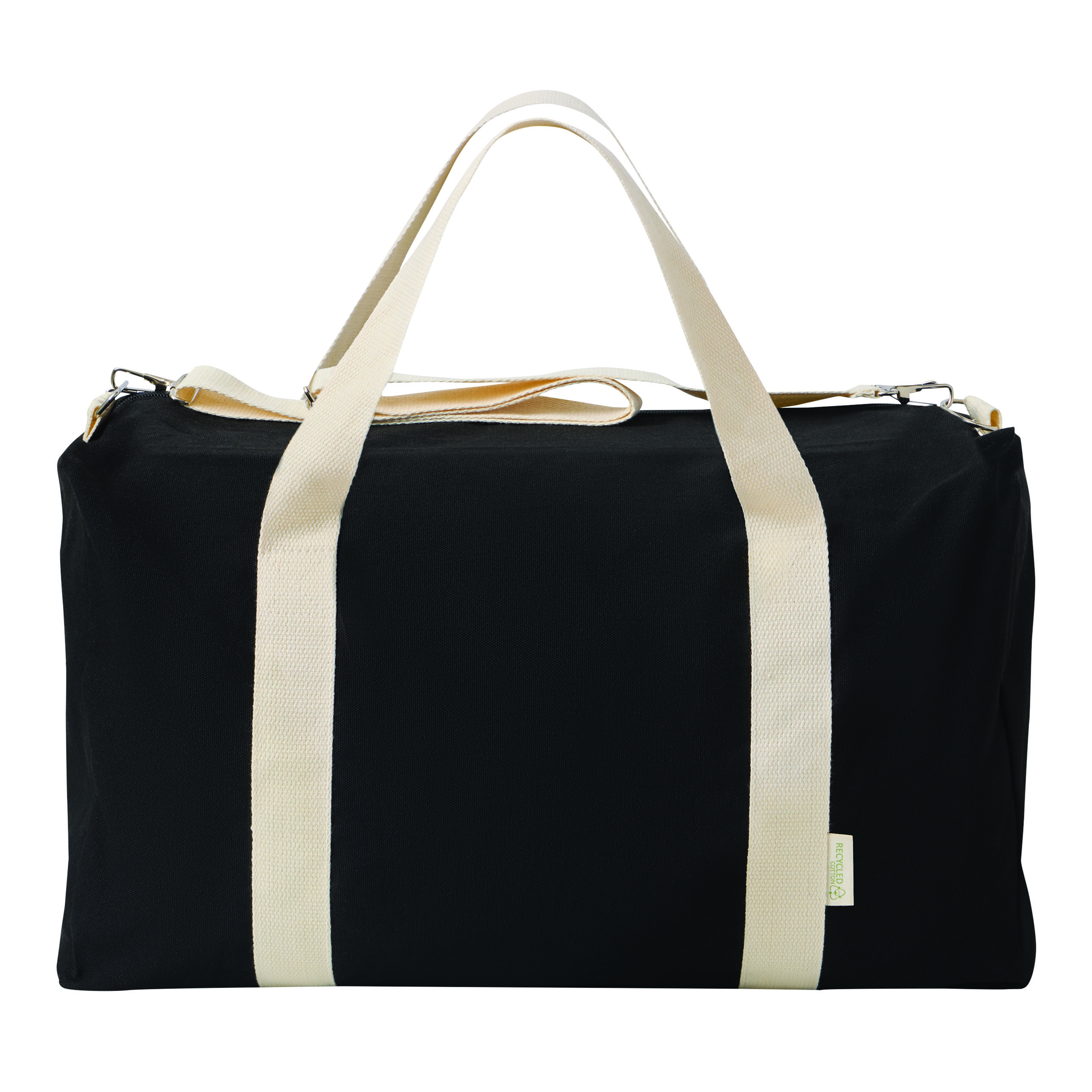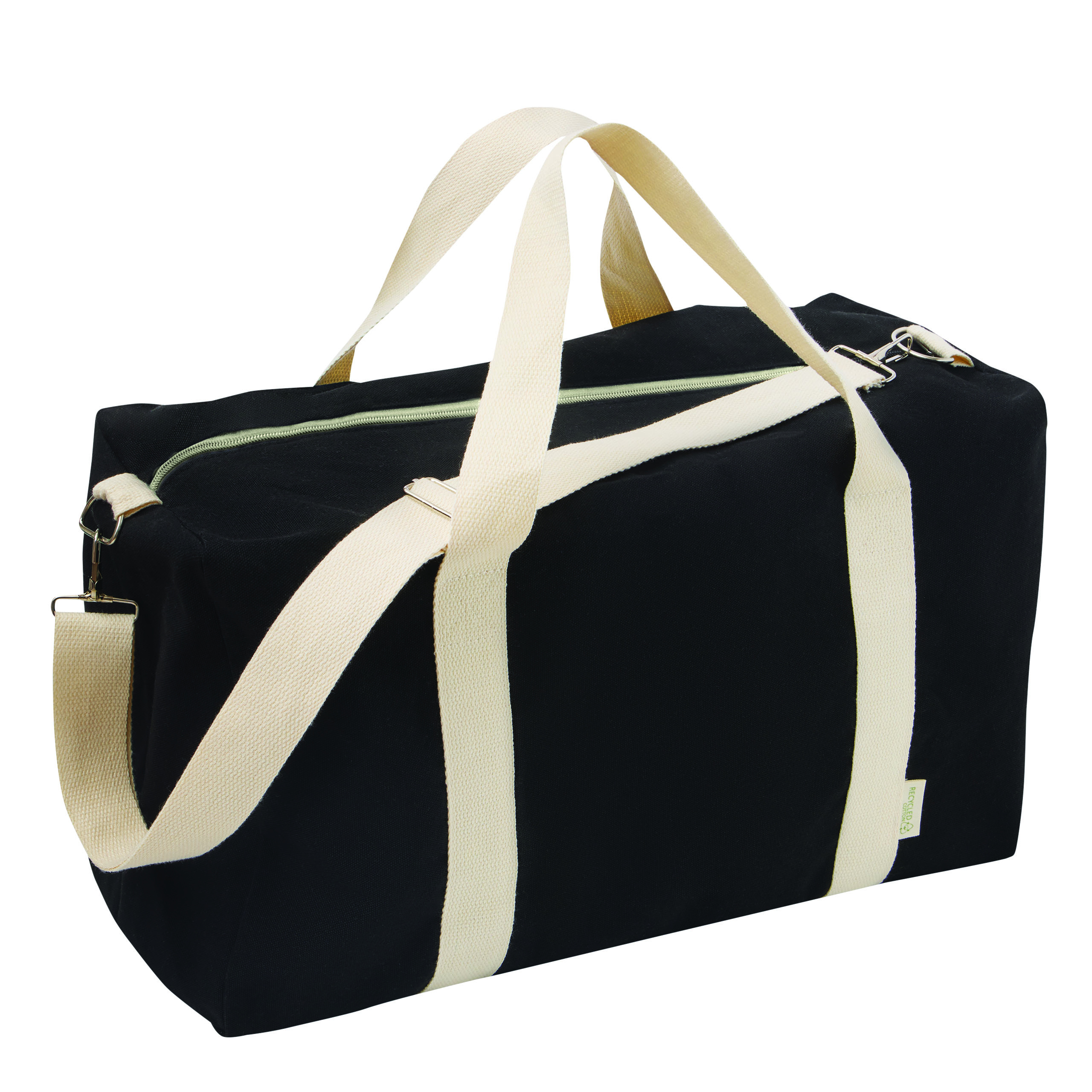 Torba sportowa BANKURA. Wykonana jest z bawełny pochodzącej z recyklingu i poliestru. Ma przestronną komorę główną zapinaną na zamek błyskawiczny, 2 uchwyty do przenoszenia oraz regulowany i odpinany pasek na ramię.