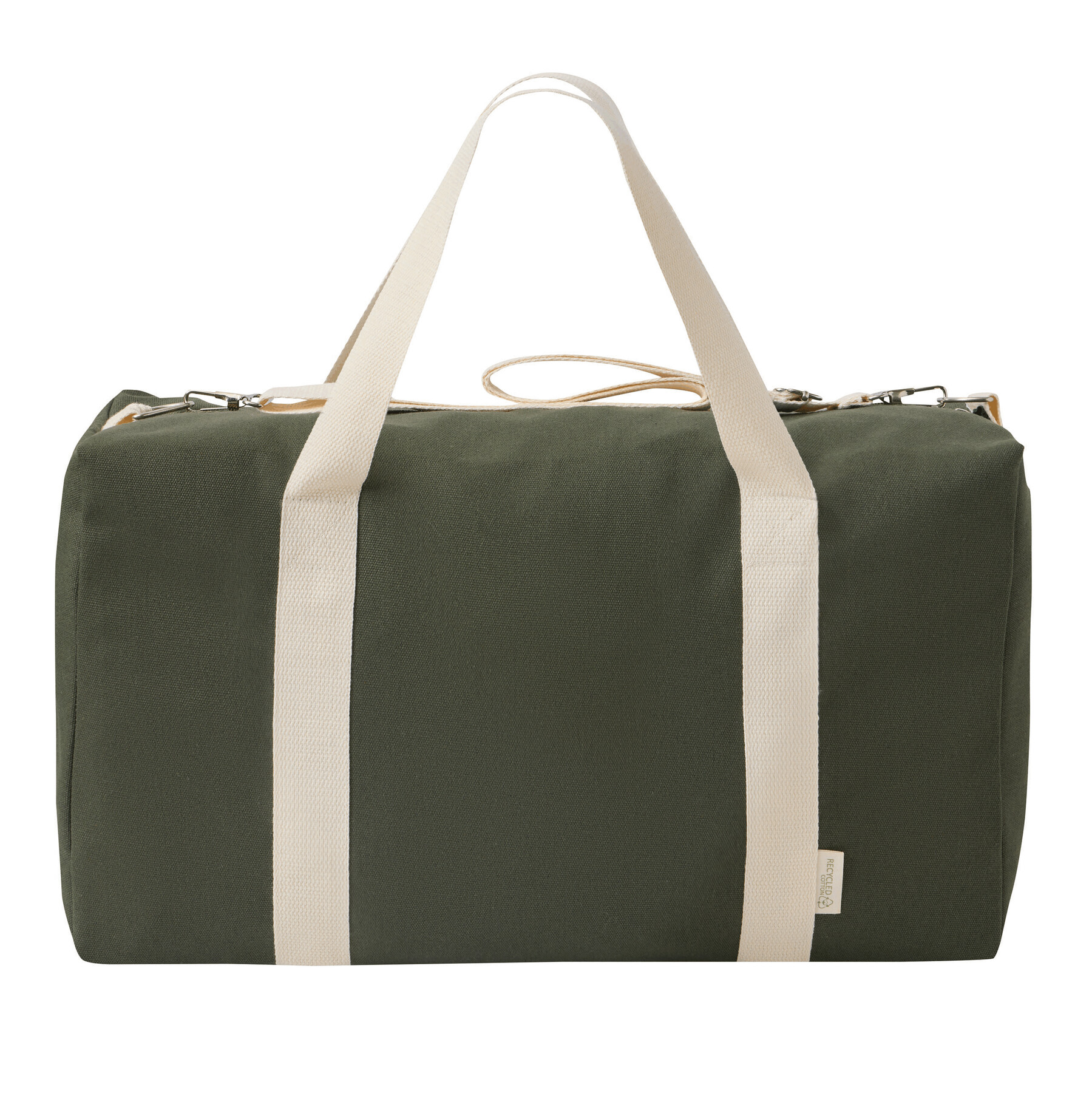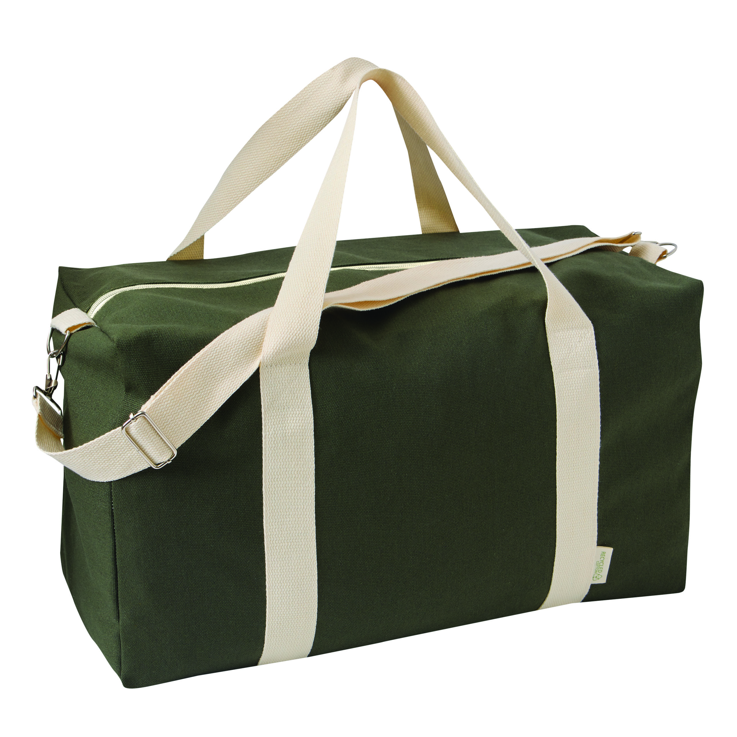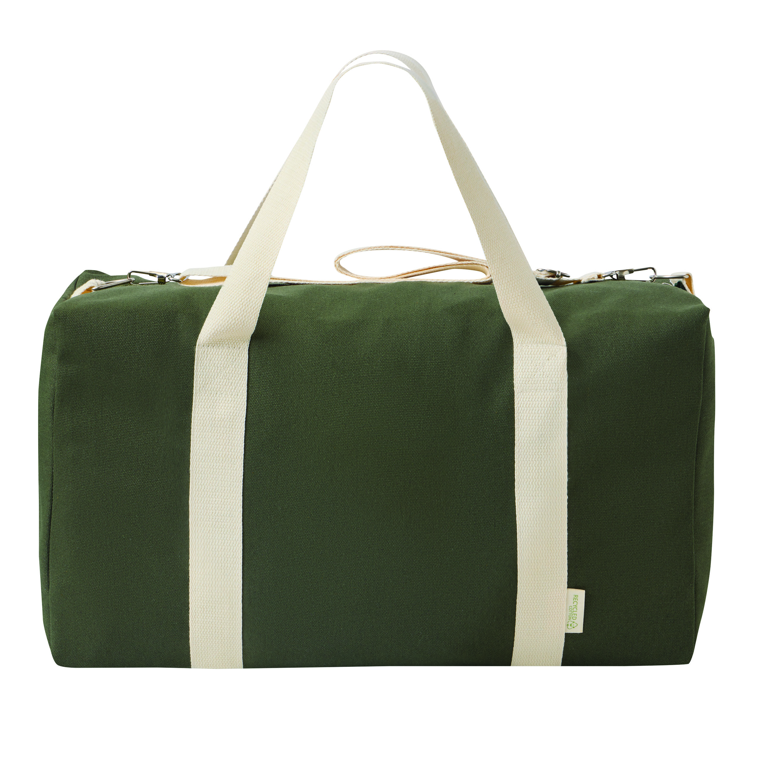 Torba sportowa BANKURA. Wykonana jest z bawełny pochodzącej z recyklingu i poliestru. Ma przestronną komorę główną zapinaną na zamek błyskawiczny, 2 uchwyty do przenoszenia oraz regulowany i odpinany pasek na ramię.