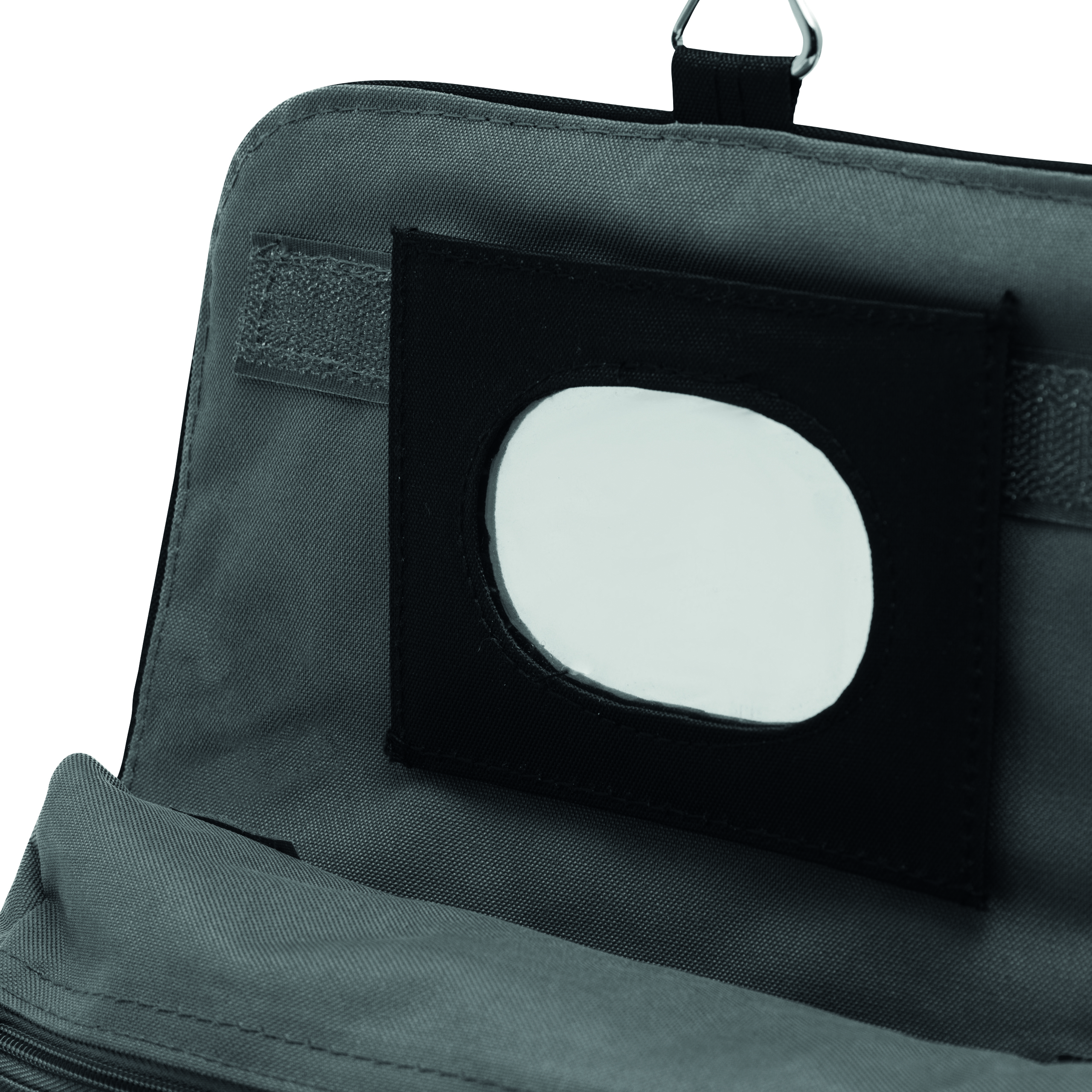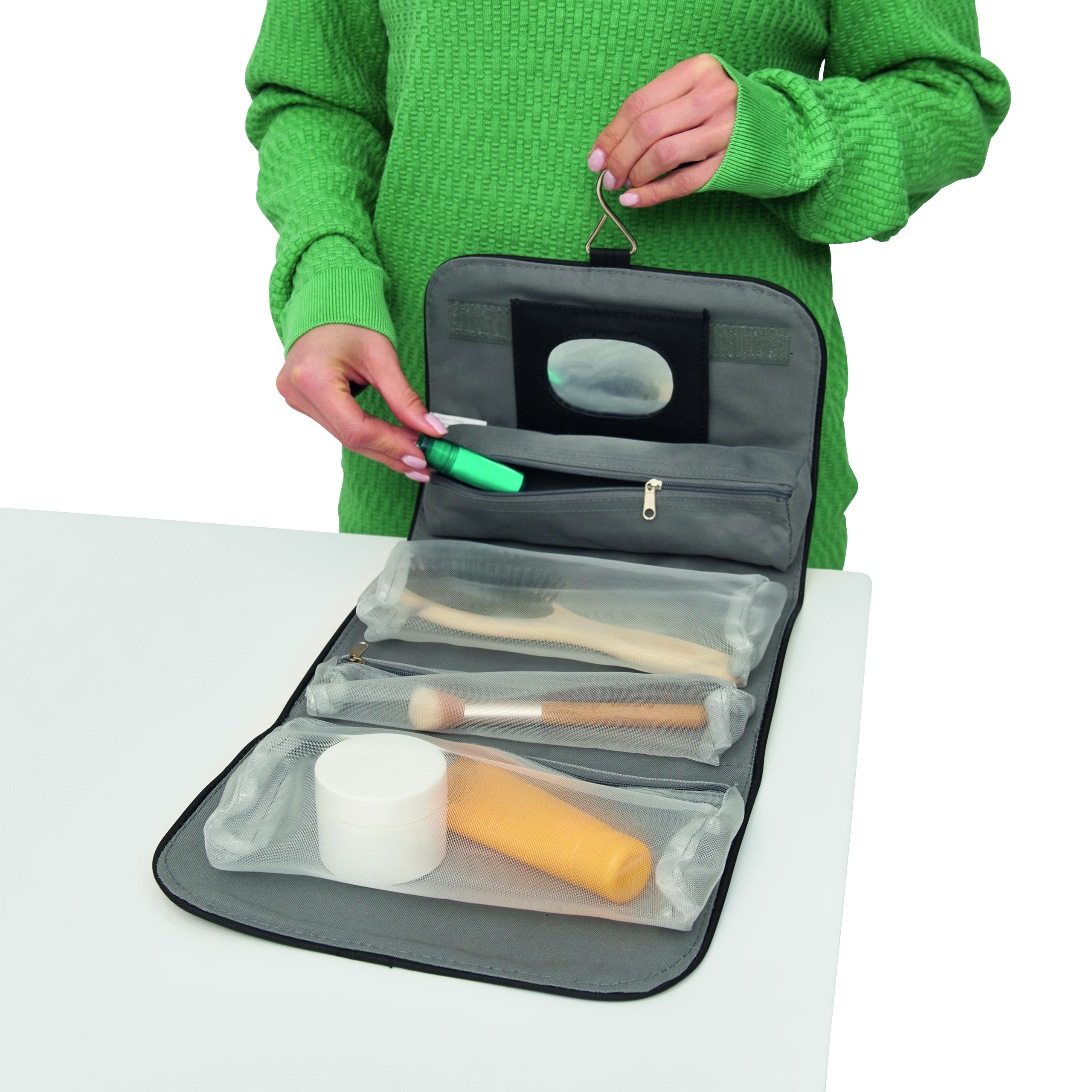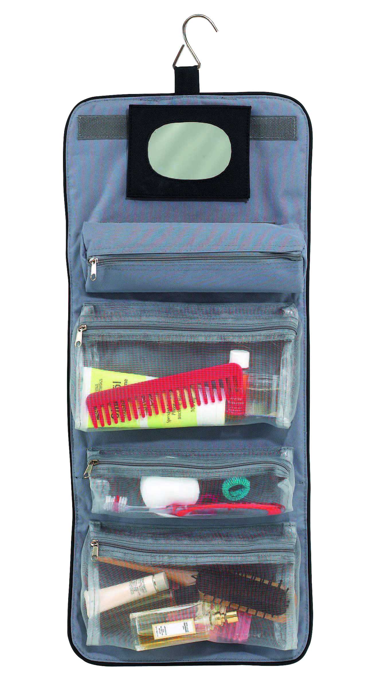 Kosmetyczka STAR z 5 kieszeniami na zamki błyskawiczne, odpinanym lusterkiem, uchwytem i metalowym haczykiem do wieszania.