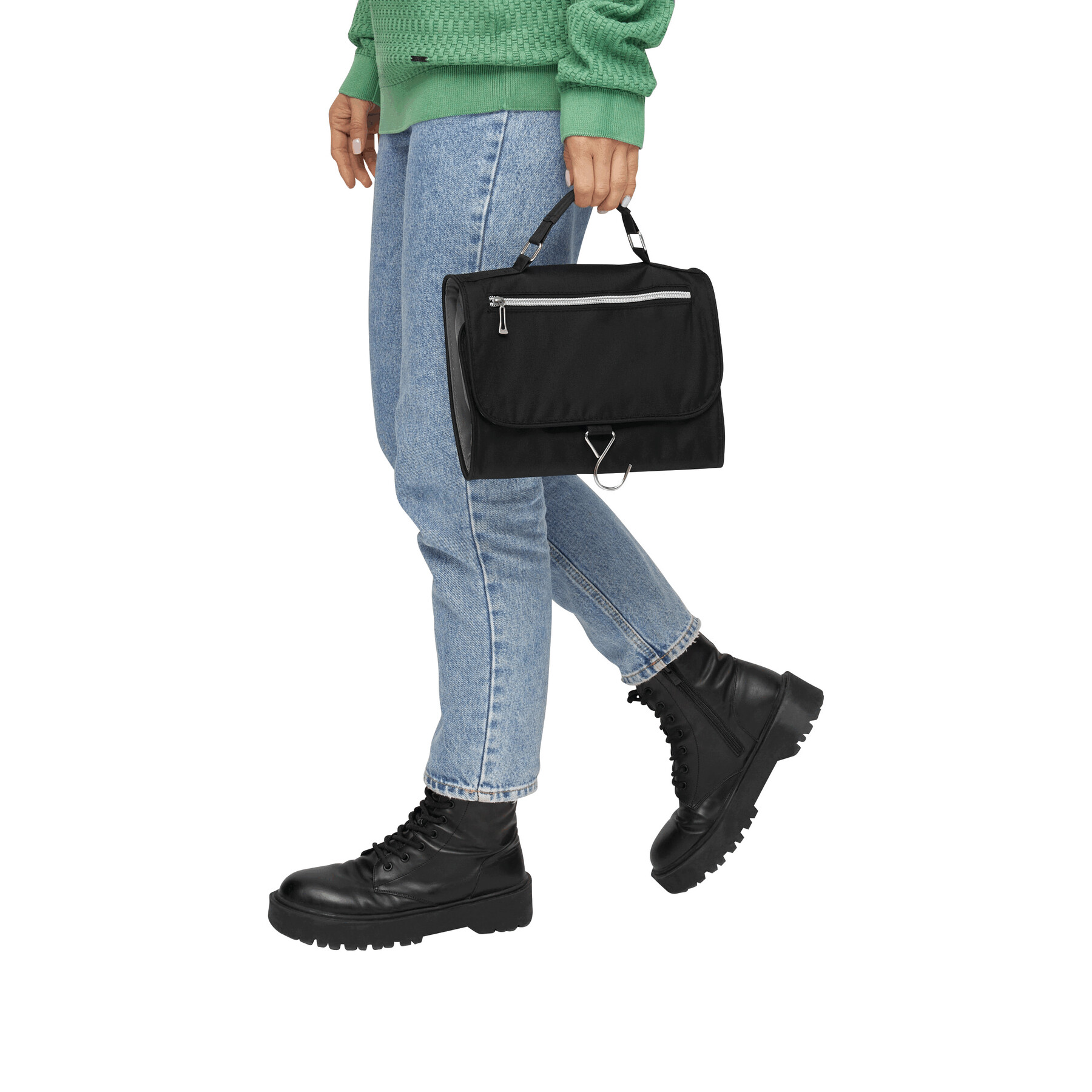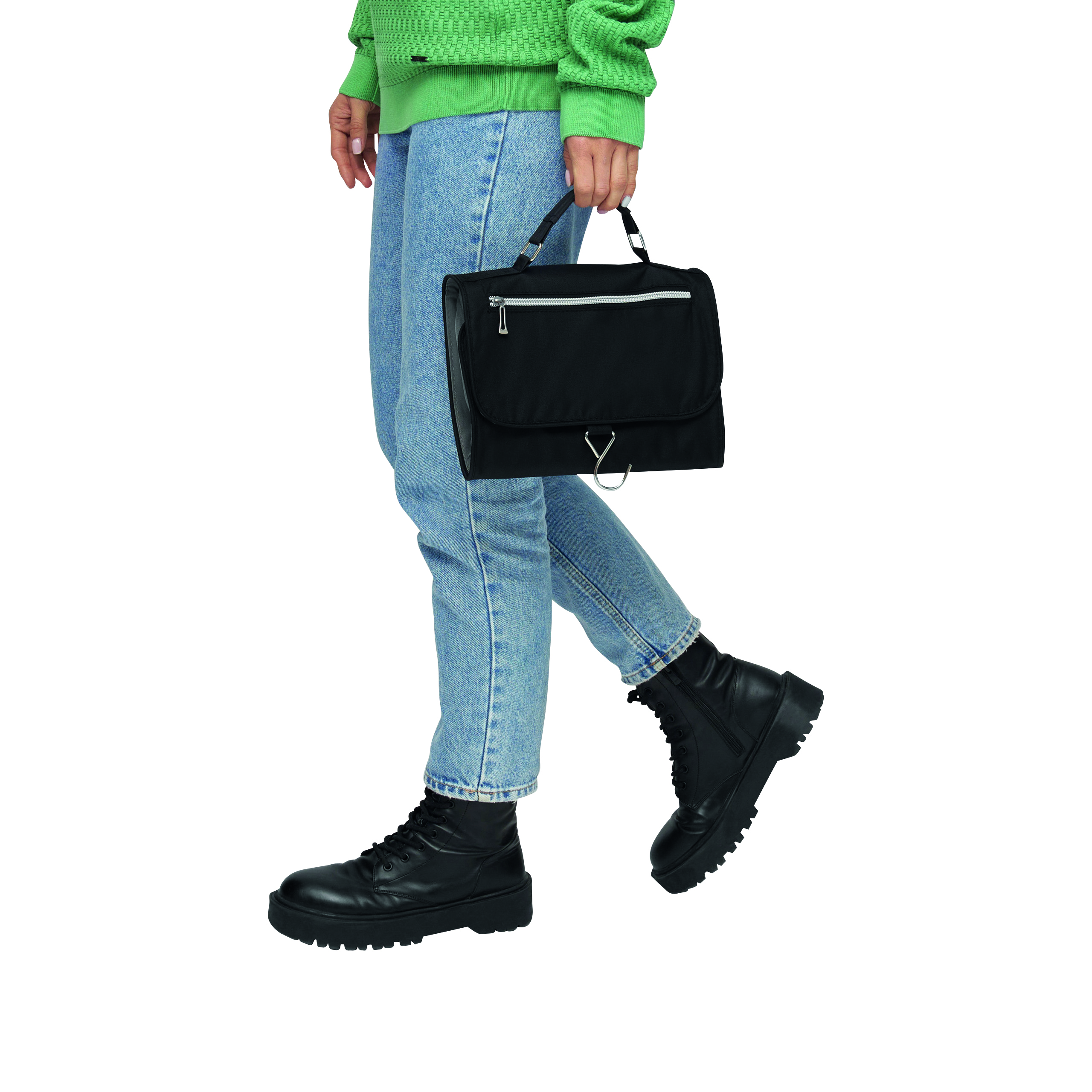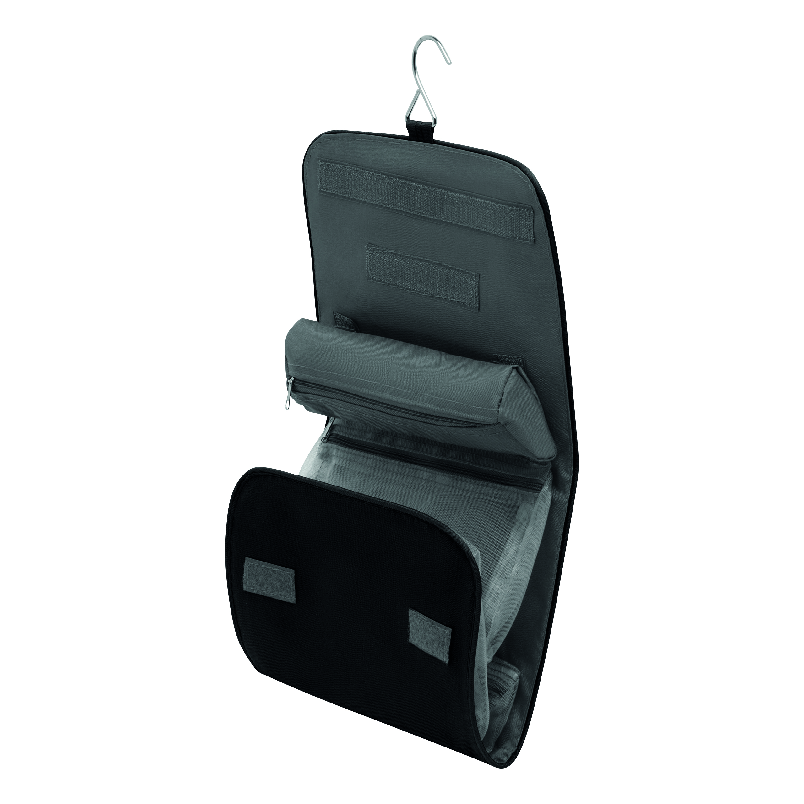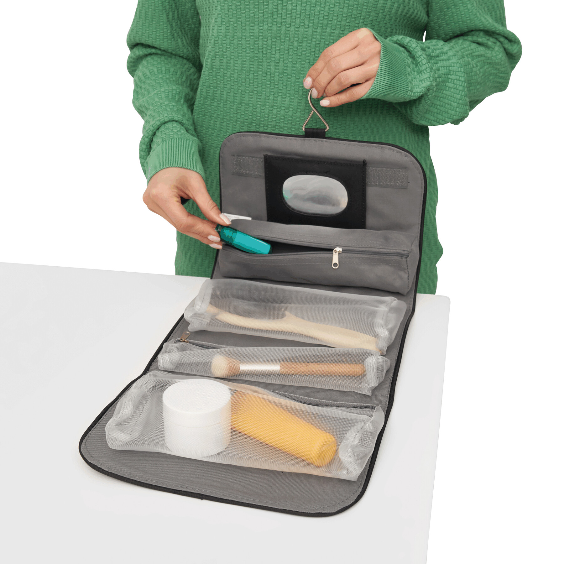 Kosmetyczka STAR z 5 kieszeniami na zamki błyskawiczne, odpinanym lusterkiem, uchwytem i metalowym haczykiem do wieszania.