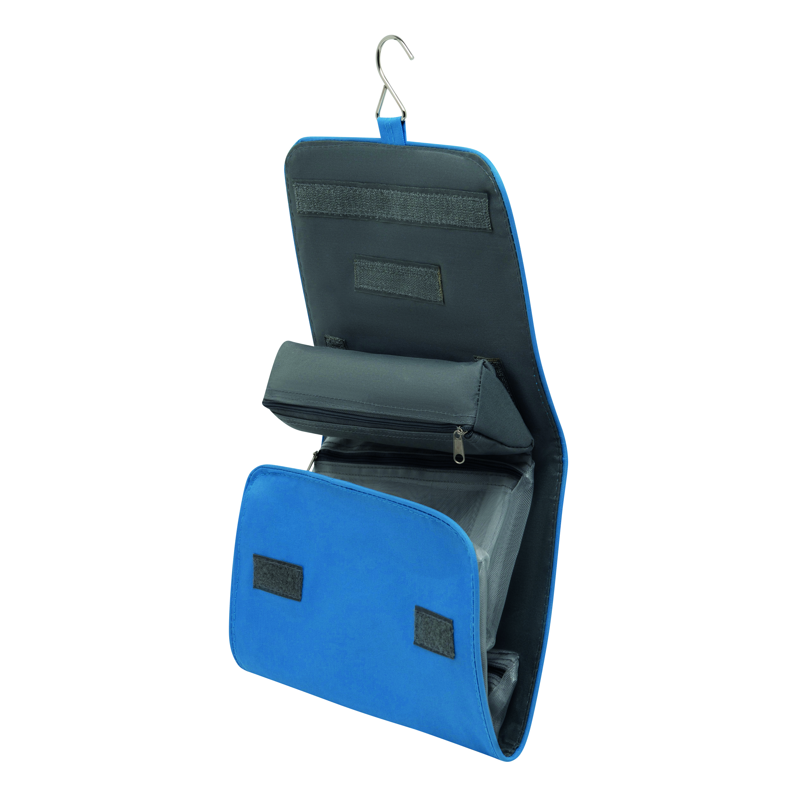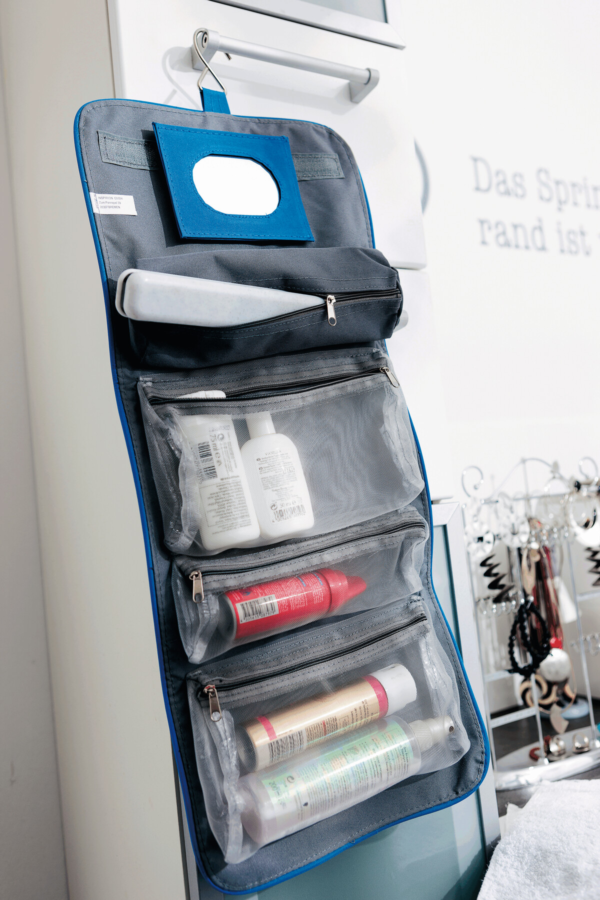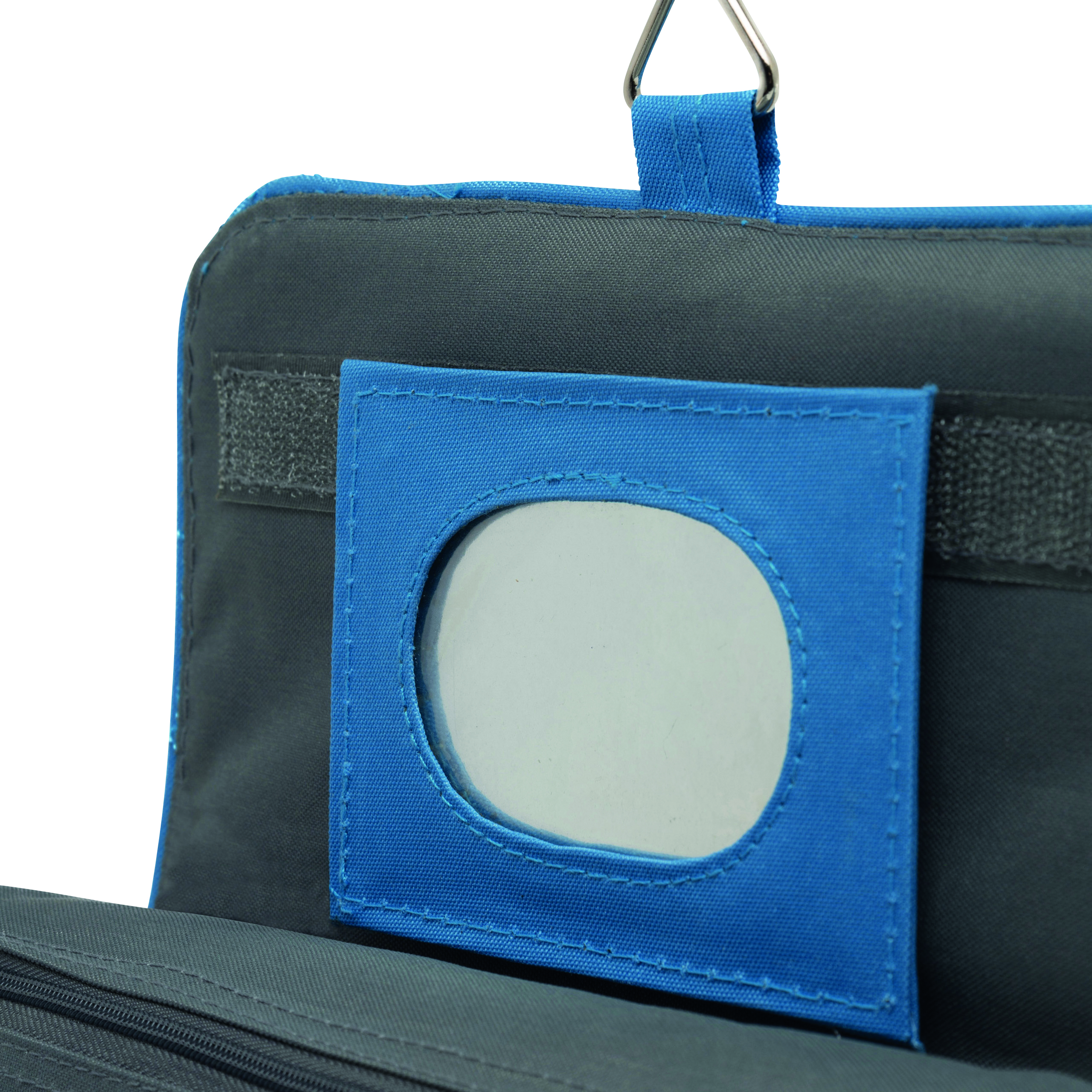 Kosmetyczka STAR z 5 kieszeniami na zamki błyskawiczne, odpinanym lusterkiem, uchwytem i metalowym haczykiem do wieszania.