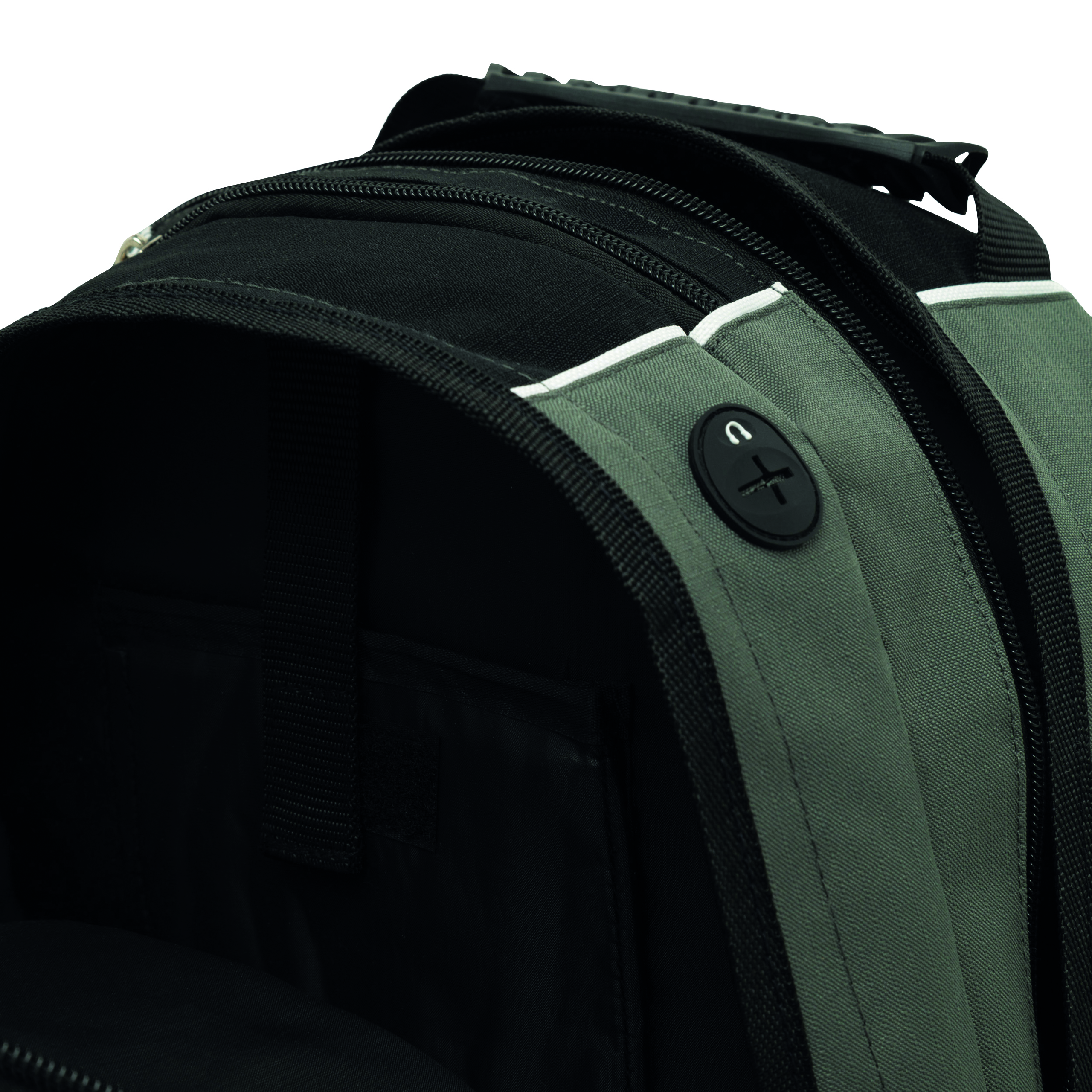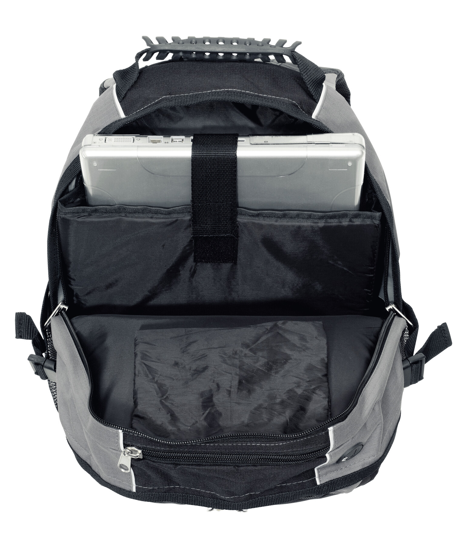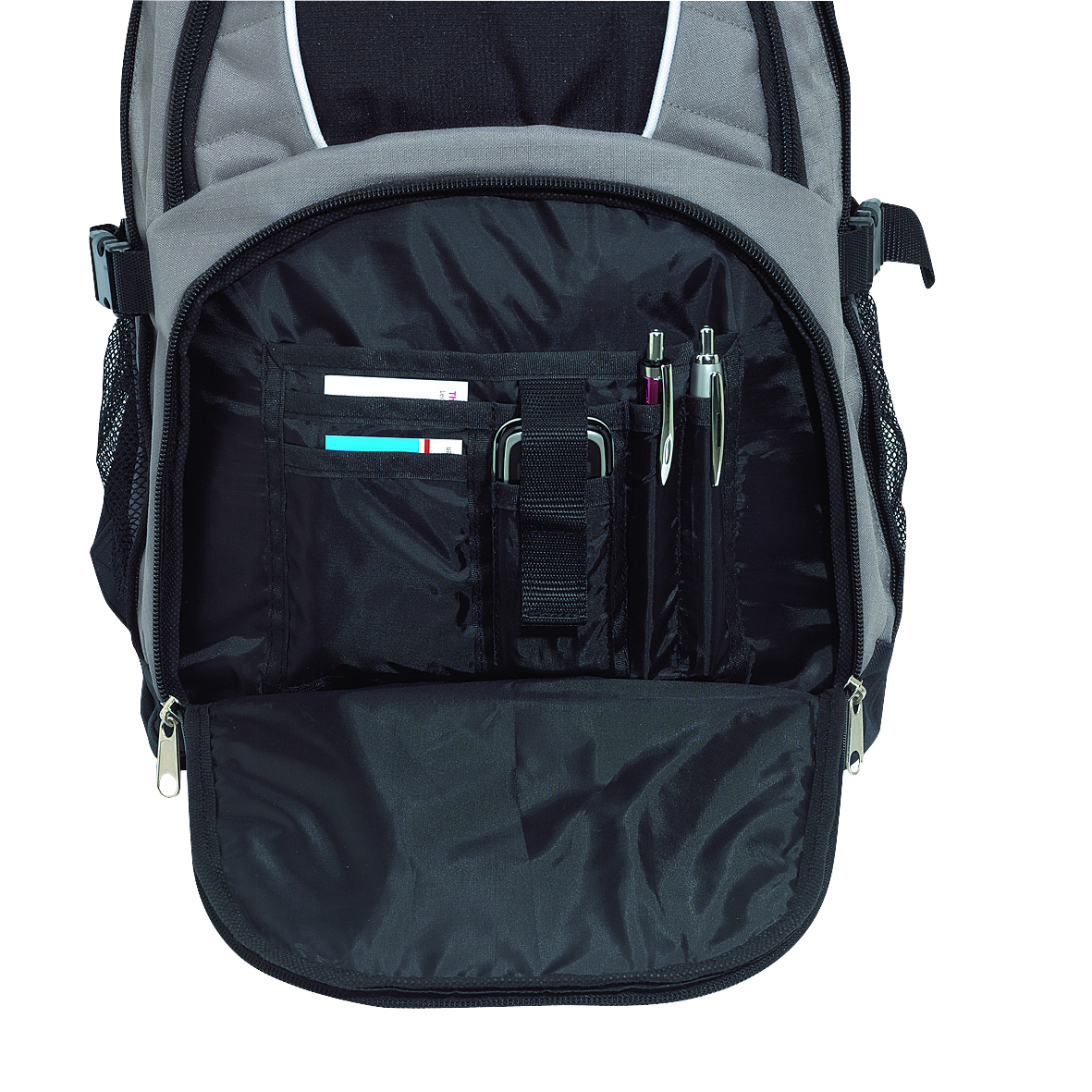Plecak HYPE z dwiema przednimi kieszeniami zapinanymi na suwak, w tym jedna z mniejszymi kieszonkami w środku, dwie główne komory na suwak. Jedna usztywniana na laptopa, a druga na odtwarzacz CD lub inny sprzęt, z otworem na kabel słuchawek, jedna kieszeń na klucze, dwie kieszenie z siatki po bokach, z mocną rączką, wyściełanymi ramiączkami i wzmocnionym tyłem.