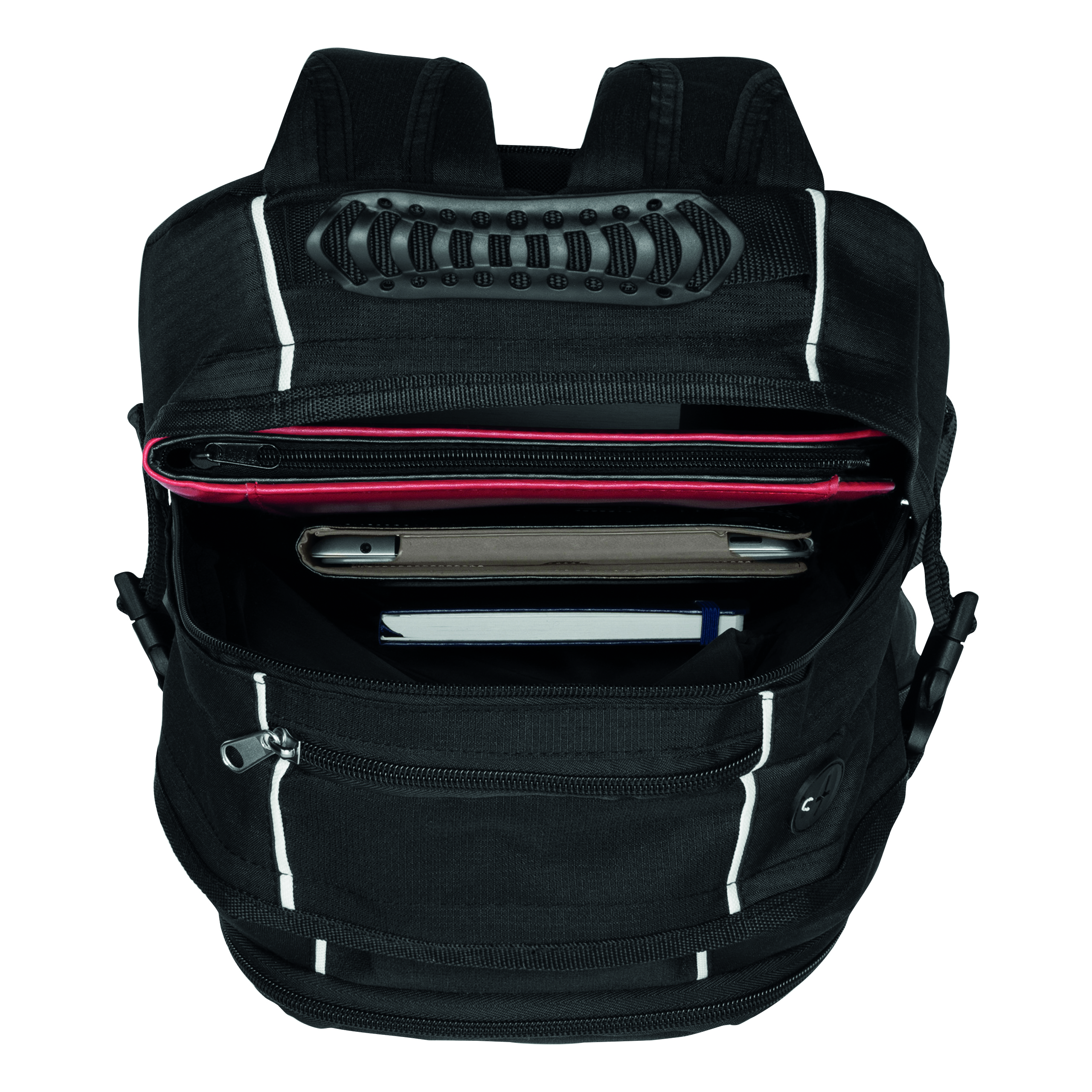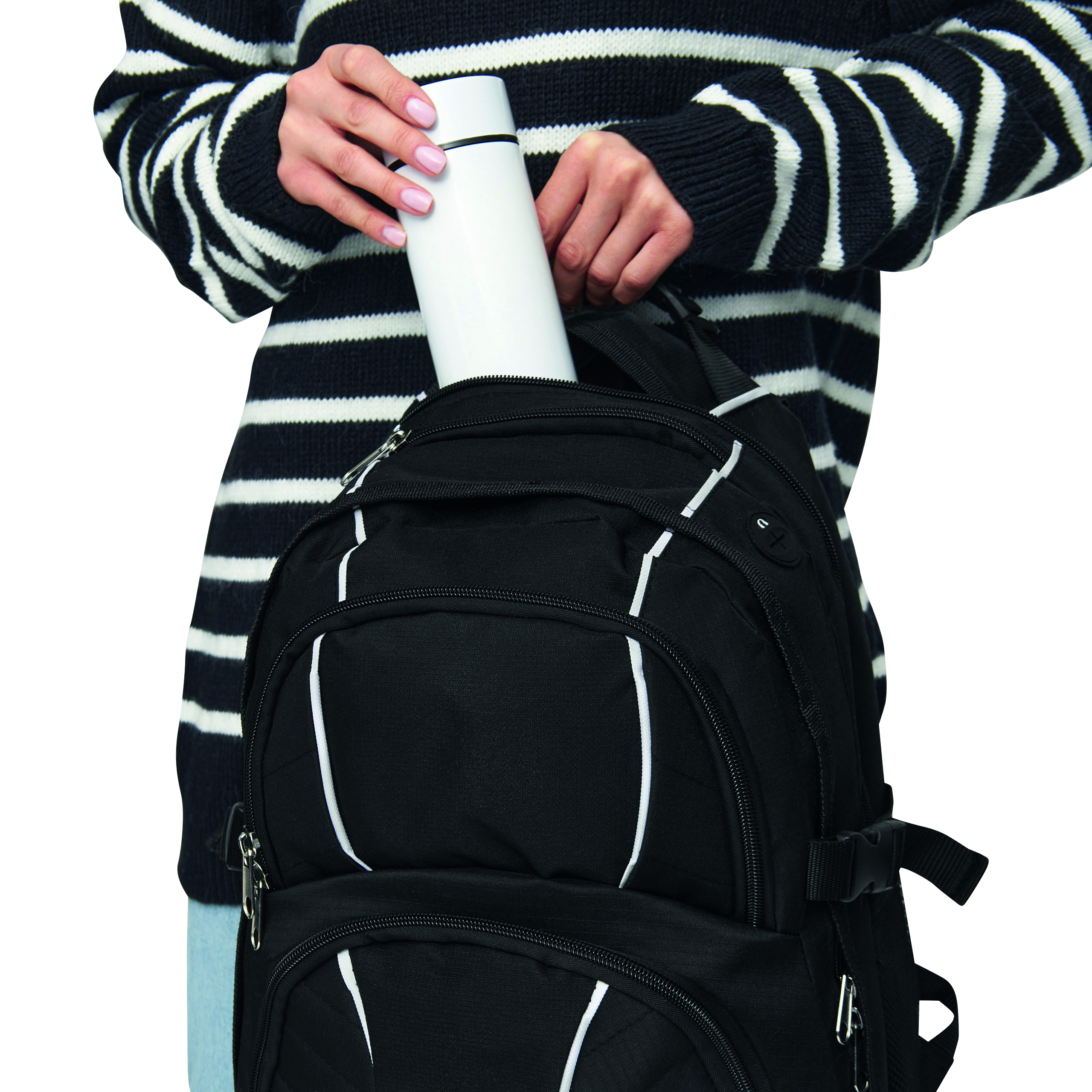 Plecak HYPE z dwiema przednimi kieszeniami zapinanymi na suwak, w tym jedna z mniejszymi kieszonkami w środku, dwie główne komory na suwak. Jedna usztywniana na laptopa, a druga na odtwarzacz CD lub inny sprzęt, z otworem na kabel słuchawek, jedna kieszeń na klucze, dwie kieszenie z siatki po bokach, z mocną rączką, wyściełanymi ramiączkami i wzmocnionym tyłem.