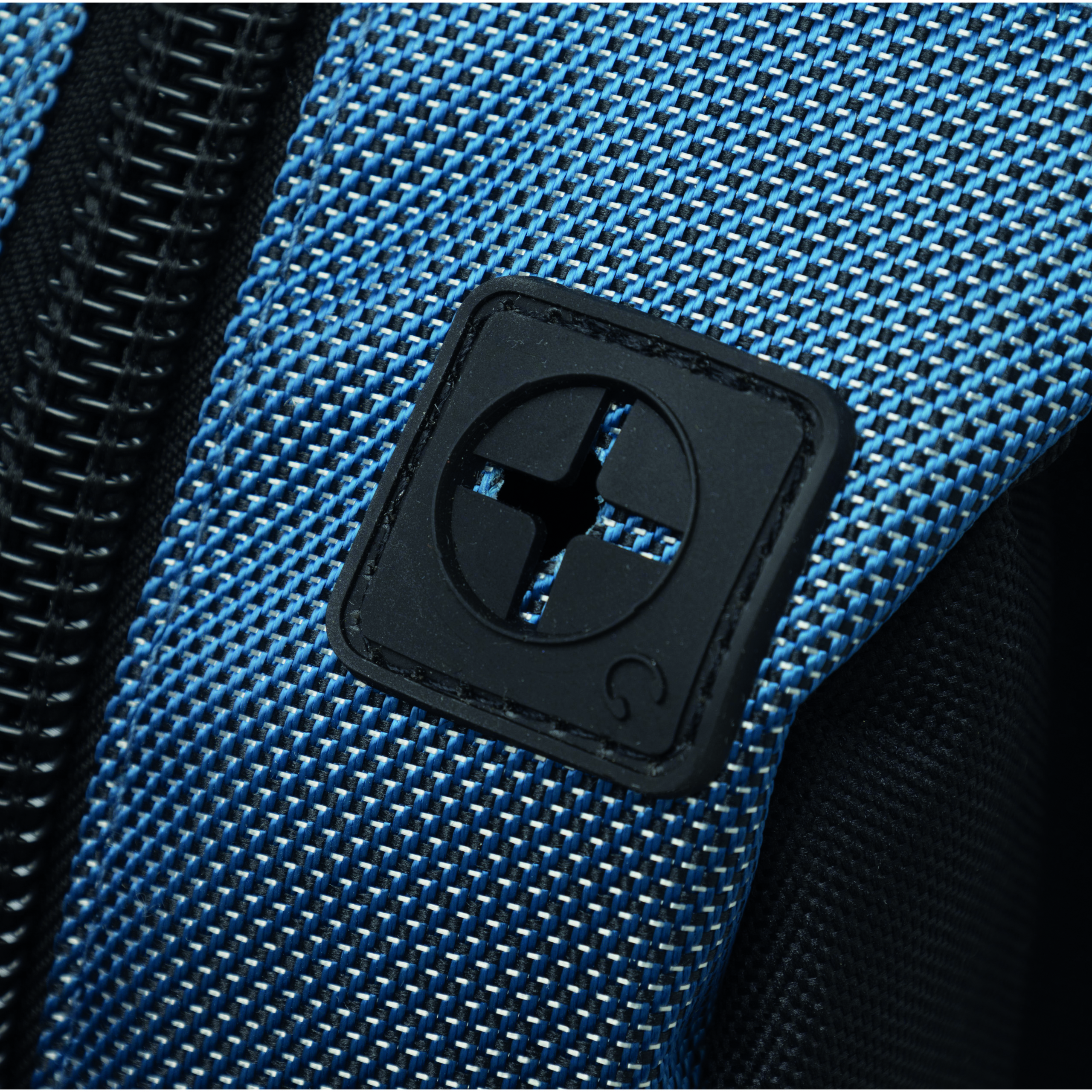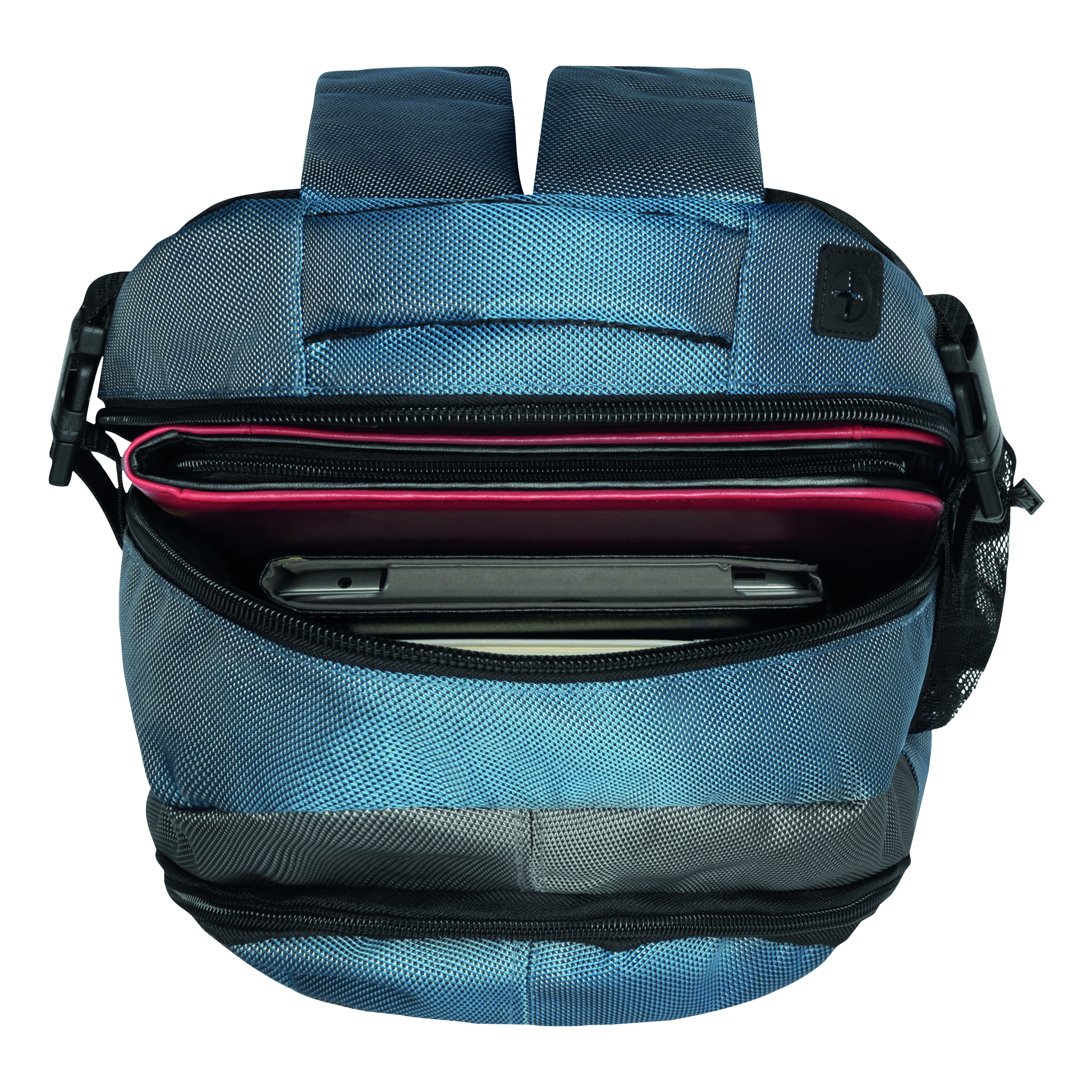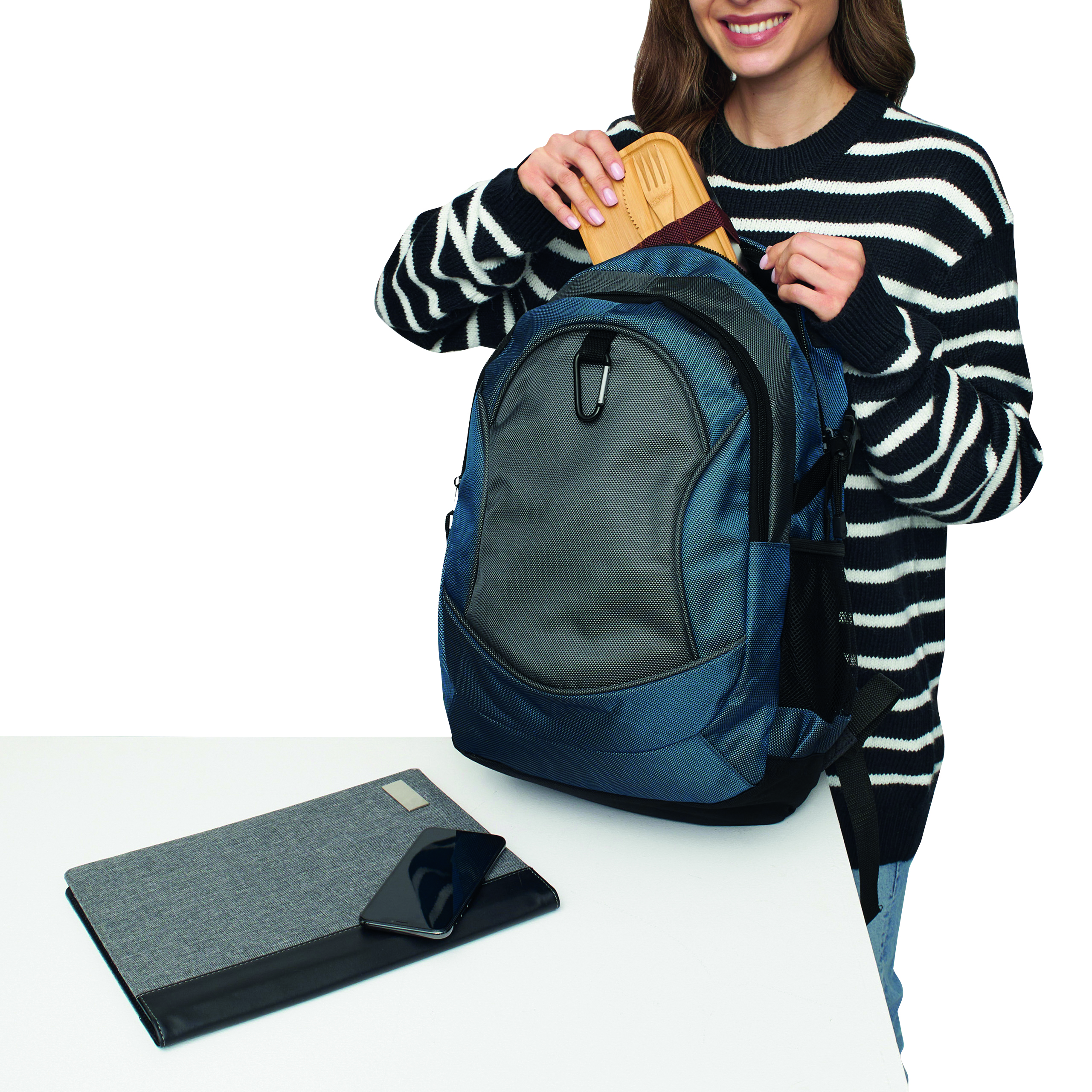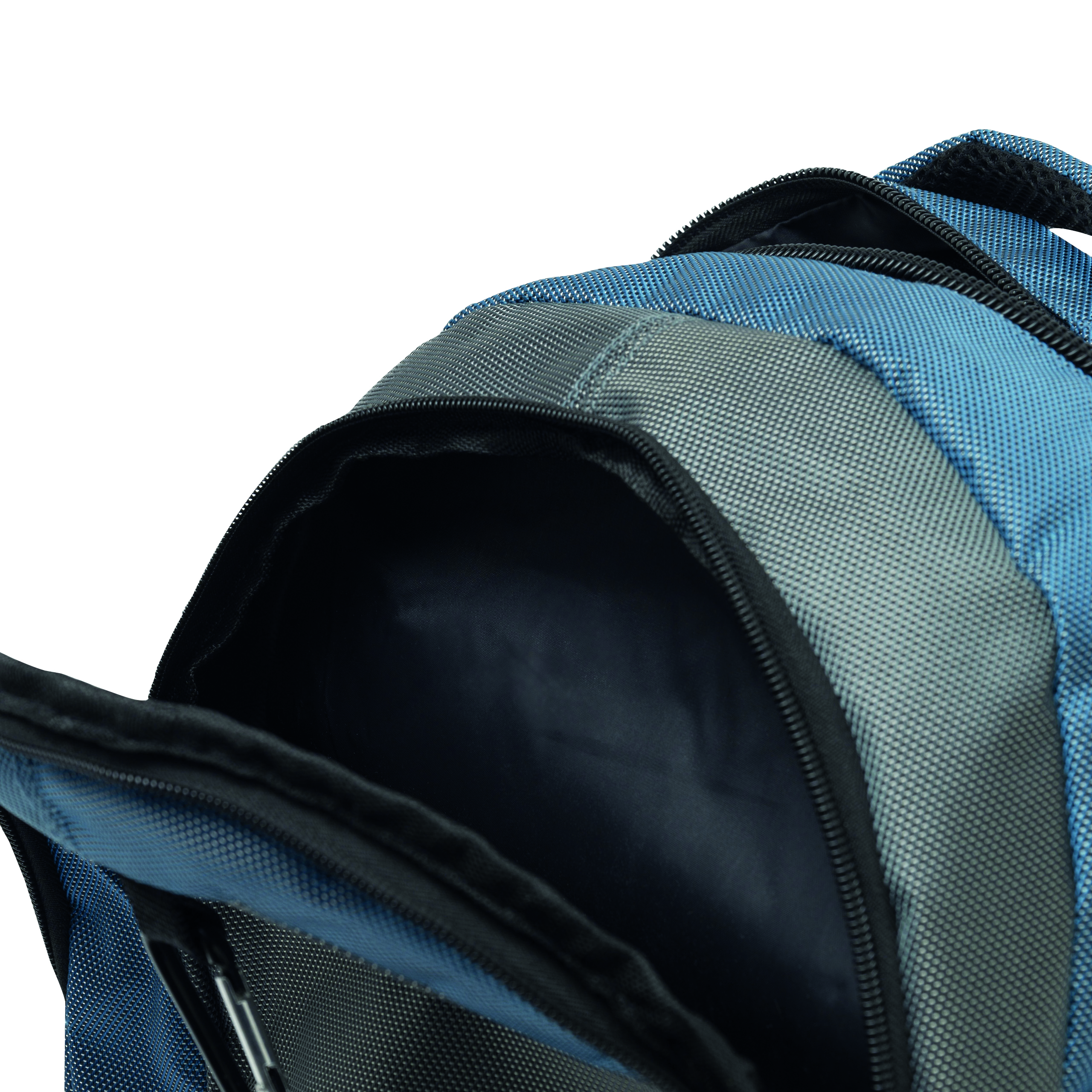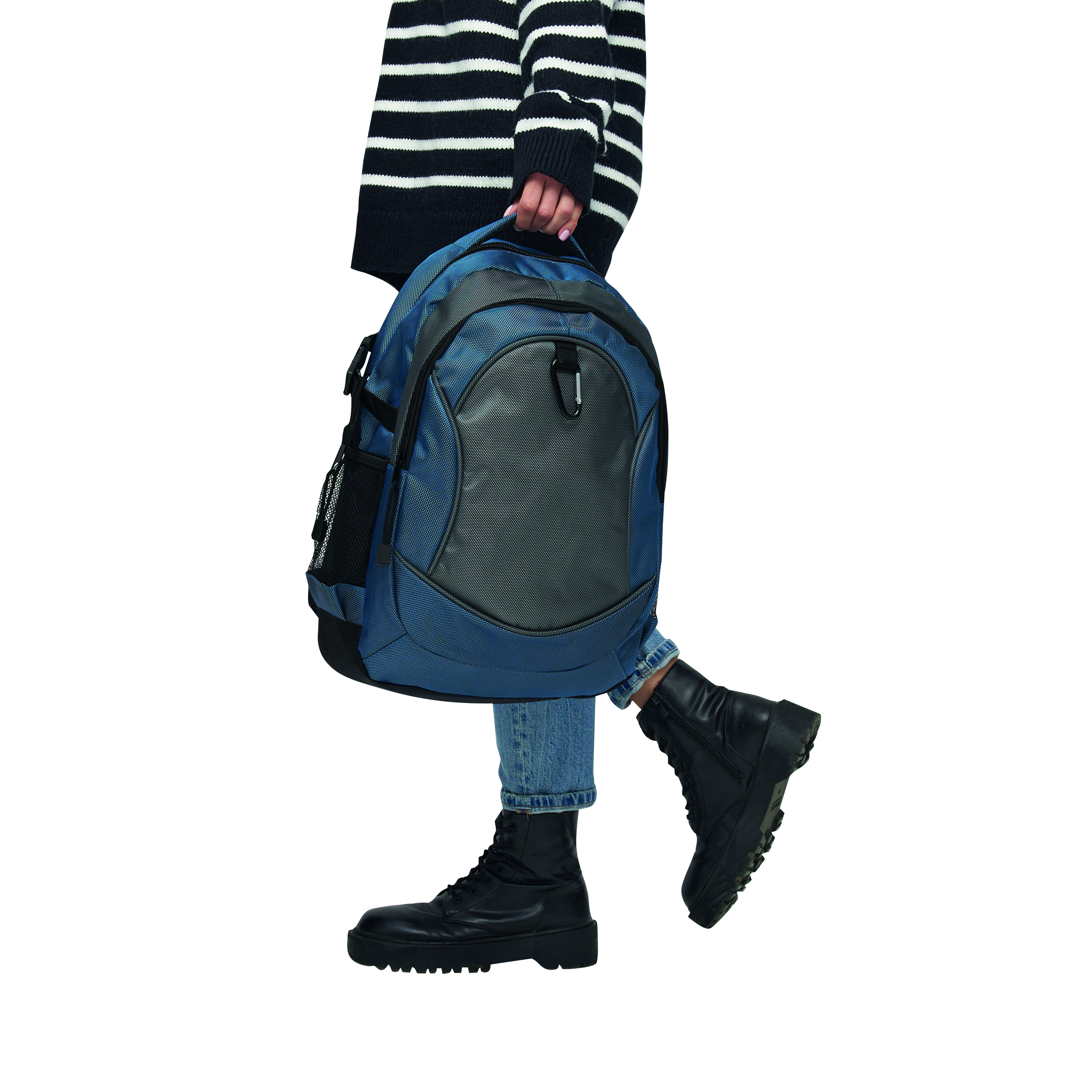Plecak HIGH-CLASS, z przodu kieszeń zewnętrzna na suwak z karabińczykiem, komora główna na suwak z wewnętrzną komorą i małą kieszonką wewnętrzną na suwak, otwór na słuchawki, 2 kieszenie z siatki i pasy ściskające po bokach, wzmocniony uchwyt do przenoszenia, szelki i plecy z wygodną wyściółką.