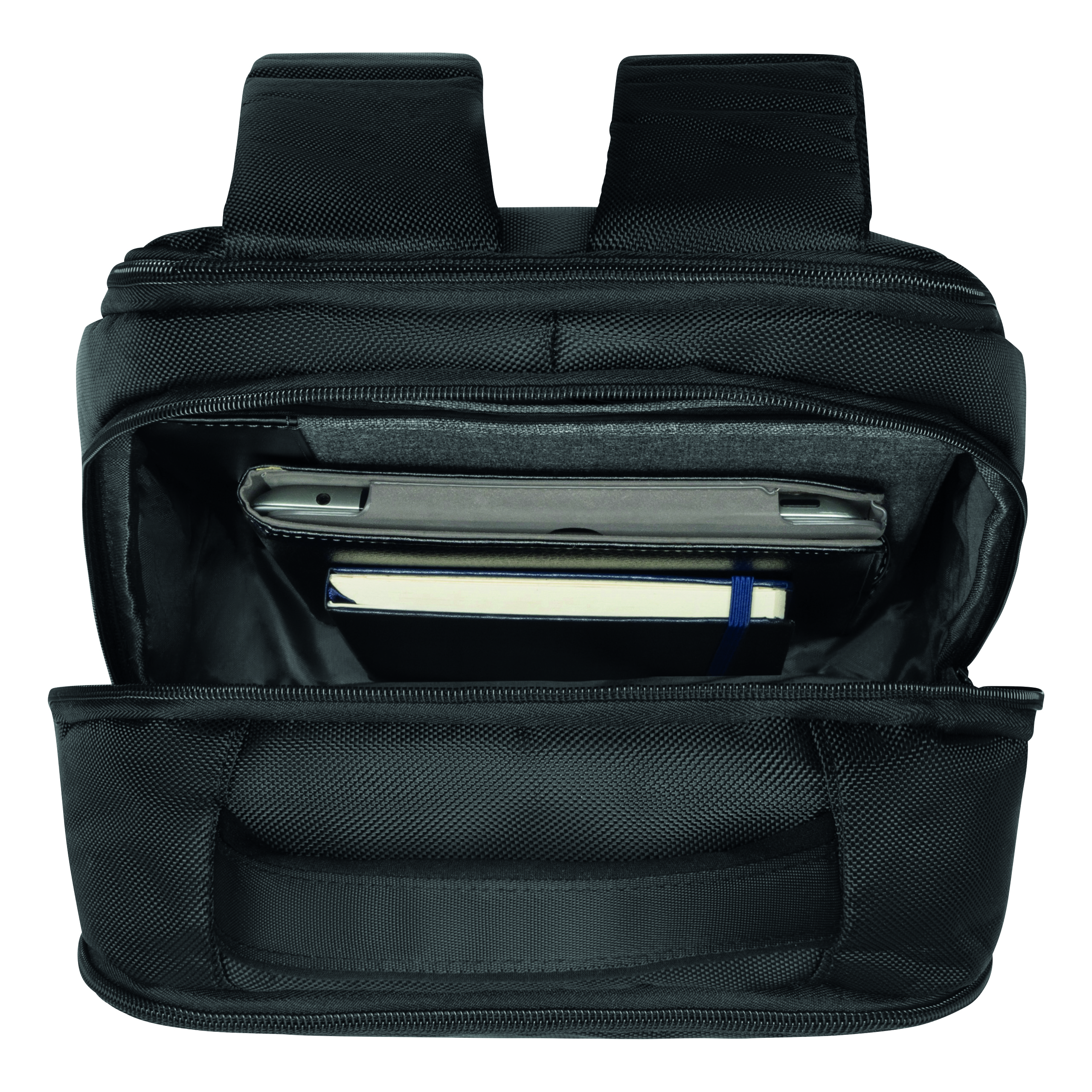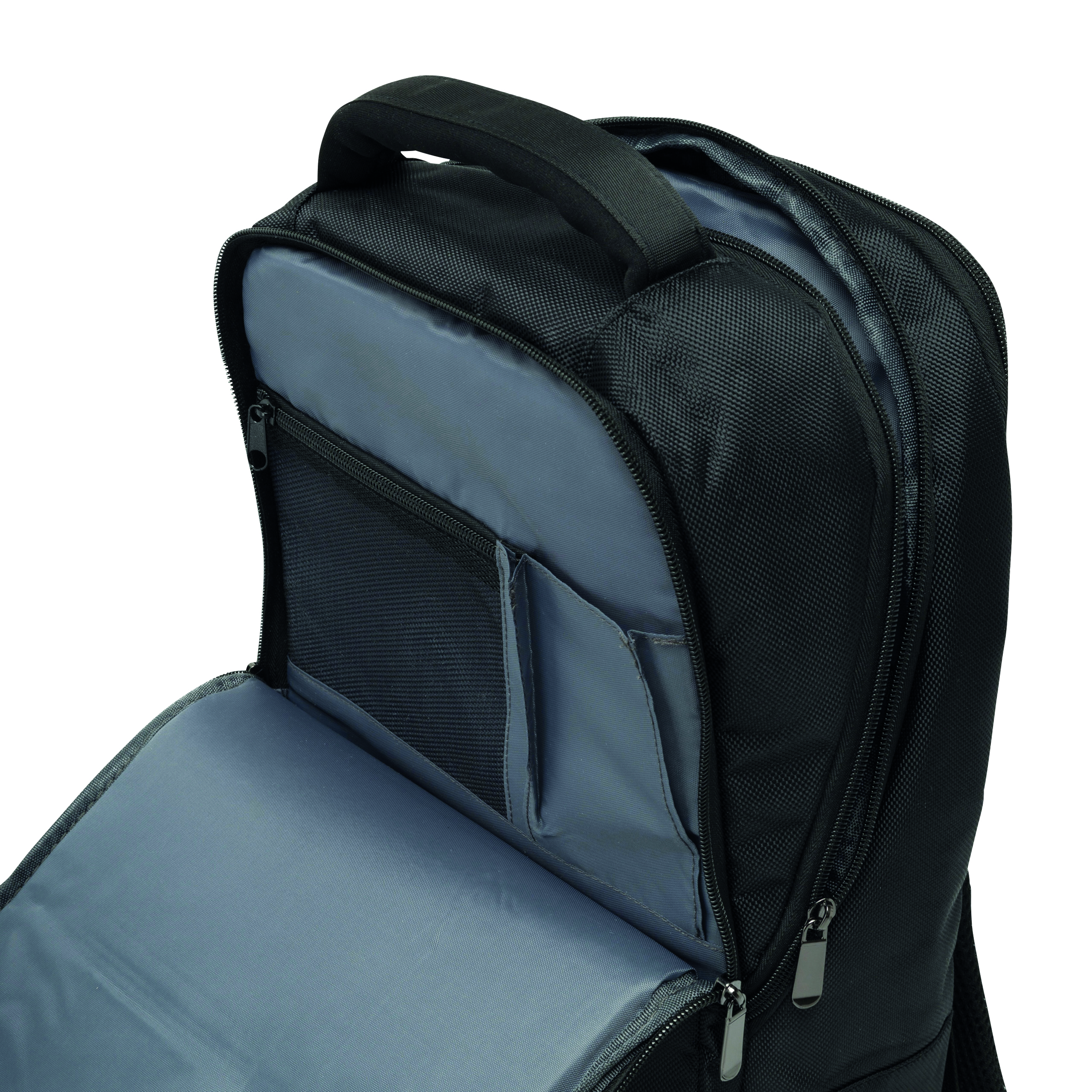 Plecak OXFORD posiada: 1 mała przednia przegroda z zamkiem błyskawicznym, 1 przednia przegroda z małym organizerem, 1 główna przegroda z zamkiem błyskawicznym i 2 wyściełane kieszenie na urządzenia multimedialne oraz 1 kieszeń siatkowa z zamkiem błyskawicznym, 1 wyściełana kieszeń na laptopa, wyściełane i ergonomiczne paski na ramię, wyściełane plecy z funkcją reportera.