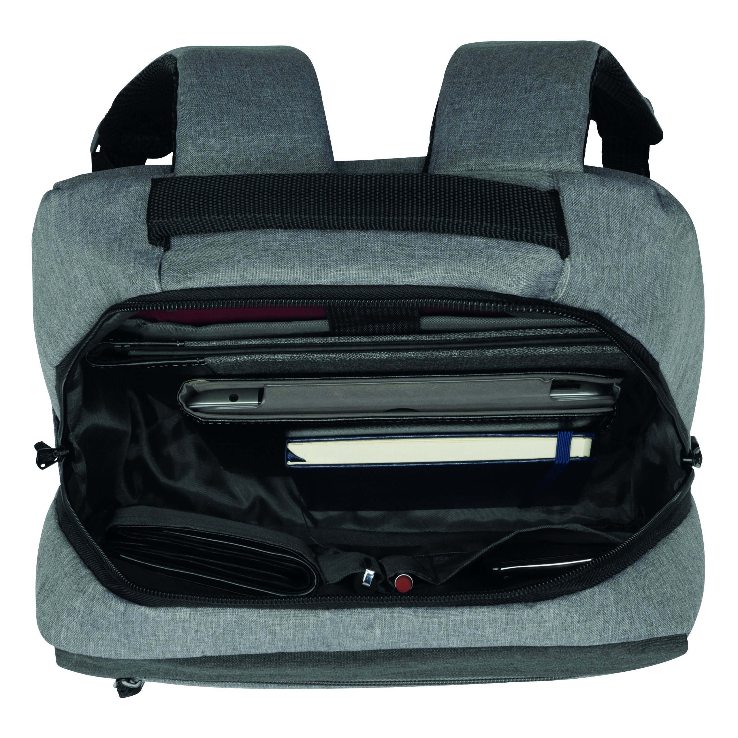 Plecak NORDIC LINE. 2 przednie kieszenie zamykane na zamek błyskawiczny, komora główna z zamkiem i watowaną wewnętrzną kieszenią na laptop lub tablet, organizer z 4 kieszonkami, 1 boczna kieszonka, watowana rączka, ergonomiczne paski na ramię wspierające plecy