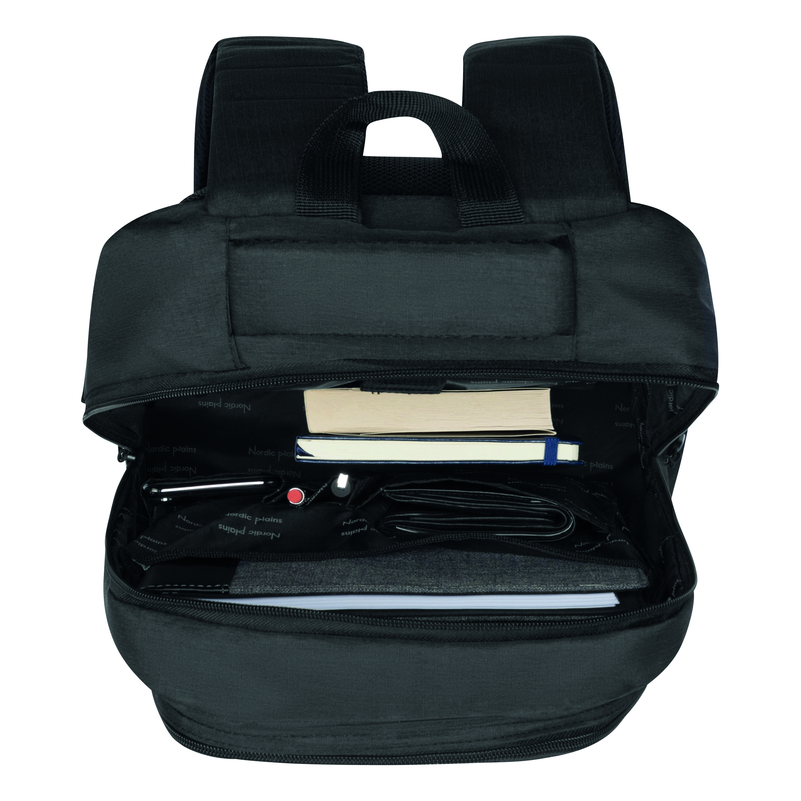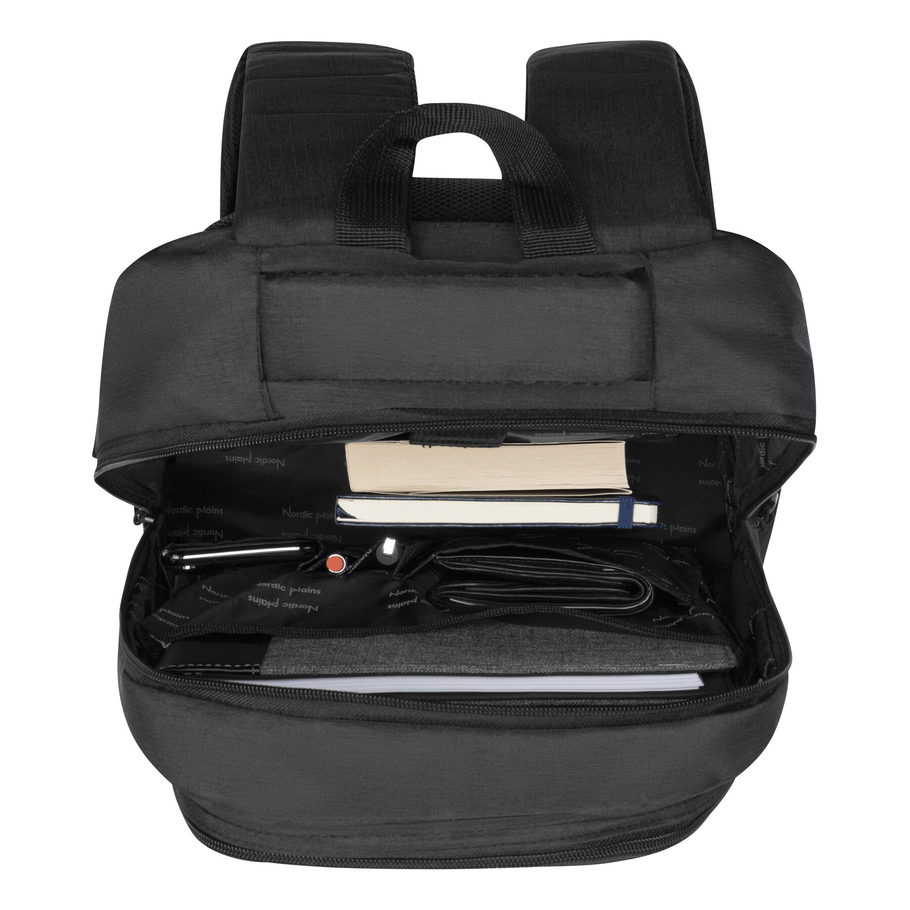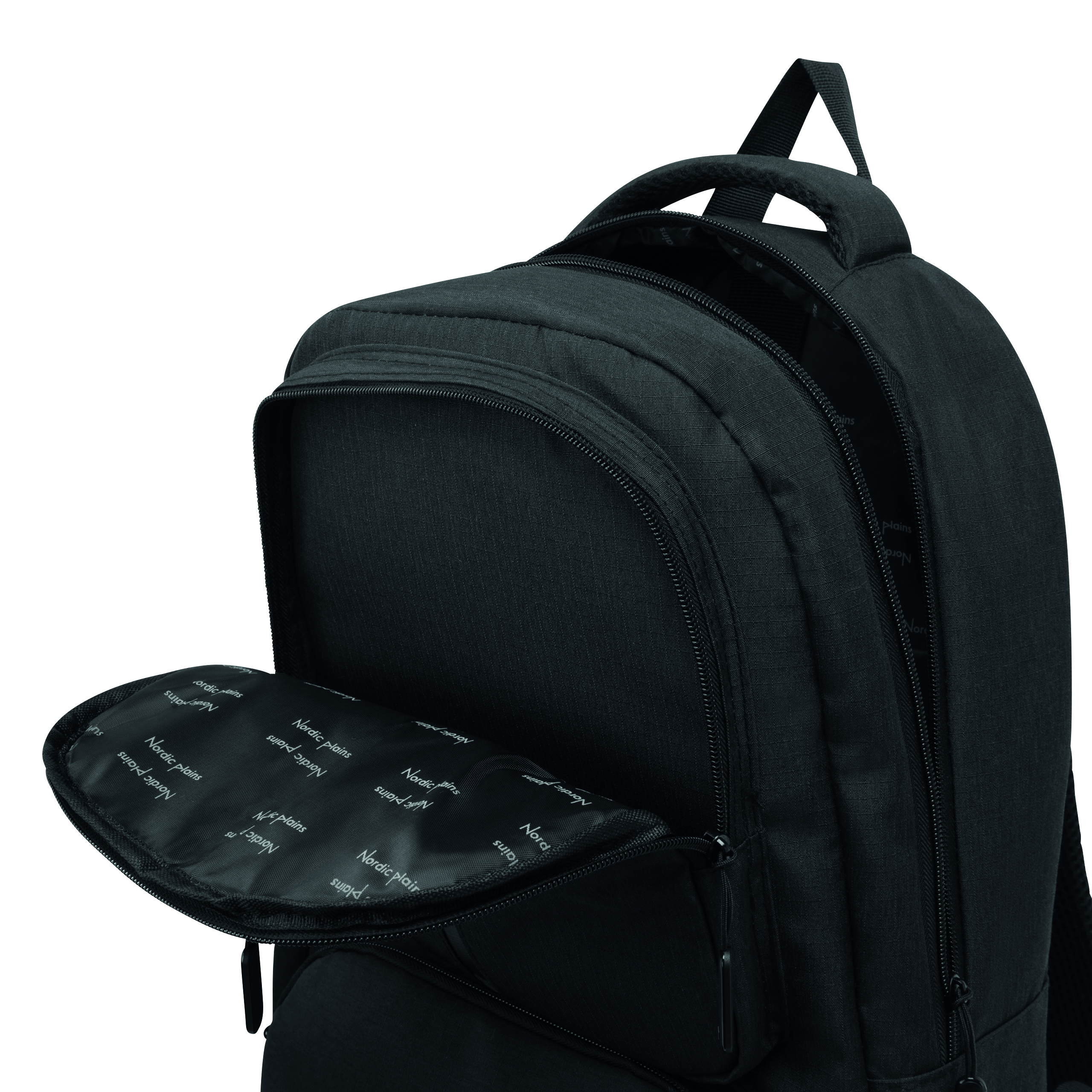 Plecak AMSTERDAM z komorą główną oraz 3 przednimi kieszeniami zamykanymi na zamek błyskawiczny. Z wewnętrzną, wyściełaną kieszenią na laptopa lub tablet oraz organizerem z 5 kieszeniami. Pętla do mocowania, wyściełany uchwyt do przenoszenia, wyściełane ergonomiczne szelki i obszar pleców. Pas bagażowy do mocowania umieszczony na plecach. Produkt marki Nordic plains.