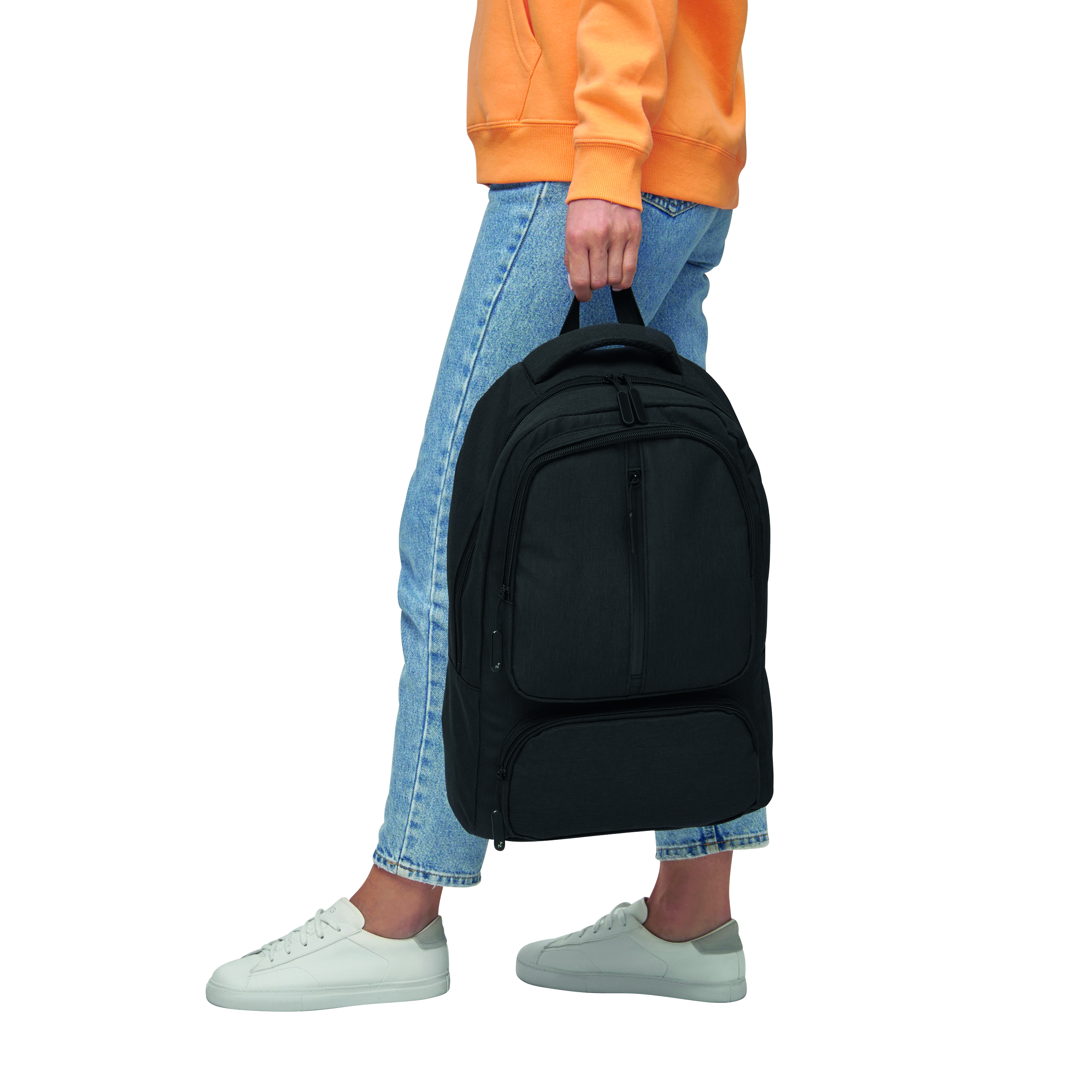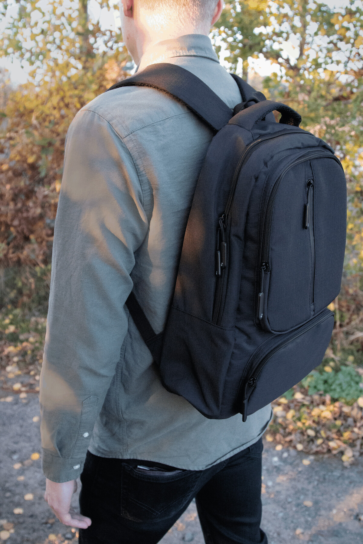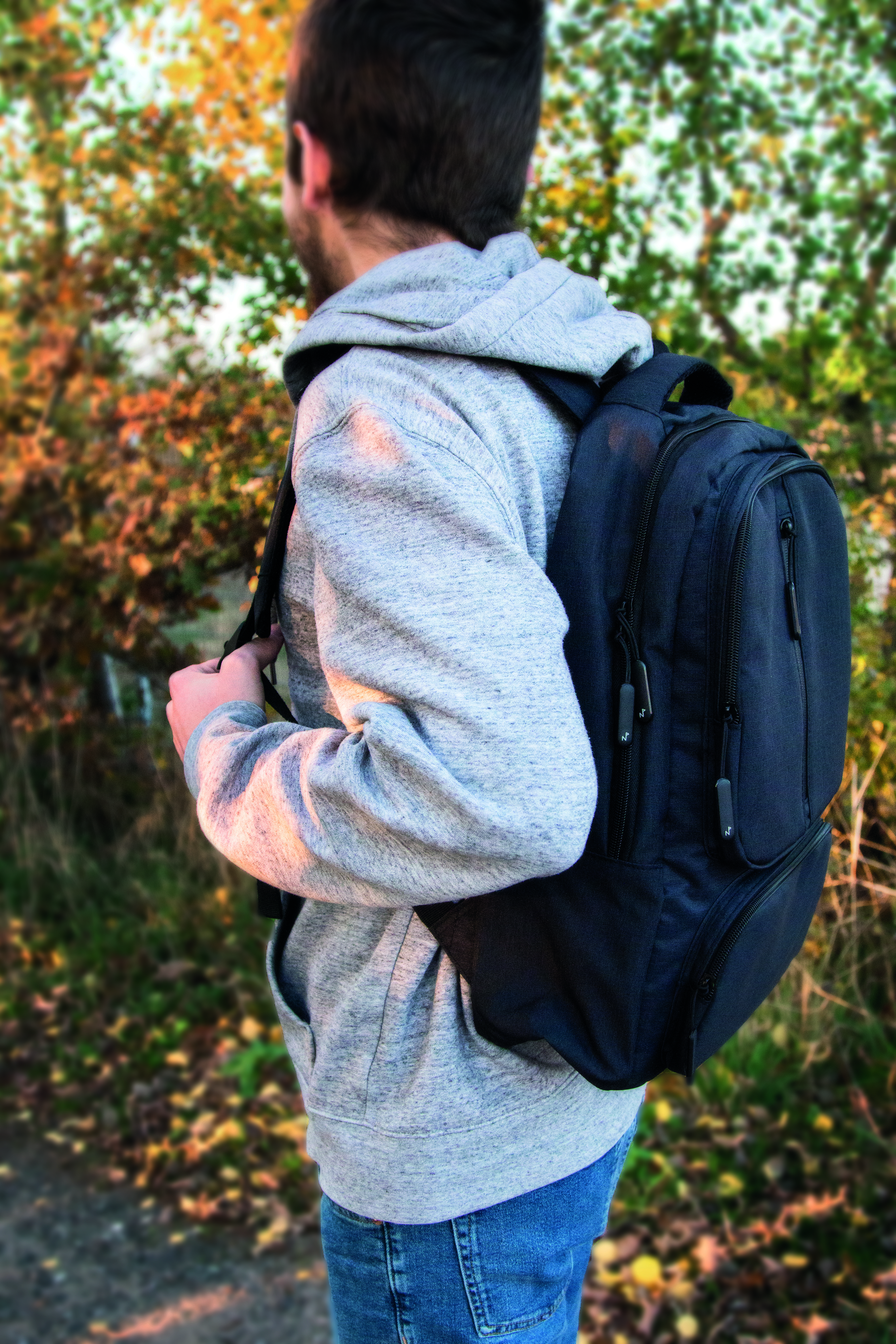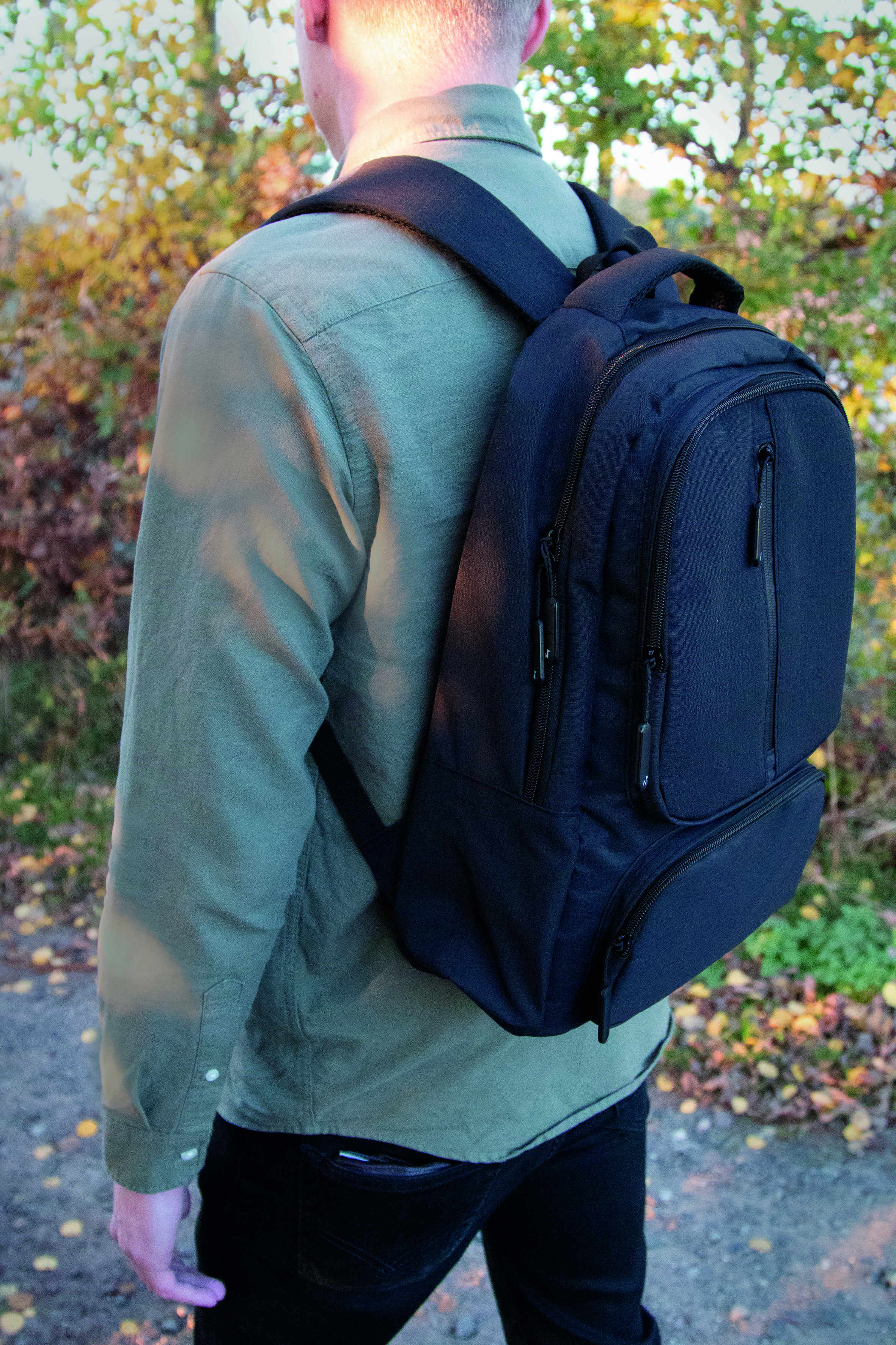 Plecak AMSTERDAM z komorą główną oraz 3 przednimi kieszeniami zamykanymi na zamek błyskawiczny. Z wewnętrzną, wyściełaną kieszenią na laptopa lub tablet oraz organizerem z 5 kieszeniami. Pętla do mocowania, wyściełany uchwyt do przenoszenia, wyściełane ergonomiczne szelki i obszar pleców. Pas bagażowy do mocowania umieszczony na plecach. Produkt marki Nordic plains.