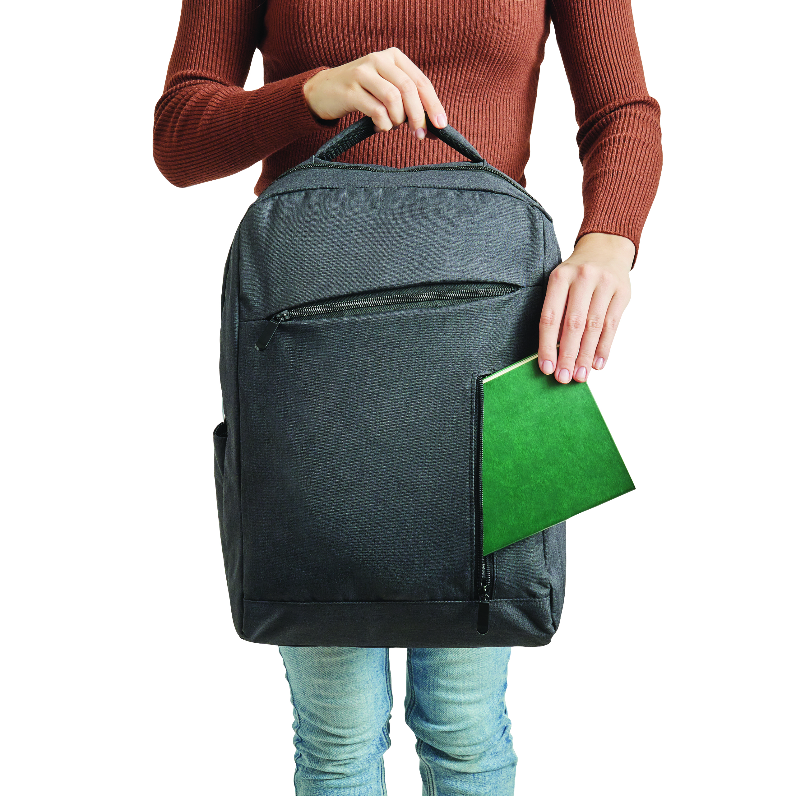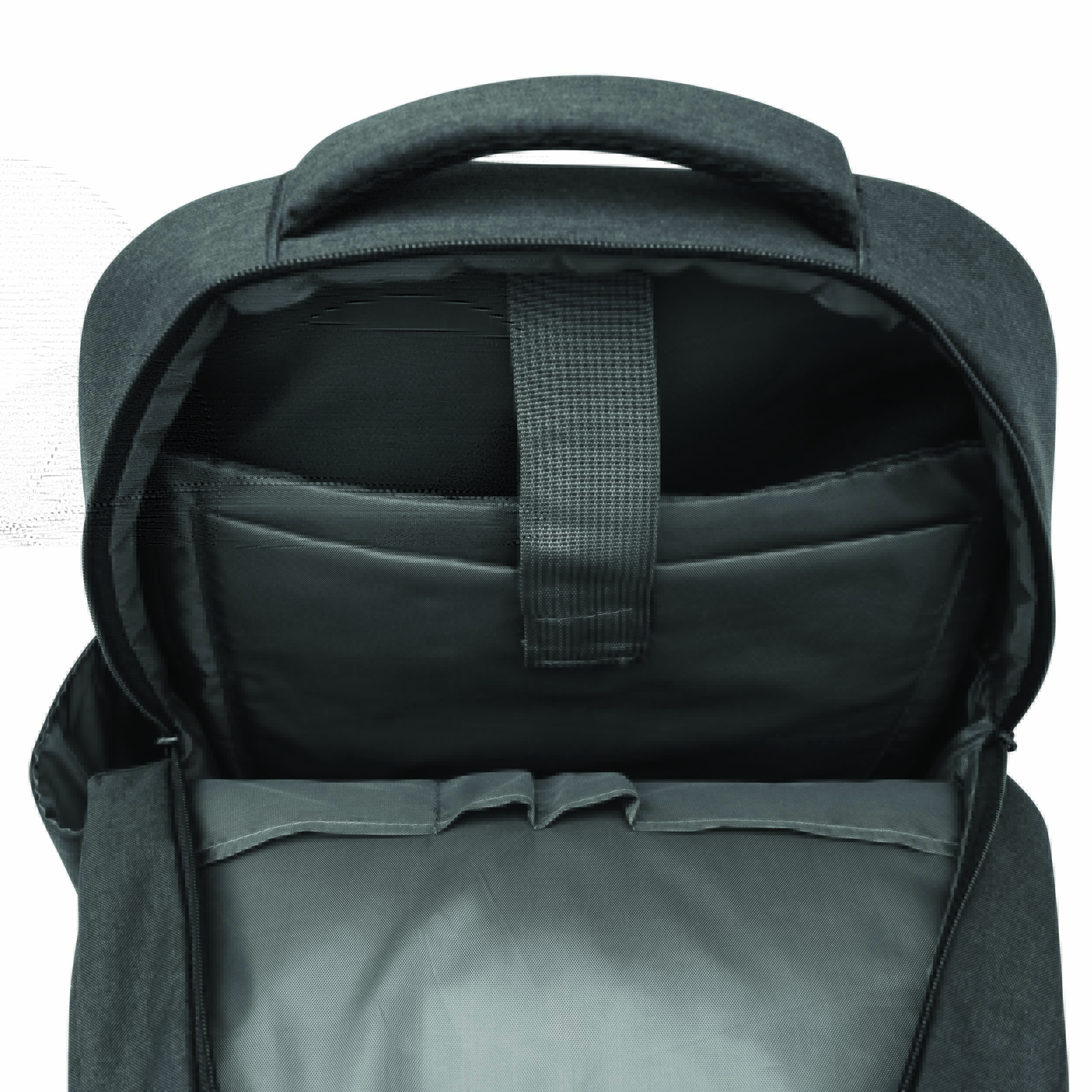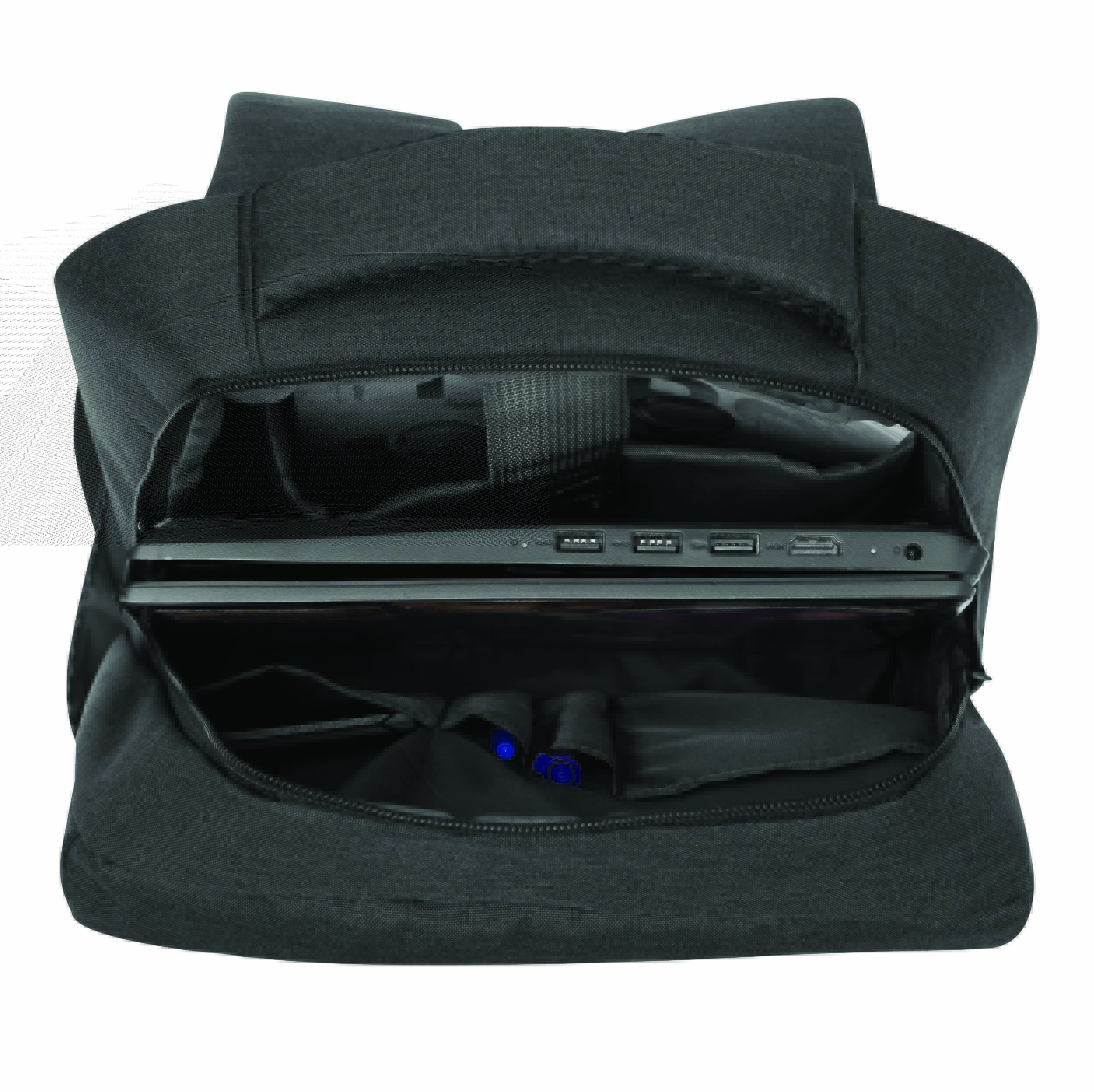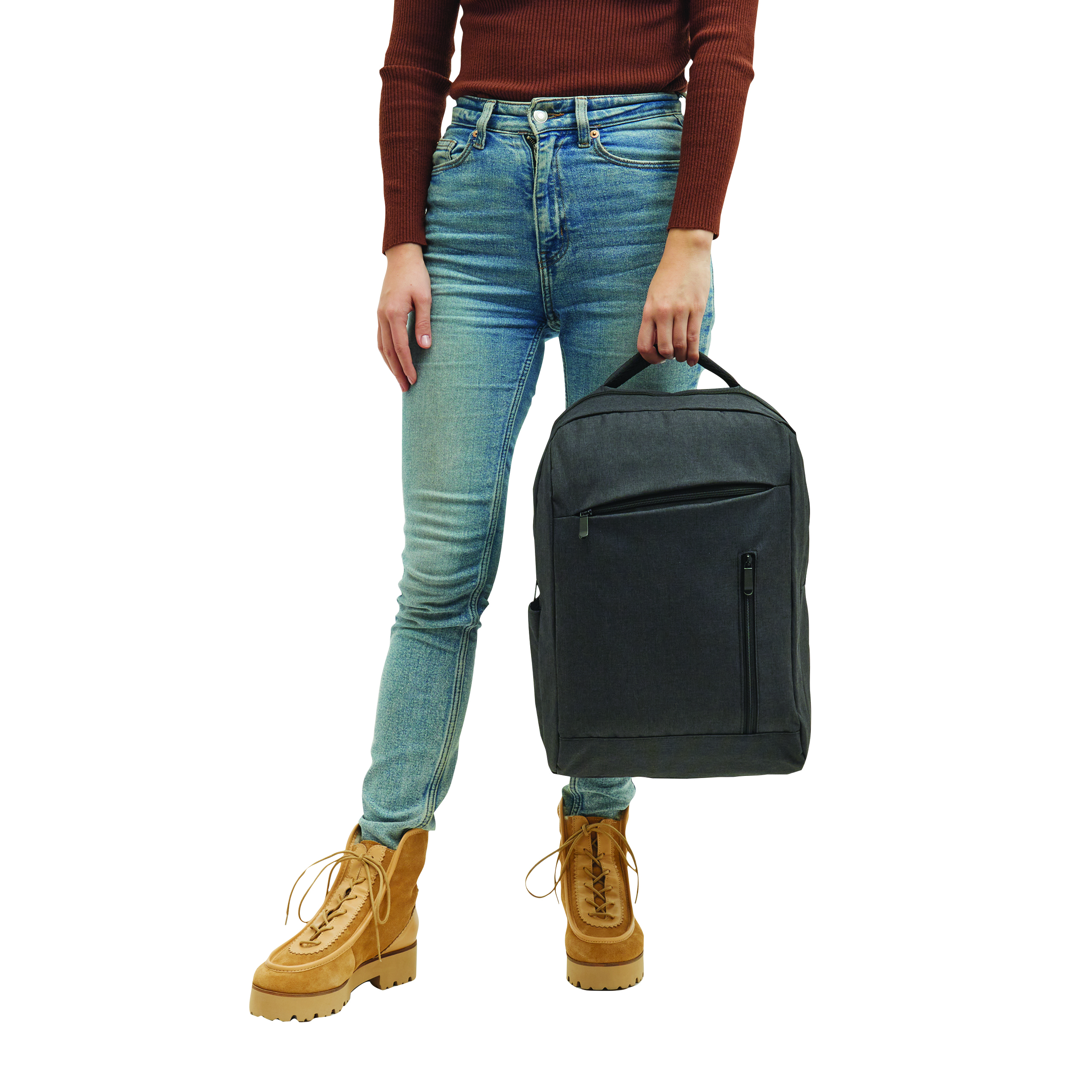 Plecak BERN: 2 przednie przegrody zapinane na zamek, 1 przegroda główna zapinana na zamek z wyściełaną przegrodą wewnętrzną na laptopa lub tablet, organizer z 4 wsuwanymi kieszeniami, ergonomicznie ukształtowane szelki, wyściełana część tylna, pasek bagażowy na tylnej części plecaka.