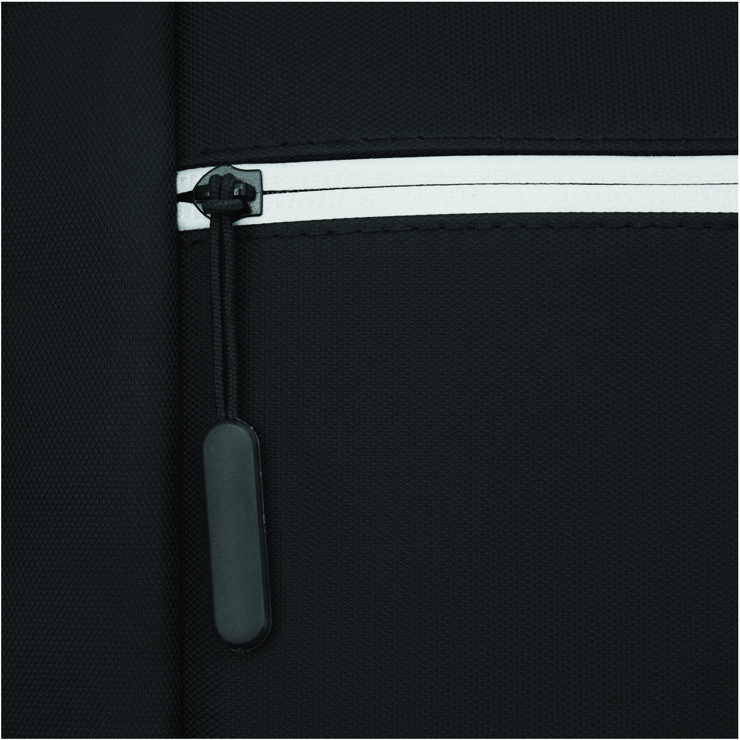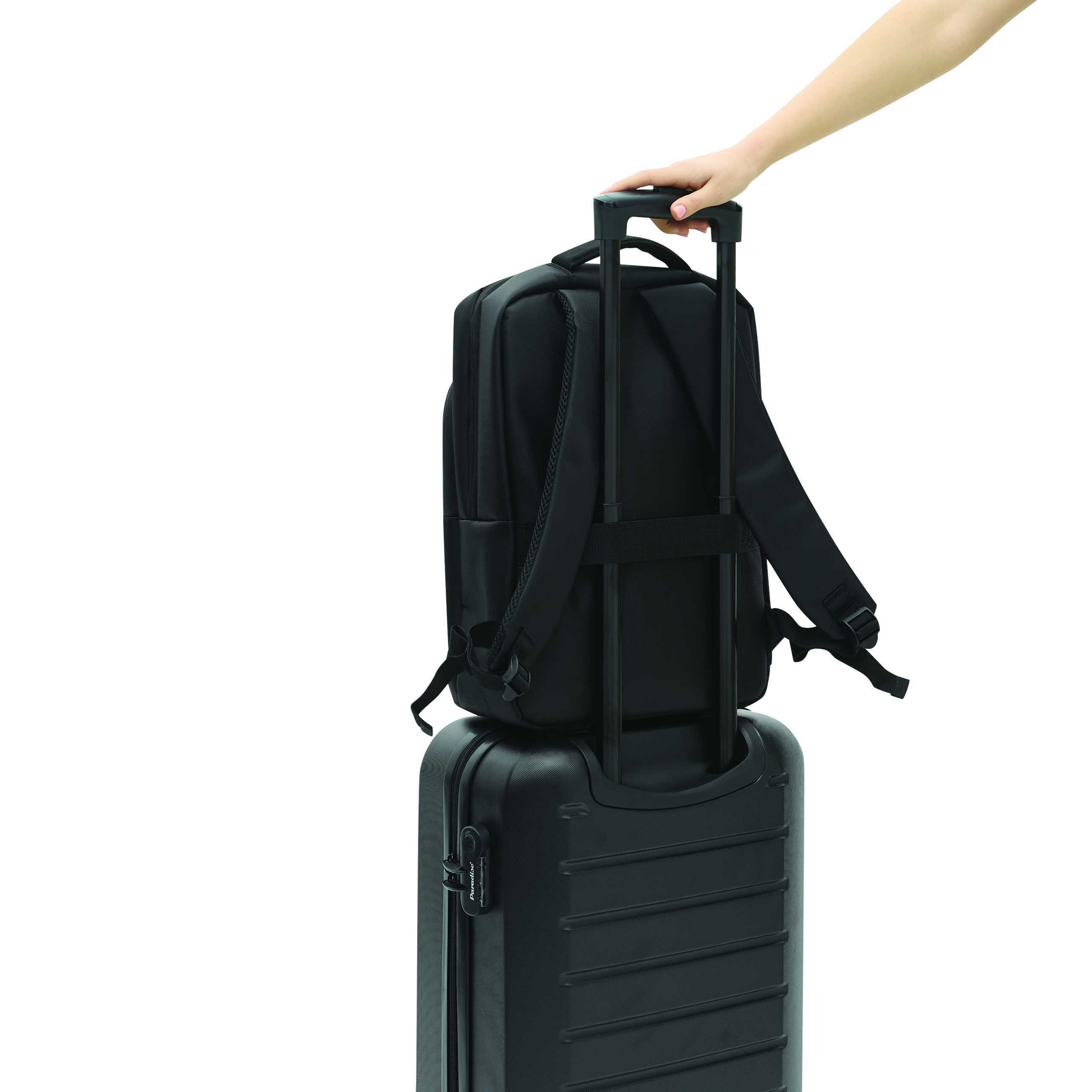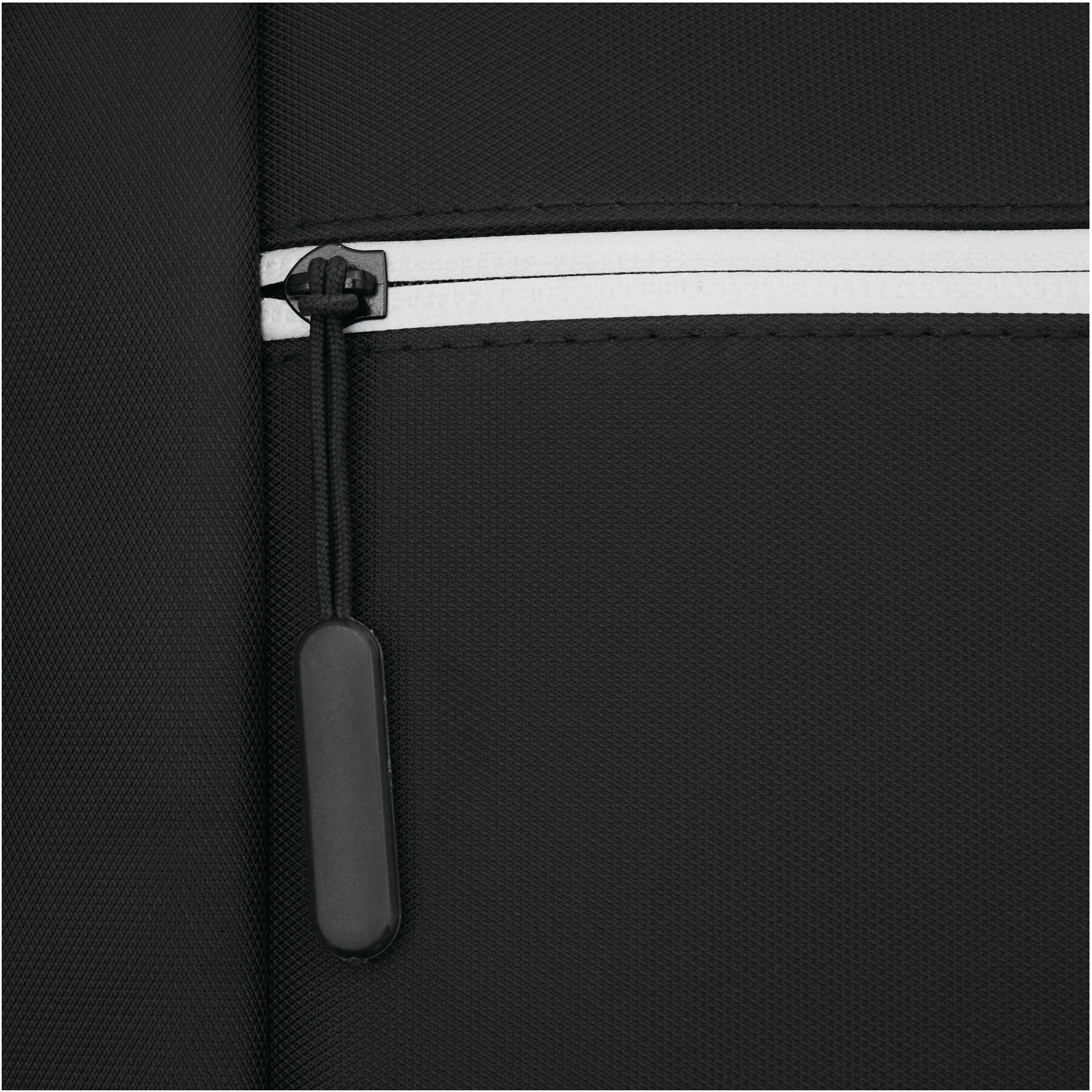 Plecak PRINCETON z funcjonalnym paskiem do założenia na walizkę. Ma 1 przednią komorę na suwak z organizerem (2 wewnętrzne kieszenie i 2 uchwyty na długopis) oraz 1 poziomą na suwak z odblaskowymi elementami. Posiada także boczną kieszeń na suwak i komorę główną zapinaną na suwak z wyściełaną przegrodą na laptopa lub tablet. Ma miękki uchwyt do przenoszenia i ergonomicznie ukształtowane wygodne szelki i wyściełane plecy.