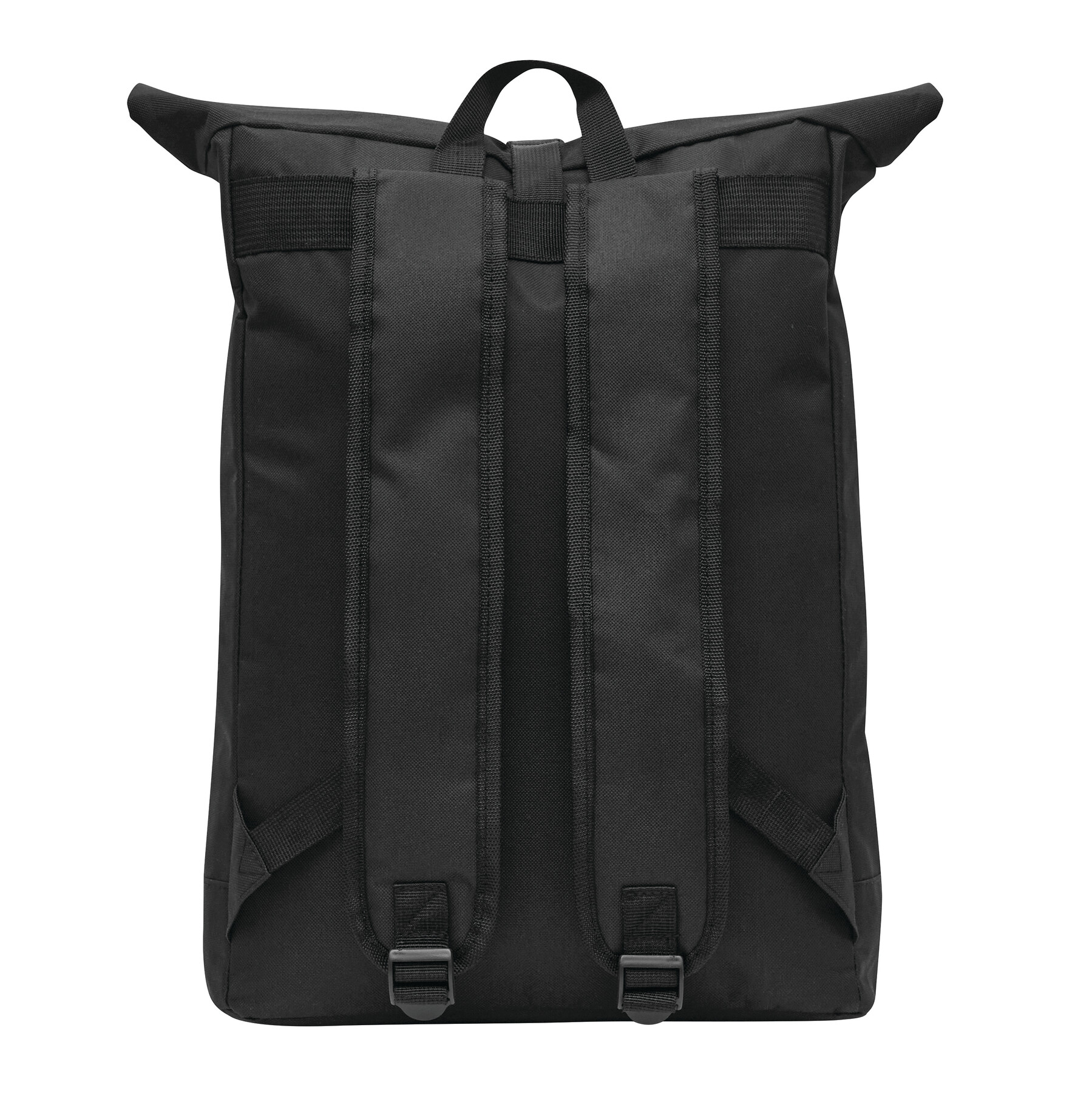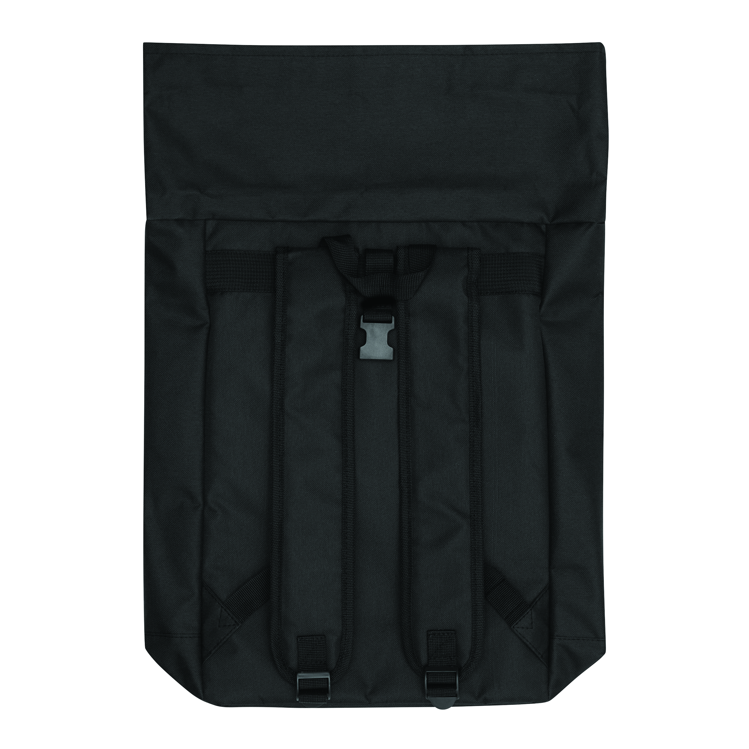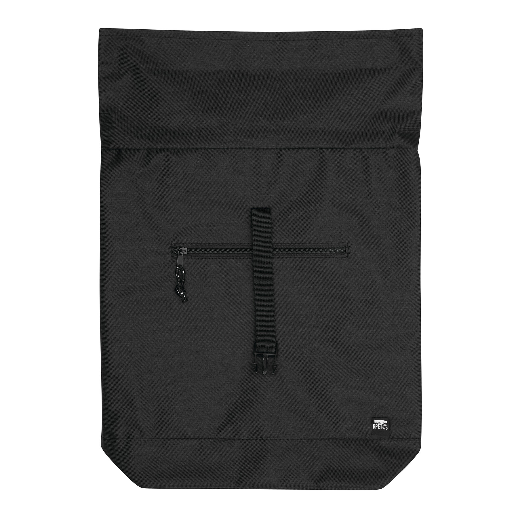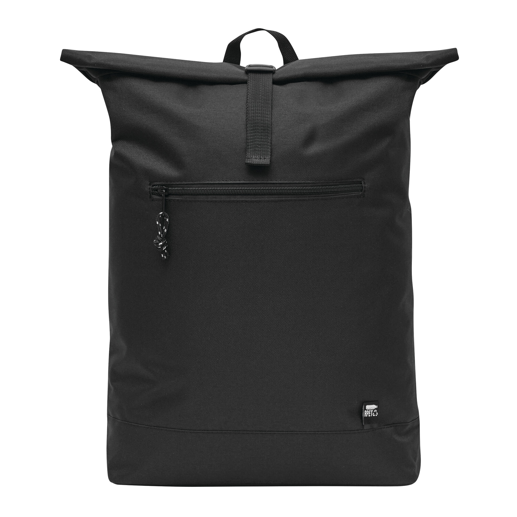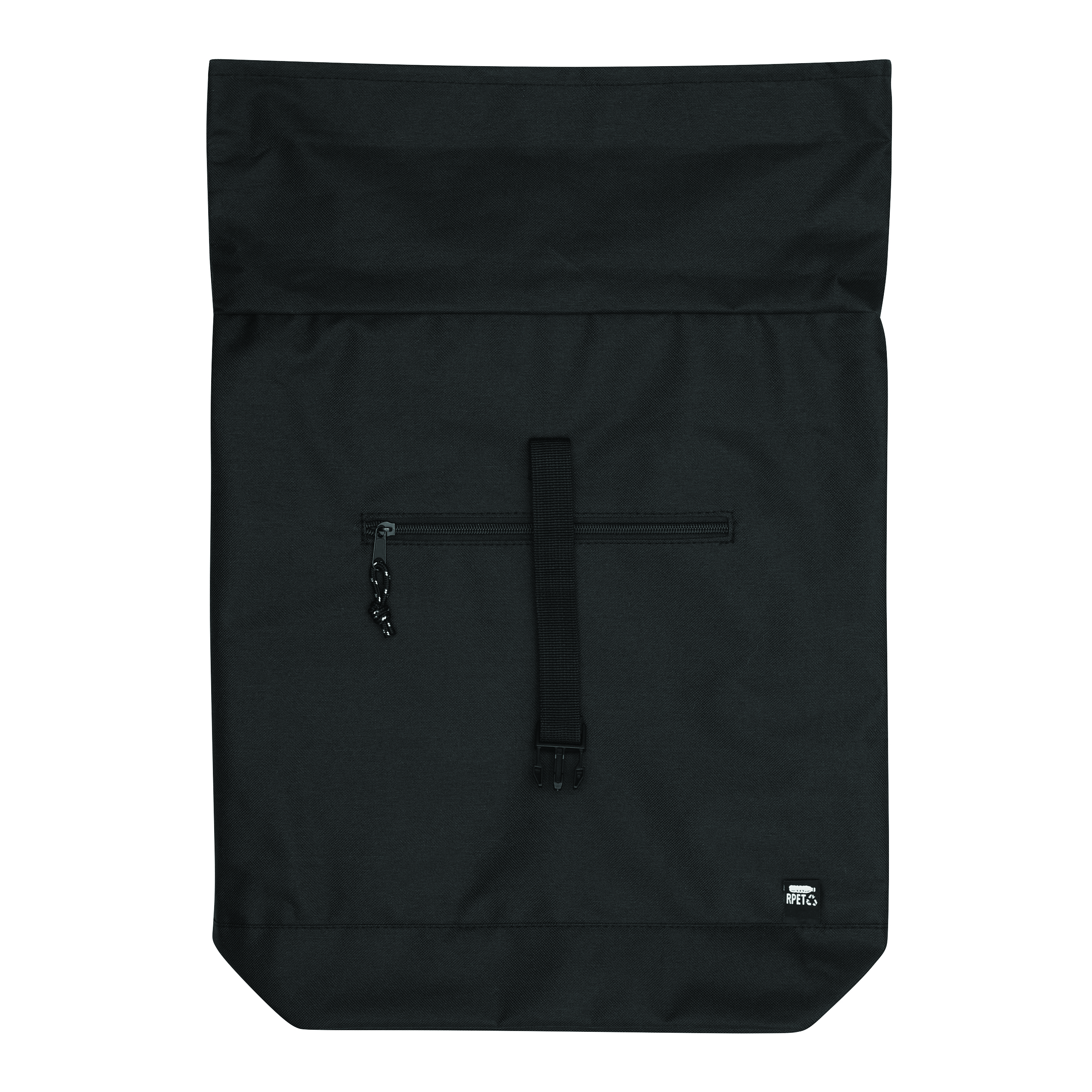Plecak ROLL-TOP wykonany jest z tworzywa sztucznego pochodzącego z recyklingu (RPET). Posiada poziomą komorę przednią zapinaną na zamek błyskawiczny oraz dużą komorę główną z wyściełaną przegrodą wewnętrzną na laptopa lub tablet. Plecak można zwiniąć i zamknąć na zatrzask. Ma wygodny pasek do przenoszenia oraz wyściełaną podstawę, szelki i plecy.