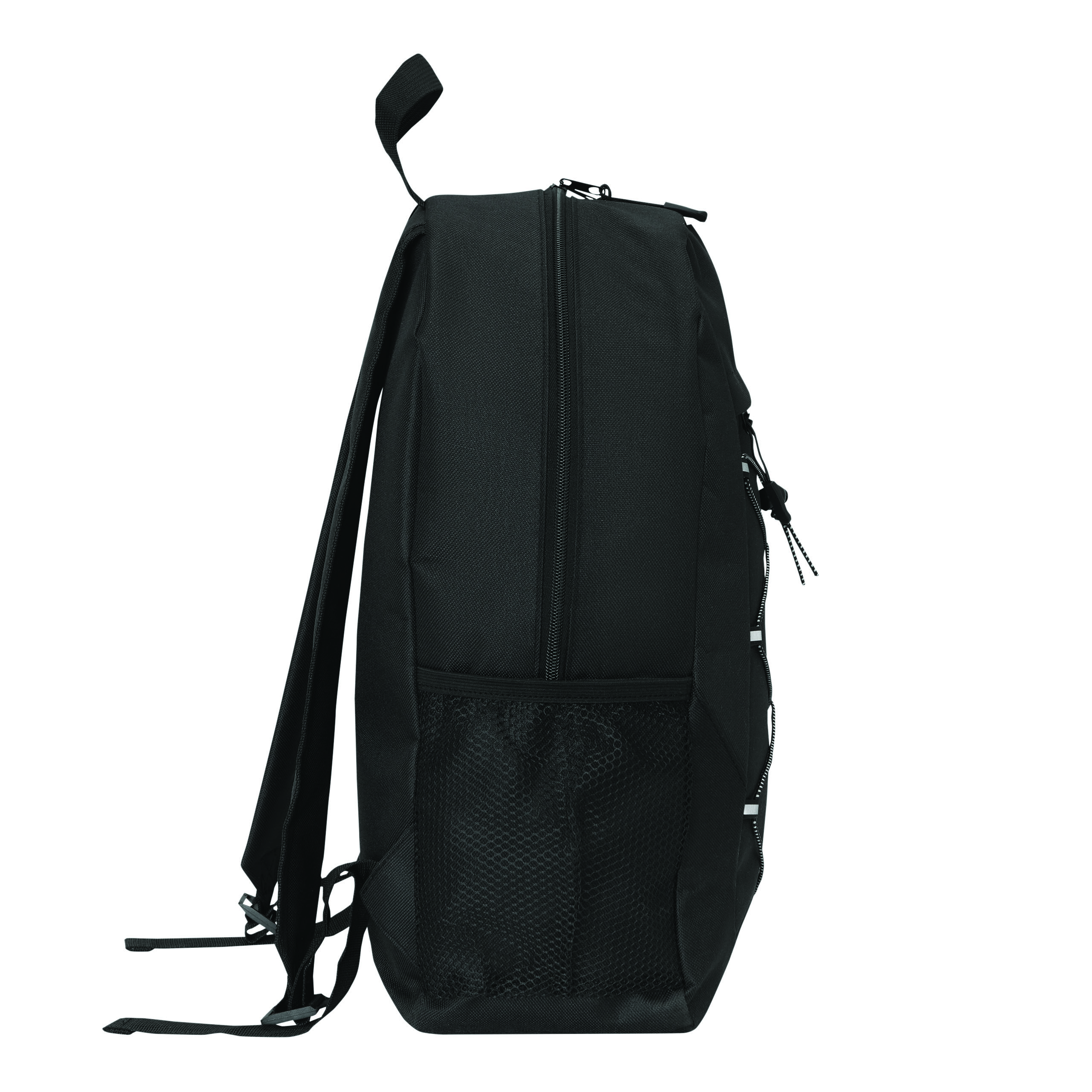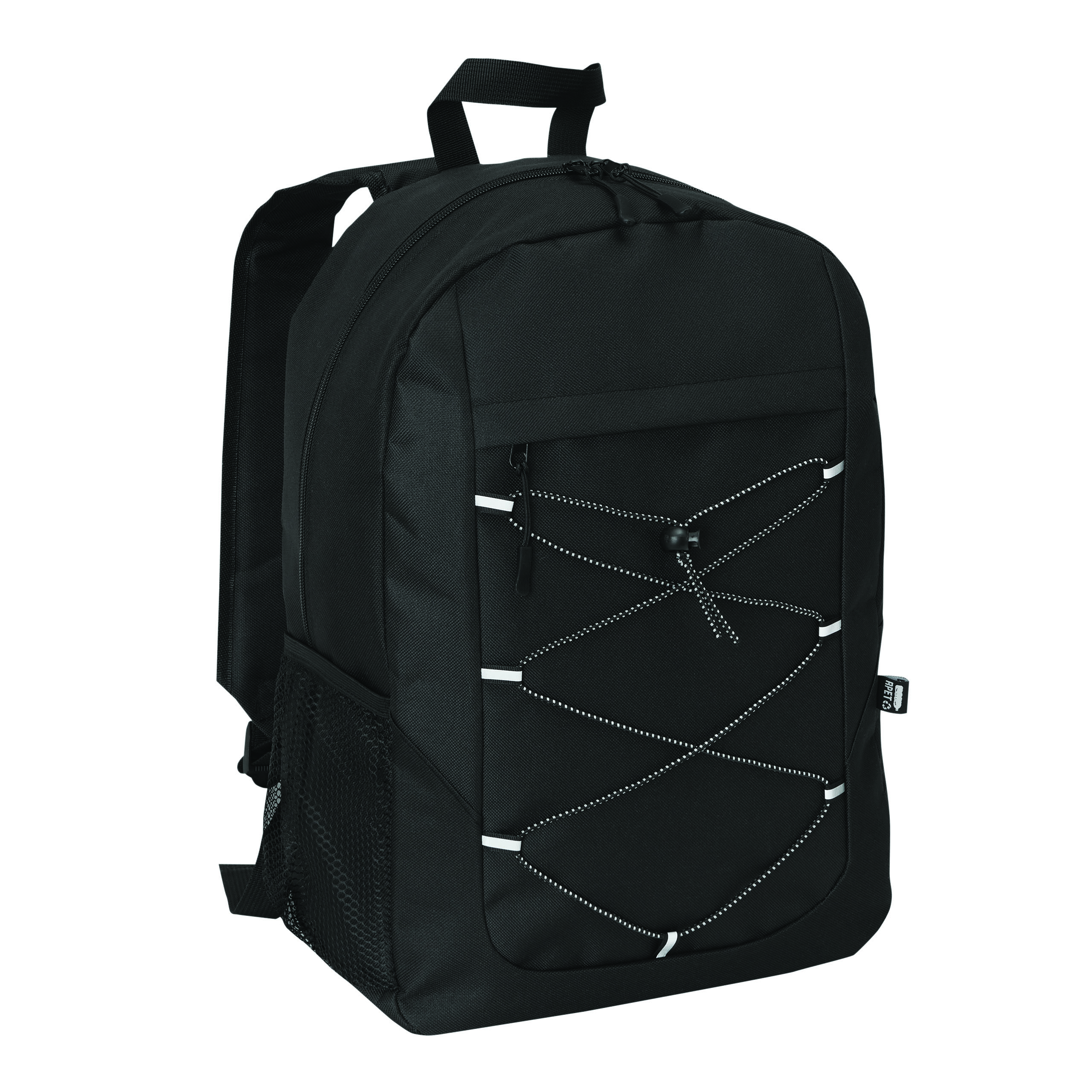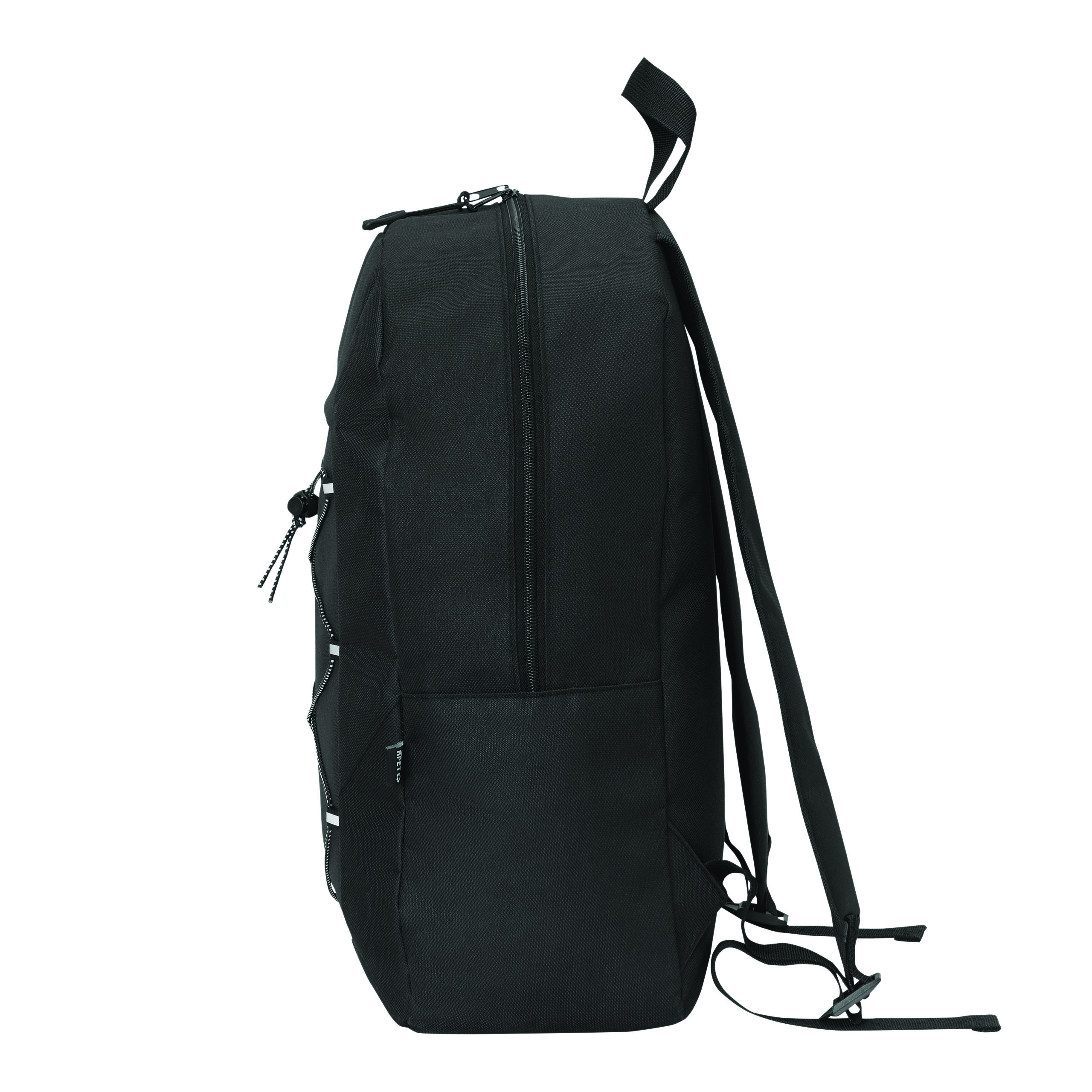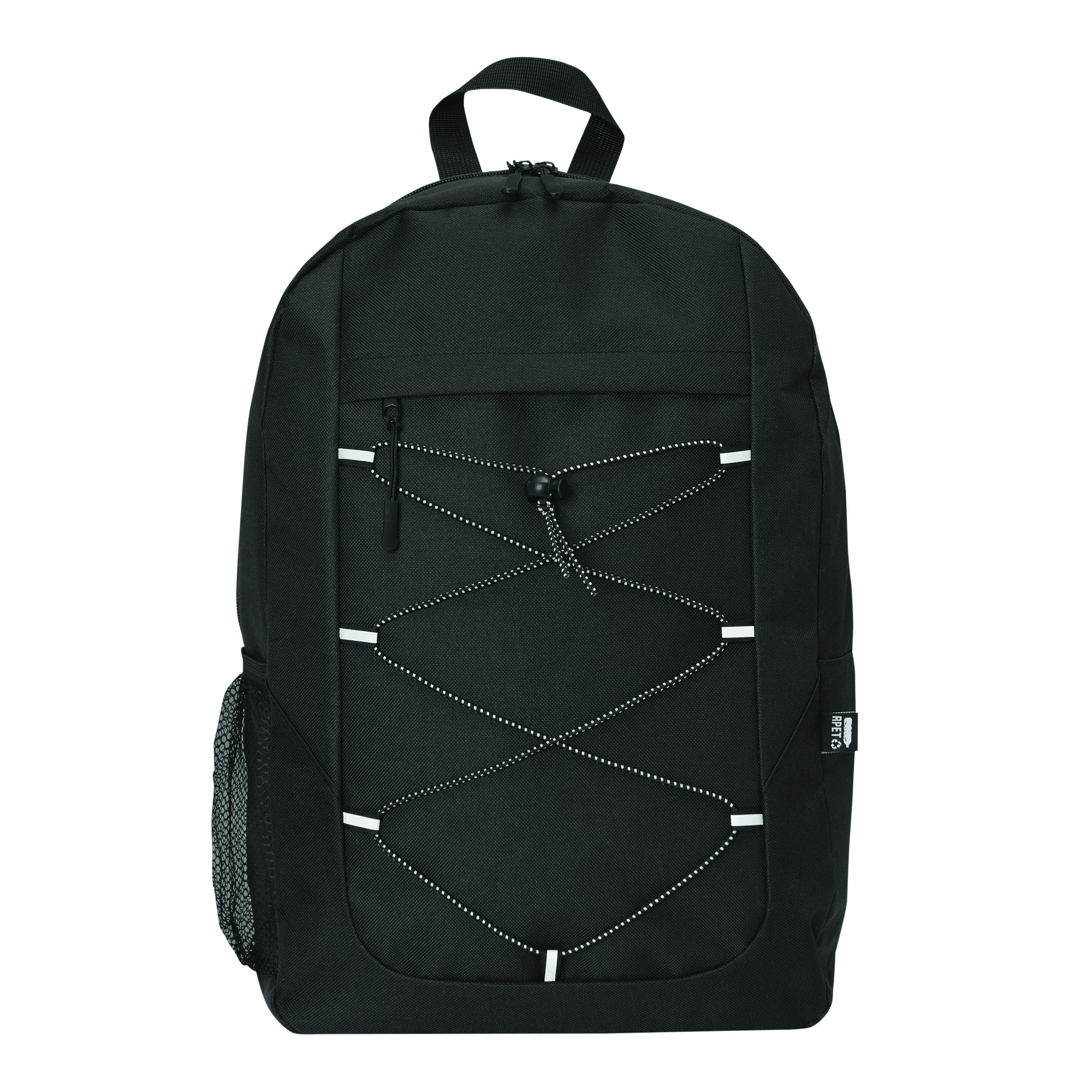 Plecak FARO. Wykonany jest z poliestru pochodzącego z recyklingu (rPET). Ma główną komorę zapinaną na zamek błyskawiczny, przednią kieszeń zapinaną na zamek błyskawiczny z regulowanym elastycznym sznurkiem, uchwyt do przenoszenia, 1 boczną kieszeń z siatki, wyściełane dno oraz regulowane wyściełane paski na ramię.
